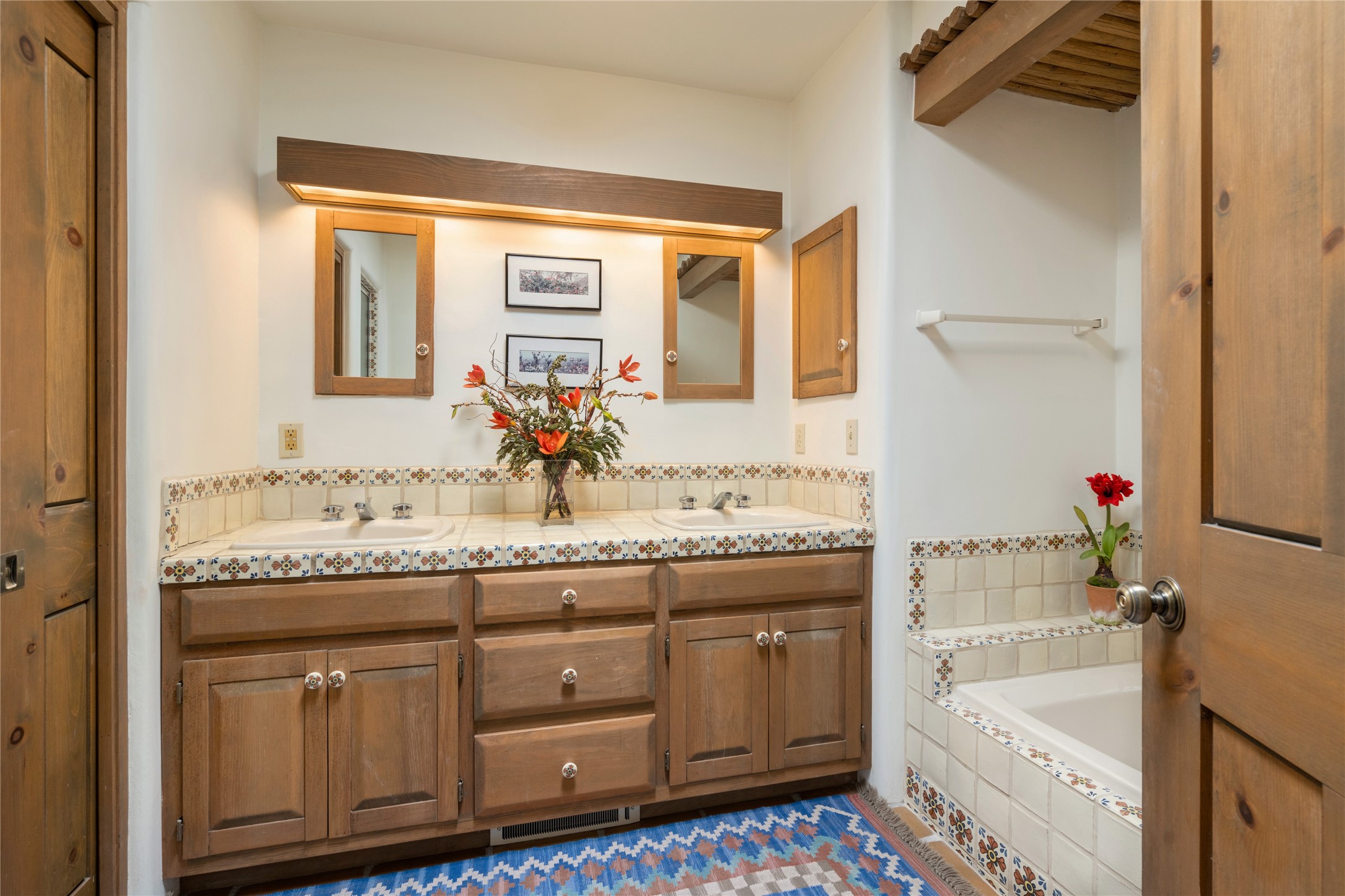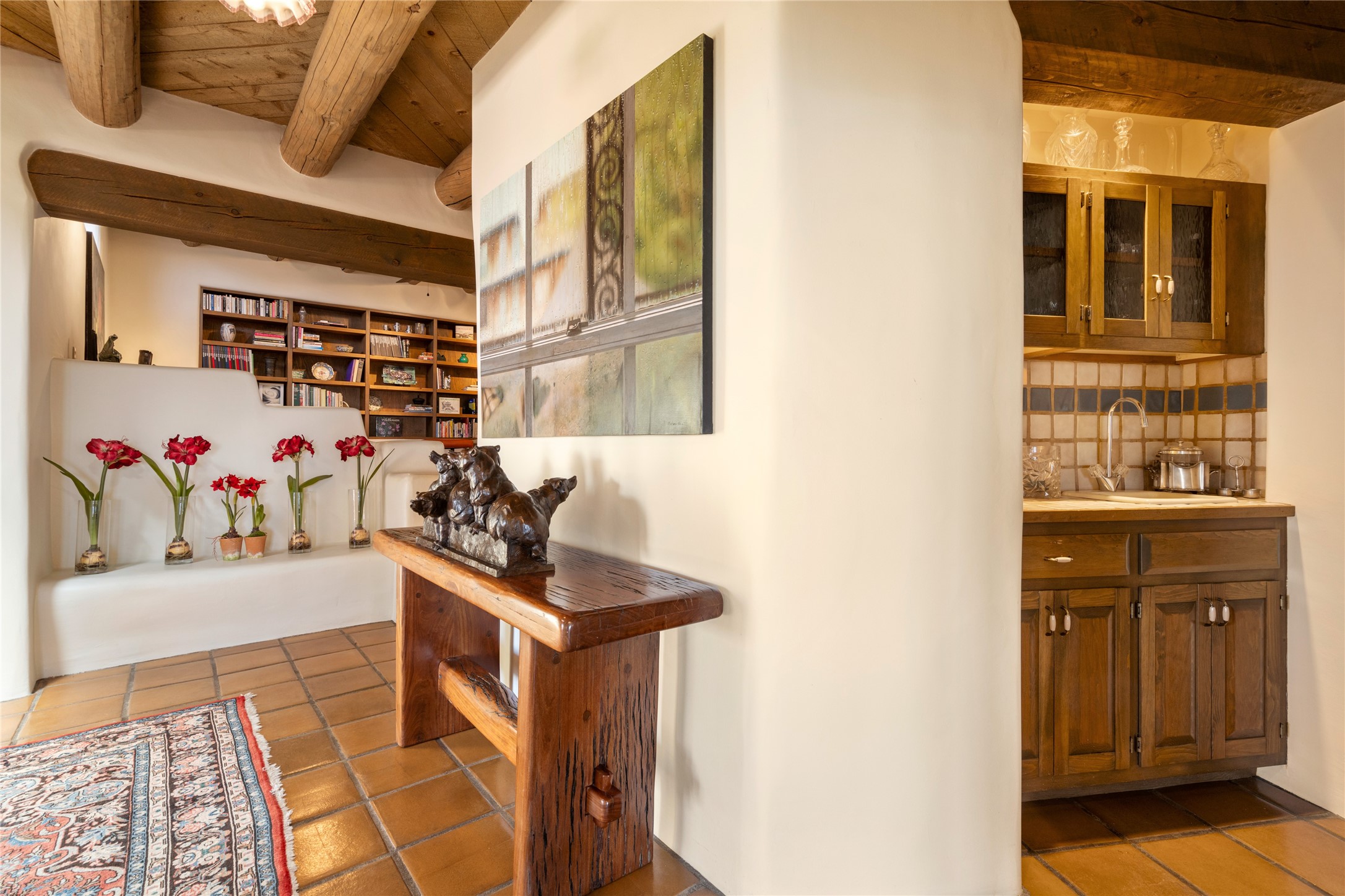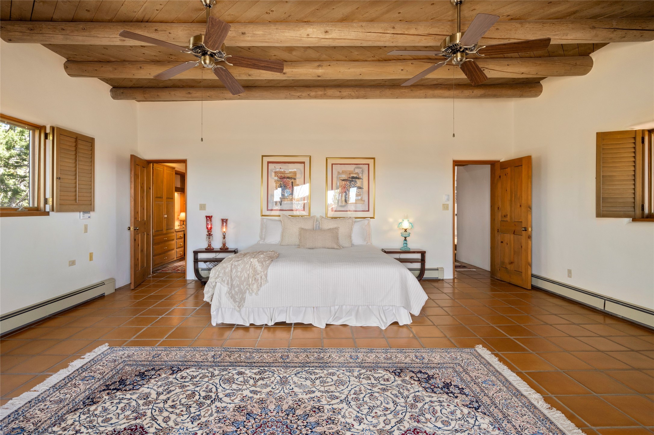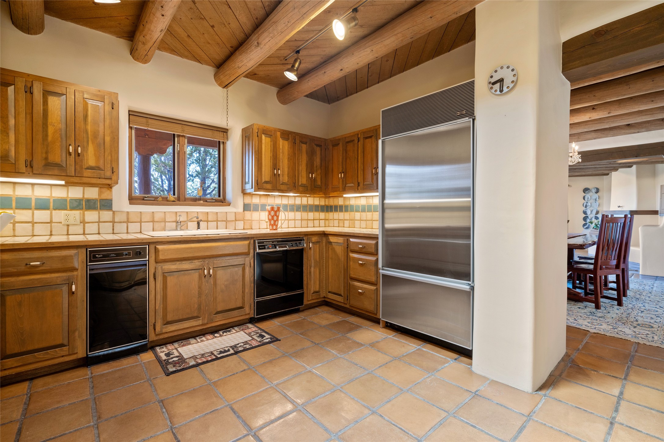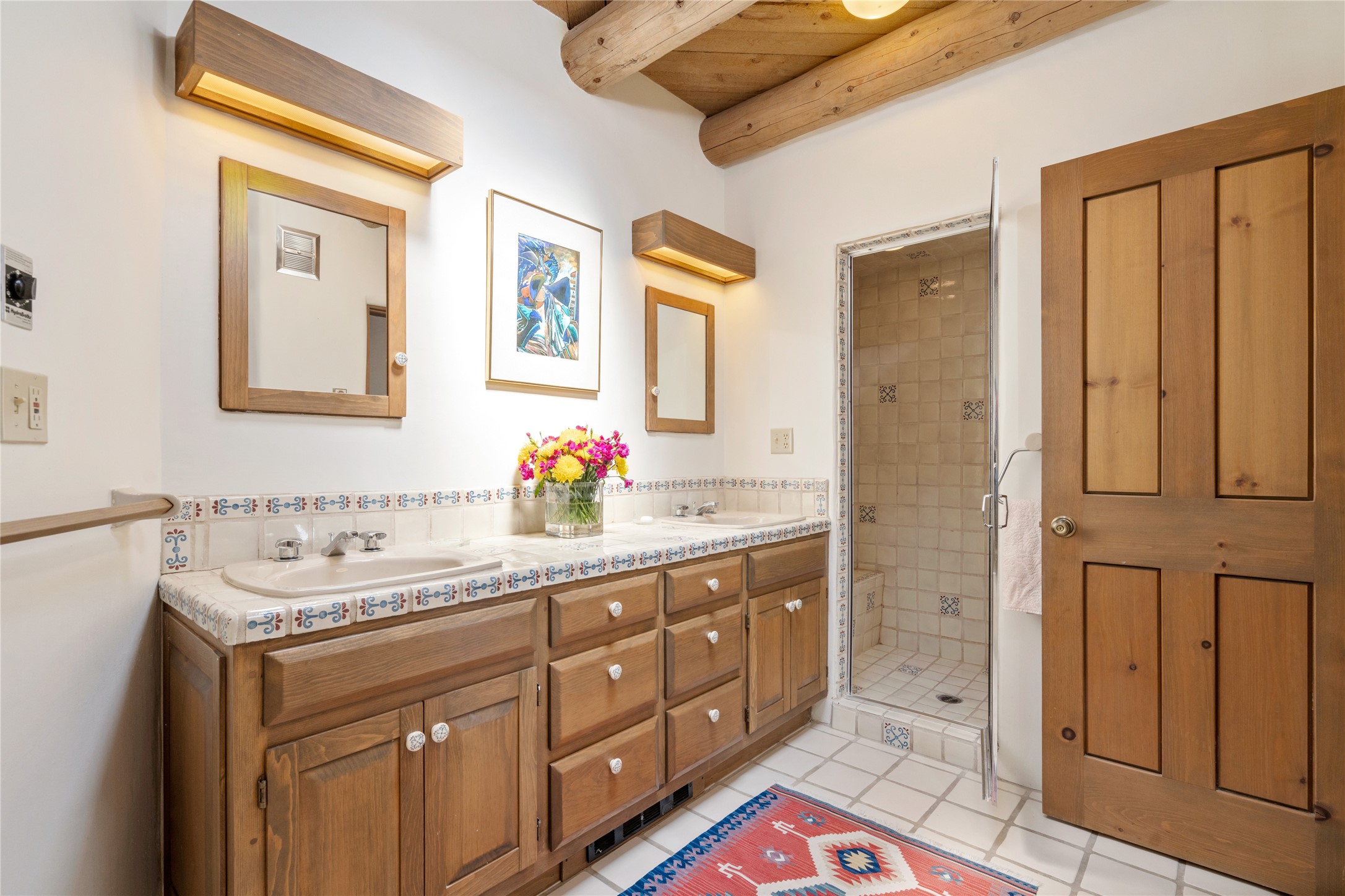 Located in the prestigious gated community of Los Caminitos in Tesuque, New Mexico, 61 Calle Encanto is a spacious residence that offers both comfort and tranquility sited on 8+ acres of scenic land. Traditional Santa Fe features are abundant. The property boasts panoramic views of the Jemez and distant mountain ranges, as well as the Santa Fe Opera house, providing a backdrop of natural beauty that enhances its peaceful, private setting. Sunrises, sunsets, and starry nights will delight. This gracious four-bedroom, five bath home features two primary suites and a private guest wing - thoughtfully separated from the main living areas. The floor plan offers privacy for all and generous living spaces. Additionally, there is an inviting den/library with ample shelves and a cozy fireplace. Another of the home's highlights is its large wrap-around portal, offering shaded spaces for enjoying the serene environment and views or hosting gatherings. The mature landscaping complements the property's natural surroundings. In addition to the property's private amenities, residents of Los Caminitos have access to an inviting clubhouse, with a pool, tennis court, and pickleball court - adding to the lifestyle appeal.