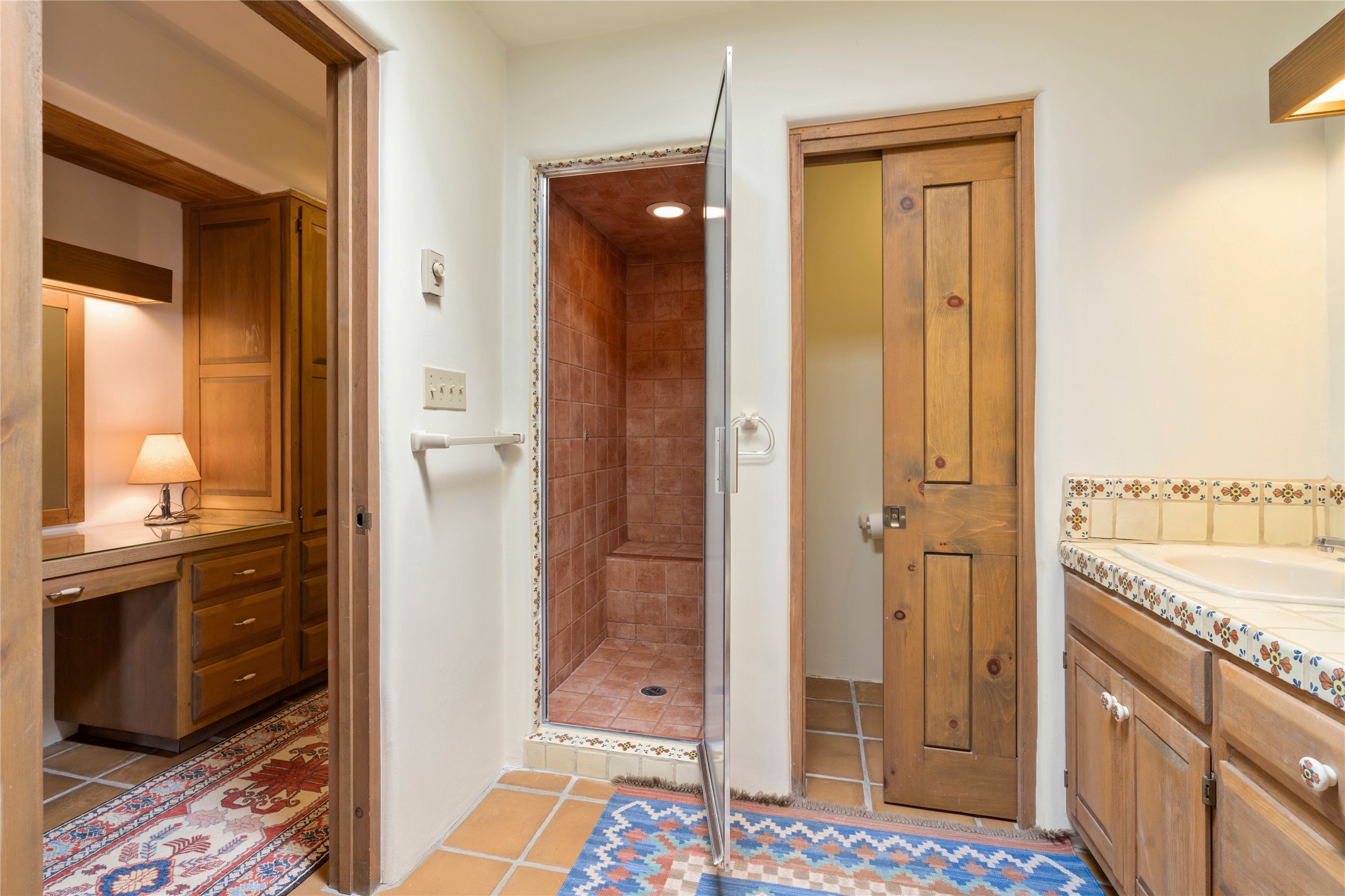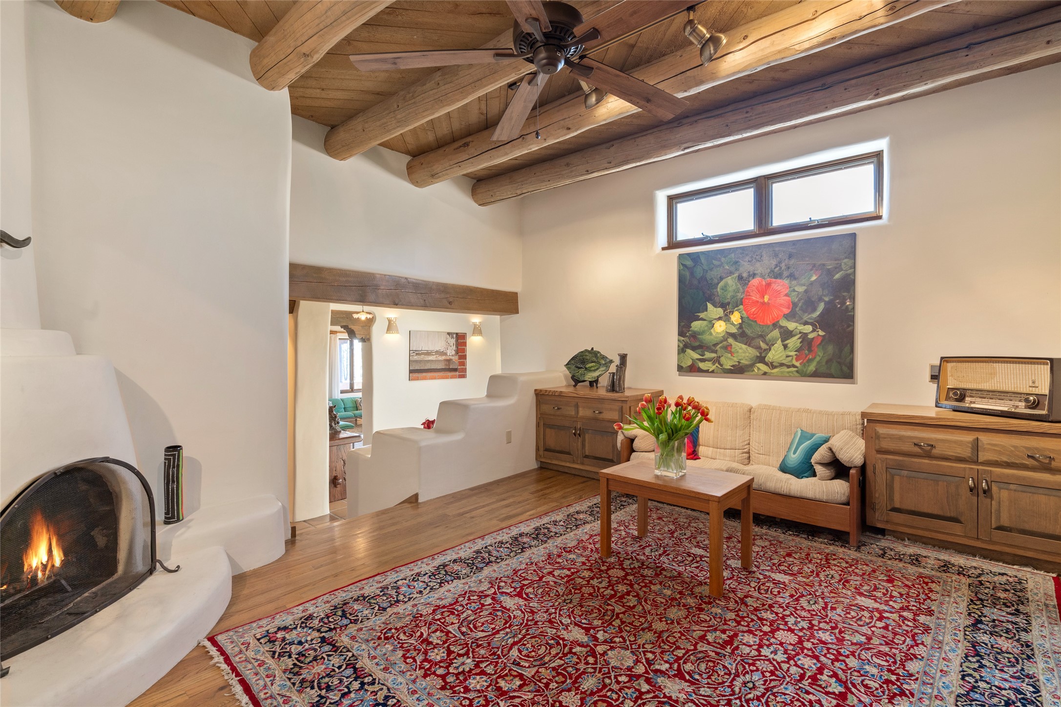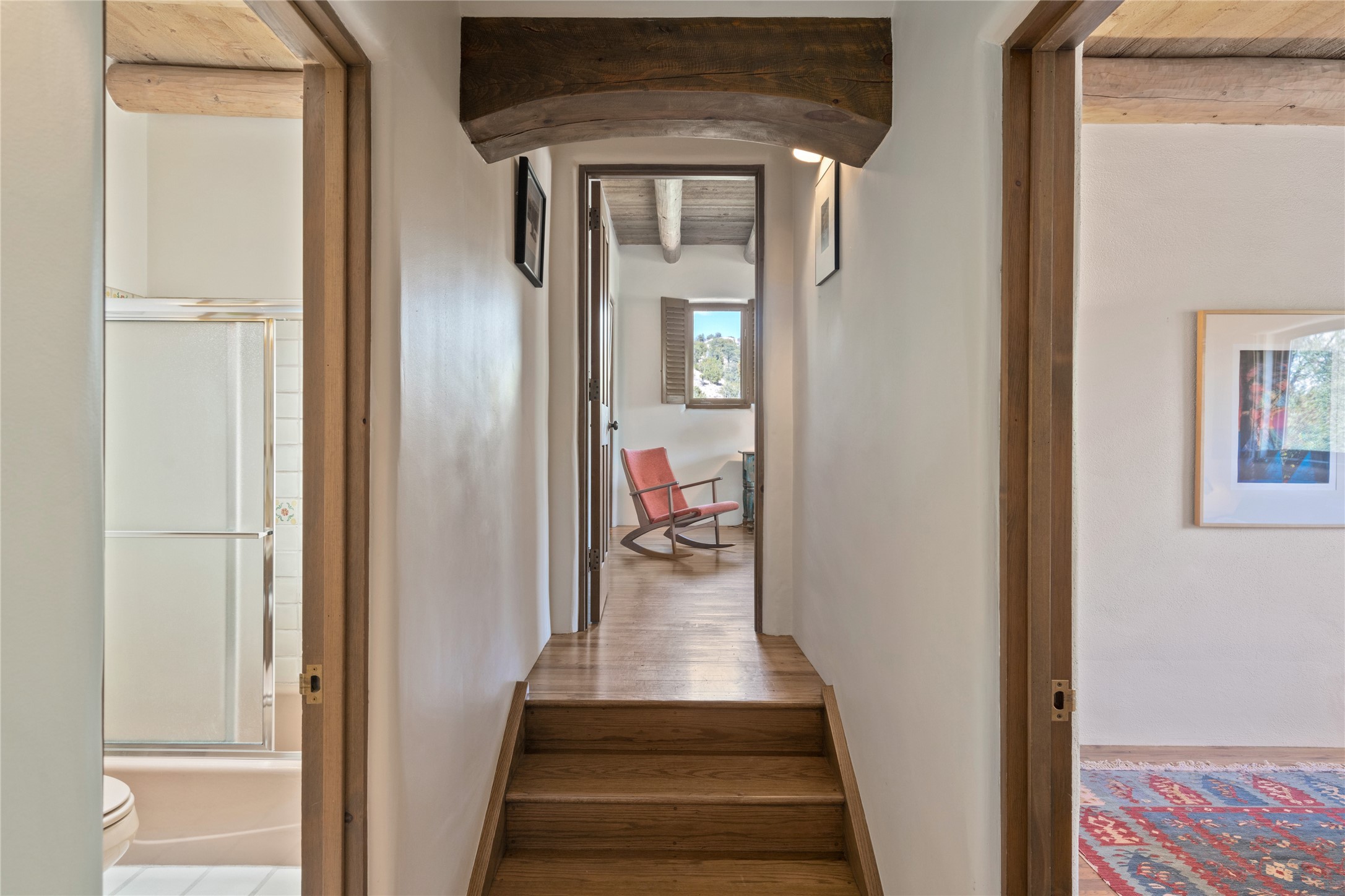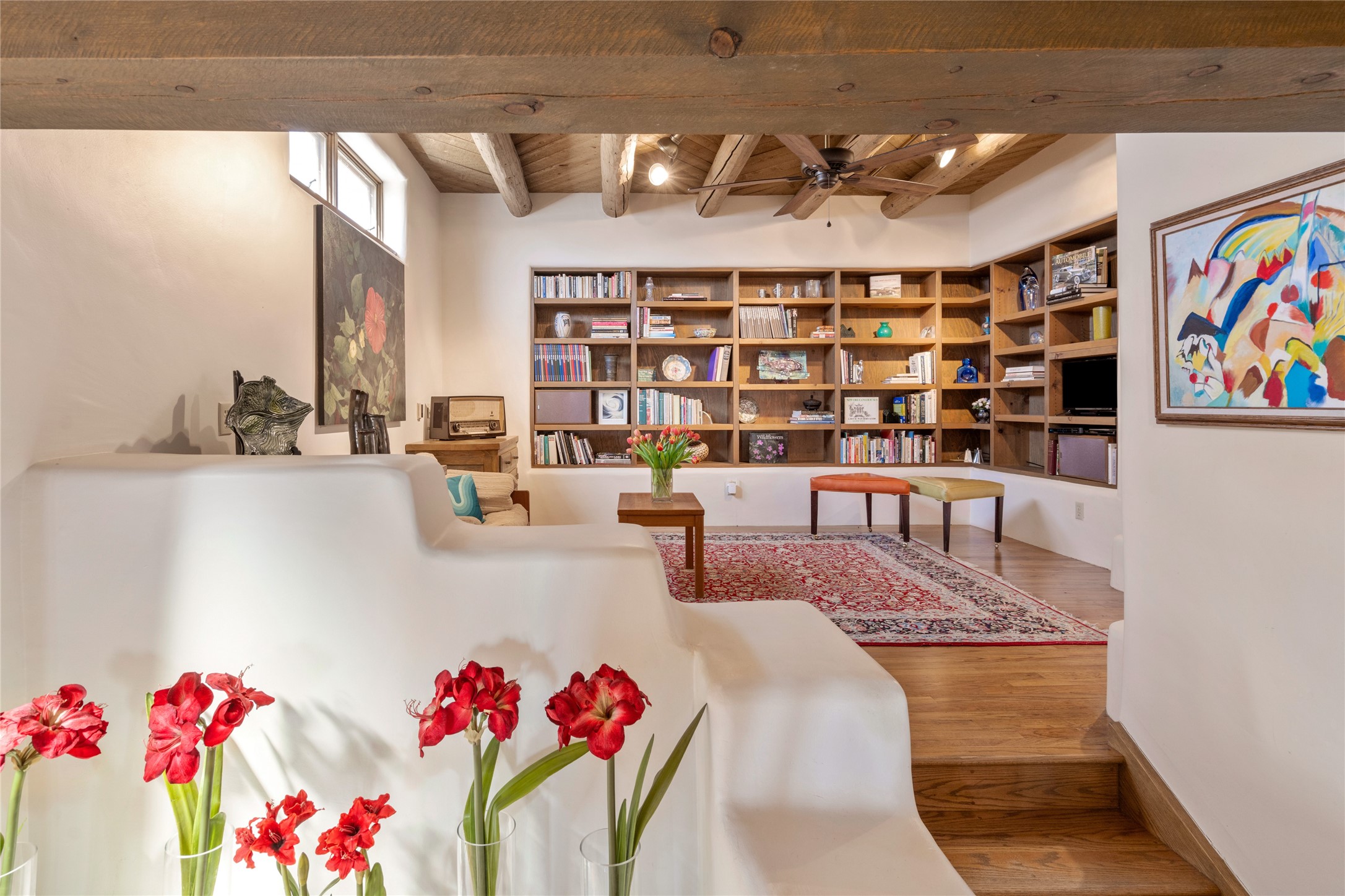 Located in the prestigious gated community of Los Caminitos in Tesuque, New Mexico, 61 Calle Encanto is a spacious residence that offers both comfort and tranquility sited on 8+ acres of scenic land. Traditional Santa Fe features are abundant. The property boasts panoramic views of the Jemez and distant mountain ranges, as well as the Santa Fe Opera house, providing a backdrop of natural beauty that enhances its peaceful, private setting. Sunrises, sunsets, and starry nights will delight. This gracious four-bedroom, five bath home features two primary suites and a private guest wing - thoughtfully separated from the main living areas. The floor plan offers privacy for all and generous living spaces. Additionally, there is an inviting den/library with ample shelves and a cozy fireplace. Another of the home's highlights is its large wrap-around portal, offering shaded spaces for enjoying the serene environment and views or hosting gatherings. The mature landscaping complements the property's natural surroundings. In addition to the property's private amenities, residents of Los Caminitos have access to an inviting clubhouse, with a pool, tennis court, and pickleball court - adding to the lifestyle appeal.