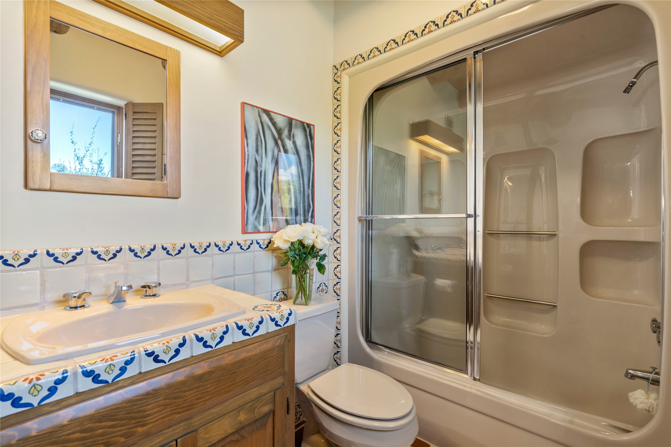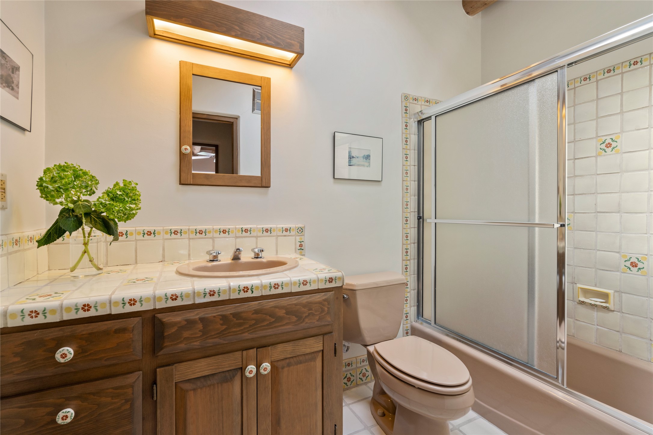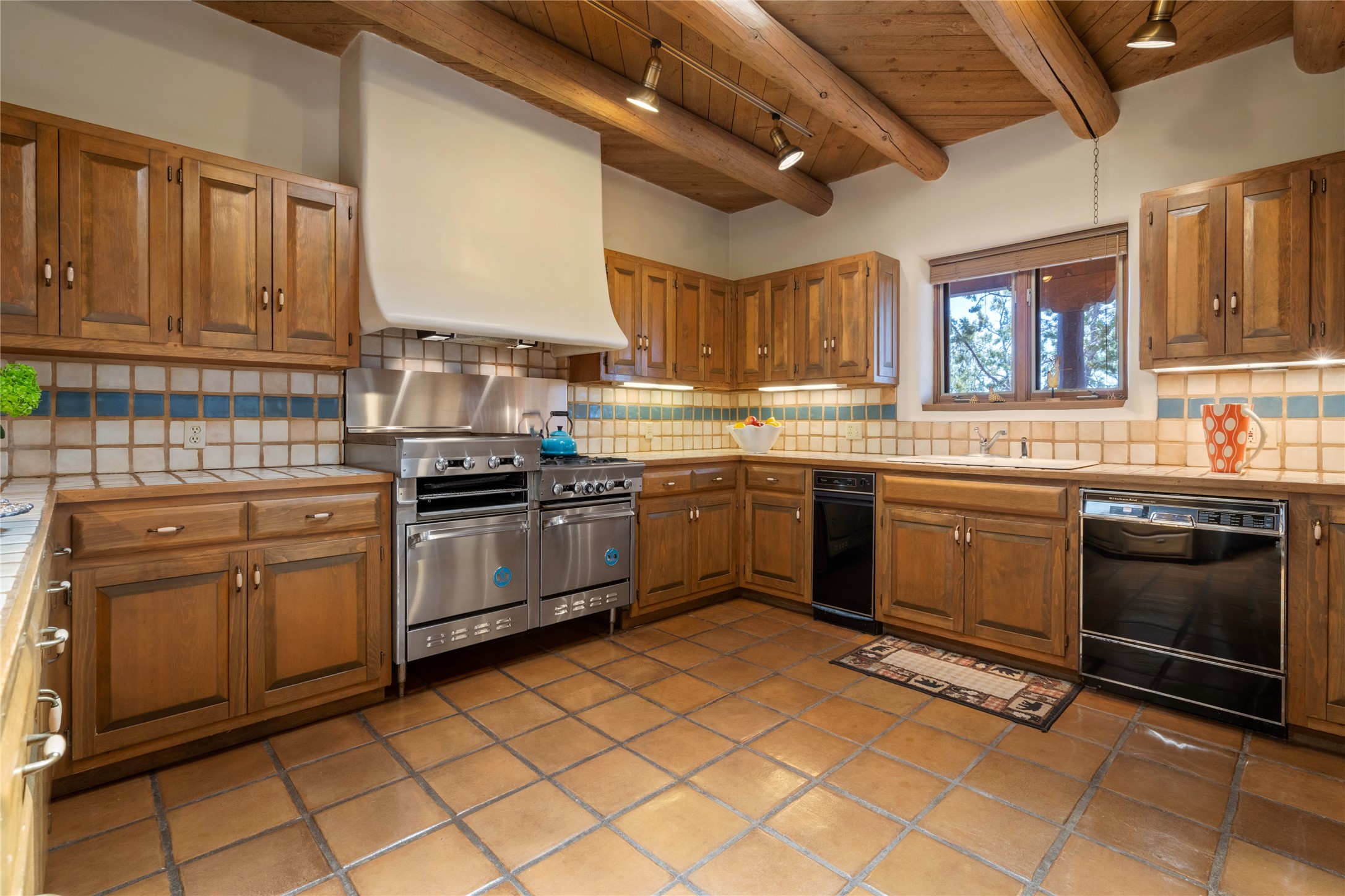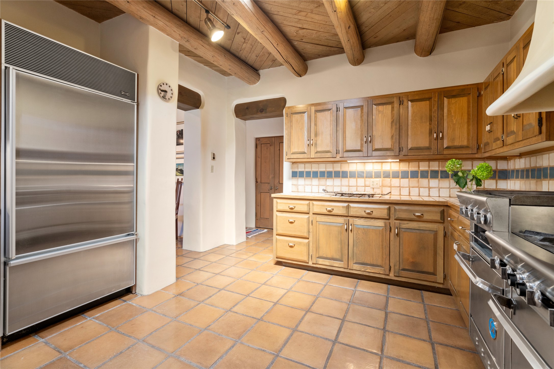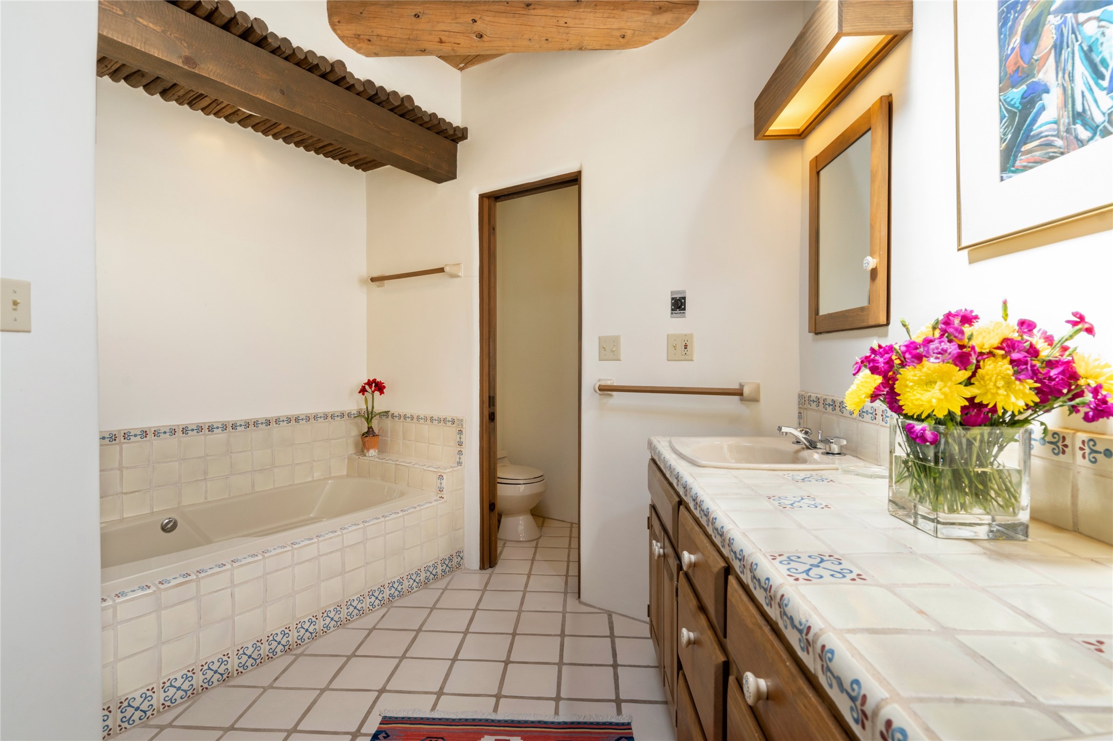 Located in the prestigious gated community of Los Caminitos in Tesuque, New Mexico, 61 Calle Encanto is a spacious residence that offers both comfort and tranquility sited on 8+ acres of scenic land. Traditional Santa Fe features are abundant. The property boasts panoramic views of the Jemez and distant mountain ranges, as well as the Santa Fe Opera house, providing a backdrop of natural beauty that enhances its peaceful, private setting. Sunrises, sunsets, and starry nights will delight. This gracious four-bedroom, five bath home features two primary suites and a private guest wing - thoughtfully separated from the main living areas. The floor plan offers privacy for all and generous living spaces. Additionally, there is an inviting den/library with ample shelves and a cozy fireplace. Another of the home's highlights is its large wrap-around portal, offering shaded spaces for enjoying the serene environment and views or hosting gatherings. The mature landscaping complements the property's natural surroundings. In addition to the property's private amenities, residents of Los Caminitos have access to an inviting clubhouse, with a pool, tennis court, and pickleball court - adding to the lifestyle appeal.