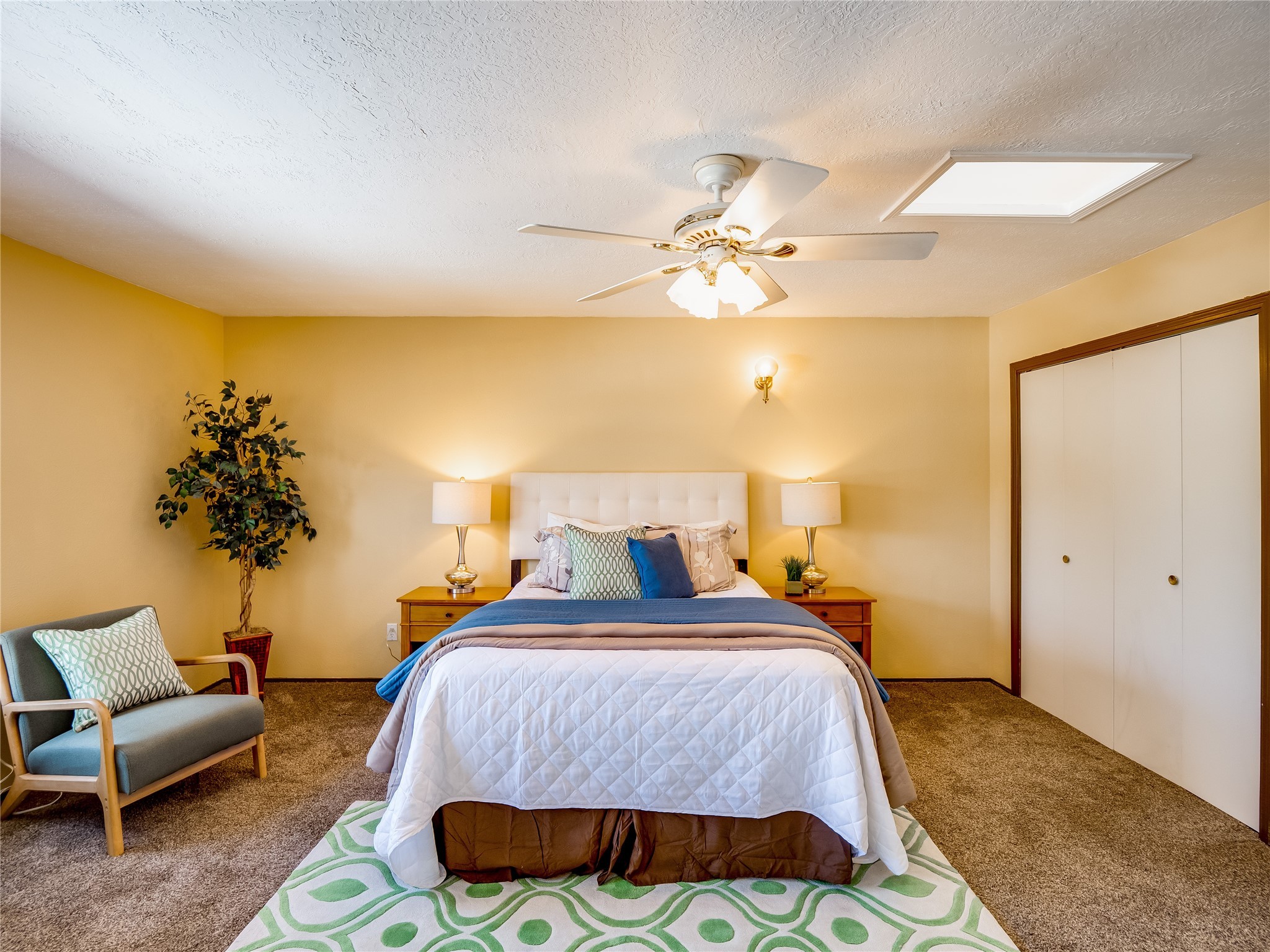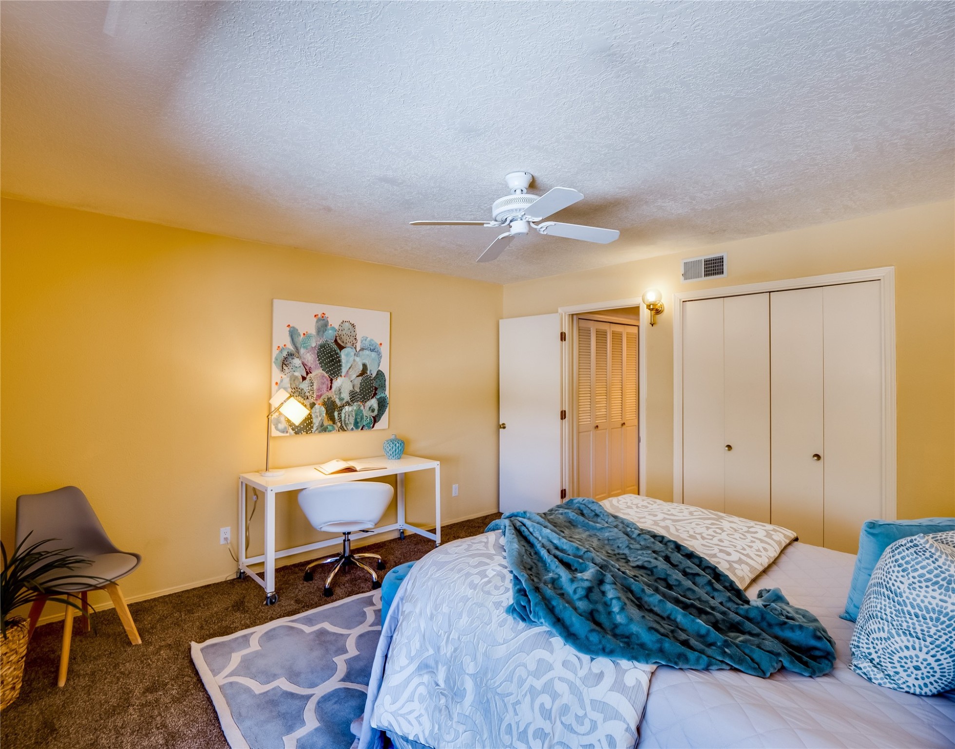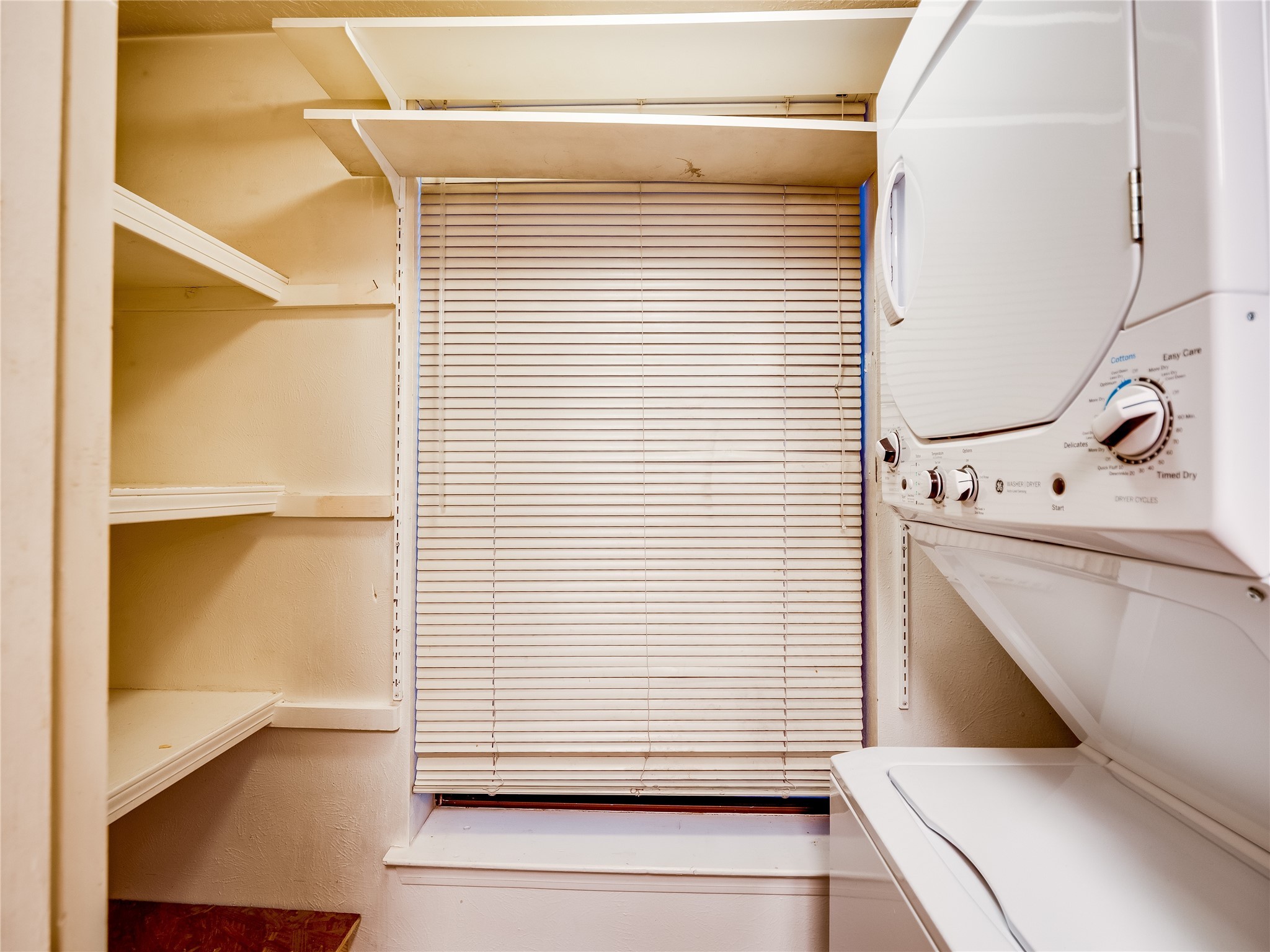 Welcome to this inviting two-story condo in the desirable Ridge Park community, offering serene treeline views from its second-floor location. Step inside to a welcoming entrance with tile flooring and a convenient coat closet. The spacious and inviting living room is the heart of the home, featuring soaring vaulted ceilings that enhance the open and airy feel. Plush carpeting adds warmth underfoot, while a wood-burning fireplace with a classic mantel serves as a cozy focal point, perfect for chilly evenings. Natural light streams in through large sliding glass doors, which lead to a covered deck, offering a peaceful outdoor retreat with treetop views. A striking spiral staircase adds architectural charm, leading to the loft-style primary suite on the second floor. The open-concept design seamlessly connects the living room to the dining area and kitchen, making the space perfect for both relaxing and entertaining. The bright galley-style kitchen features warm wood cabinetry, stylish black hardware, laminate flooring, and a passthrough window that doubles as bar seating. Just off the kitchen, you'll find a laundry closet with a stackable washer and dryer, plus built-in shelving for added convenience. A hallway with two additional storage closets leads to a full guest bathroom, complete with a single sink vanity and a tiled shower/tub combination. The spacious guest bedroom offers direct access to the covered deck, providing a private retreat with tranquil views. Upstairs, the loft-style primary en-suite is a spacious and serene escape, tucked away for ultimate privacy. The room boasts double closets offering ample storage and organization and a well-appointed bathroom with a large sink vanity and a walk-in tiled shower. Located near parks, shopping, and restaurants, this lovely condo is ready to welcome you home. Added amenities include a community pool, clubhouse, and fitness room. Don't miss your chance to see this beautiful home and schedule a viewing today!