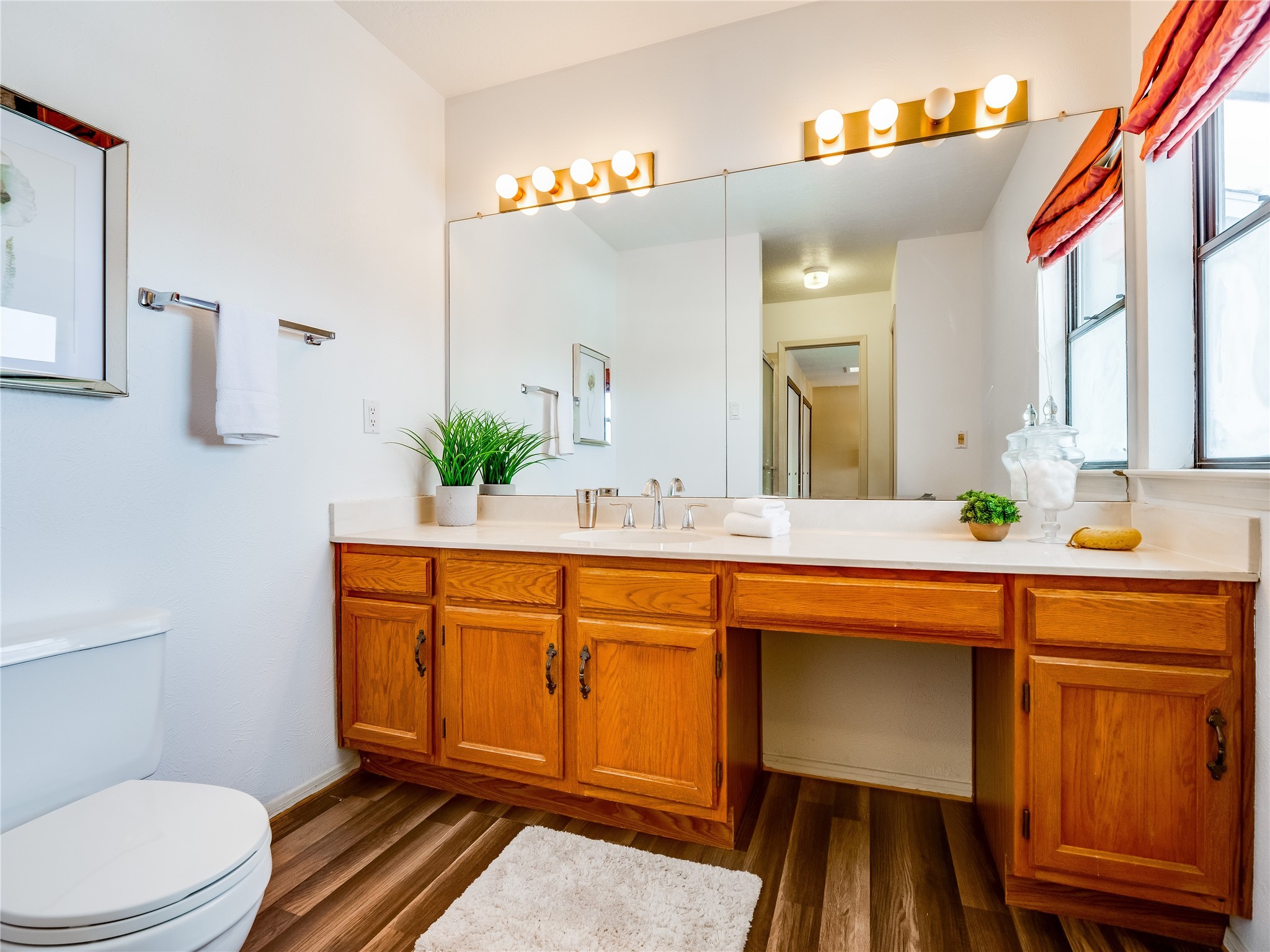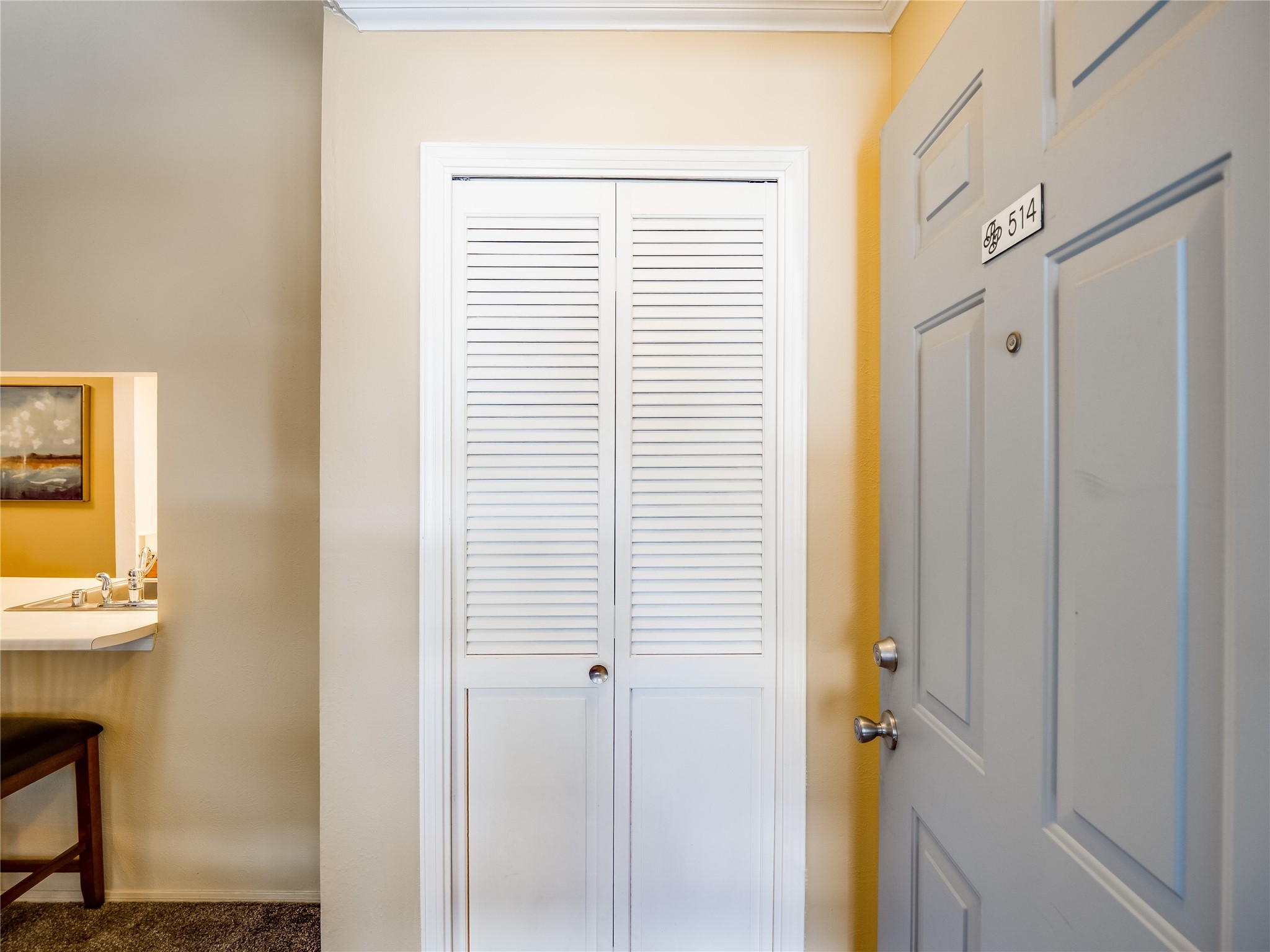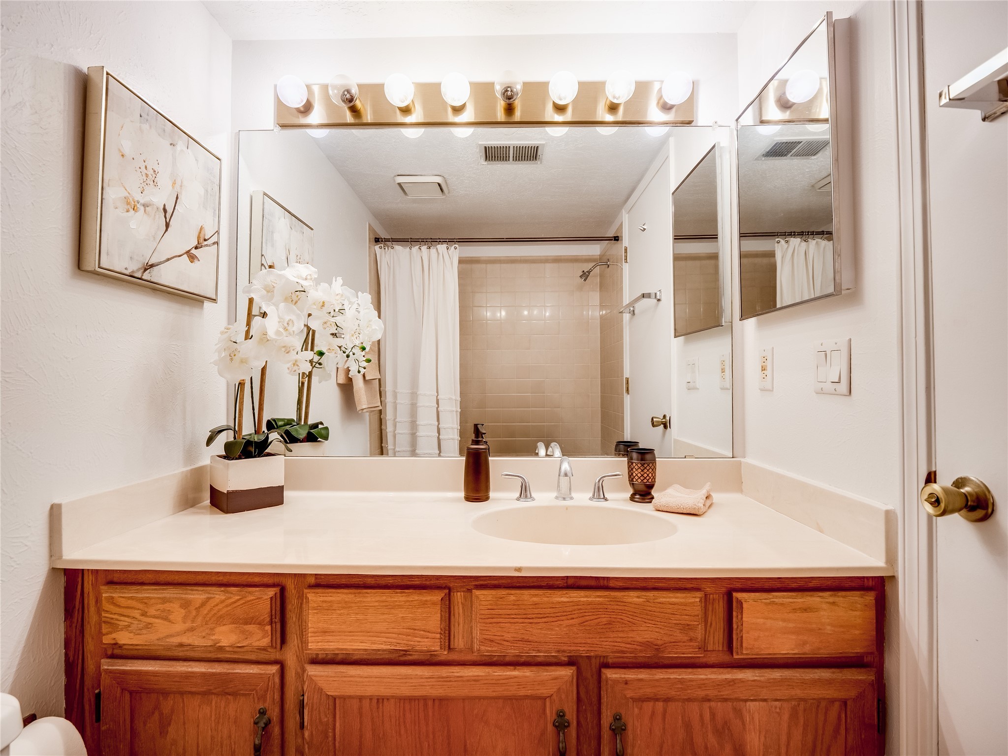 Welcome to this inviting two-story condo in the desirable Ridge Park community, offering serene treeline views from its second-floor location. Step inside to a welcoming entrance with tile flooring and a convenient coat closet. The spacious and inviting living room is the heart of the home, featuring soaring vaulted ceilings that enhance the open and airy feel. Plush carpeting adds warmth underfoot, while a wood-burning fireplace with a classic mantel serves as a cozy focal point, perfect for chilly evenings. Natural light streams in through large sliding glass doors, which lead to a covered deck, offering a peaceful outdoor retreat with treetop views. A striking spiral staircase adds architectural charm, leading to the loft-style primary suite on the second floor. The open-concept design seamlessly connects the living room to the dining area and kitchen, making the space perfect for both relaxing and entertaining. The bright galley-style kitchen features warm wood cabinetry, stylish black hardware, laminate flooring, and a passthrough window that doubles as bar seating. Just off the kitchen, you'll find a laundry closet with a stackable washer and dryer, plus built-in shelving for added convenience. A hallway with two additional storage closets leads to a full guest bathroom, complete with a single sink vanity and a tiled shower/tub combination. The spacious guest bedroom offers direct access to the covered deck, providing a private retreat with tranquil views. Upstairs, the loft-style primary en-suite is a spacious and serene escape, tucked away for ultimate privacy. The room boasts double closets offering ample storage and organization and a well-appointed bathroom with a large sink vanity and a walk-in tiled shower. Located near parks, shopping, and restaurants, this lovely condo is ready to welcome you home. Added amenities include a community pool, clubhouse, and fitness room. Don't miss your chance to see this beautiful home and schedule a viewing today!
