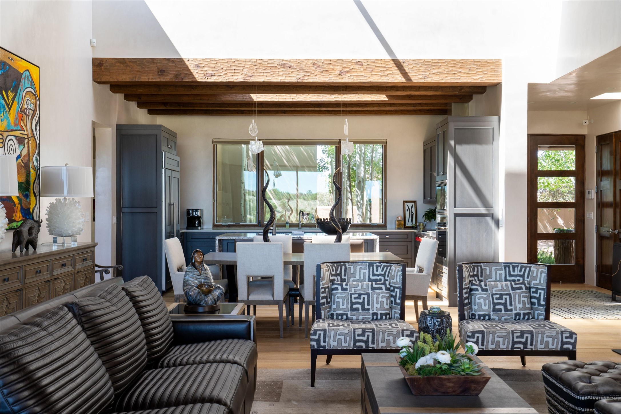 Step into this extraordinary home in Las Campanas, where modern design and natural beauty converge. Stunning 3-bedroom, 3-bath residence offers breathtaking views of the mountains and golf course, creating a picturesque backdrop for your everyday life. Crafted by the award-winning Tierra Concepts, this home exemplifies sophistication and style. The design seamlessly merges indoor and outdoor living with large disappearing window walls and oversized windows. Interior spaces have been thoughtfully curated by Santa Fe designer J. Douglas of J. Douglas Design, showcasing distinctive finishes that elevate the living experience. From the inviting wood ceilings with solid wood beams to the elegant hard-troweled diamond plaster walls and high-quality white oak flooring, every element reflects a commitment to quality and aesthetics. Gourmet kitchen is appointed a Wolf oven and range, Subzero refrigerator, and Asko dishwasher. Spacious primary bedroom features a fireplace, expansive walk-in closet, and a luxury bathroom with separated dual sinks, a soaking tub, and a walk-in shower. Entertaining is effortless with brick patios designed for outdoor dining and leisure, all framed by courtyard walls. Sustainable landscaping with a timed irrigation system that utilizes buried roof water harvesting cisterns alongside community water. 2-car garage equipped with an EV charging station. Experience the perfect blend of luxury and nature where every detail is designed for a lifestyle of elegance and ease.