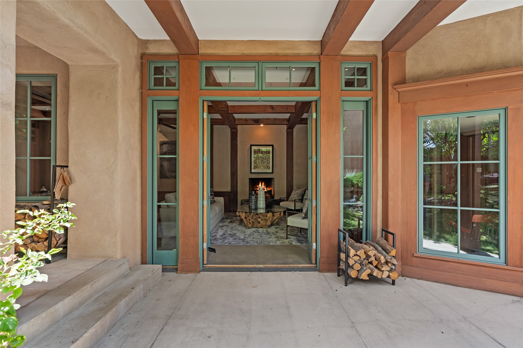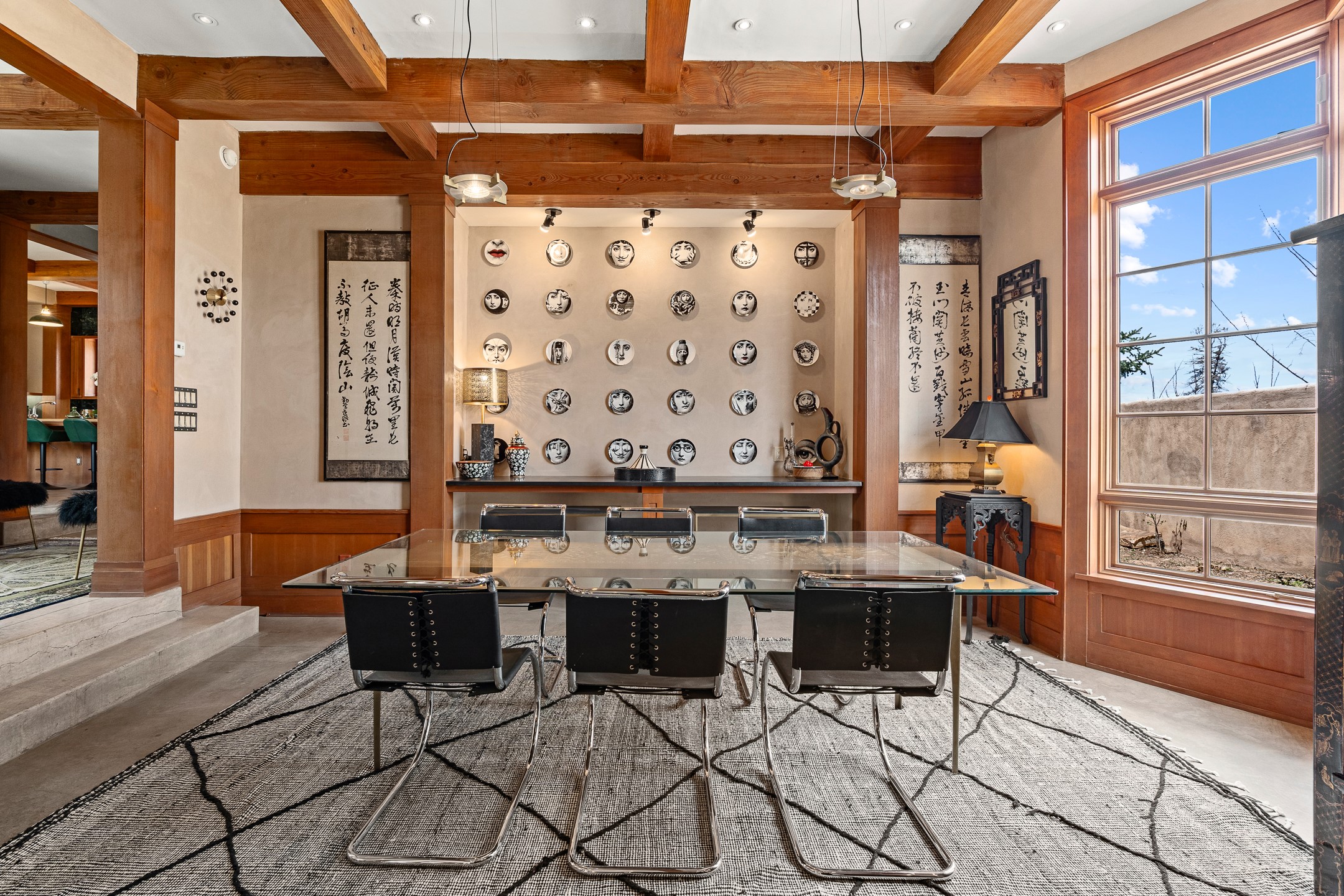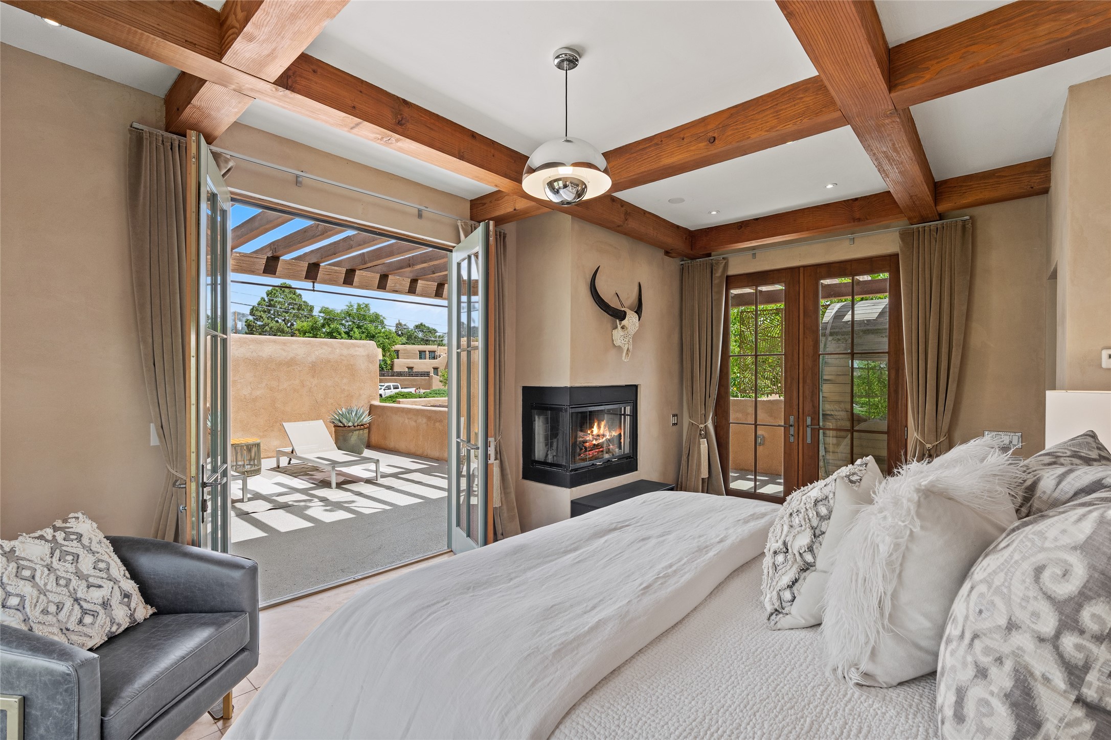 An Architectural & Design Masterpiece.A brilliant collaboration between renowned architect and designer has produced a serene, sophisticated sanctuary in one of Santa Fe's most desirable neighborhoods. This private, gated, 4-bedroom, 4-bath compound is located in the coveted Eastside along the Old Santa Fe trail just moments from the Plaza, Canyon Road, museums, shopping, and world-class dining. Recently elevated with extensive high-end upgrades, the property seamlessly blends quality craftsmanship with timeless elegance. Architectural highlights include soaring ceilings, natural American Clay plaster walls, Douglas Fir coffered wood beam ceilings, and dramatic floor-to-ceiling transom windows. Expertly curated lighting creates a warm and refined ambiance throughout. At the heart of the home is a stunning chef's kitchen--outfitted with a Subzero refrigerator and new Viking appliances--overlooking a beautifully landscaped central courtyard designed for effortless indoor/outdoor living. Each room opens to this verdant garden oasis featuring a tranquil waterfall fountain, lush greenery, alfresco dining, and multiple verandas for entertaining. The grand living and dining rooms are anchored by a natural stone fireplace and expansive glass doors that frame a courtyard garden with mature Wisteria, Aspen, and a stately Cherry tree. Upstairs, the luxurious primary suite offers breathtaking views of Picacho Peak and includes a spa-like bath with Jacuzzi tub, steam shower, dual vanities, and walk-in closet. The crown jewel: a private rooftop terrace with fireplace, cedar hot tub, sauna, and wrap-around deck--perfect for starry Santa Fe nights. Additional amenities include a 2.5-car garage, new mini splits, recessed lighting, designer tile work, and custom draperies. This property is currently part of a rare compound opportunity with 994 Old Pecos Trail next door. While both homes are offered individually, a buyer also has the unique opportunity to purchase them together and create an extraordinary multi-residence estate. (See listing #202501401.)