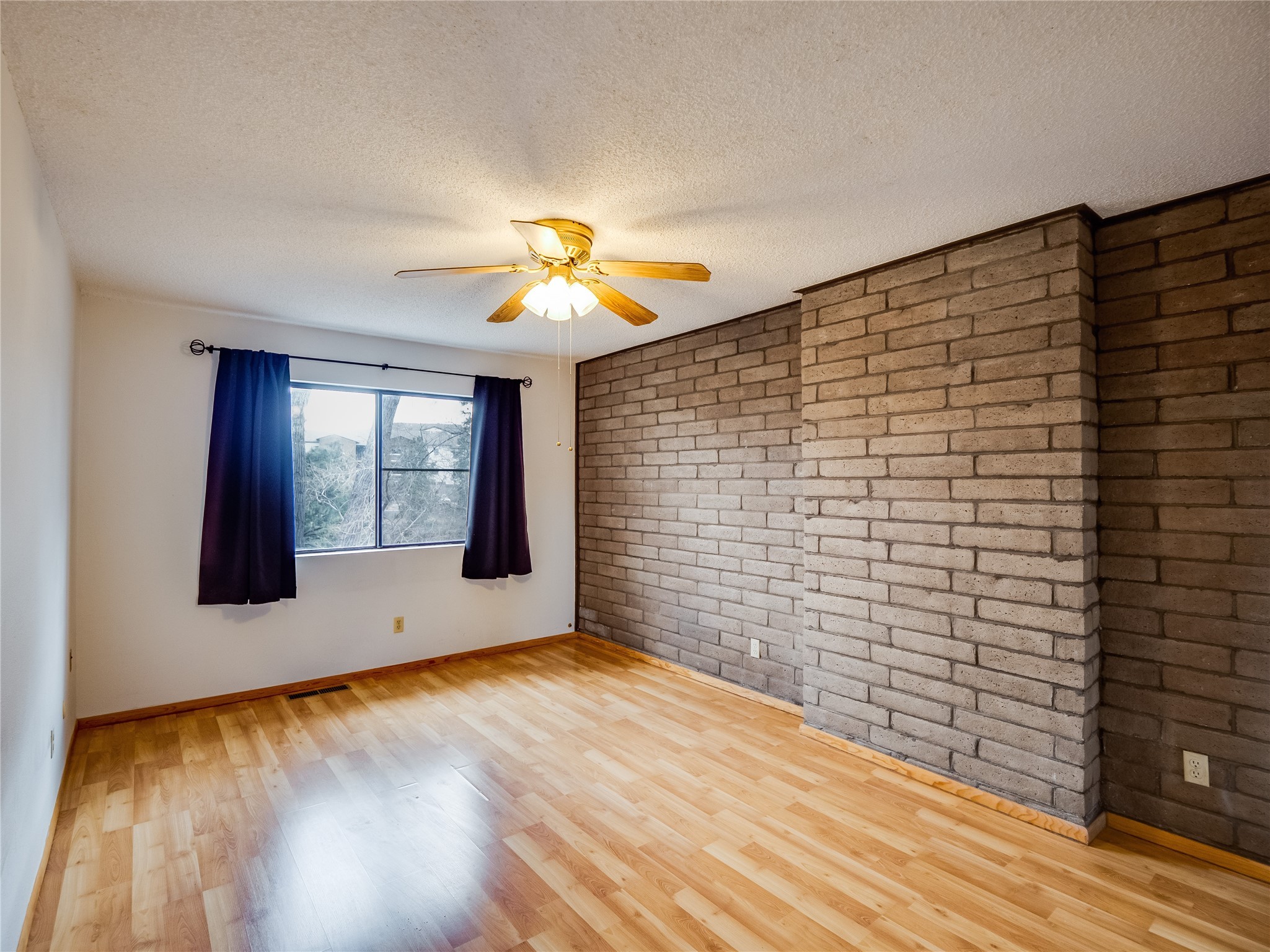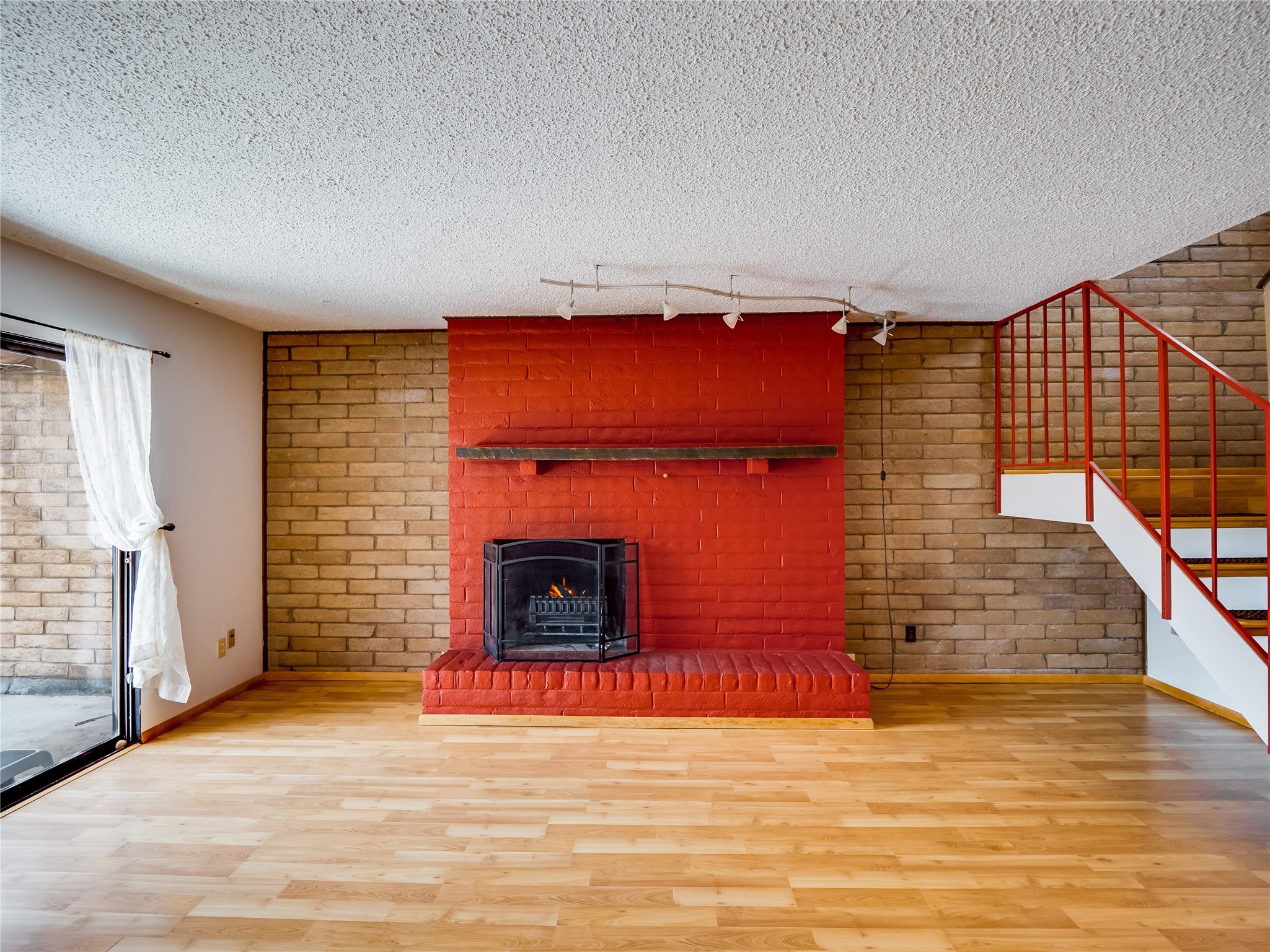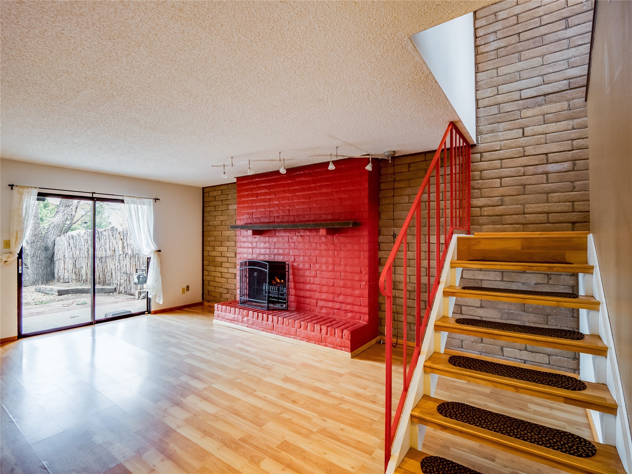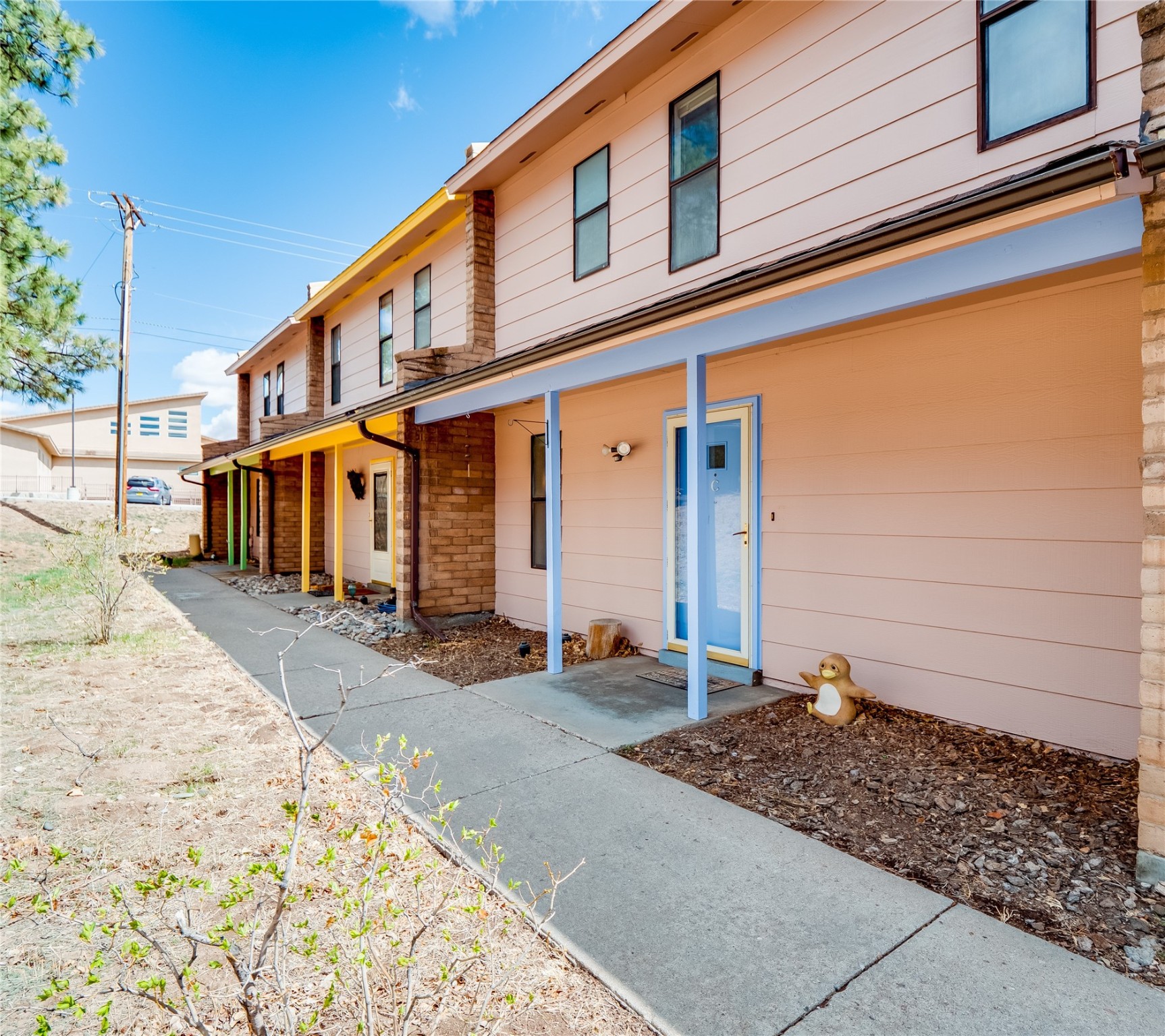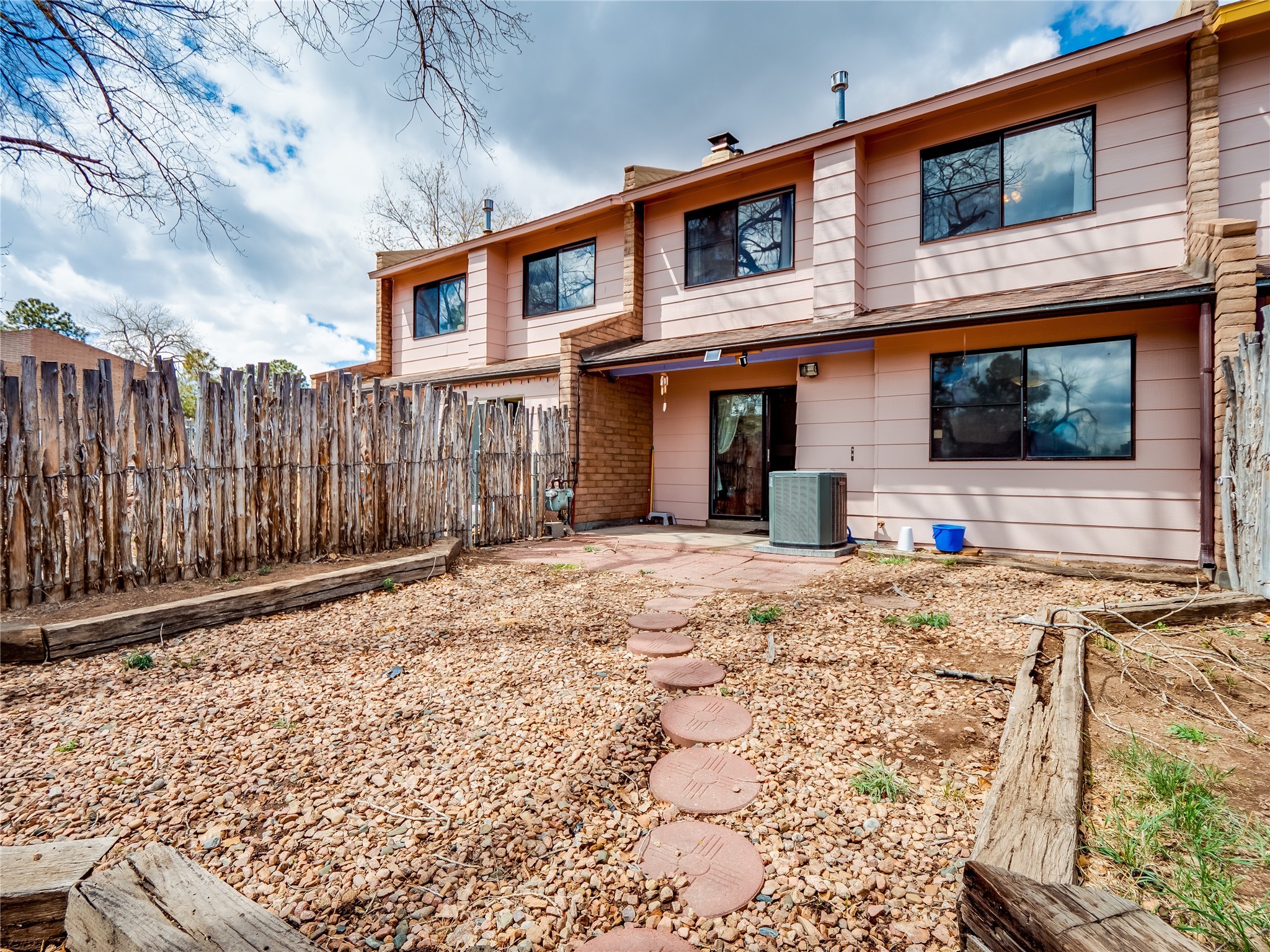 Discover character and comfort in this unique two-story condo perched above the canyon in the sought-after Eastern Area. From your designated parking spots, descend to your front entrance and step into a welcoming foyer featuring a convenient coat closet and a deep storage closet--perfect for stashing gear and everyday essentials. Light-colored laminate wood flooring flows throughout the home, creating a bright and cohesive aesthetic. The spacious living room invites you in with a stunning focal point, a vibrant painted brick fireplace accented by natural brick on either side, adding both warmth and personality. Sliding glass doors lead to a fully fenced yard with a covered patio--ideal for outdoor lounging and entertaining. There's also room for gardening and a large storage shed for all your tools and seasonal items. Just off the living area, the dining space seamlessly connects to the kitchen, promoting easy flow and conversation. The kitchen features tile flooring, rich wood cabinetry with sleek chrome hardware, light-colored countertops, and included black appliances that offer a classic contrast. Down the hallway, you'll find a well-placed powder room and a laundry space with stackable washer and dryer units that convey with the home, adding convenience to your daily routine. Upstairs, you'll find two generously sized bedrooms--nearly identical in layout--each offering plenty of natural light and ample closet space. One bedroom features a charming exposed brick wall, adding a touch of rustic texture and style. The full guest bathroom is equipped with a large single sink vanity, tiled flooring, and a tiled shower/tub combo for a timeless finish. Ideally located close to the gym, parks, shopping, and more, this condo offers the best of both nature and convenience. With its canyon-side setting, outdoor space, and thoughtful interior touches, this home is ready to welcome you. Come see it for yourself!