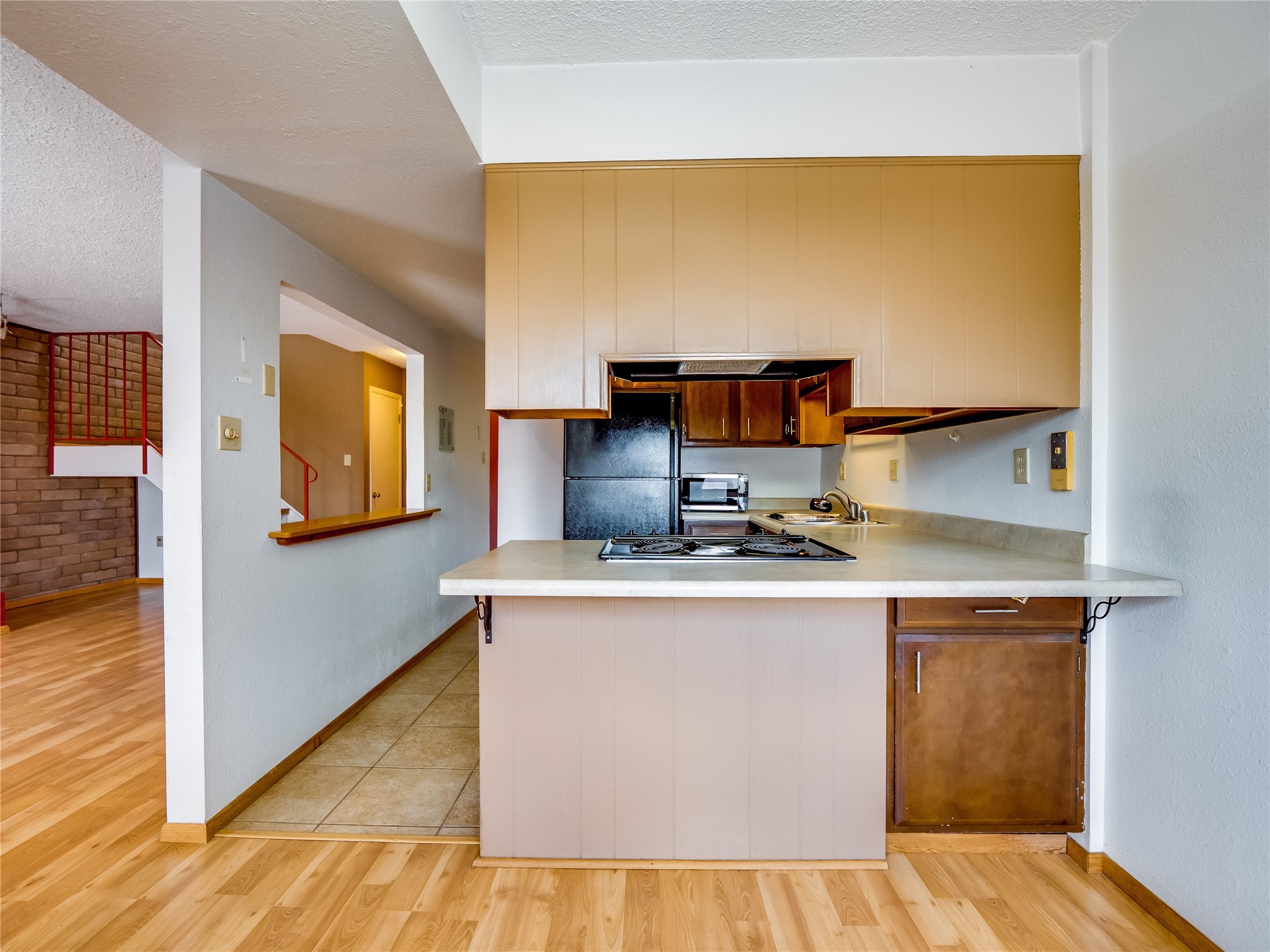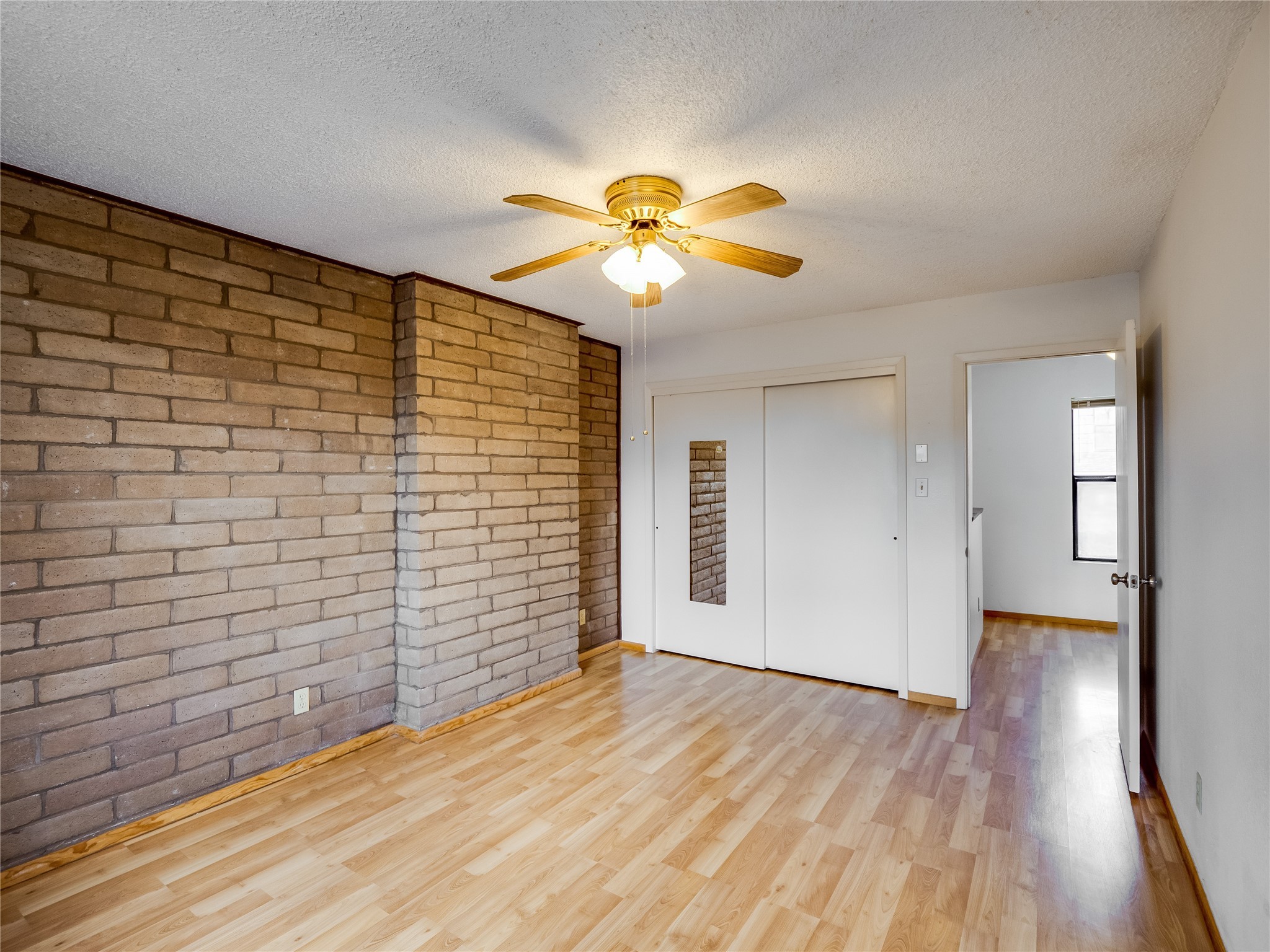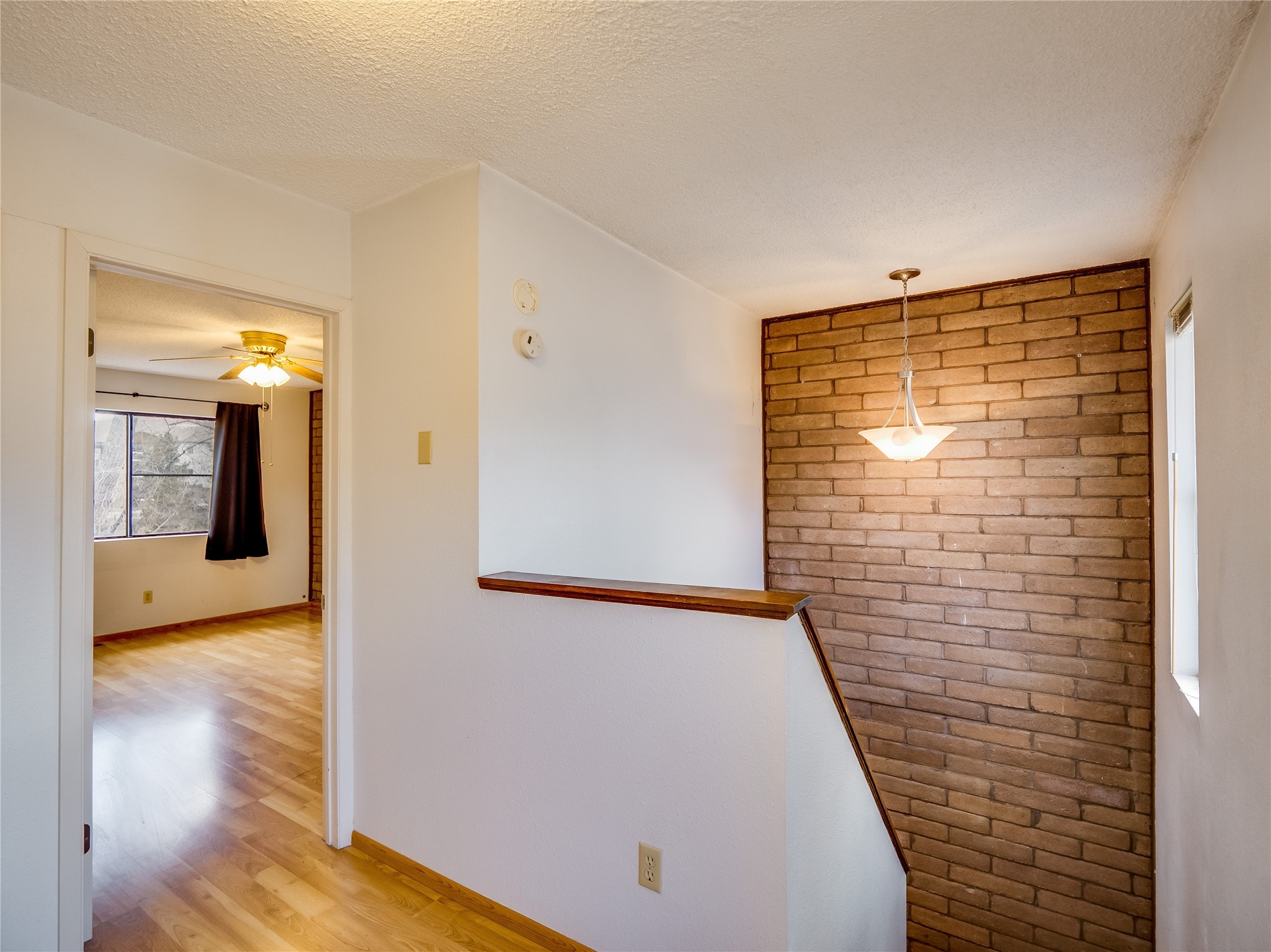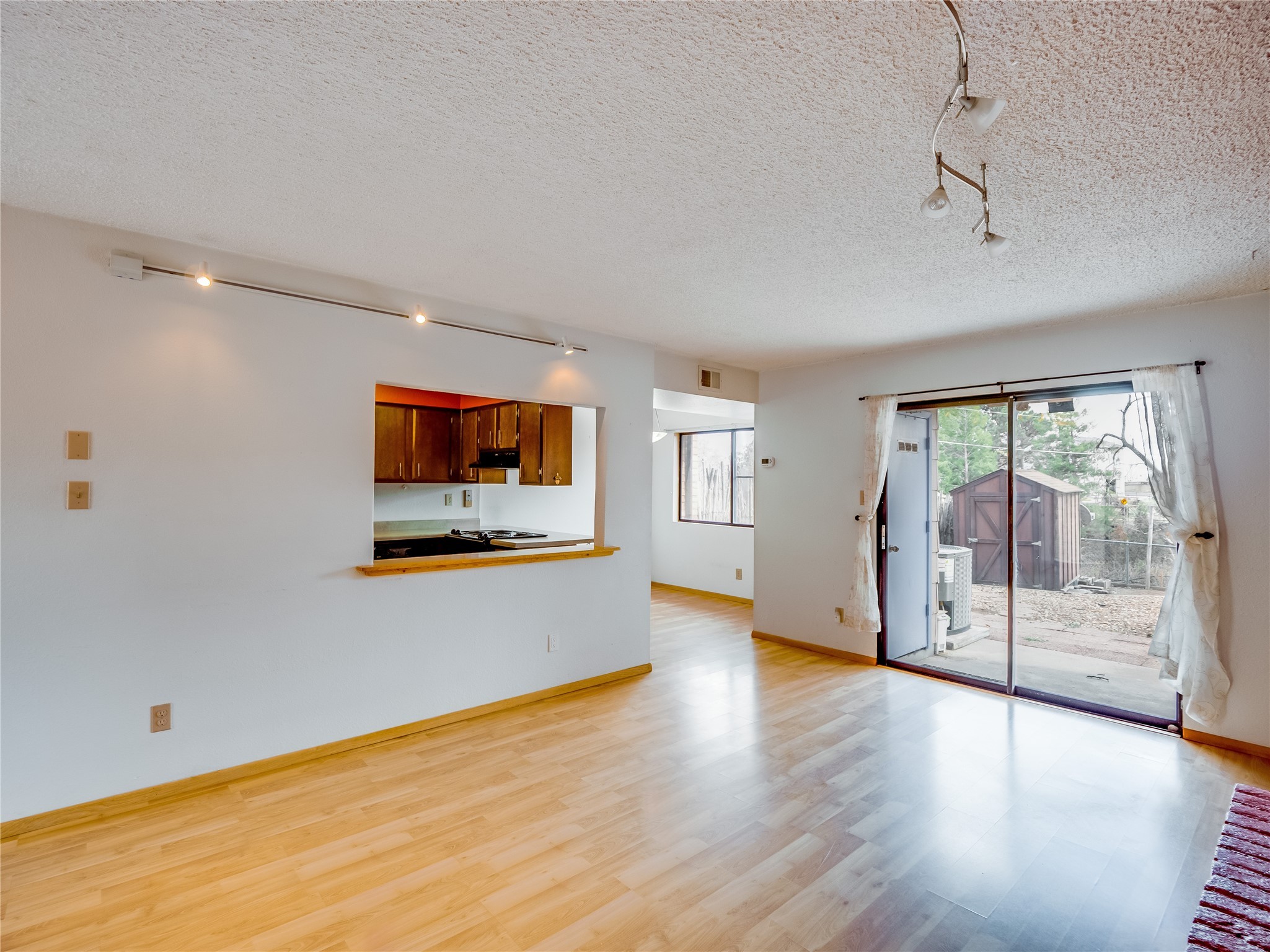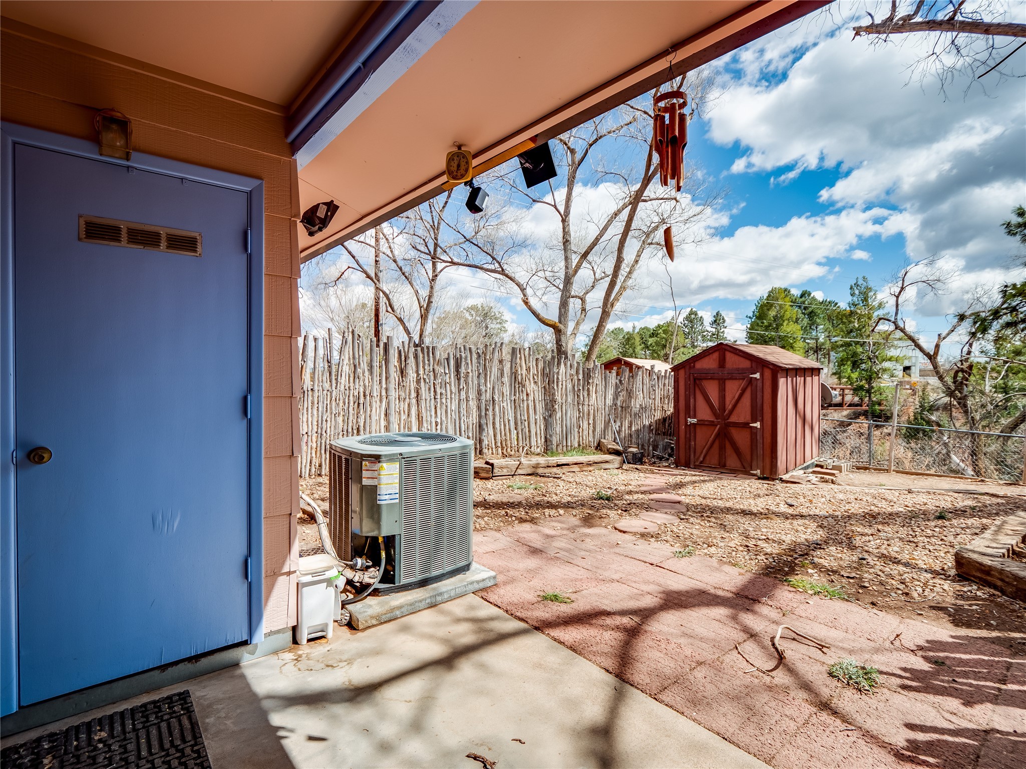 Discover character and comfort in this unique two-story condo perched above the canyon in the sought-after Eastern Area. From your designated parking spots, descend to your front entrance and step into a welcoming foyer featuring a convenient coat closet and a deep storage closet--perfect for stashing gear and everyday essentials. Light-colored laminate wood flooring flows throughout the home, creating a bright and cohesive aesthetic. The spacious living room invites you in with a stunning focal point, a vibrant painted brick fireplace accented by natural brick on either side, adding both warmth and personality. Sliding glass doors lead to a fully fenced yard with a covered patio--ideal for outdoor lounging and entertaining. There's also room for gardening and a large storage shed for all your tools and seasonal items. Just off the living area, the dining space seamlessly connects to the kitchen, promoting easy flow and conversation. The kitchen features tile flooring, rich wood cabinetry with sleek chrome hardware, light-colored countertops, and included black appliances that offer a classic contrast. Down the hallway, you'll find a well-placed powder room and a laundry space with stackable washer and dryer units that convey with the home, adding convenience to your daily routine. Upstairs, you'll find two generously sized bedrooms--nearly identical in layout--each offering plenty of natural light and ample closet space. One bedroom features a charming exposed brick wall, adding a touch of rustic texture and style. The full guest bathroom is equipped with a large single sink vanity, tiled flooring, and a tiled shower/tub combo for a timeless finish. Ideally located close to the gym, parks, shopping, and more, this condo offers the best of both nature and convenience. With its canyon-side setting, outdoor space, and thoughtful interior touches, this home is ready to welcome you. Come see it for yourself!