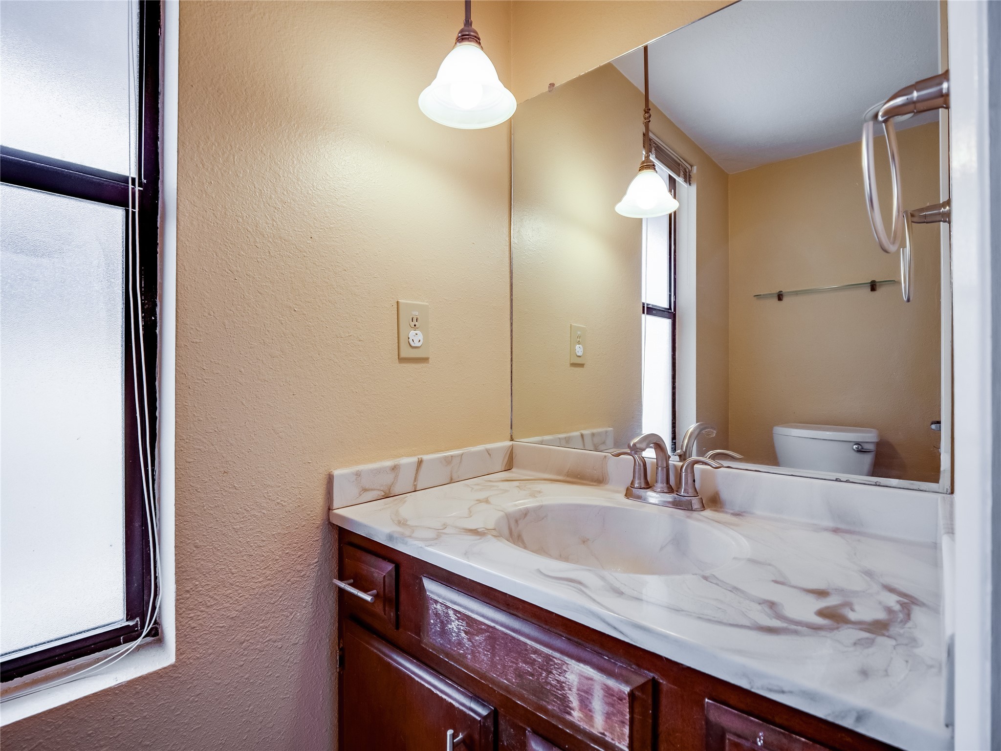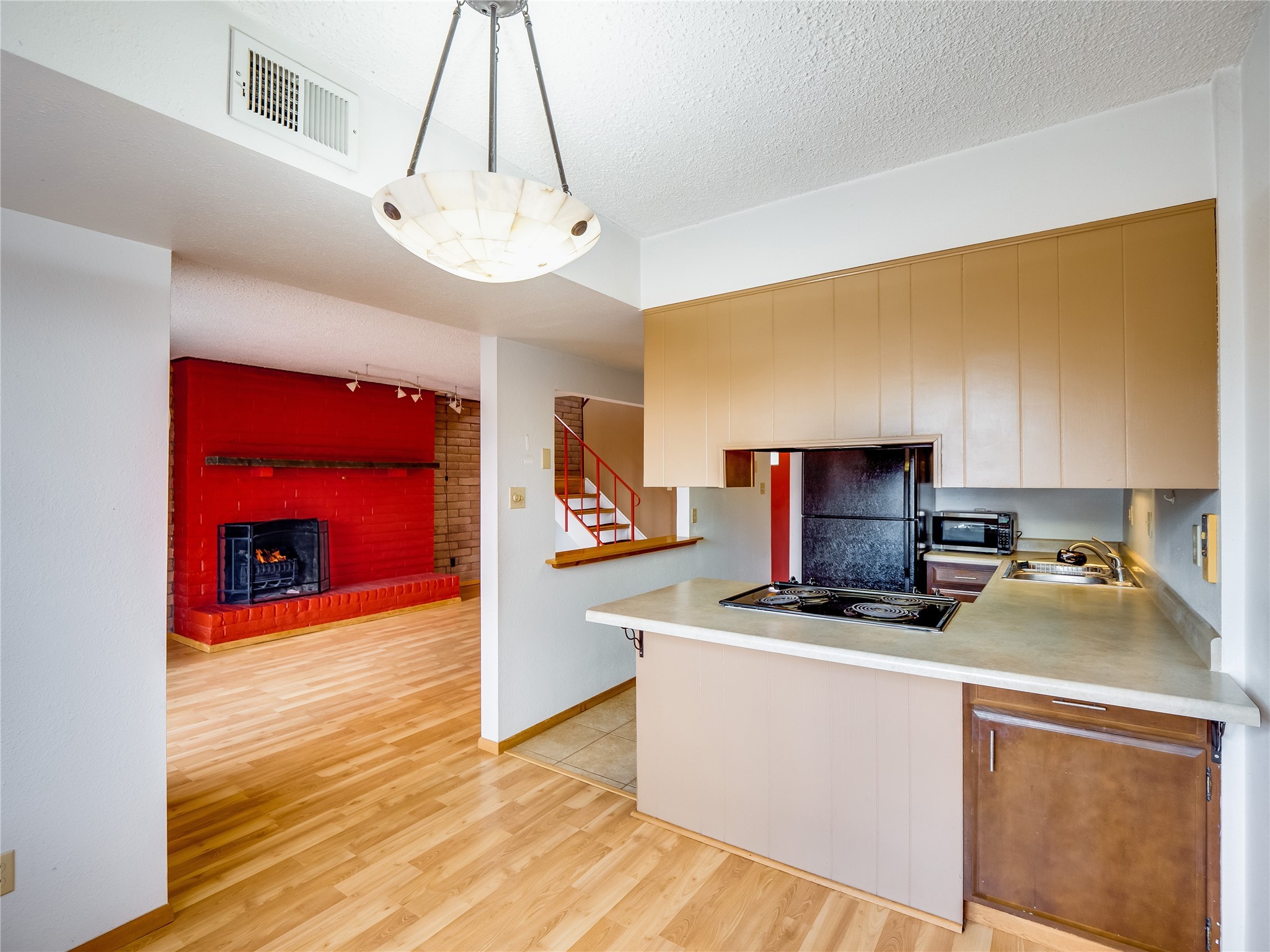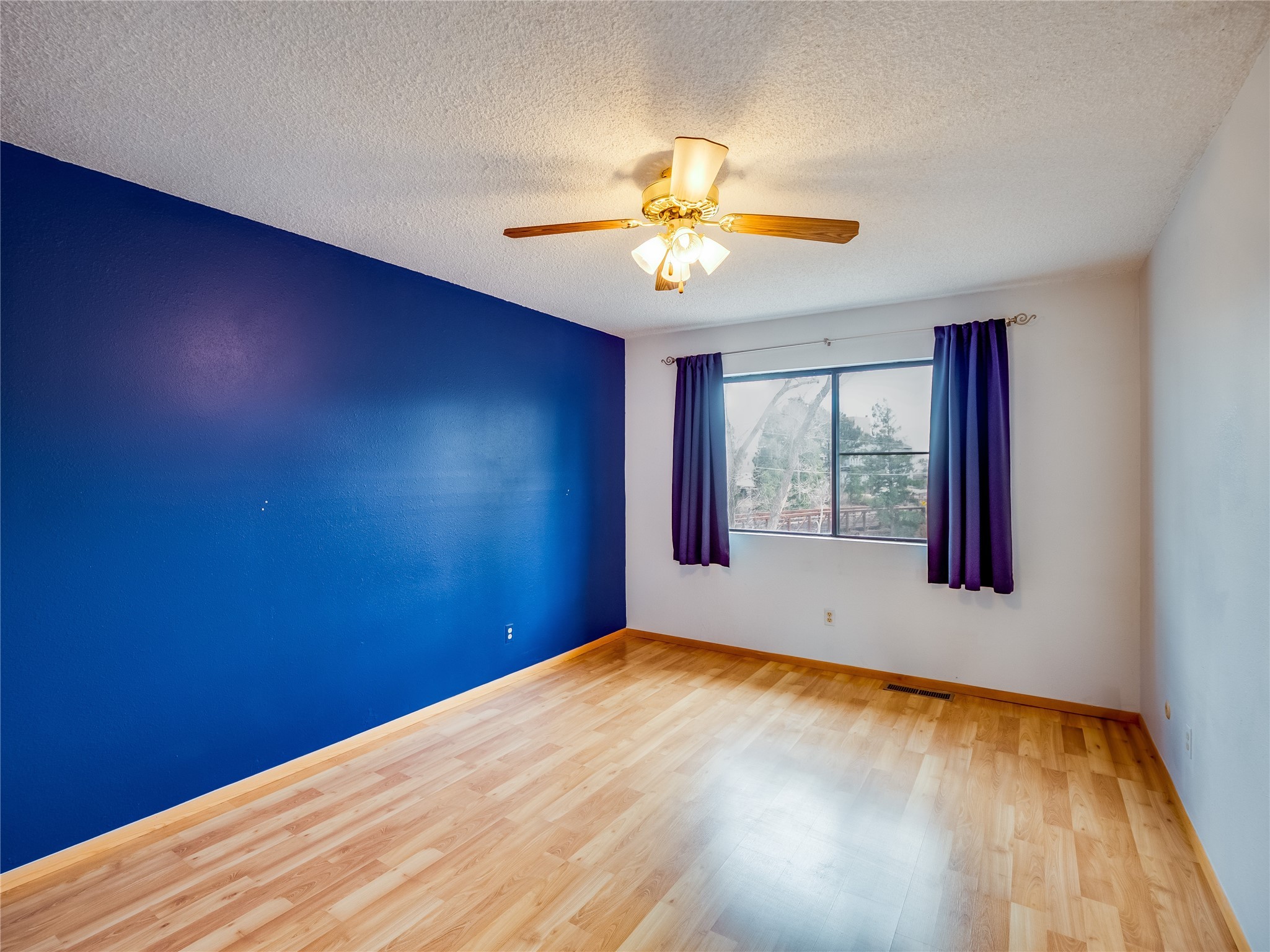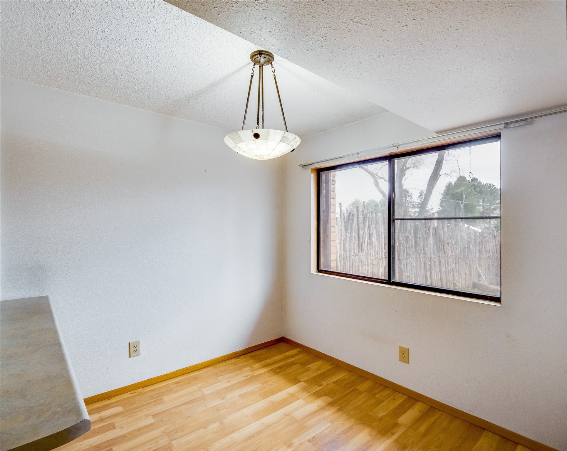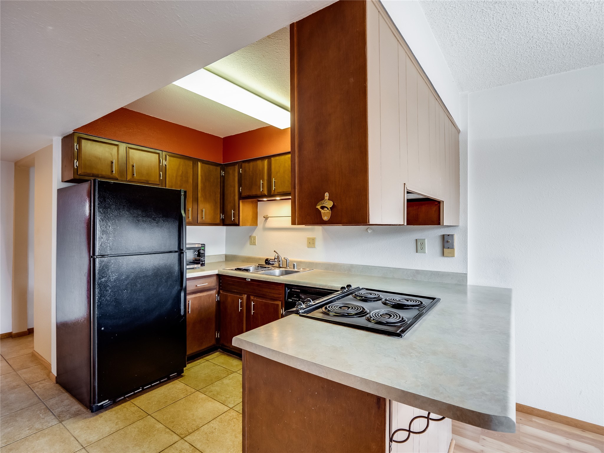 Discover character and comfort in this unique two-story condo perched above the canyon in the sought-after Eastern Area. From your designated parking spots, descend to your front entrance and step into a welcoming foyer featuring a convenient coat closet and a deep storage closet--perfect for stashing gear and everyday essentials. Light-colored laminate wood flooring flows throughout the home, creating a bright and cohesive aesthetic. The spacious living room invites you in with a stunning focal point, a vibrant painted brick fireplace accented by natural brick on either side, adding both warmth and personality. Sliding glass doors lead to a fully fenced yard with a covered patio--ideal for outdoor lounging and entertaining. There's also room for gardening and a large storage shed for all your tools and seasonal items. Just off the living area, the dining space seamlessly connects to the kitchen, promoting easy flow and conversation. The kitchen features tile flooring, rich wood cabinetry with sleek chrome hardware, light-colored countertops, and included black appliances that offer a classic contrast. Down the hallway, you'll find a well-placed powder room and a laundry space with stackable washer and dryer units that convey with the home, adding convenience to your daily routine. Upstairs, you'll find two generously sized bedrooms--nearly identical in layout--each offering plenty of natural light and ample closet space. One bedroom features a charming exposed brick wall, adding a touch of rustic texture and style. The full guest bathroom is equipped with a large single sink vanity, tiled flooring, and a tiled shower/tub combo for a timeless finish. Ideally located close to the gym, parks, shopping, and more, this condo offers the best of both nature and convenience. With its canyon-side setting, outdoor space, and thoughtful interior touches, this home is ready to welcome you. Come see it for yourself!
