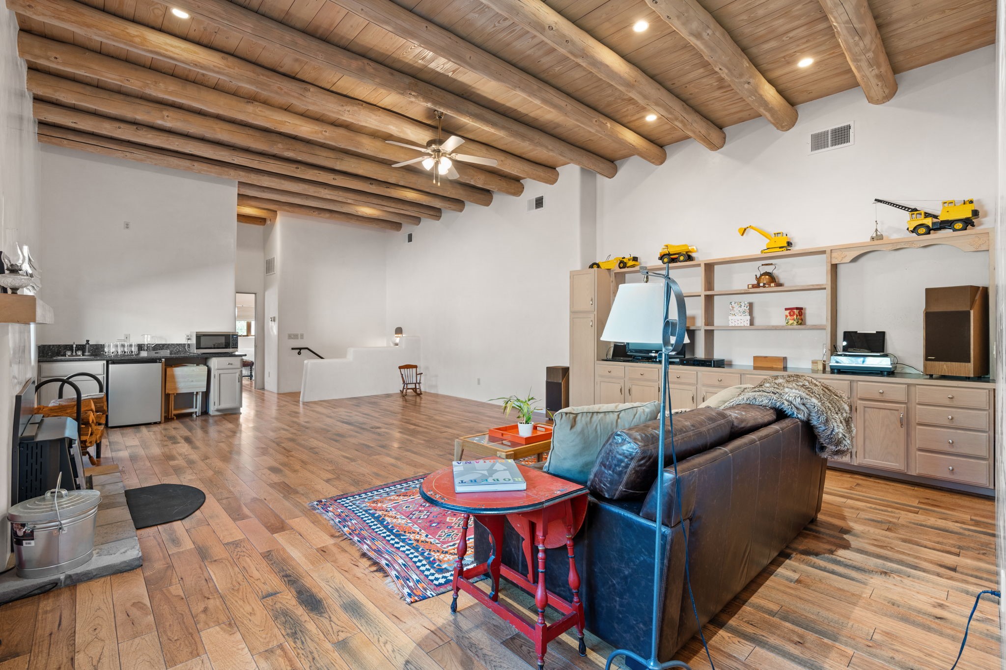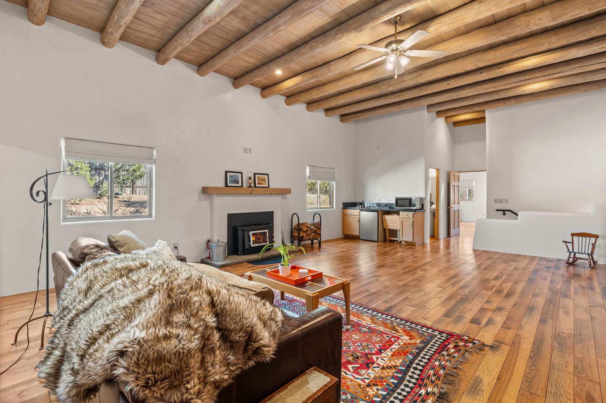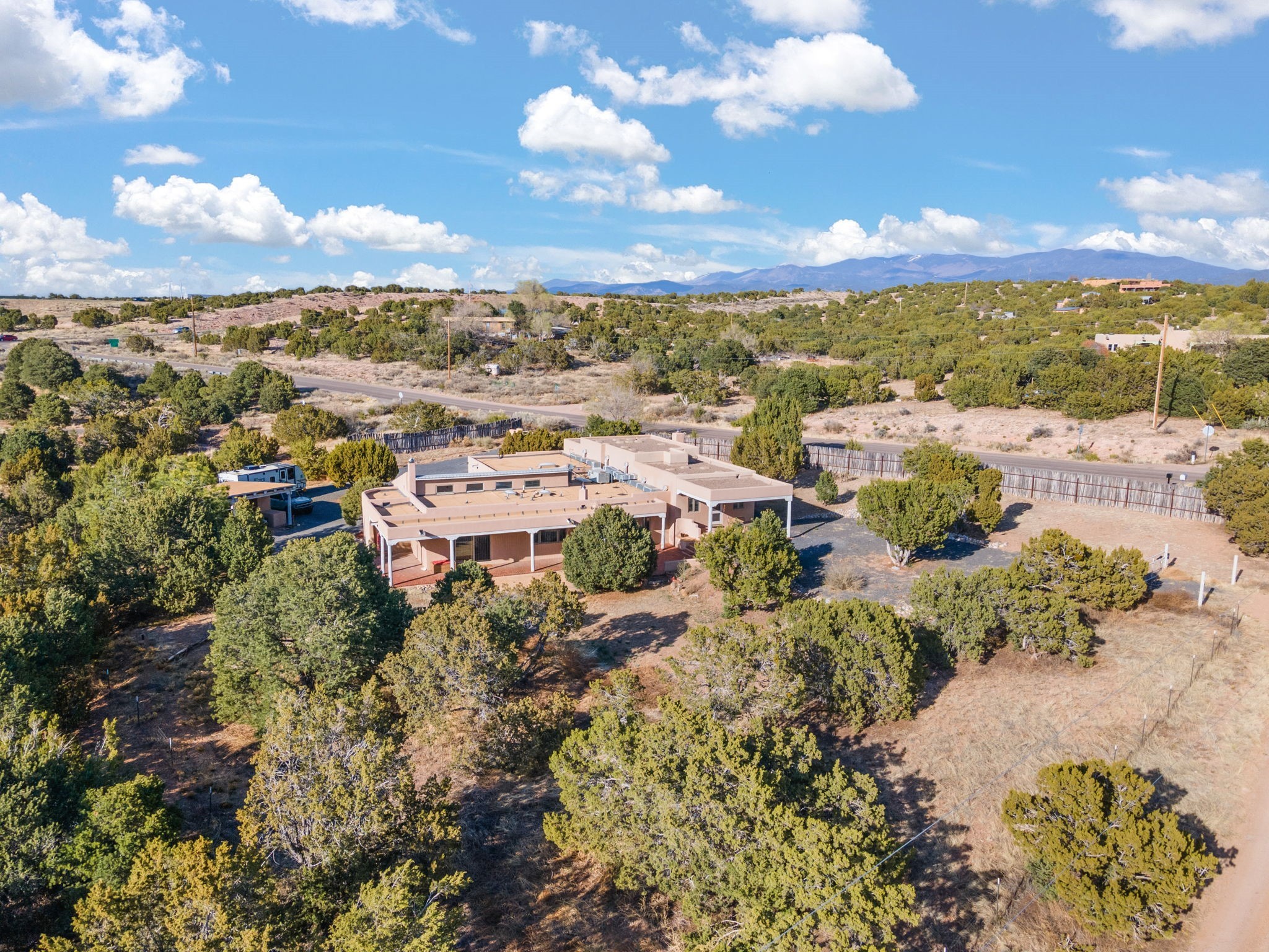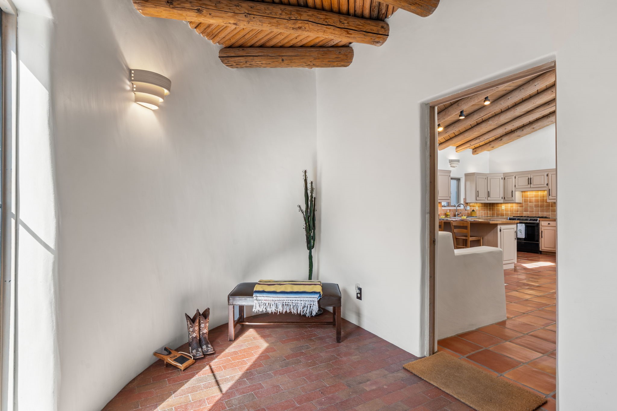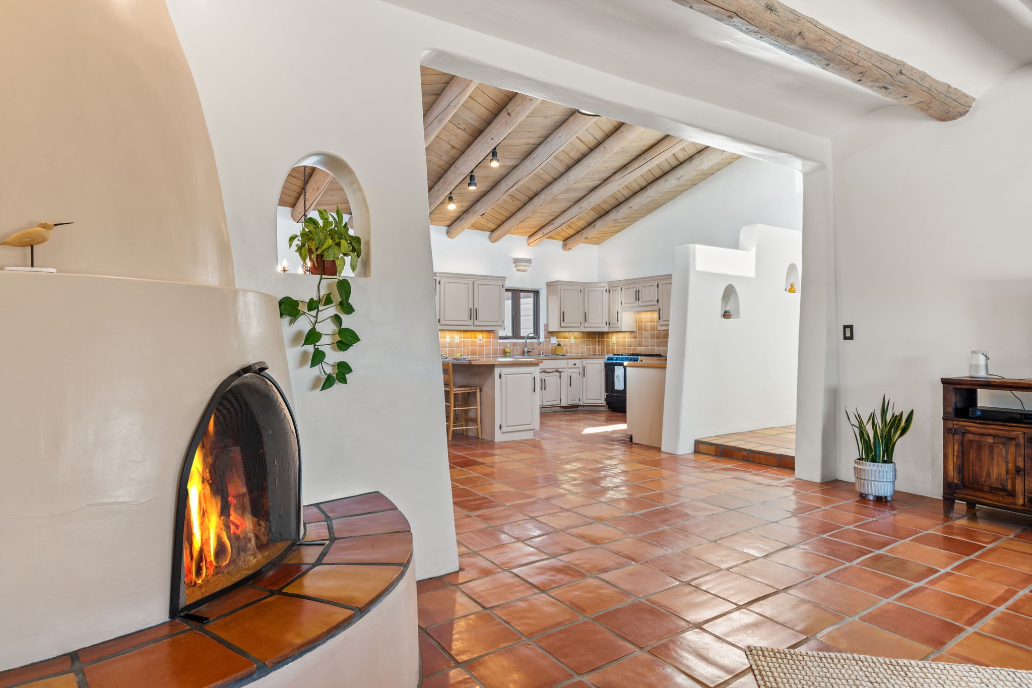 Welcome to your dream retreat: a 3,956-square-foot haven where classic Southwestern charm meets modern comfort. Located just minutes from downtown, this thoughtfully designed 3-bedroom, 3-bath home sits on 1.08 private acres with no HOA.Inside, you'll find Saltillo tile floors, hand-troweled plaster walls, and a generous living room with coved ceilings and abundant natural light. Clerestory windows and skylights fill the home with sunshine, and a sliding door opens to a stunning wraparound portal--perfect for year-round entertaining or quiet evenings under the stars.The kitchen is a chef's delight with newer appliances, ample cabinetry, and a spacious walk-in pantry. A charming office features traditional vigas and a latilla ceiling, ideal as a serene workspace or studio.The primary suite offers a corner kiva fireplace, two walk-in closets, and a private portal entrance. The updated en-suite bath includes a deep jetted tub and custom tile. The guest bath features a colorful Mexican tile arch over the tub for added charm.A lovely newer addition expands the living space with hickory wood floors, two bright bedrooms, a stylish bath with sun shower, and a large den with a fireplace, wood stove insert, built-ins, kitchenette, and wet bar. One bedroom has its own portal entrance for added privacy.Modern comforts include forced air heat, refrigerated air, and in-floor radiant heat in the newer section. Outside, you'll find a one-car garage, two-car carport, and a versatile studio once used for pottery--now a great workout space or creative workshop.This special home blends timeless Santa Fe architecture with thoughtful updates and artistic flair. More than a home--it's a lifestyle.