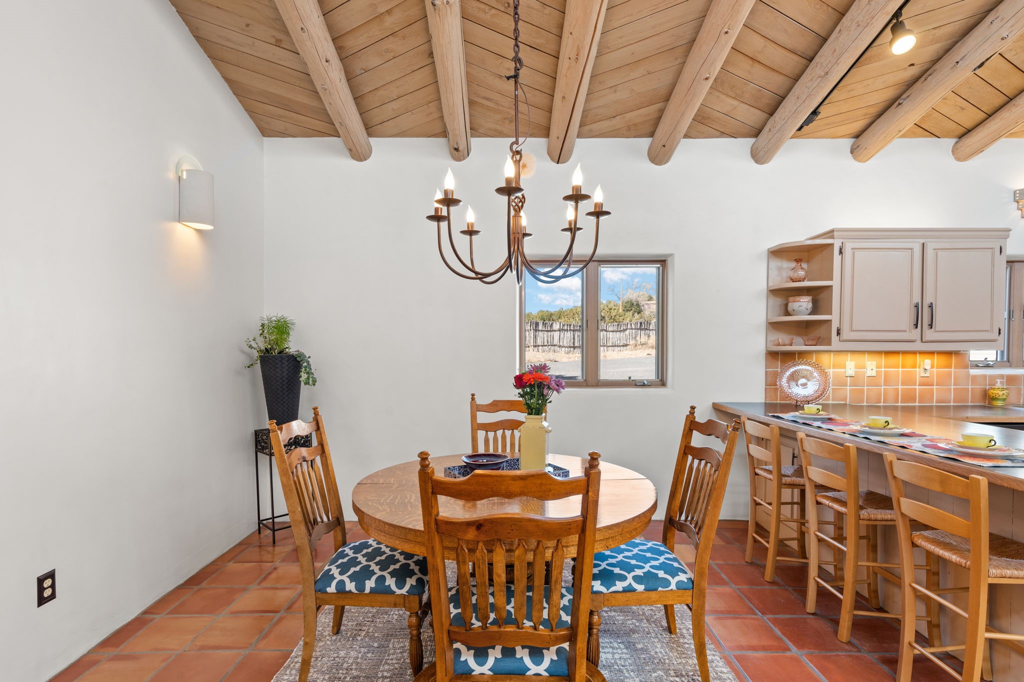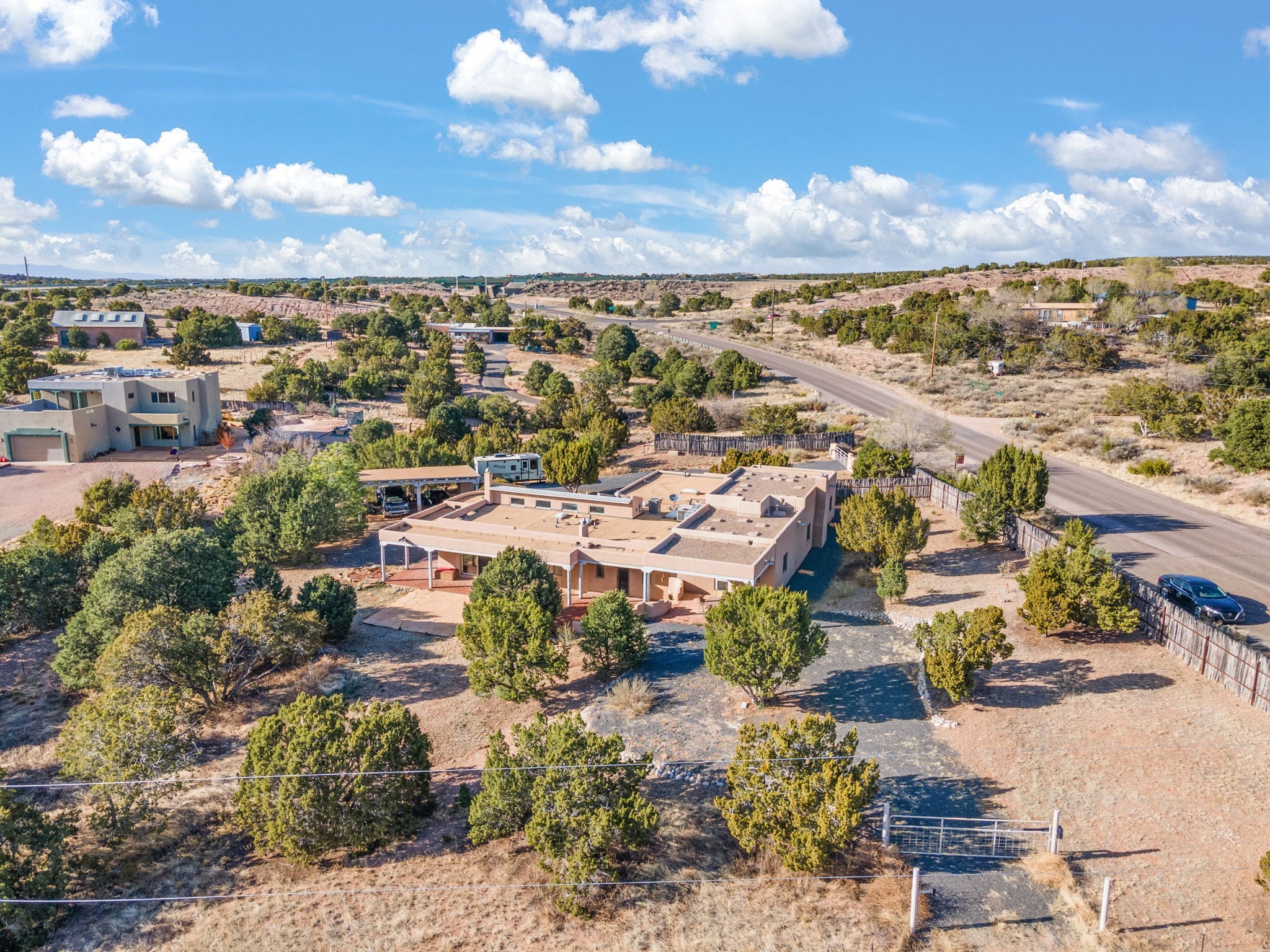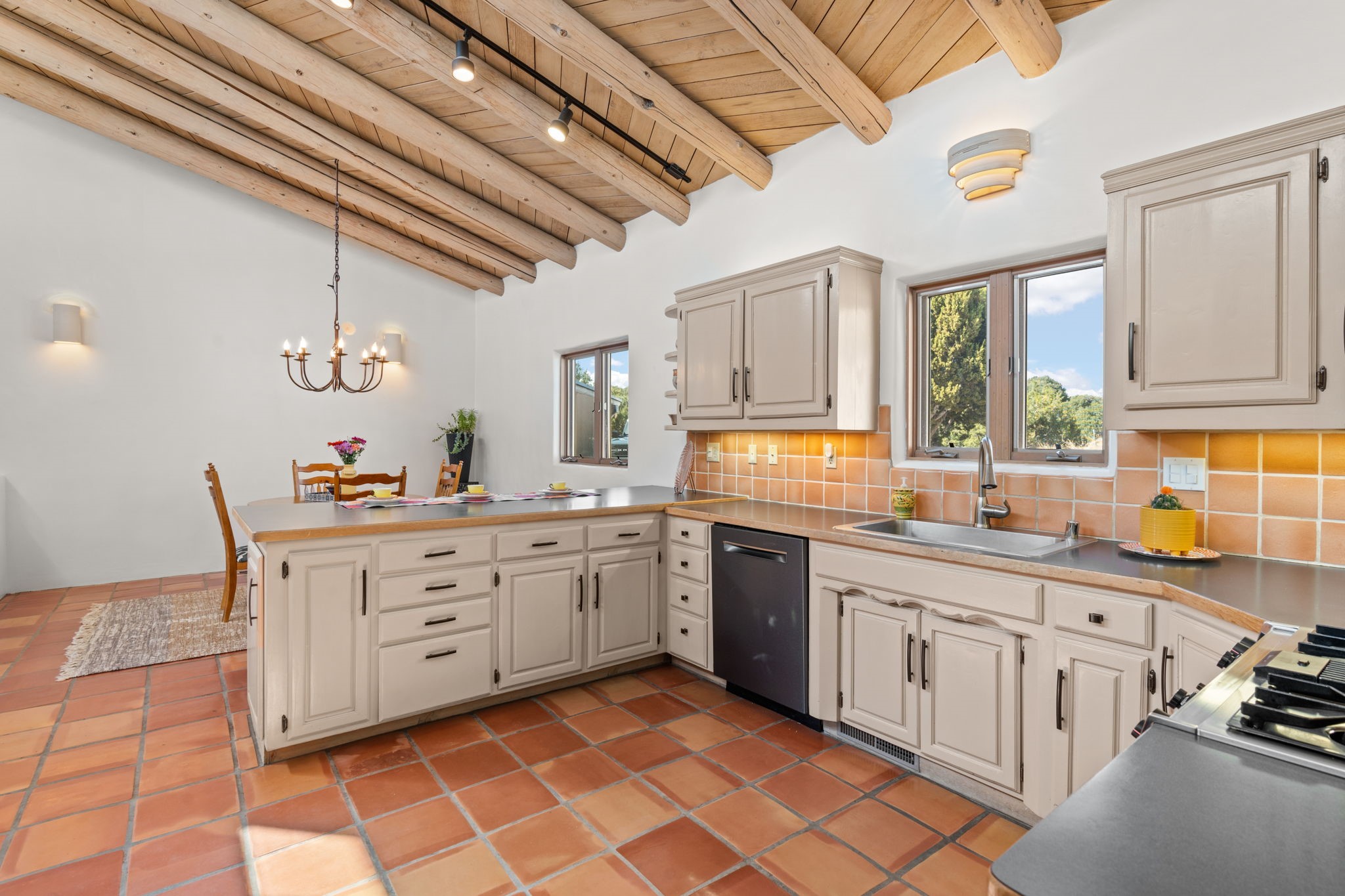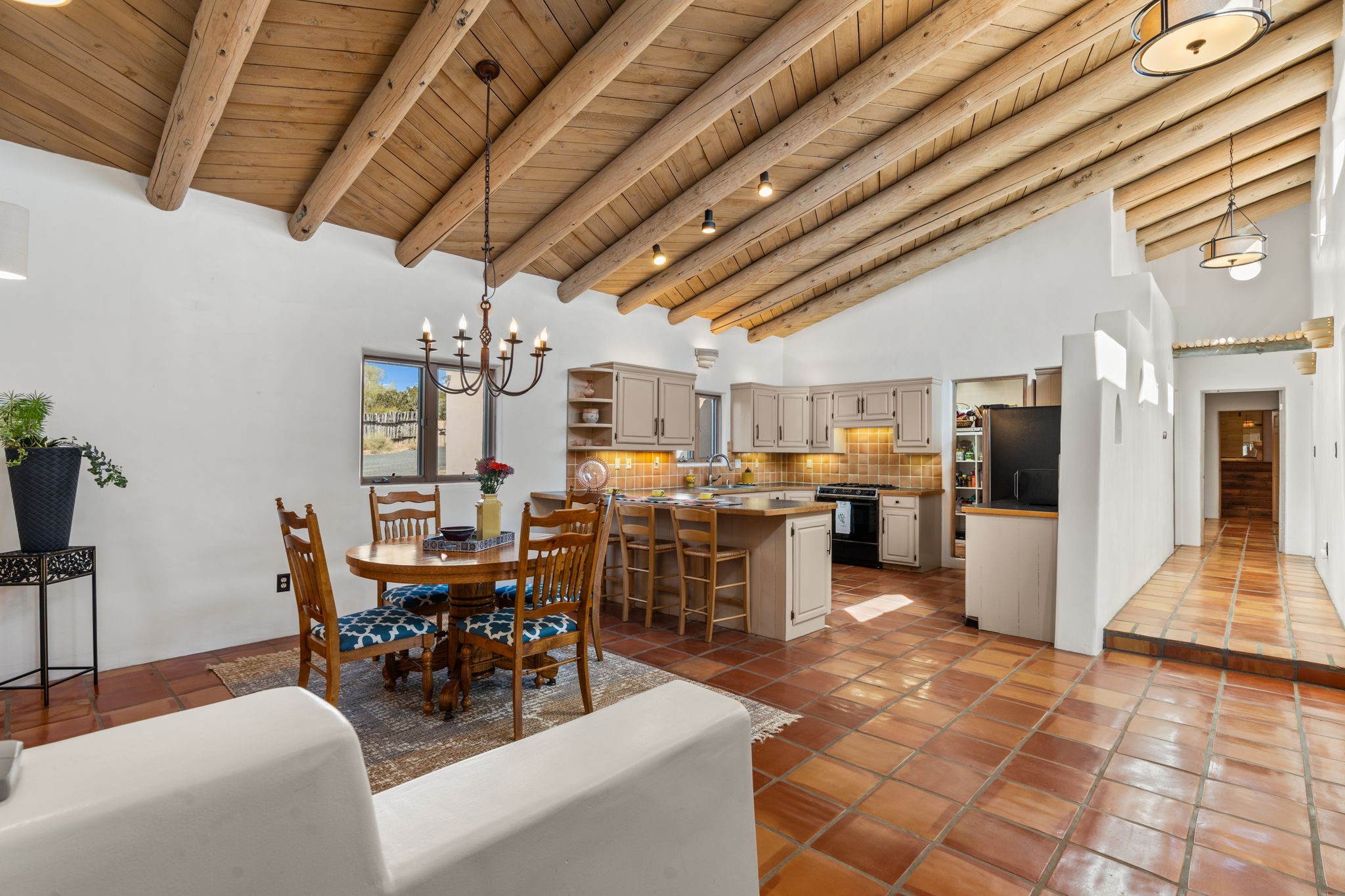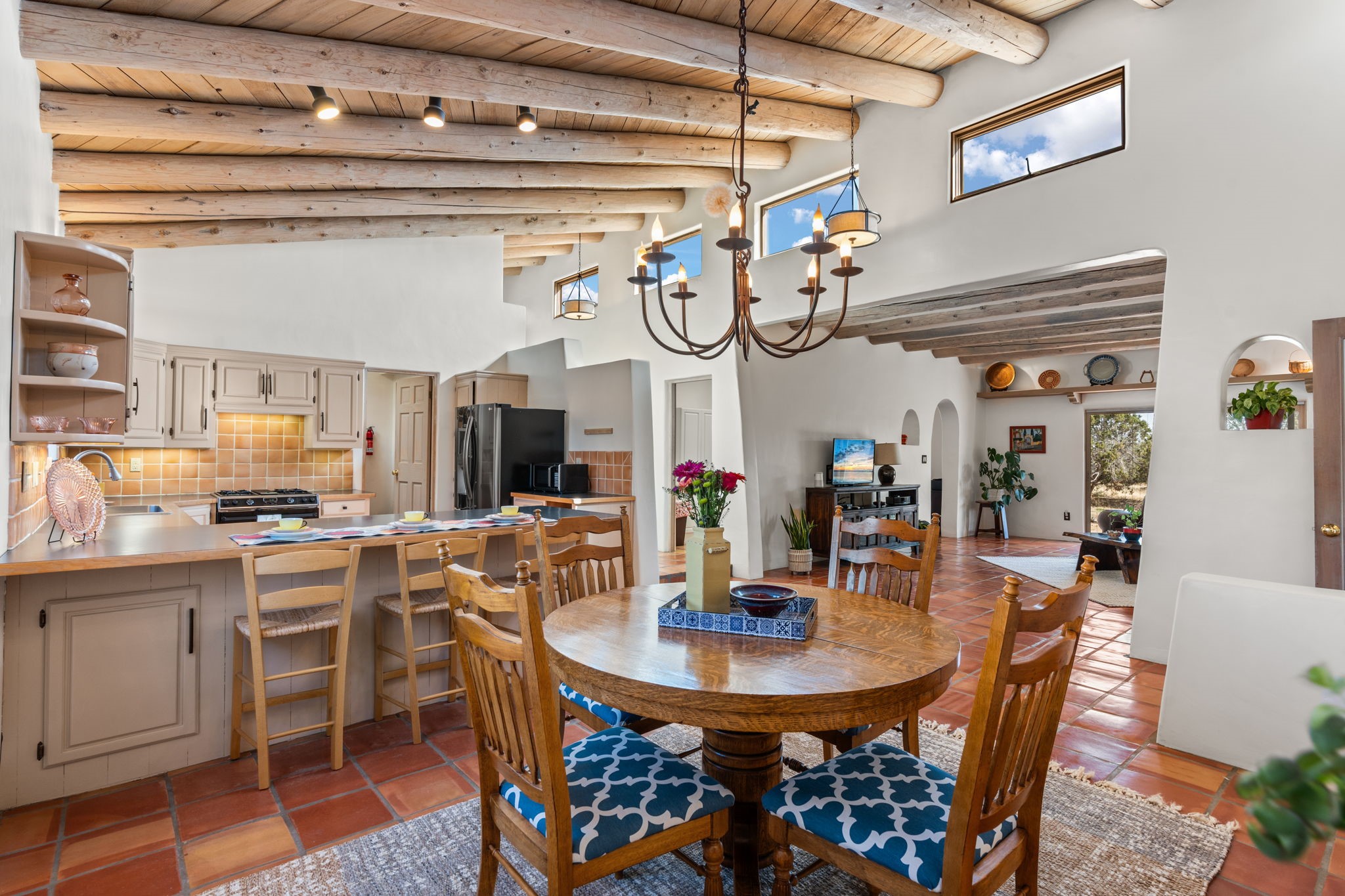 Welcome to your dream retreat: a 3,956-square-foot haven where classic Southwestern charm meets modern comfort. Located just minutes from downtown, this thoughtfully designed 3-bedroom, 3-bath home sits on 1.08 private acres with no HOA.Inside, you'll find Saltillo tile floors, hand-troweled plaster walls, and a generous living room with coved ceilings and abundant natural light. Clerestory windows and skylights fill the home with sunshine, and a sliding door opens to a stunning wraparound portal--perfect for year-round entertaining or quiet evenings under the stars.The kitchen is a chef's delight with newer appliances, ample cabinetry, and a spacious walk-in pantry. A charming office features traditional vigas and a latilla ceiling, ideal as a serene workspace or studio.The primary suite offers a corner kiva fireplace, two walk-in closets, and a private portal entrance. The updated en-suite bath includes a deep jetted tub and custom tile. The guest bath features a colorful Mexican tile arch over the tub for added charm.A lovely newer addition expands the living space with hickory wood floors, two bright bedrooms, a stylish bath with sun shower, and a large den with a fireplace, wood stove insert, built-ins, kitchenette, and wet bar. One bedroom has its own portal entrance for added privacy.Modern comforts include forced air heat, refrigerated air, and in-floor radiant heat in the newer section. Outside, you'll find a one-car garage, two-car carport, and a versatile studio once used for pottery--now a great workout space or creative workshop.This special home blends timeless Santa Fe architecture with thoughtful updates and artistic flair. More than a home--it's a lifestyle.