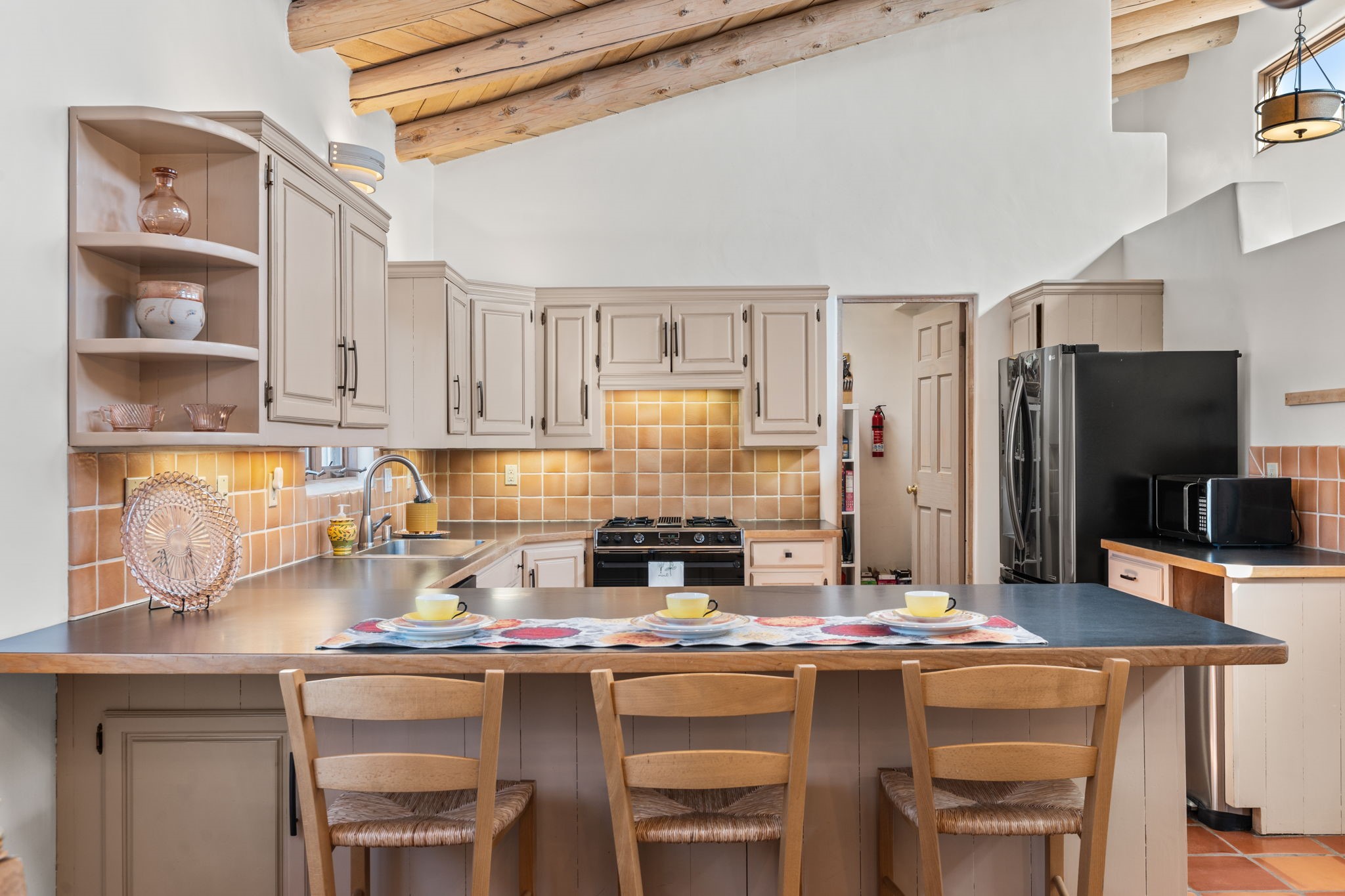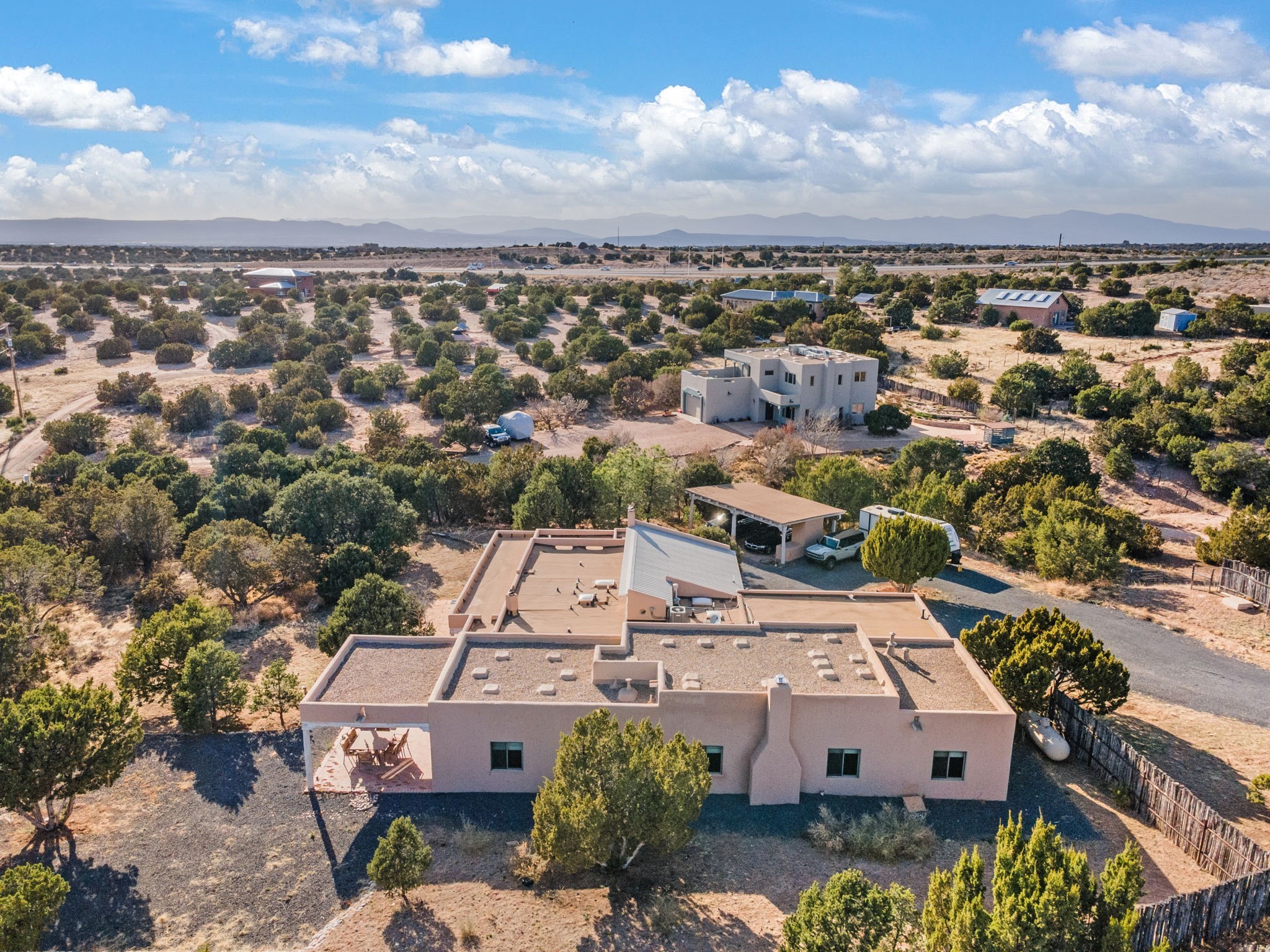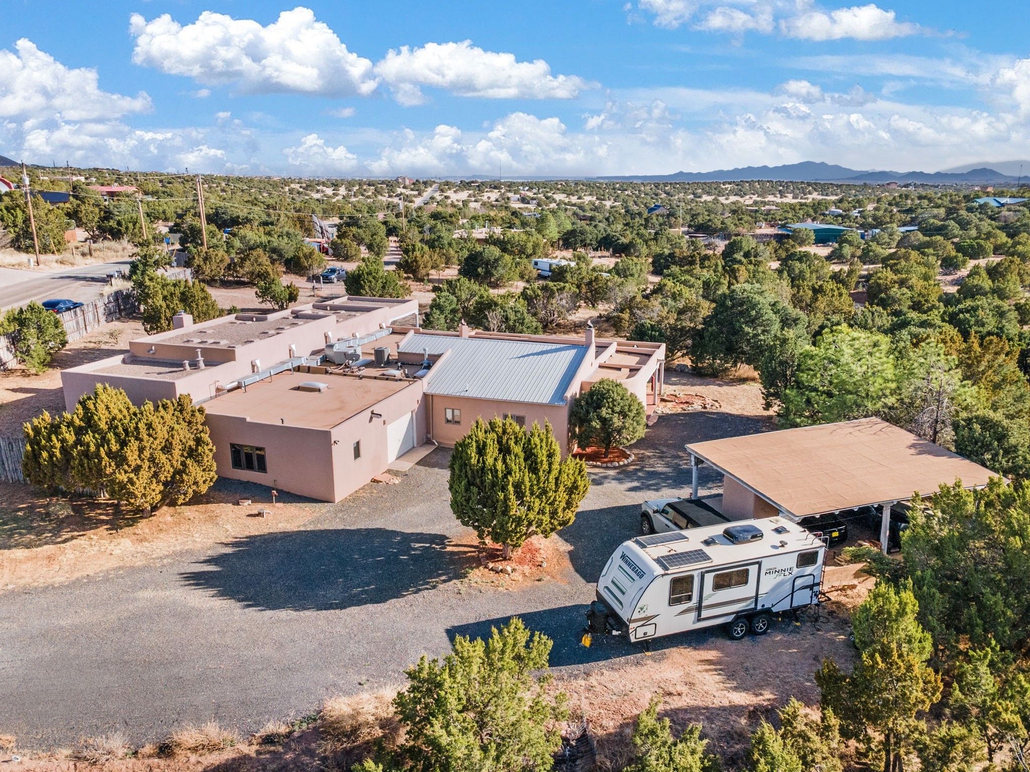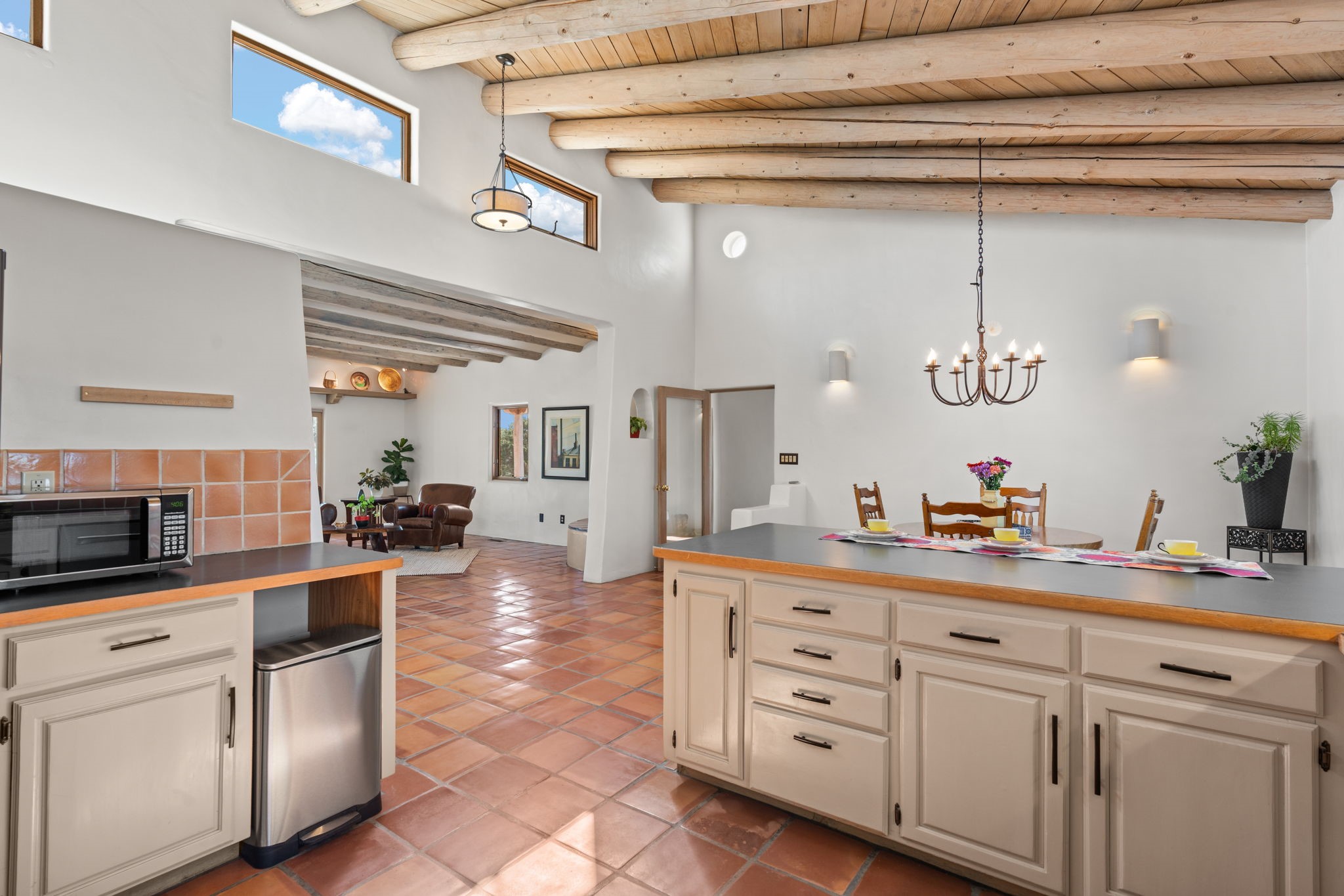 Welcome to your dream retreat: a 3,956-square-foot haven where classic Southwestern charm meets modern comfort. Located just minutes from downtown, this thoughtfully designed 3-bedroom, 3-bath home sits on 1.08 private acres with no HOA.Inside, you'll find Saltillo tile floors, hand-troweled plaster walls, and a generous living room with coved ceilings and abundant natural light. Clerestory windows and skylights fill the home with sunshine, and a sliding door opens to a stunning wraparound portal--perfect for year-round entertaining or quiet evenings under the stars.The kitchen is a chef's delight with newer appliances, ample cabinetry, and a spacious walk-in pantry. A charming office features traditional vigas and a latilla ceiling, ideal as a serene workspace or studio.The primary suite offers a corner kiva fireplace, two walk-in closets, and a private portal entrance. The updated en-suite bath includes a deep jetted tub and custom tile. The guest bath features a colorful Mexican tile arch over the tub for added charm.A lovely newer addition expands the living space with hickory wood floors, two bright bedrooms, a stylish bath with sun shower, and a large den with a fireplace, wood stove insert, built-ins, kitchenette, and wet bar. One bedroom has its own portal entrance for added privacy.Modern comforts include forced air heat, refrigerated air, and in-floor radiant heat in the newer section. Outside, you'll find a one-car garage, two-car carport, and a versatile studio once used for pottery--now a great workout space or creative workshop.This special home blends timeless Santa Fe architecture with thoughtful updates and artistic flair. More than a home--it's a lifestyle.