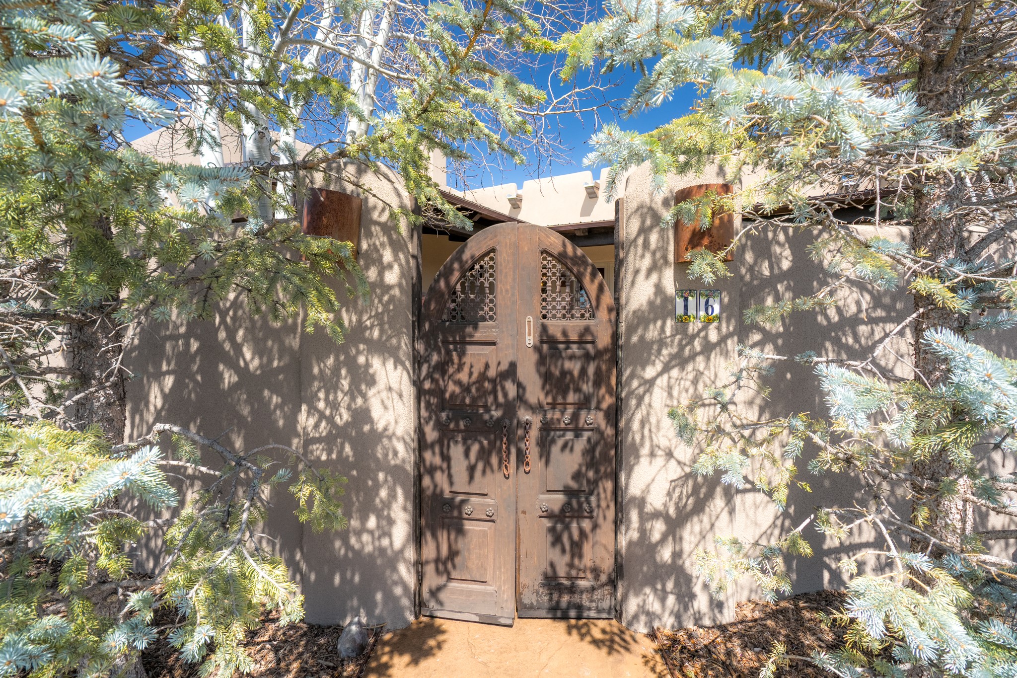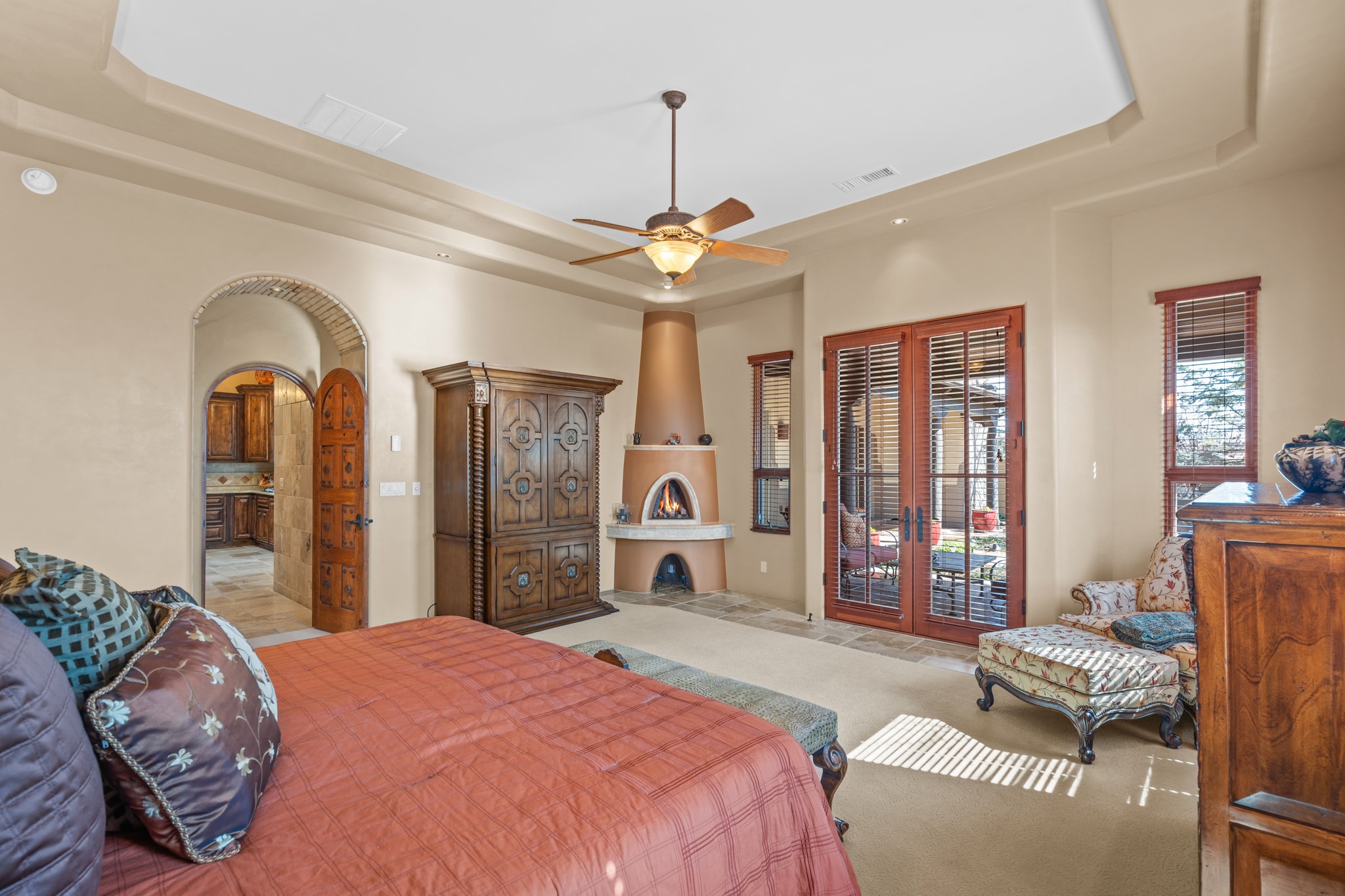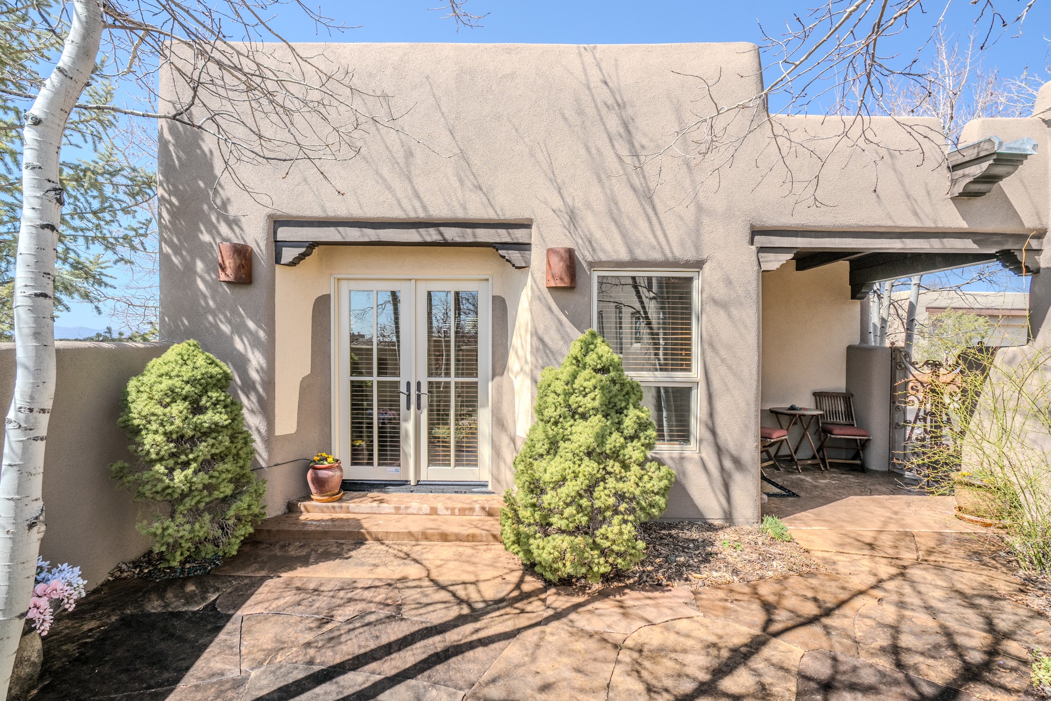 Discover this amazing single-level home with a detached guest house nestled in the serene community of Aldea. Located on a quiet cul-de-sac, this property welcomes you home with a charming enclosed courtyard and fountain, leading into a light-filled, open-concept floor plan that's perfect for both relaxing and entertaining. Enjoy breathtaking sunset views from the covered portals, or cozy up by one of the two gas fireplaces. The home features vaulted ceilings, beautiful travertine tile, and handcrafted wood doors and cabinetry imported from Mexico. The chef's kitchen is a dream, complete with a pantry, wine cooler, and plenty of space for culinary creativity. Each bedroom is ensuite with its own bathroom and walk-in closet, offering great separation and privacy. Just minutes from downtown, the neighborhood offers quiet charm, walking and hiking paths, a tennis court, a basketball court, and regular HOA-hosted events. With peaceful open spaces, wildlife, and a strong sense of community, this home truly has it all.