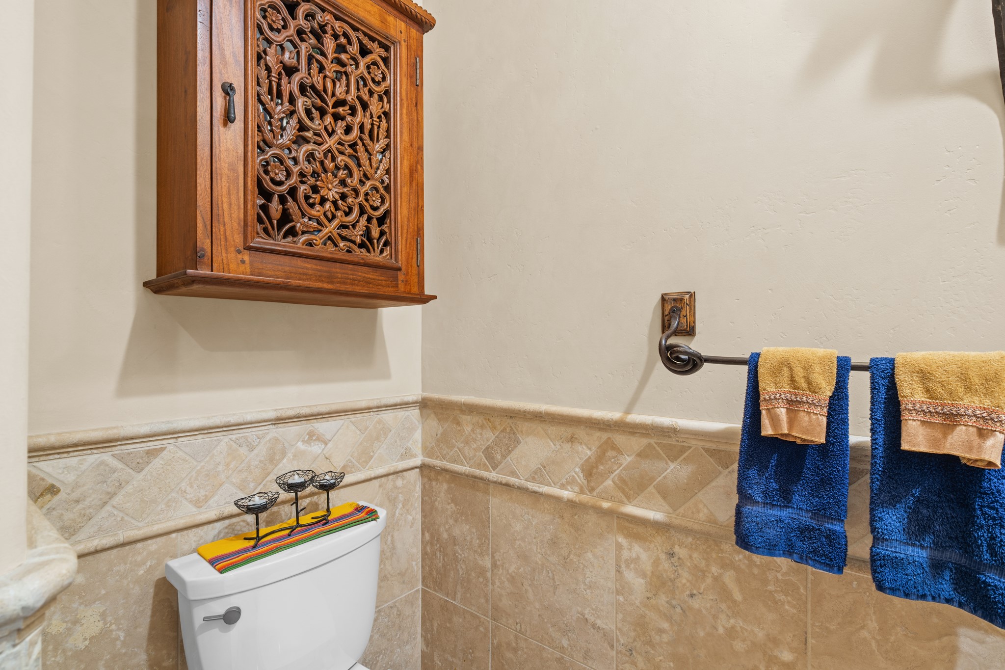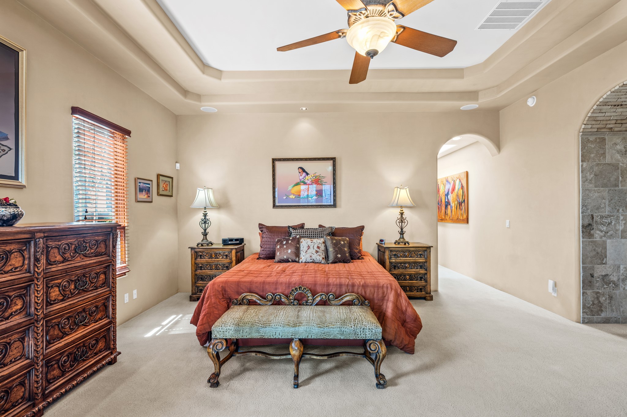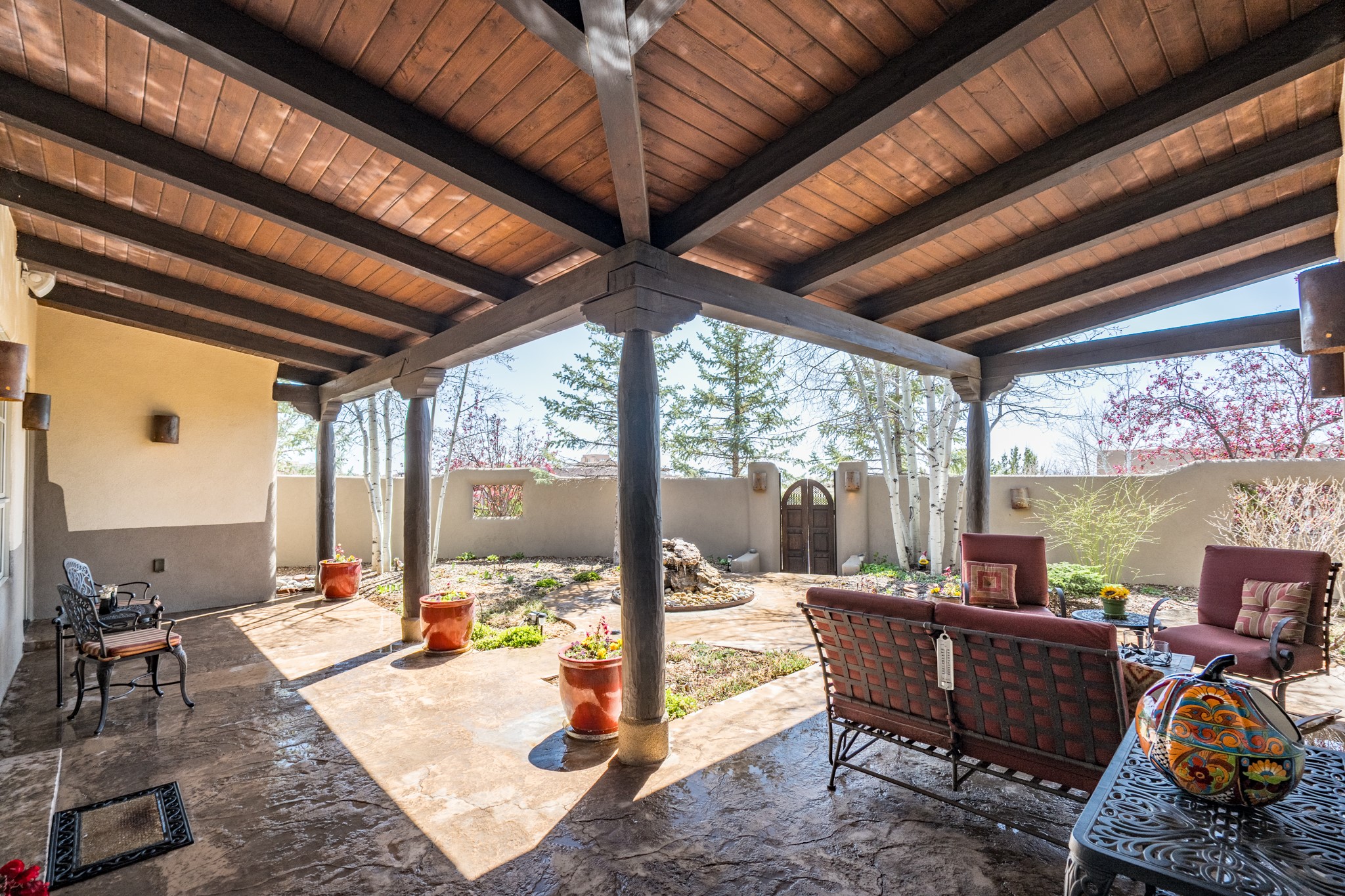 Discover this amazing single-level home with a detached guest house nestled in the serene community of Aldea. Located on a quiet cul-de-sac, this property welcomes you home with a charming enclosed courtyard and fountain, leading into a light-filled, open-concept floor plan that's perfect for both relaxing and entertaining. Enjoy breathtaking sunset views from the covered portals, or cozy up by one of the two gas fireplaces. The home features vaulted ceilings, beautiful travertine tile, and handcrafted wood doors and cabinetry imported from Mexico. The chef's kitchen is a dream, complete with a pantry, wine cooler, and plenty of space for culinary creativity. Each bedroom is ensuite with its own bathroom and walk-in closet, offering great separation and privacy. Just minutes from downtown, the neighborhood offers quiet charm, walking and hiking paths, a tennis court, a basketball court, and regular HOA-hosted events. With peaceful open spaces, wildlife, and a strong sense of community, this home truly has it all.