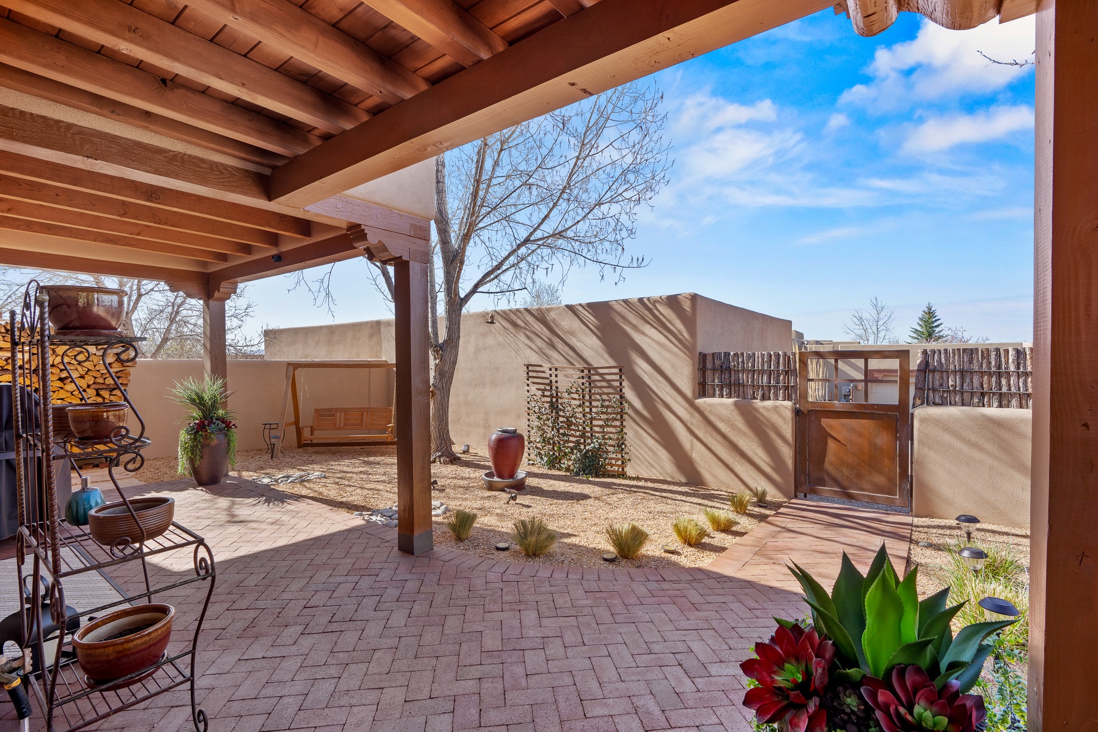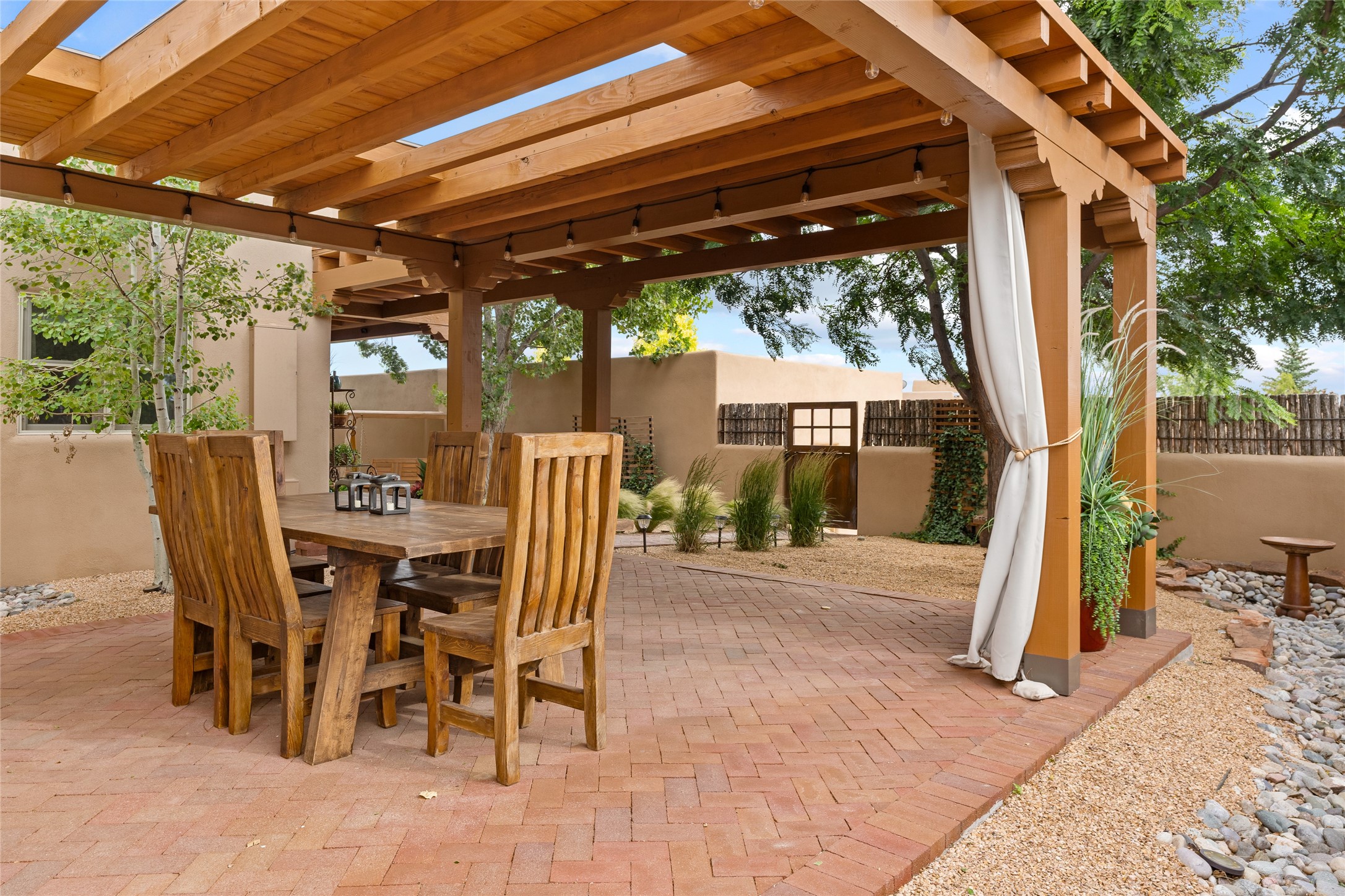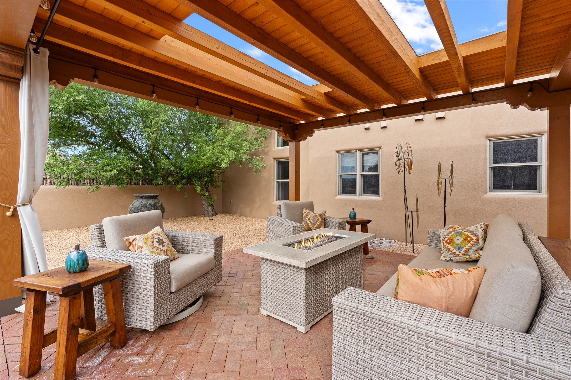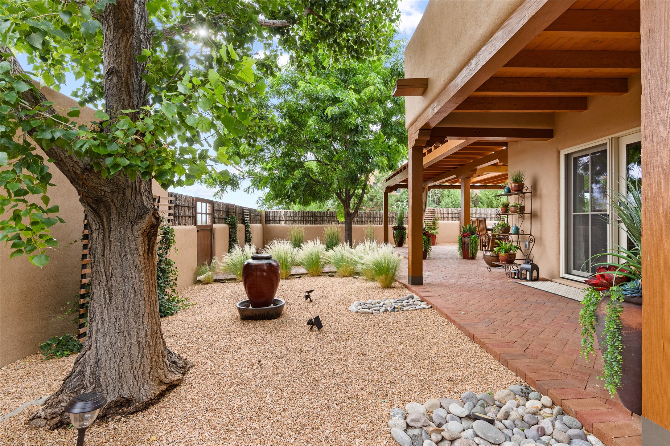This exceptional 2,266 sq. ft. townhome blends comfort, elegance, and warmth into a beautifully crafted living experience. Move-in ready with new roof, stucco, rear exterior doors, mini splits in every room (2023), and a new furnace and tankless water heater (2022), no maintenance has been deferred. With 3 bedrooms, 2.5 bathrooms, and a 2-car garage plus 2 additional adjacent parking spaces, this home offers elevated style in one of Santa Fe's most sought-after communities. Step inside and be captivated by the dramatic high ceilings, accented with hand-hewn beams and a cozy kiva fireplace that anchors the light-filled living room. Unlike most in Aldea, this residence features a separate family room off the kitchen--a versatile space ideal for intimate gatherings. The kitchen features granite countertops and modern appliances. Step outside into your private courtyard oasis--fully landscaped and designed for both serene unwinding and lively entertaining. Relax under the custom pergola with skylights that filter the perfect touch of sunlight while listening to the soothing sounds of the fountain. Upstairs, the primary suite offers a true sanctuary with a California Closet and a private deck --perfect for sunset reflections or morning coffee. Two additional bedrooms provide space and comfort for guests or a home office. Additional features include custom floor-to-ceiling drapes in living room, pleated cellular blinds, modern lighting, and curated fixtures. From the elegant living and dining room to the thoughtfully designed outdoor haven, this home is more than a residence--it's a feeling. A place where every detail has been considered, every space crafted to invite peace, beauty, and connection. Come home to Aldea--where luxury lives!