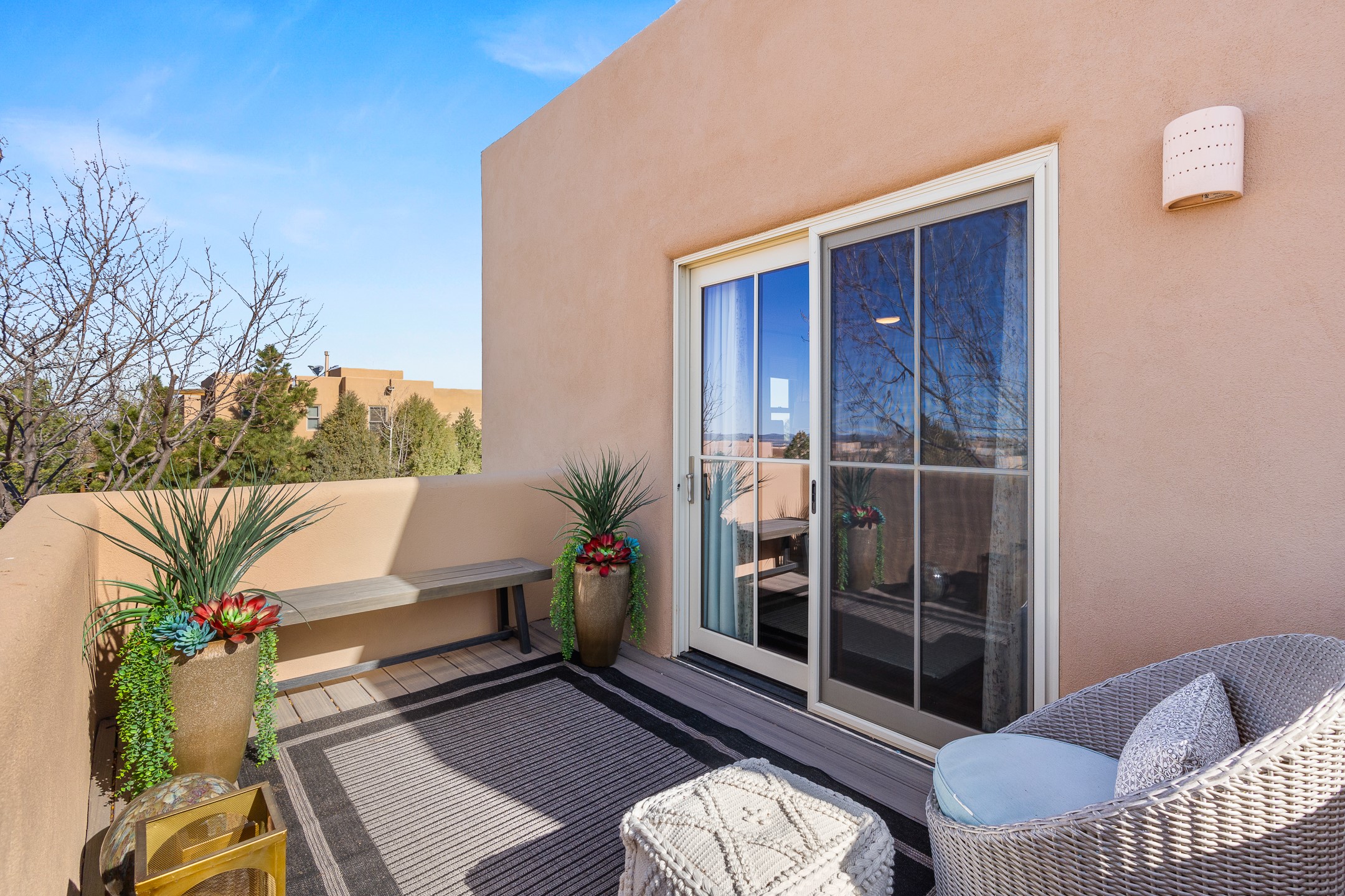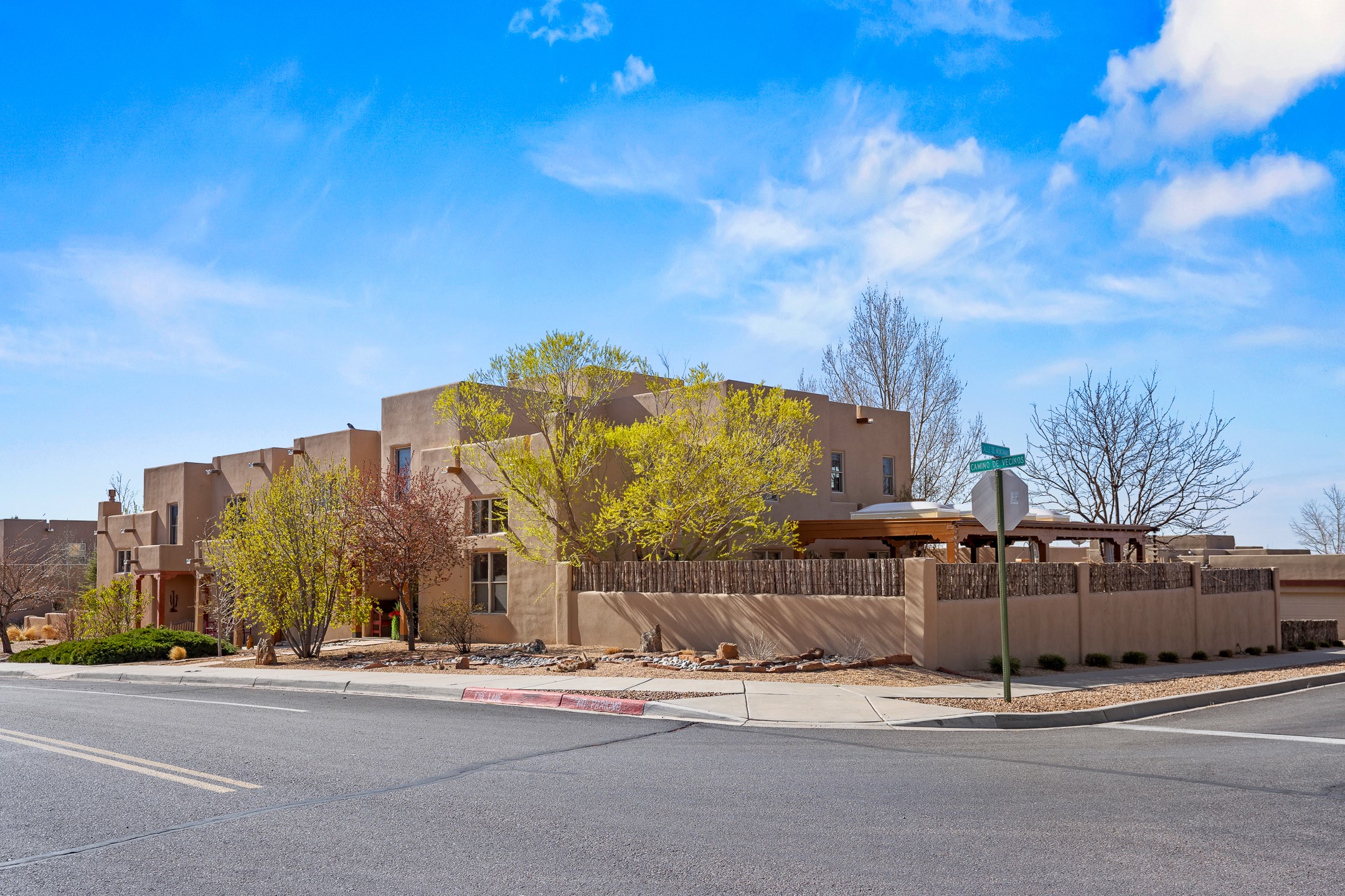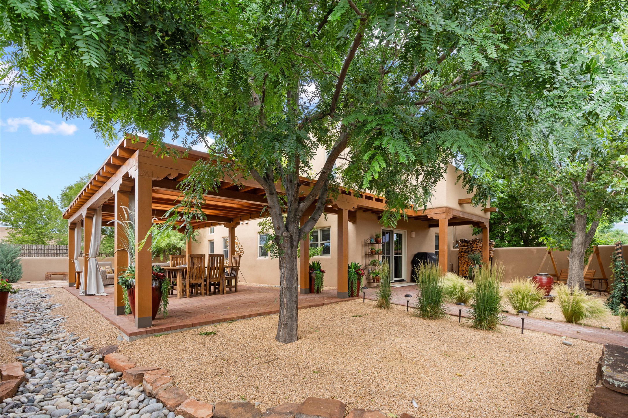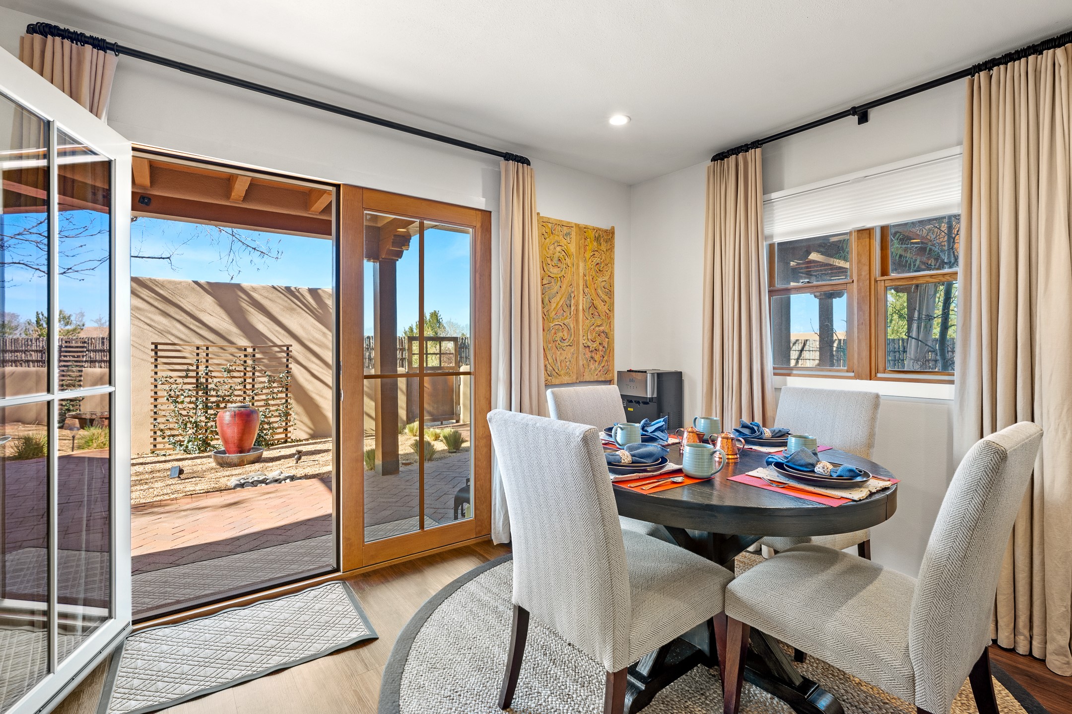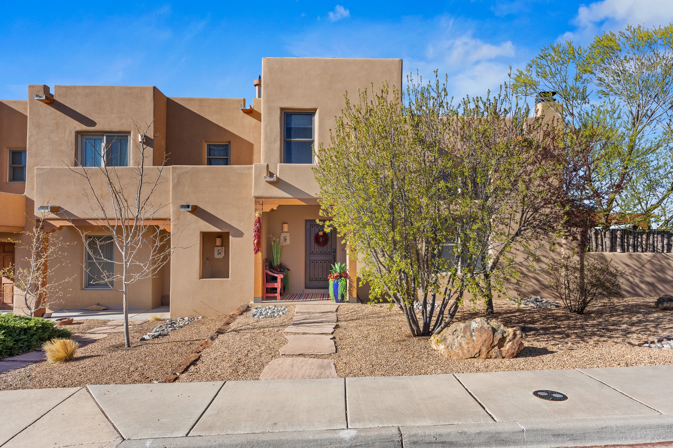 This exceptional 2,266 sq. ft. townhome blends comfort, elegance, and warmth into a beautifully crafted living experience. Move-in ready with new roof, stucco, rear exterior doors, mini splits in every room (2023), and a new furnace and tankless water heater (2022), no maintenance has been deferred. With 3 bedrooms, 2.5 bathrooms, and a 2-car garage plus 2 additional adjacent parking spaces, this home offers elevated style in one of Santa Fe's most sought-after communities. Step inside and be captivated by the dramatic high ceilings, accented with hand-hewn beams and a cozy kiva fireplace that anchors the light-filled living room. Unlike most in Aldea, this residence features a separate family room off the kitchen--a versatile space ideal for intimate gatherings. The kitchen features granite countertops and modern appliances. Step outside into your private courtyard oasis--fully landscaped and designed for both serene unwinding and lively entertaining. Relax under the custom pergola with skylights that filter the perfect touch of sunlight while listening to the soothing sounds of the fountain. Upstairs, the primary suite offers a true sanctuary with a California Closet and a private deck --perfect for sunset reflections or morning coffee. Two additional bedrooms provide space and comfort for guests or a home office. Additional features include custom floor-to-ceiling drapes in living room, pleated cellular blinds, modern lighting, and curated fixtures. From the elegant living and dining room to the thoughtfully designed outdoor haven, this home is more than a residence--it's a feeling. A place where every detail has been considered, every space crafted to invite peace, beauty, and connection. Come home to Aldea--where luxury lives!
