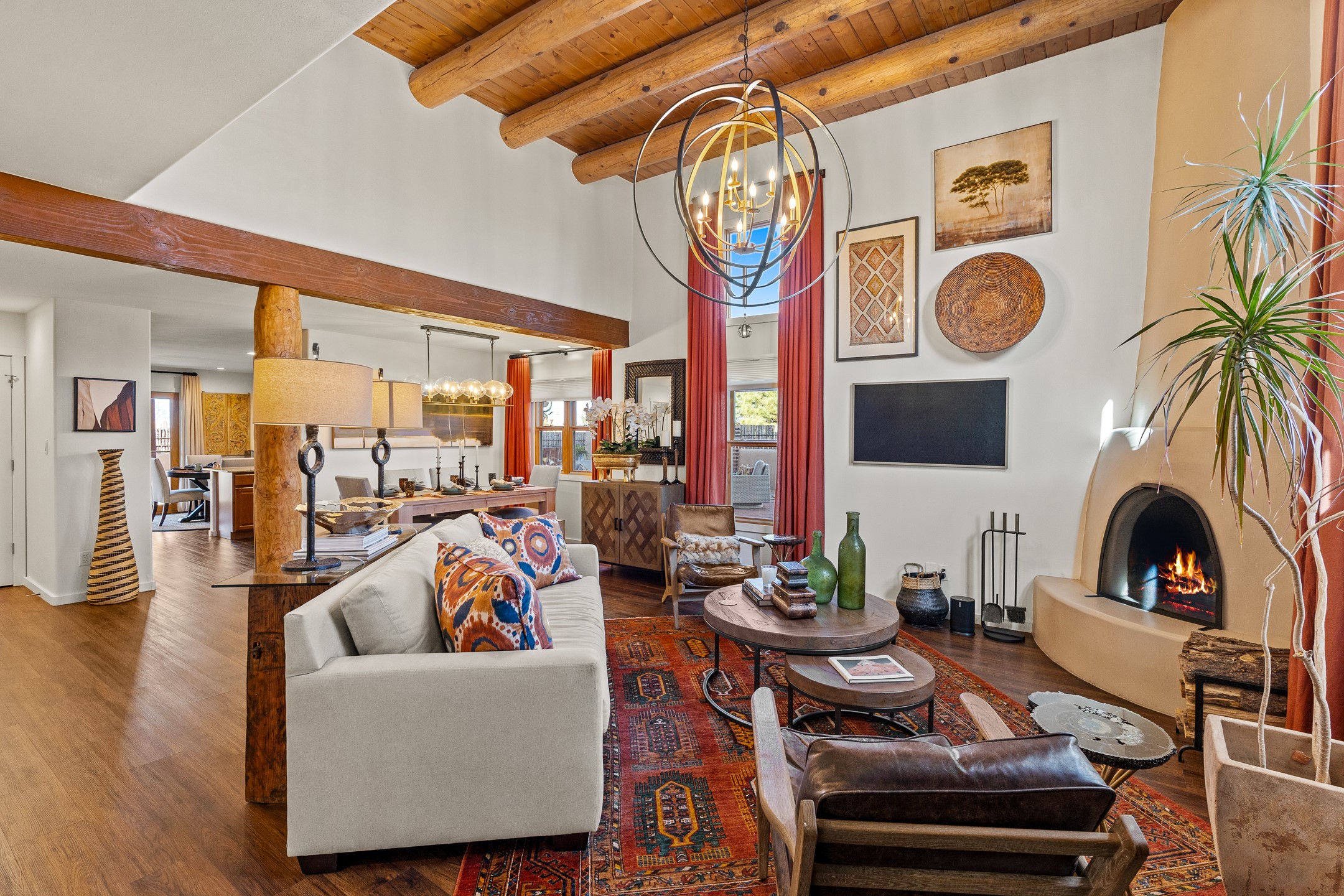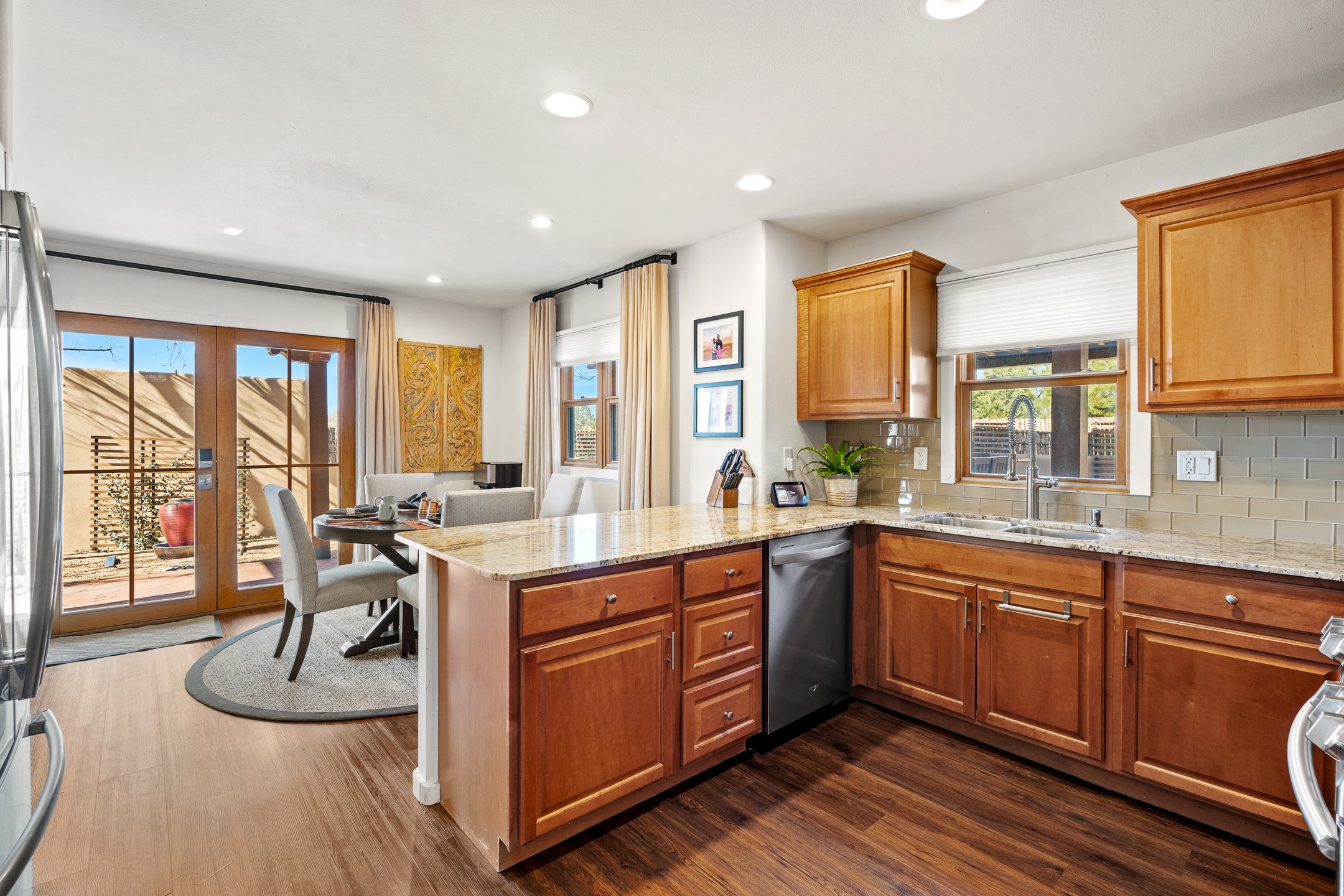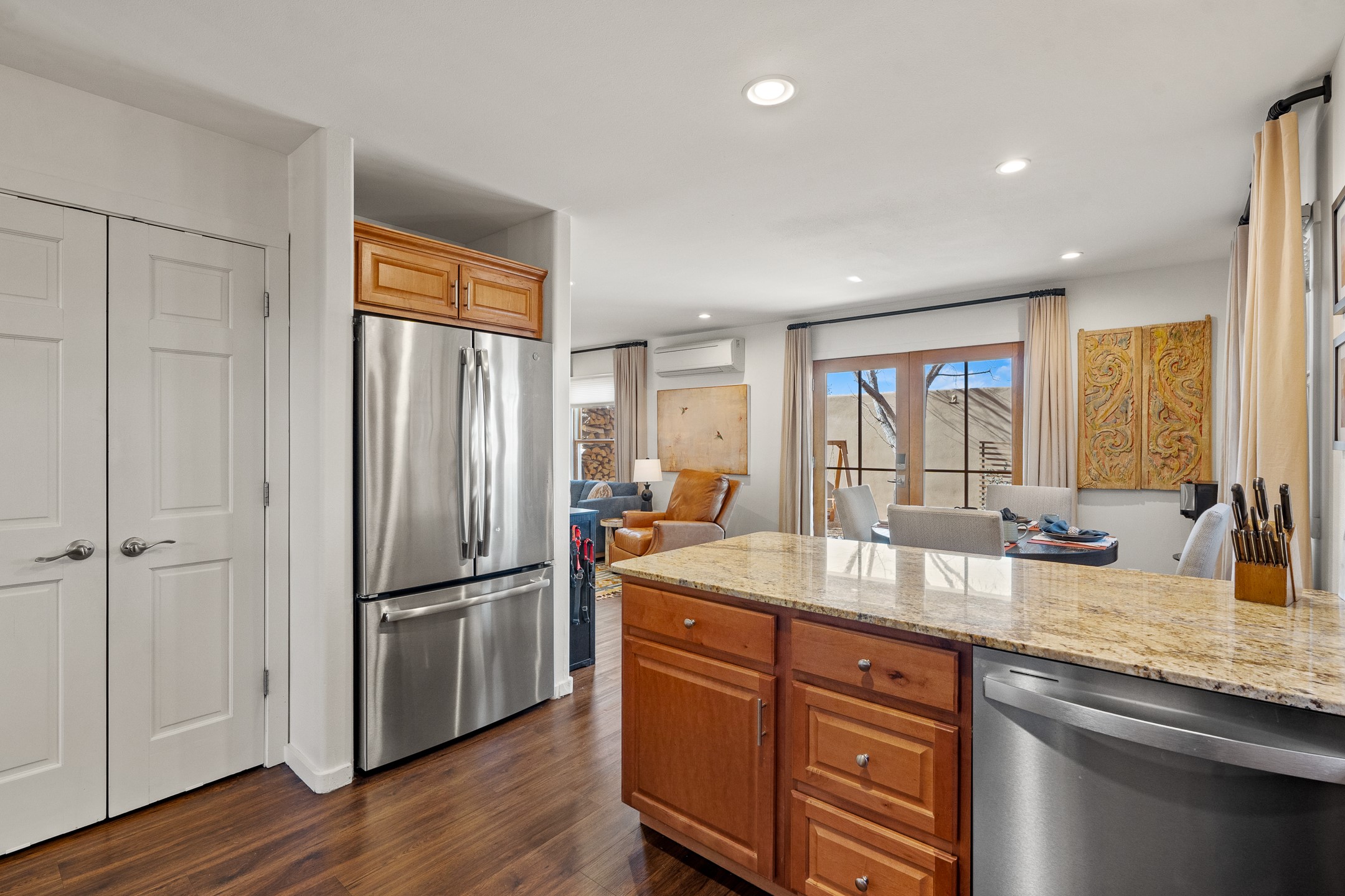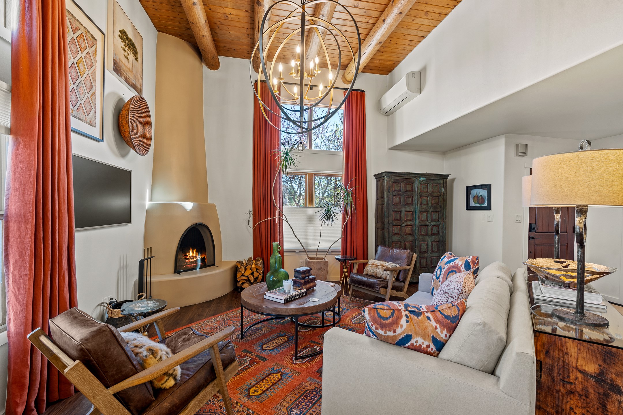 This exceptional 2,266 sq. ft. townhome blends comfort, elegance, and warmth into a beautifully crafted living experience. Move-in ready with new roof, stucco, rear exterior doors, mini splits in every room (2023), and a new furnace and tankless water heater (2022), no maintenance has been deferred. With 3 bedrooms, 2.5 bathrooms, and a 2-car garage plus 2 additional adjacent parking spaces, this home offers elevated style in one of Santa Fe's most sought-after communities. Step inside and be captivated by the dramatic high ceilings, accented with hand-hewn beams and a cozy kiva fireplace that anchors the light-filled living room. Unlike most in Aldea, this residence features a separate family room off the kitchen--a versatile space ideal for intimate gatherings. The kitchen features granite countertops and modern appliances. Step outside into your private courtyard oasis--fully landscaped and designed for both serene unwinding and lively entertaining. Relax under the custom pergola with skylights that filter the perfect touch of sunlight while listening to the soothing sounds of the fountain. Upstairs, the primary suite offers a true sanctuary with a California Closet and a private deck --perfect for sunset reflections or morning coffee. Two additional bedrooms provide space and comfort for guests or a home office. Additional features include custom floor-to-ceiling drapes in living room, pleated cellular blinds, modern lighting, and curated fixtures. From the elegant living and dining room to the thoughtfully designed outdoor haven, this home is more than a residence--it's a feeling. A place where every detail has been considered, every space crafted to invite peace, beauty, and connection. Come home to Aldea--where luxury lives!