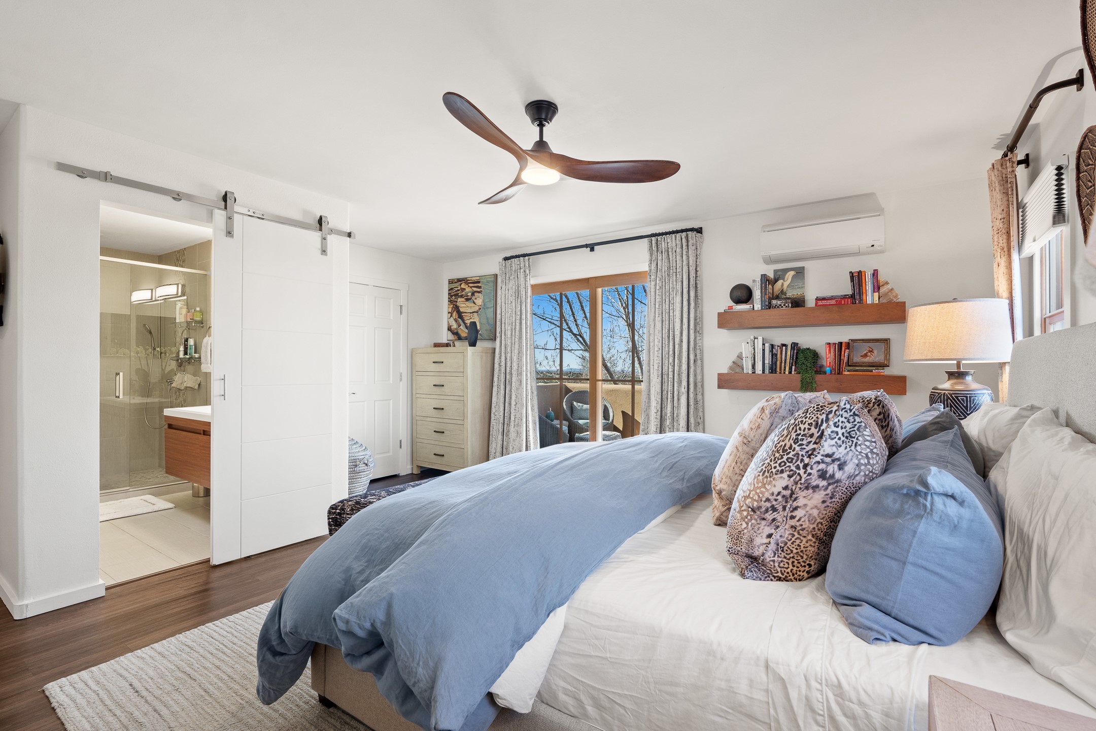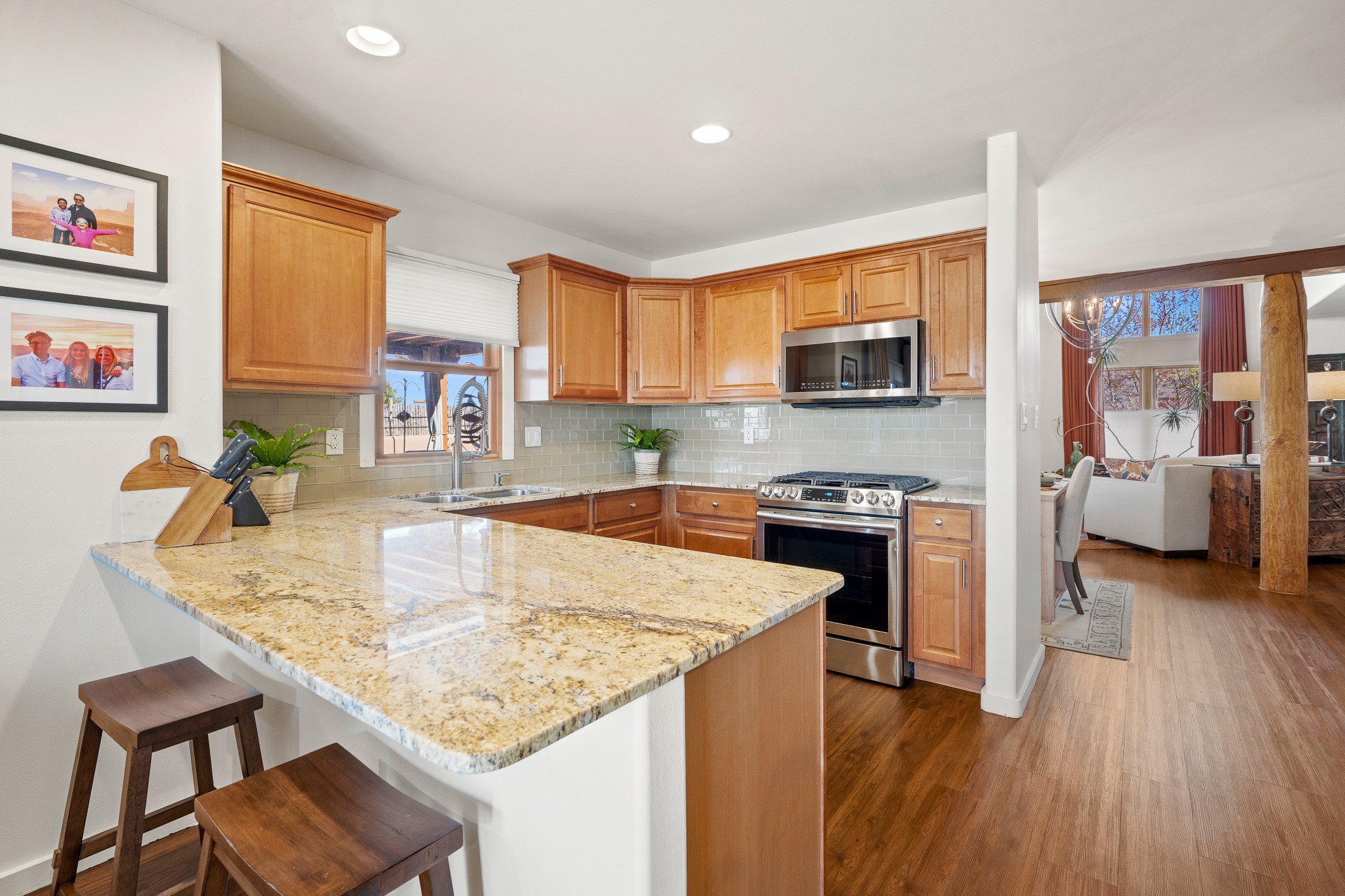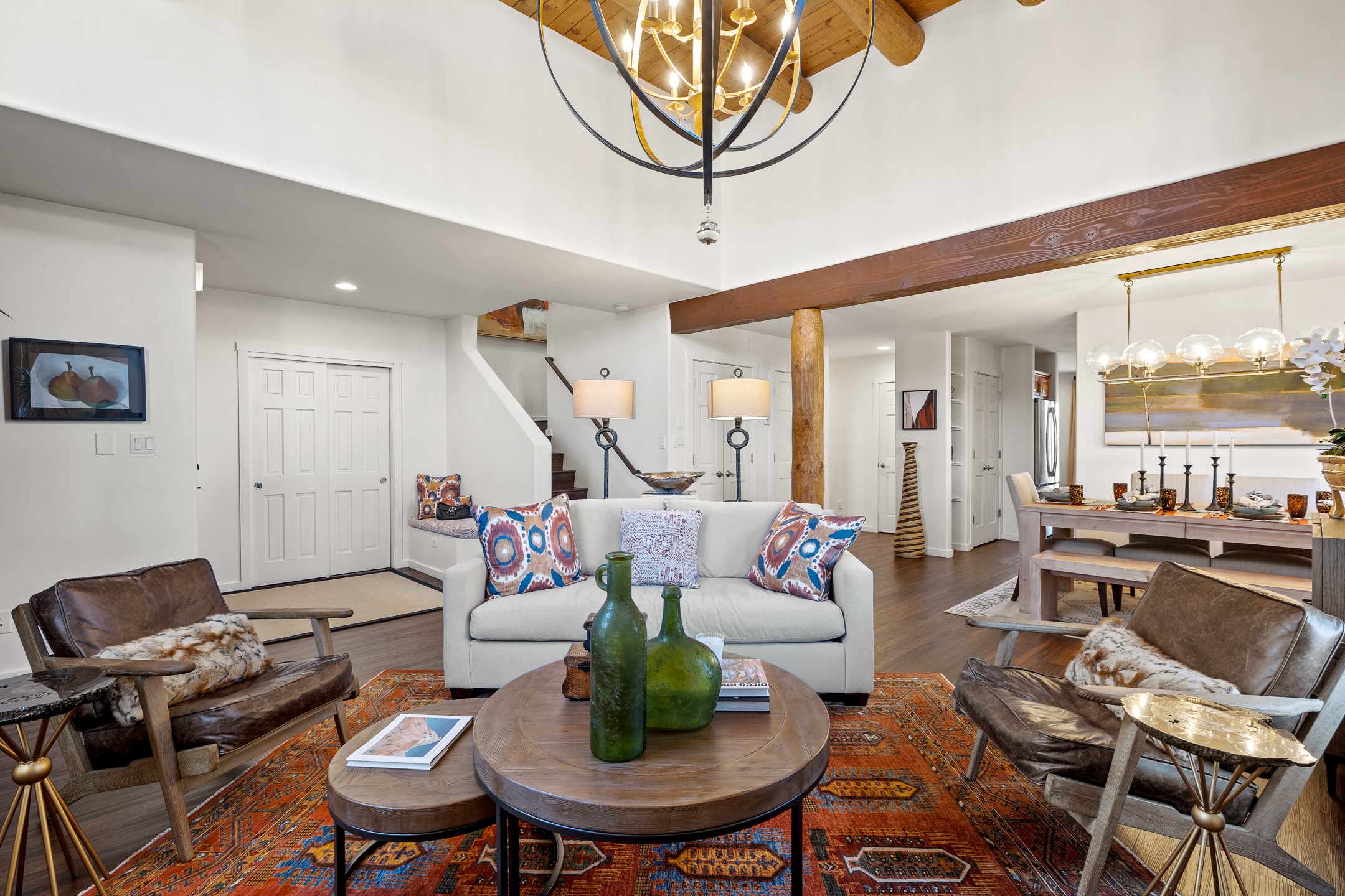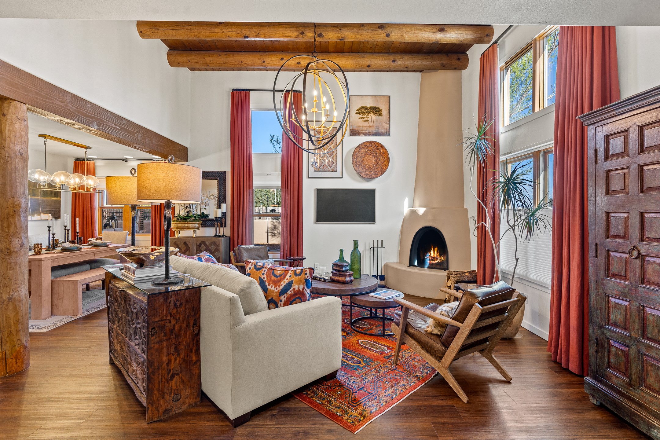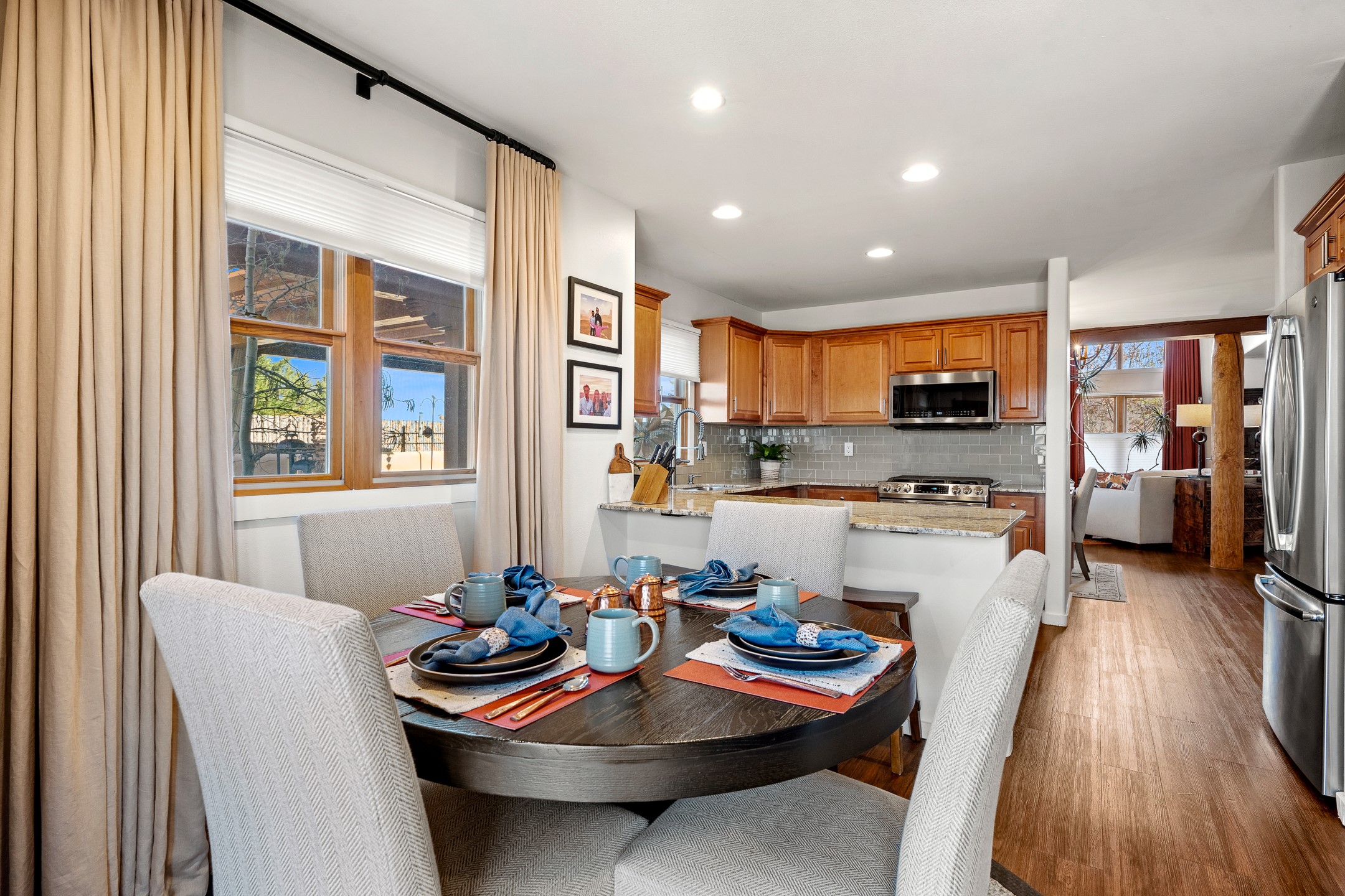 This exceptional 2,266 sq. ft. townhome blends comfort, elegance, and warmth into a beautifully crafted living experience. Move-in ready with new roof, stucco, rear exterior doors, mini splits in every room (2023), and a new furnace and tankless water heater (2022), no maintenance has been deferred. With 3 bedrooms, 2.5 bathrooms, and a 2-car garage plus 2 additional adjacent parking spaces, this home offers elevated style in one of Santa Fe's most sought-after communities. Step inside and be captivated by the dramatic high ceilings, accented with hand-hewn beams and a cozy kiva fireplace that anchors the light-filled living room. Unlike most in Aldea, this residence features a separate family room off the kitchen--a versatile space ideal for intimate gatherings. The kitchen features granite countertops and modern appliances. Step outside into your private courtyard oasis--fully landscaped and designed for both serene unwinding and lively entertaining. Relax under the custom pergola with skylights that filter the perfect touch of sunlight while listening to the soothing sounds of the fountain. Upstairs, the primary suite offers a true sanctuary with a California Closet and a private deck --perfect for sunset reflections or morning coffee. Two additional bedrooms provide space and comfort for guests or a home office. Additional features include custom floor-to-ceiling drapes in living room, pleated cellular blinds, modern lighting, and curated fixtures. From the elegant living and dining room to the thoughtfully designed outdoor haven, this home is more than a residence--it's a feeling. A place where every detail has been considered, every space crafted to invite peace, beauty, and connection. Come home to Aldea--where luxury lives!