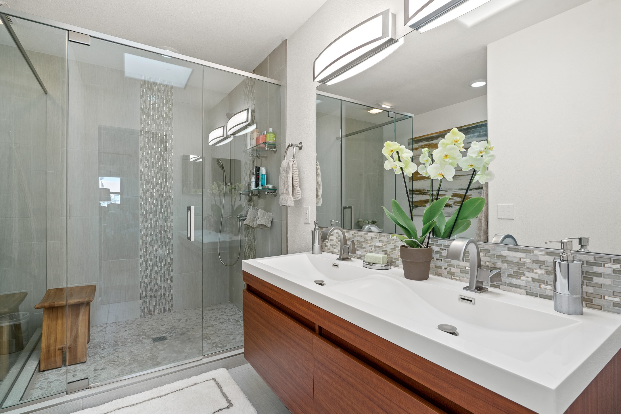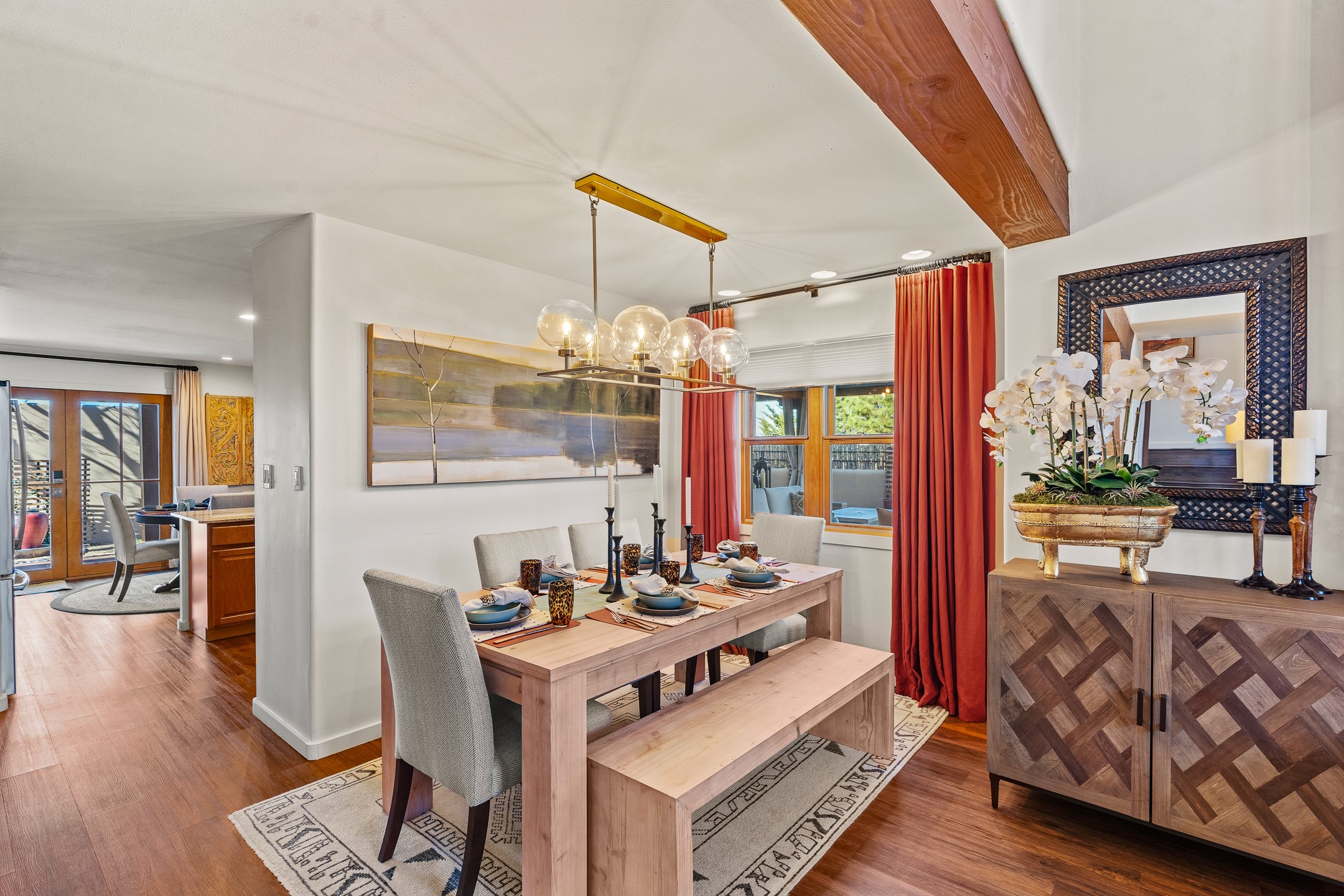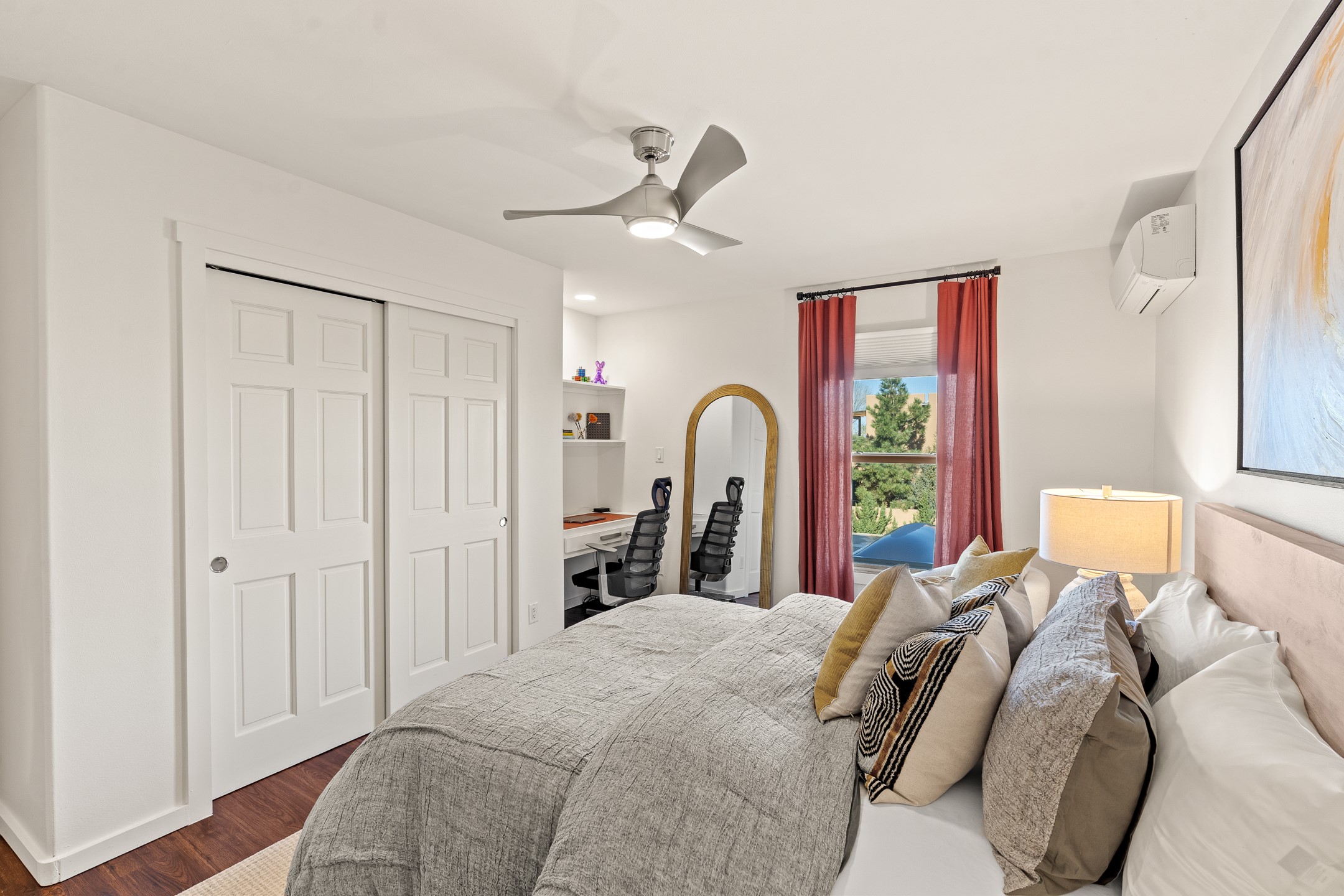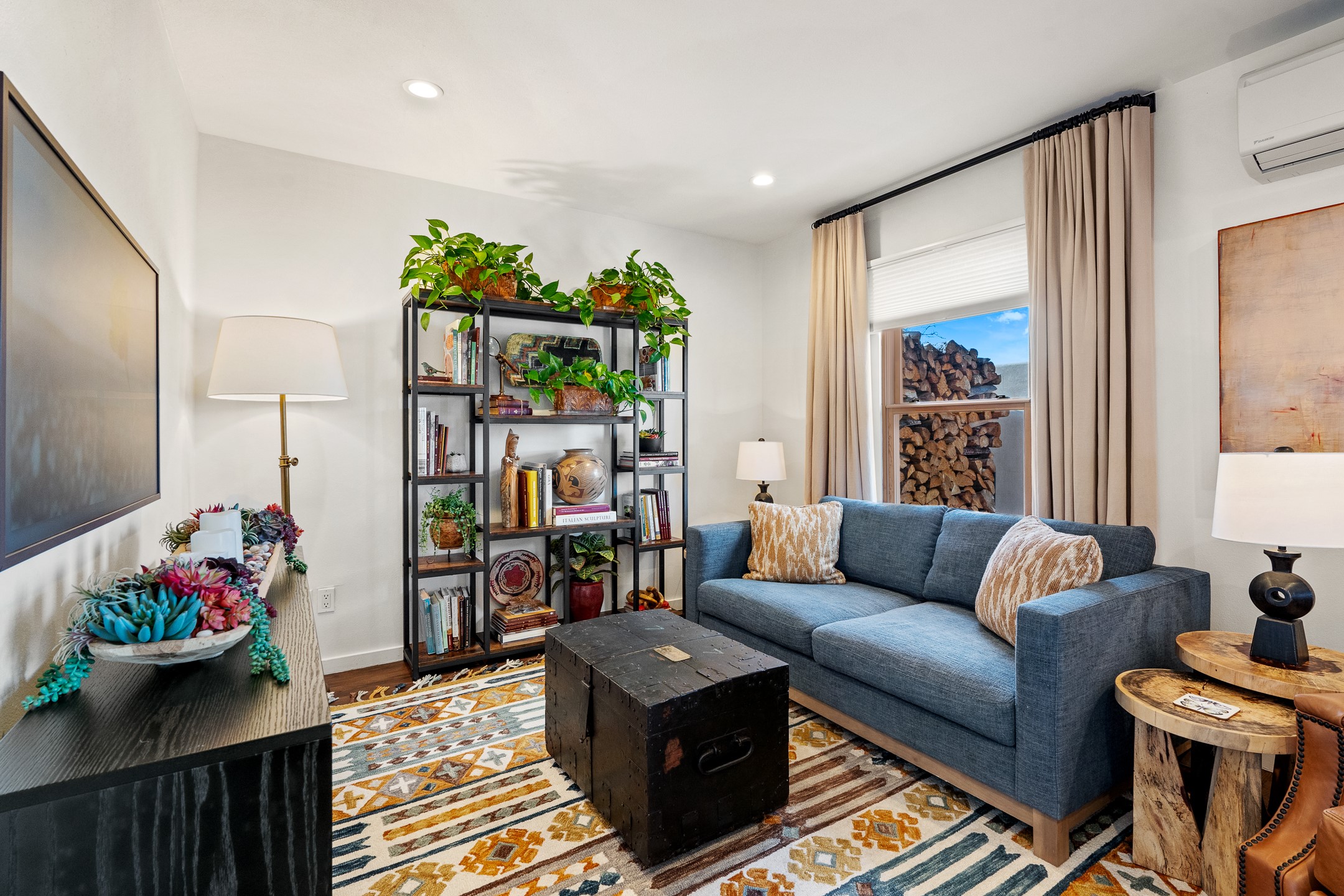 This exceptional 2,266 sq. ft. townhome blends comfort, elegance, and warmth into a beautifully crafted living experience. Move-in ready with new roof, stucco, rear exterior doors, mini splits in every room (2023), and a new furnace and tankless water heater (2022), no maintenance has been deferred. With 3 bedrooms, 2.5 bathrooms, and a 2-car garage plus 2 additional adjacent parking spaces, this home offers elevated style in one of Santa Fe's most sought-after communities. Step inside and be captivated by the dramatic high ceilings, accented with hand-hewn beams and a cozy kiva fireplace that anchors the light-filled living room. Unlike most in Aldea, this residence features a separate family room off the kitchen--a versatile space ideal for intimate gatherings. The kitchen features granite countertops and modern appliances. Step outside into your private courtyard oasis--fully landscaped and designed for both serene unwinding and lively entertaining. Relax under the custom pergola with skylights that filter the perfect touch of sunlight while listening to the soothing sounds of the fountain. Upstairs, the primary suite offers a true sanctuary with a California Closet and a private deck --perfect for sunset reflections or morning coffee. Two additional bedrooms provide space and comfort for guests or a home office. Additional features include custom floor-to-ceiling drapes in living room, pleated cellular blinds, modern lighting, and curated fixtures. From the elegant living and dining room to the thoughtfully designed outdoor haven, this home is more than a residence--it's a feeling. A place where every detail has been considered, every space crafted to invite peace, beauty, and connection. Come home to Aldea--where luxury lives!