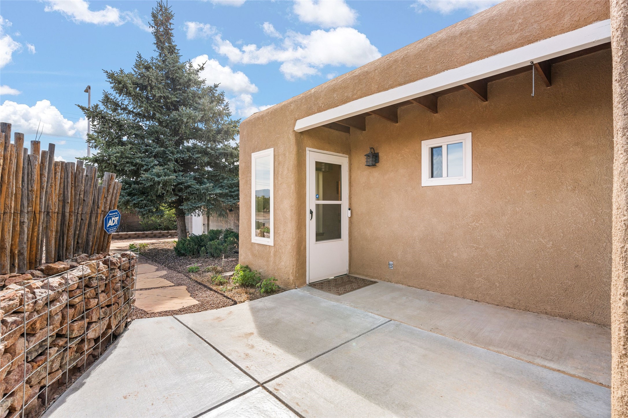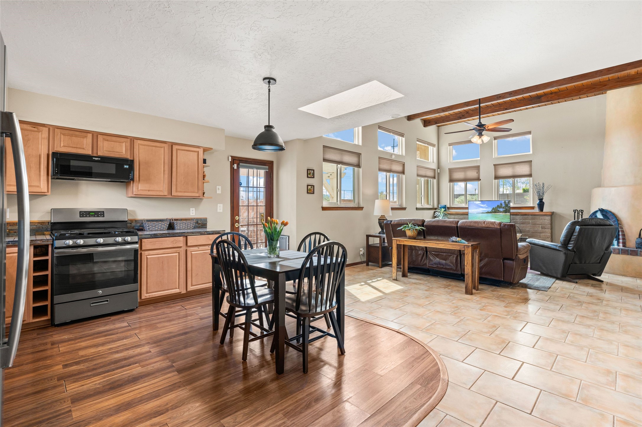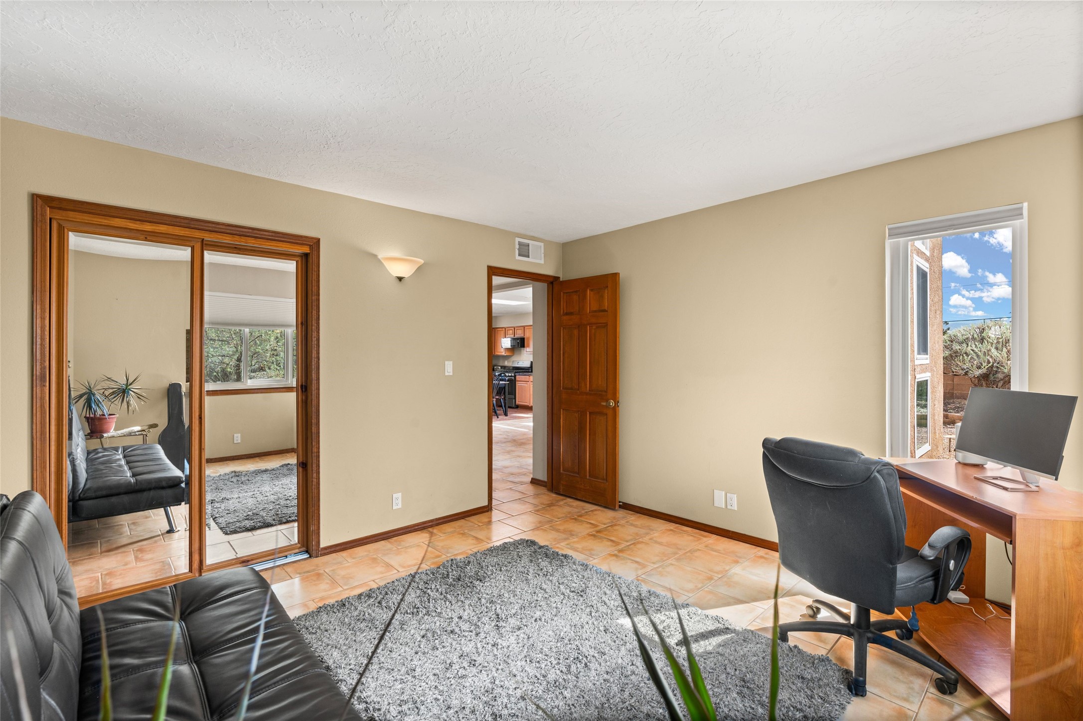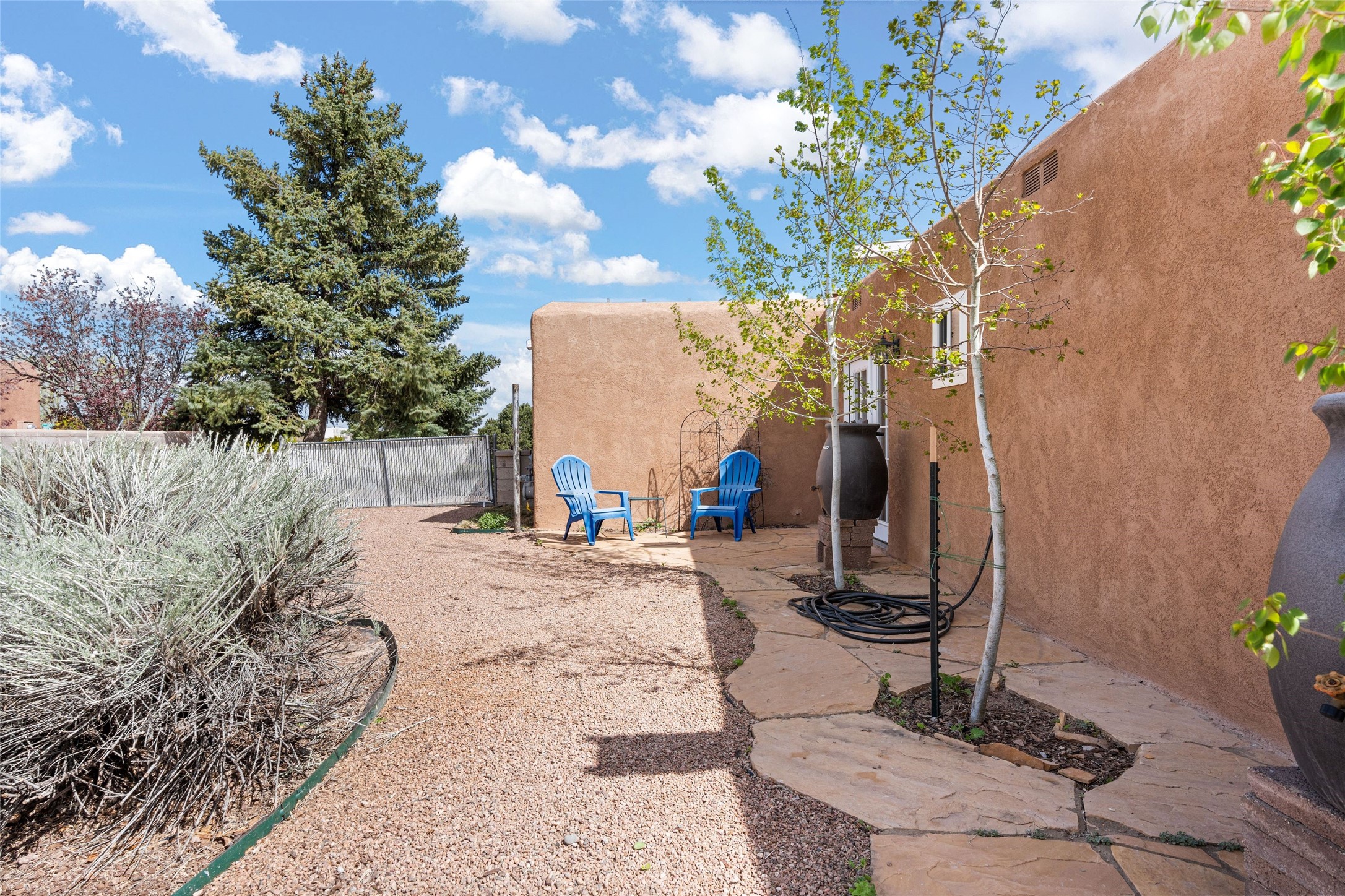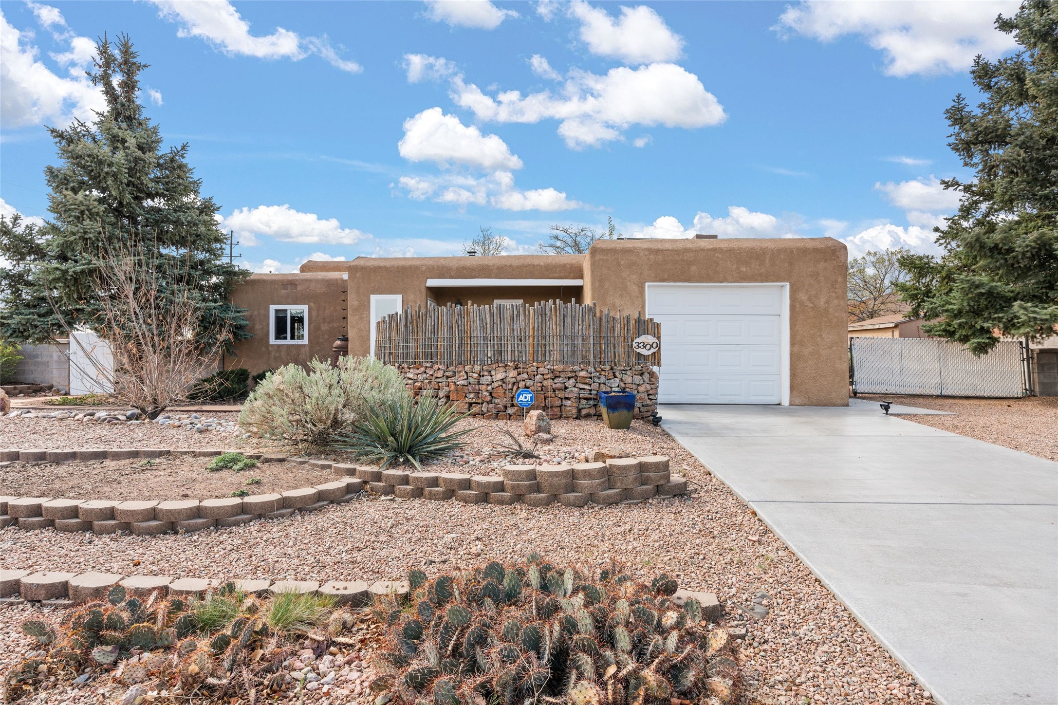 A gardener's dream! Welcome to this charming 2-bedroom, 1-bathroom centrally located home. This well-maintained property offers a perfect blend of Santa Fe style and modern upgrades. Enjoy soaring high ceilings and skylights with a classic kiva wood-burning fireplace in the living room, plus a small trombe wall for passive solar gain. Other amenities include an updated bathroom with skylight, newer windows for energy efficiency, a separate laundry room, 1-car garage, solar panels, newer furnace and water heater. The primary bedroom enjoys French doors opening to a patio. This home's backyard is a must see with a large flagstone patio with pergola and seating. Extensive gardening space and delightfully mature grape vines complete the extensive exterior space. Don't miss this cozy and character-filled home with energy-efficient features, and thoughtful design throughout.