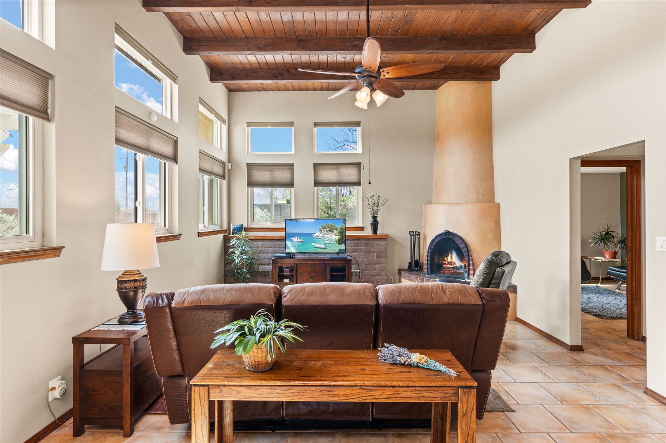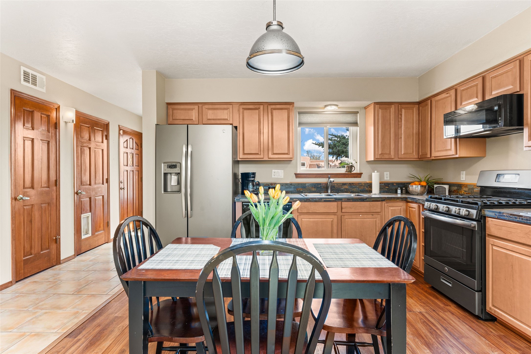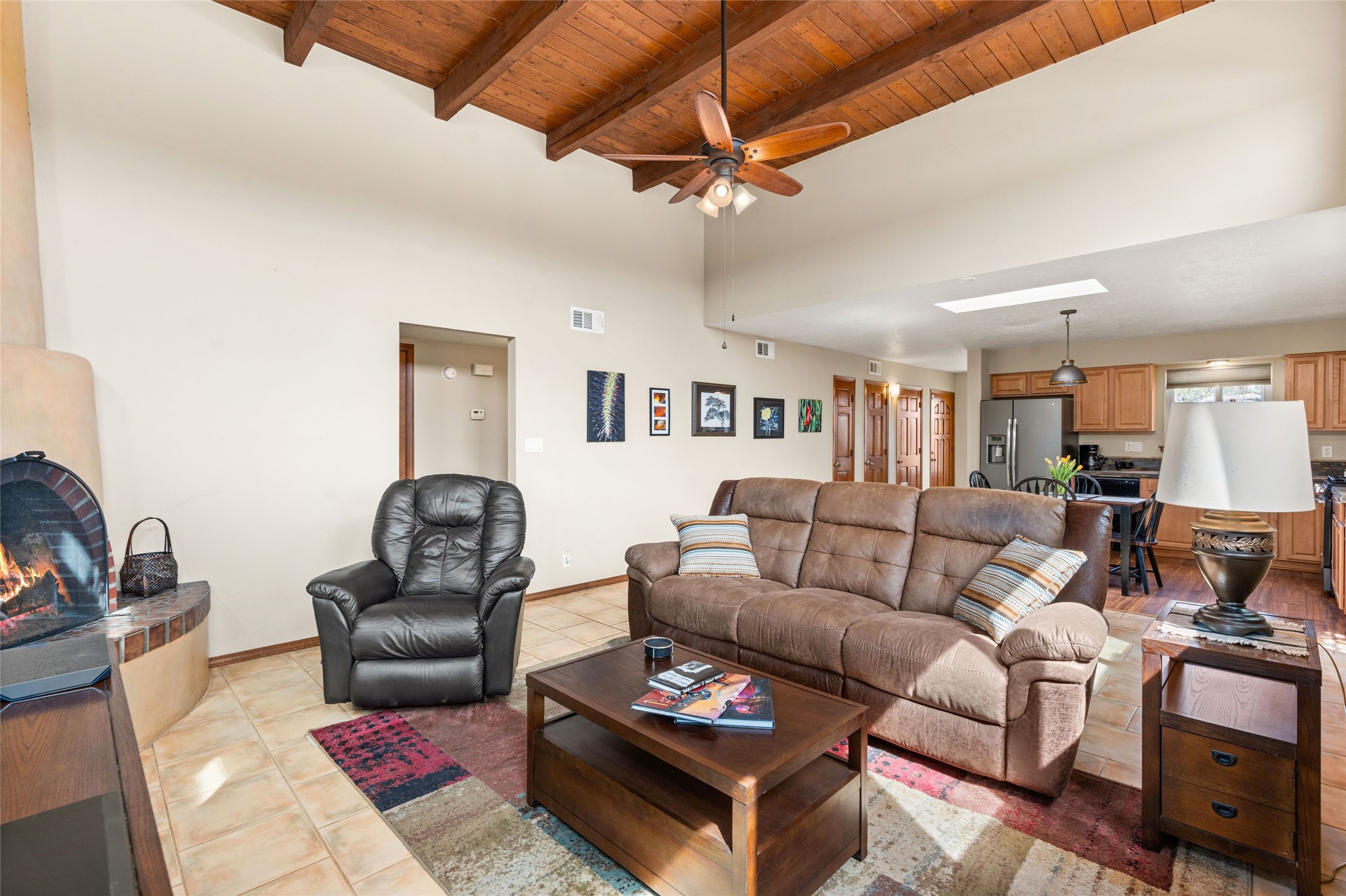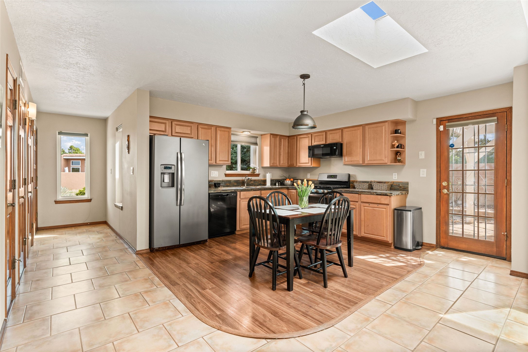 A gardener's dream! Welcome to this charming 2-bedroom, 1-bathroom centrally located home. This well-maintained property offers a perfect blend of Santa Fe style and modern upgrades. Enjoy soaring high ceilings and skylights with a classic kiva wood-burning fireplace in the living room, plus a small trombe wall for passive solar gain. Other amenities include an updated bathroom with skylight, newer windows for energy efficiency, a separate laundry room, 1-car garage, solar panels, newer furnace and water heater. The primary bedroom enjoys French doors opening to a patio. This home's backyard is a must see with a large flagstone patio with pergola and seating. Extensive gardening space and delightfully mature grape vines complete the extensive exterior space. Don't miss this cozy and character-filled home with energy-efficient features, and thoughtful design throughout.