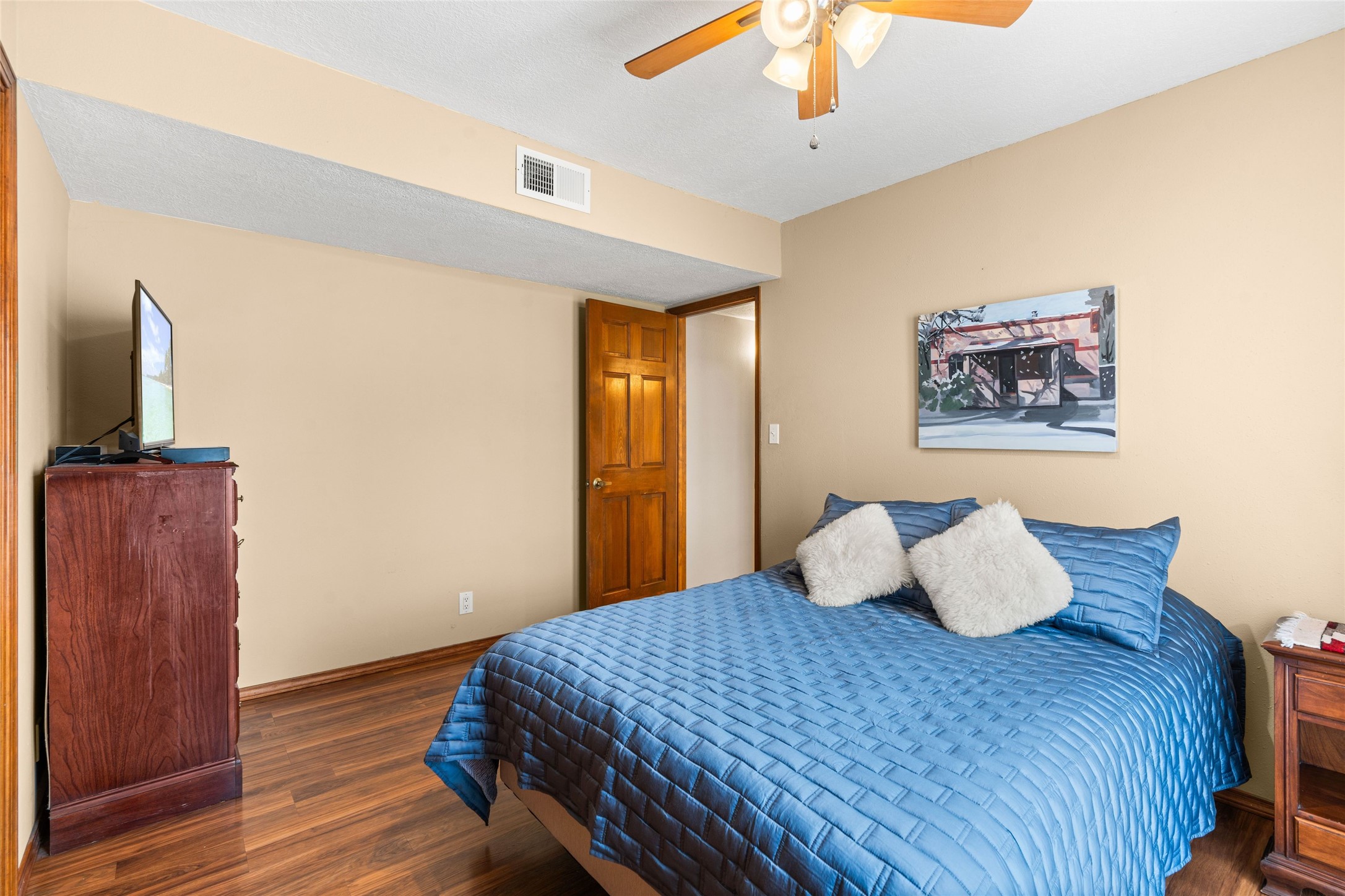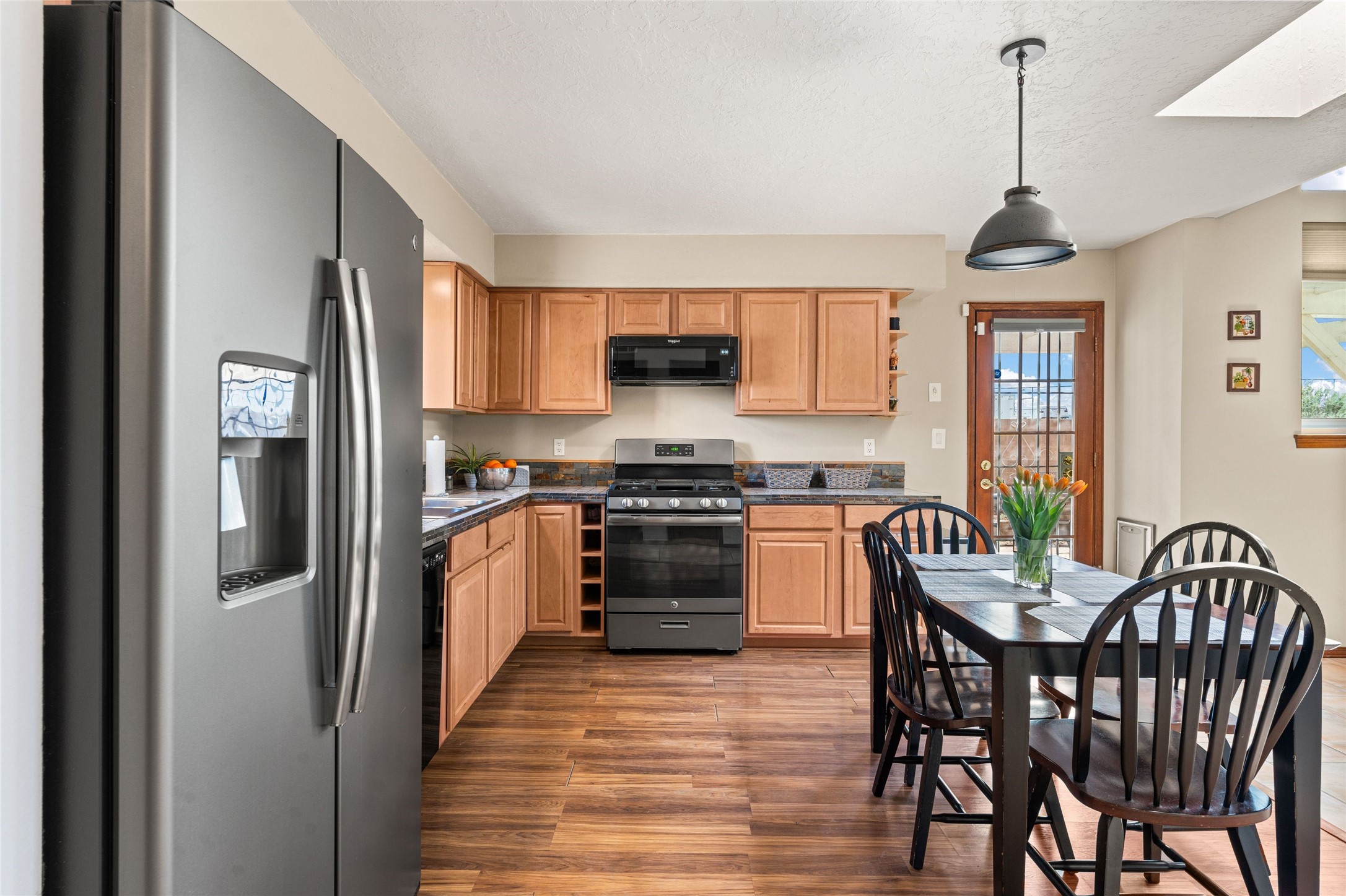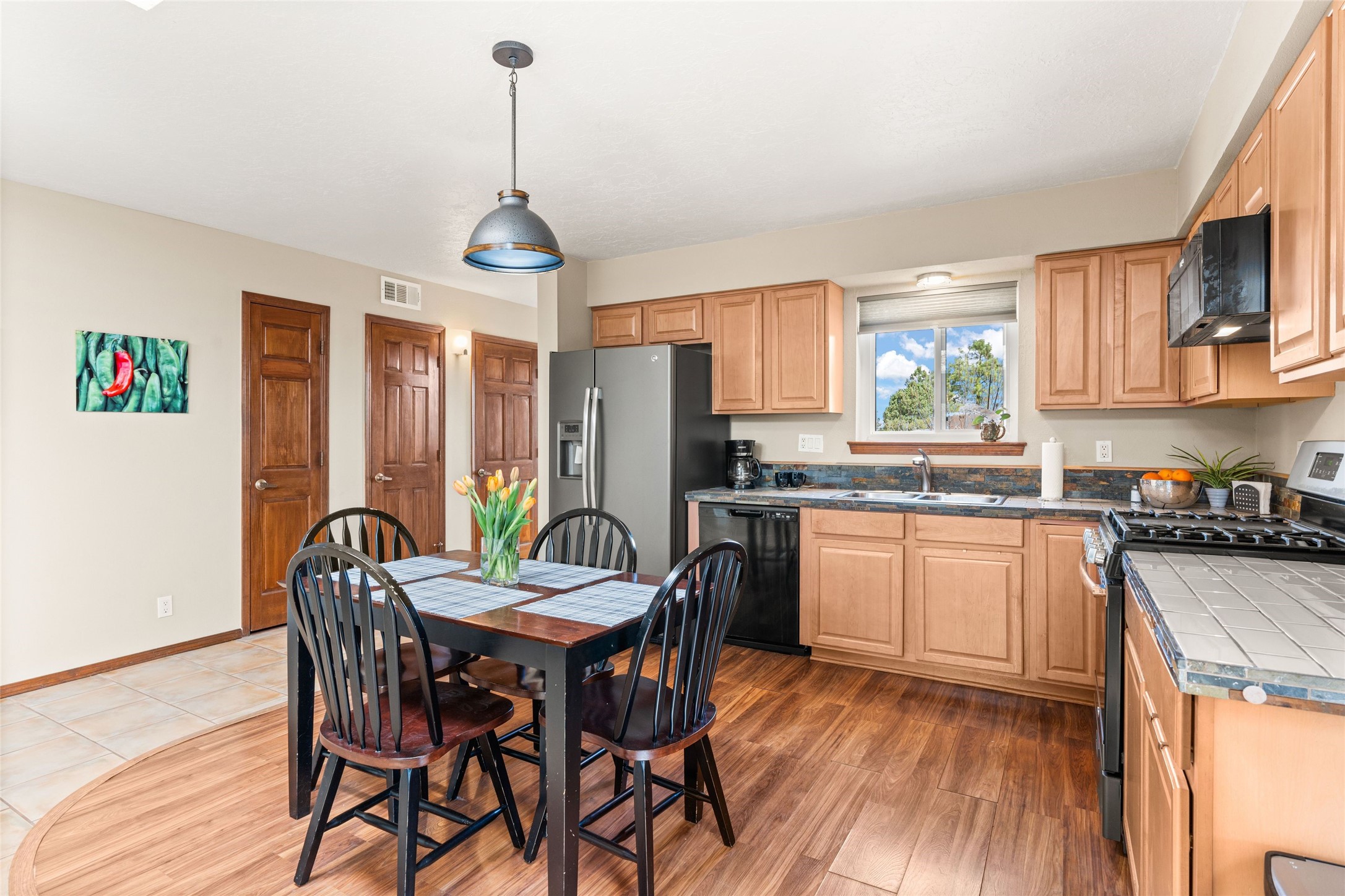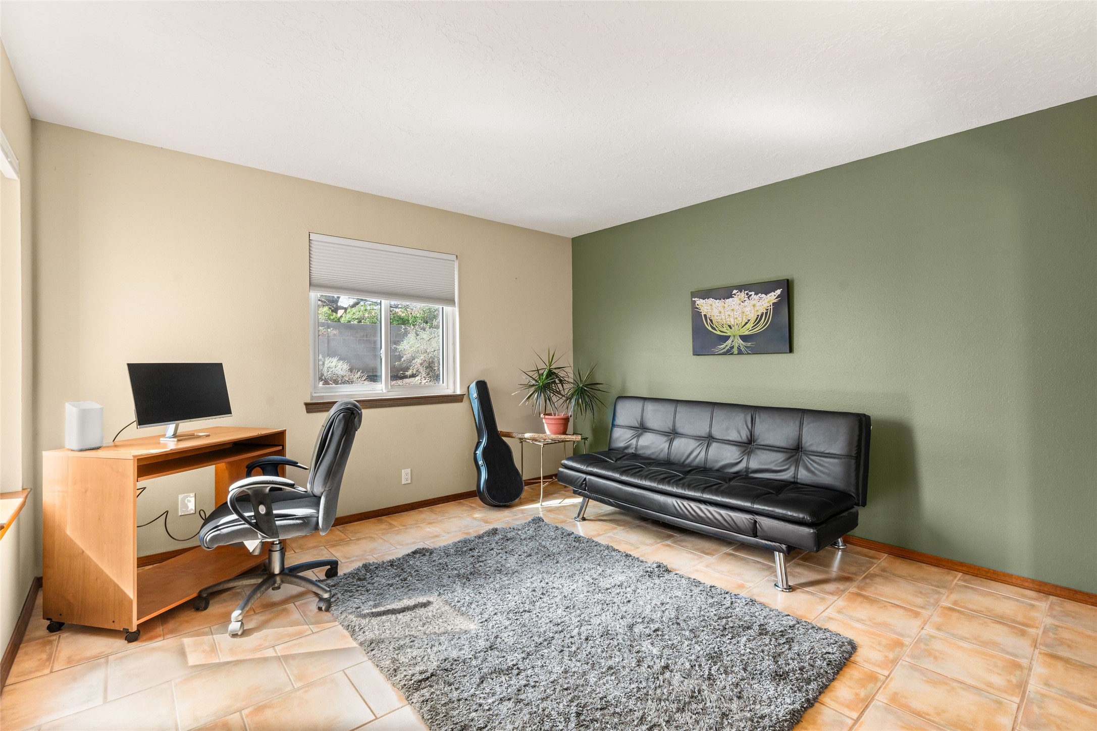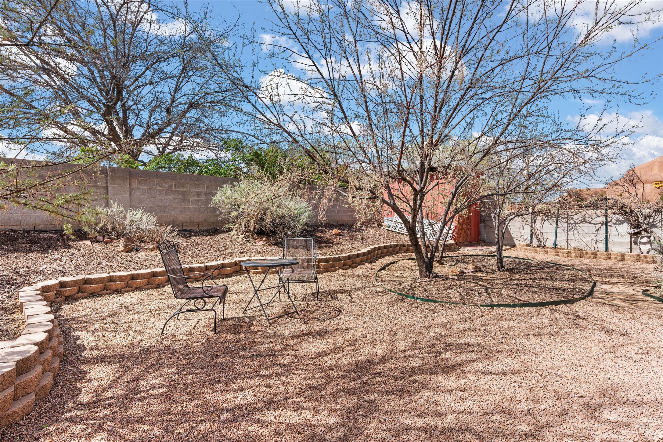 A gardener's dream! Welcome to this charming 2-bedroom, 1-bathroom centrally located home. This well-maintained property offers a perfect blend of Santa Fe style and modern upgrades. Enjoy soaring high ceilings and skylights with a classic kiva wood-burning fireplace in the living room, plus a small trombe wall for passive solar gain. Other amenities include an updated bathroom with skylight, newer windows for energy efficiency, a separate laundry room, 1-car garage, solar panels, newer furnace and water heater. The primary bedroom enjoys French doors opening to a patio. This home's backyard is a must see with a large flagstone patio with pergola and seating. Extensive gardening space and delightfully mature grape vines complete the extensive exterior space. Don't miss this cozy and character-filled home with energy-efficient features, and thoughtful design throughout.