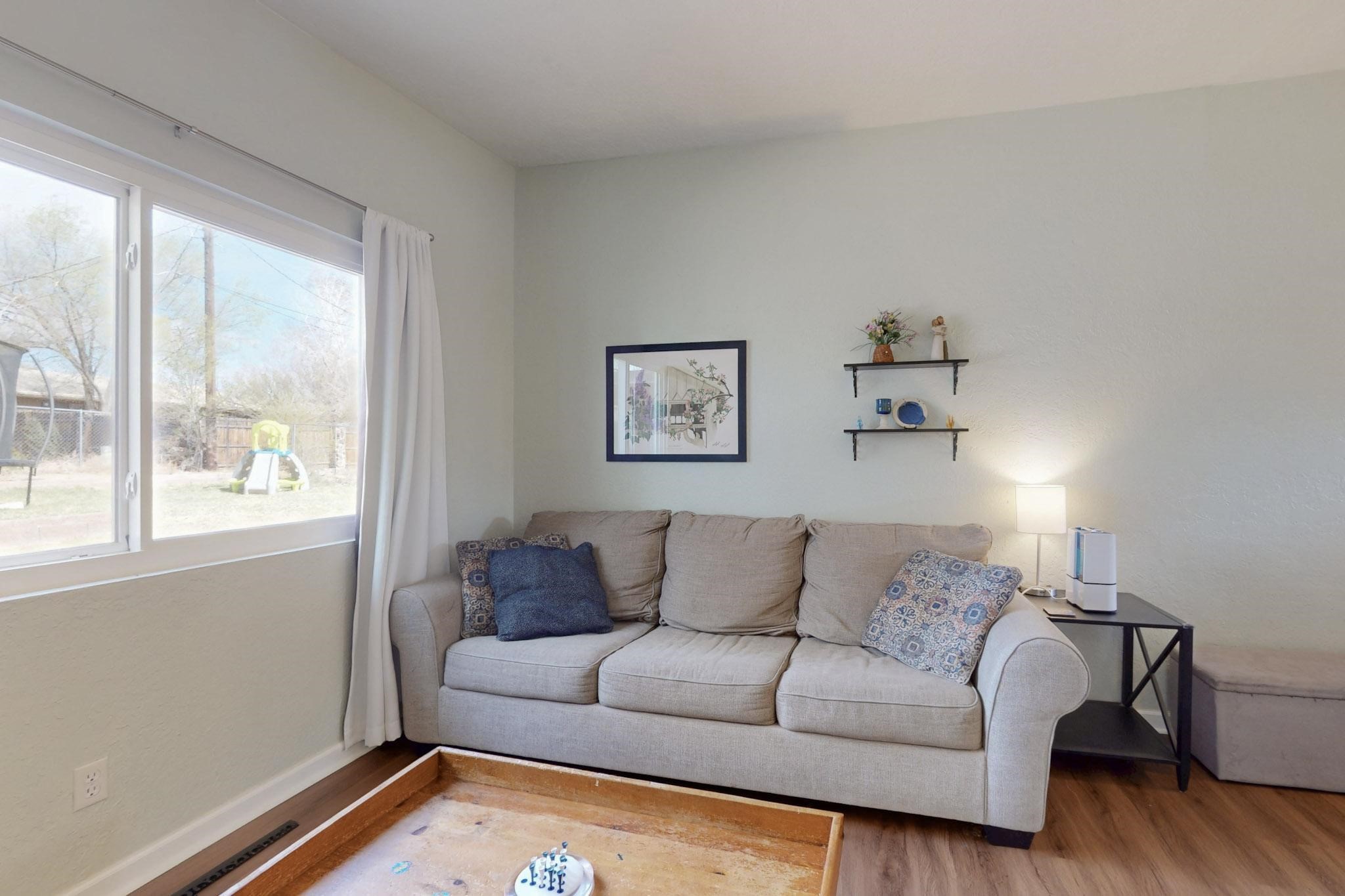OPEN HOUSE: Saturday, April 19 10-1 Charming home with many amazing updated features and very nicely maintained. Newer roof, windows, doors, gutters and restored ducts. 2024 Cellulose blown-in insulation in ceiling space R-30 on top of current R-19. Cozy all year round with gas fireplace and refrigerated air. Two living areas make it comfortable for the whole family. Vinyl flooring throughout with carpet in the bedrooms. Separate laundry room with shelves and closet. Amazing backyard! Wonderful courtyard and patio, backyard has sprinklers and is shady in the summer, plus has a basketball court. Nice size shed. One car garage has built in shelving to make it very useable. Additional parking pad in front for car or small trailer. Location is ideal on a pleasant cul-de-sac only 2 blocks from the elementary school and walking distance to Overlook and Rover Parks. Make this your new home.