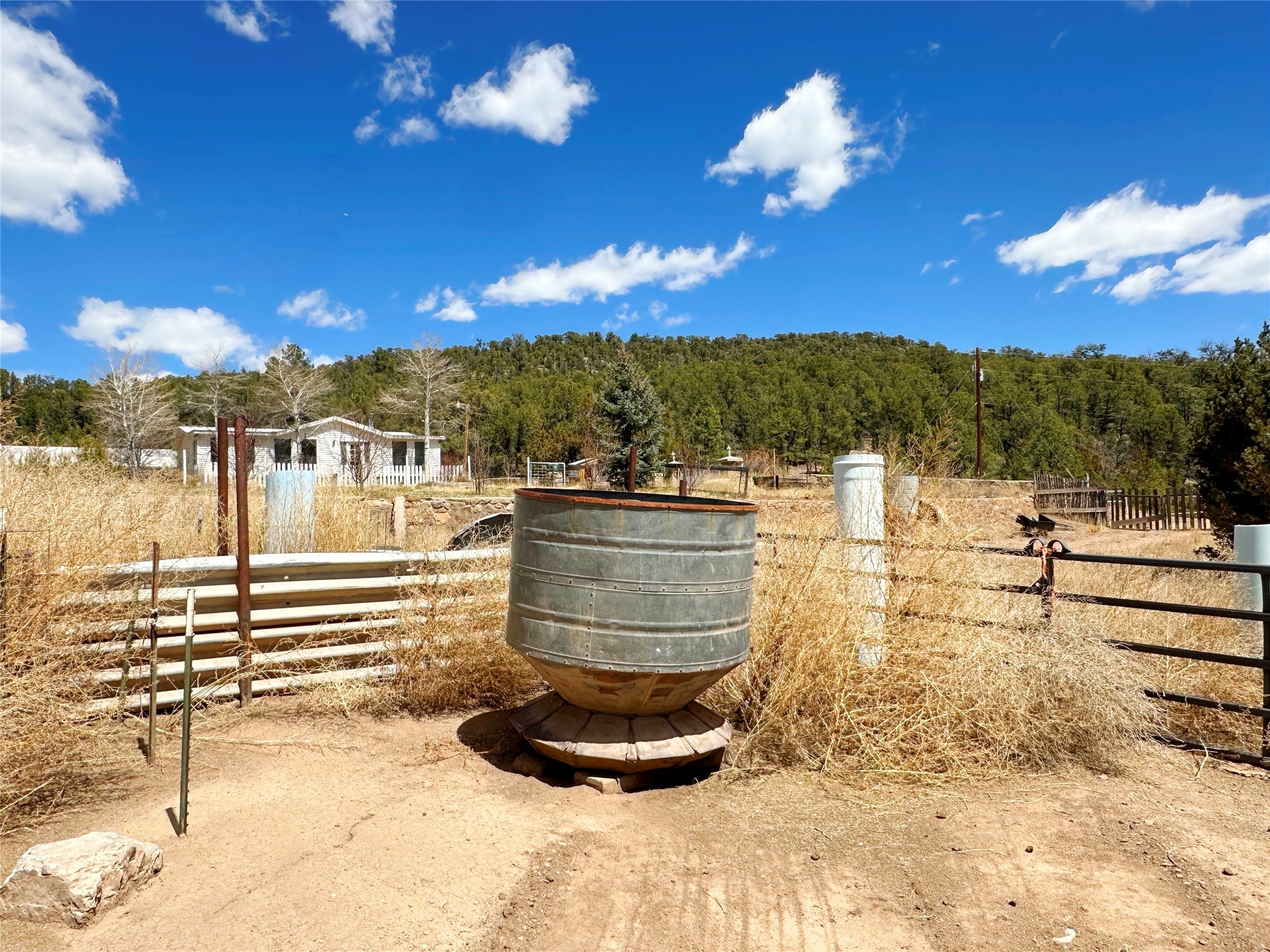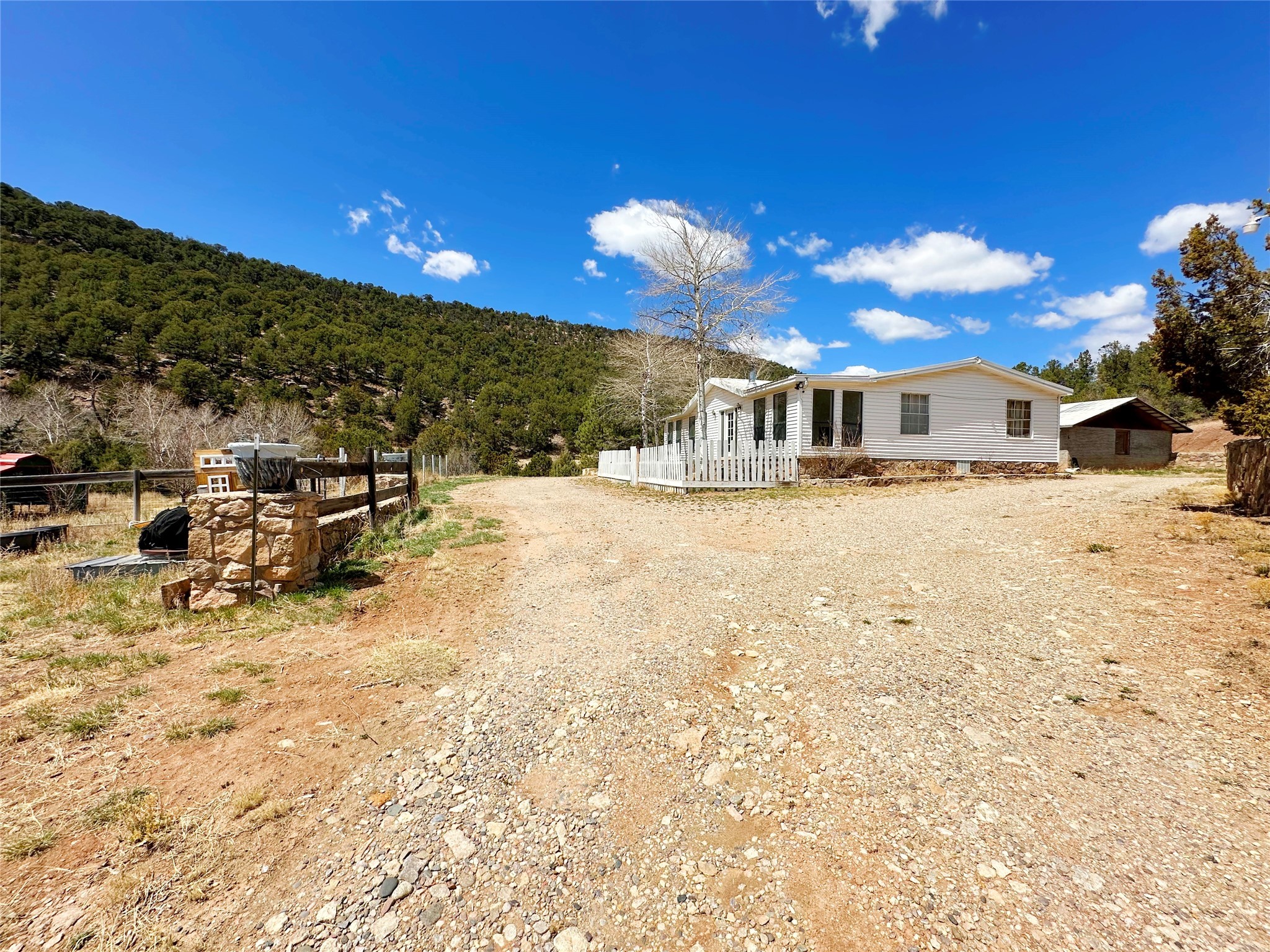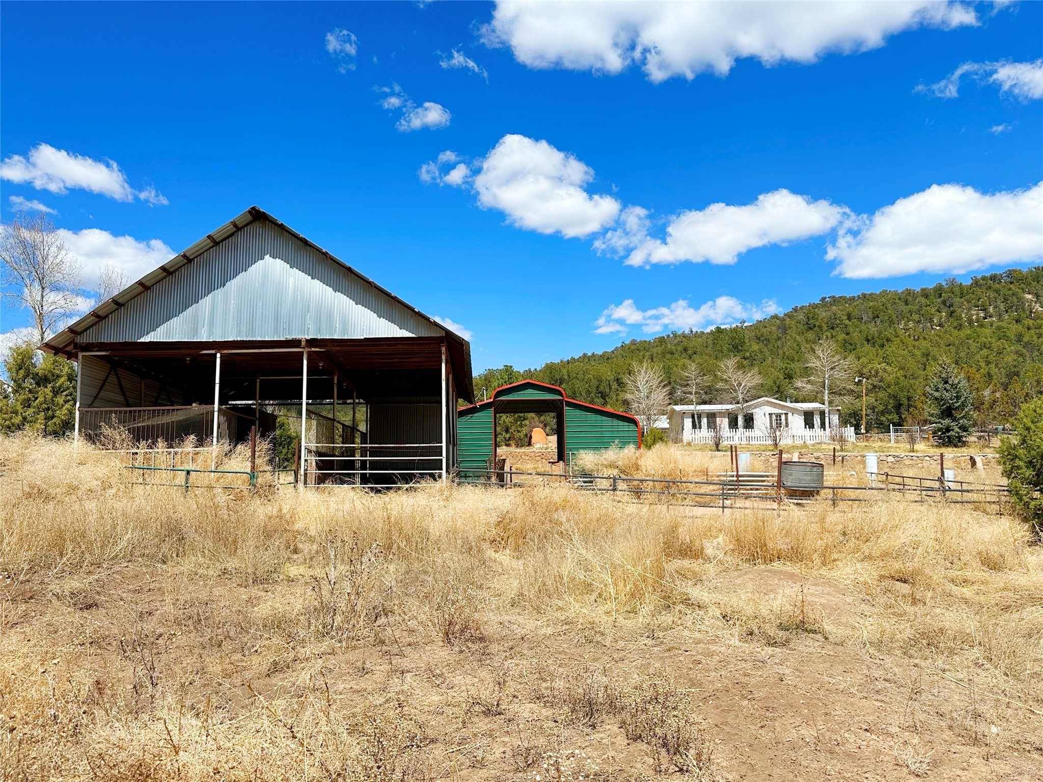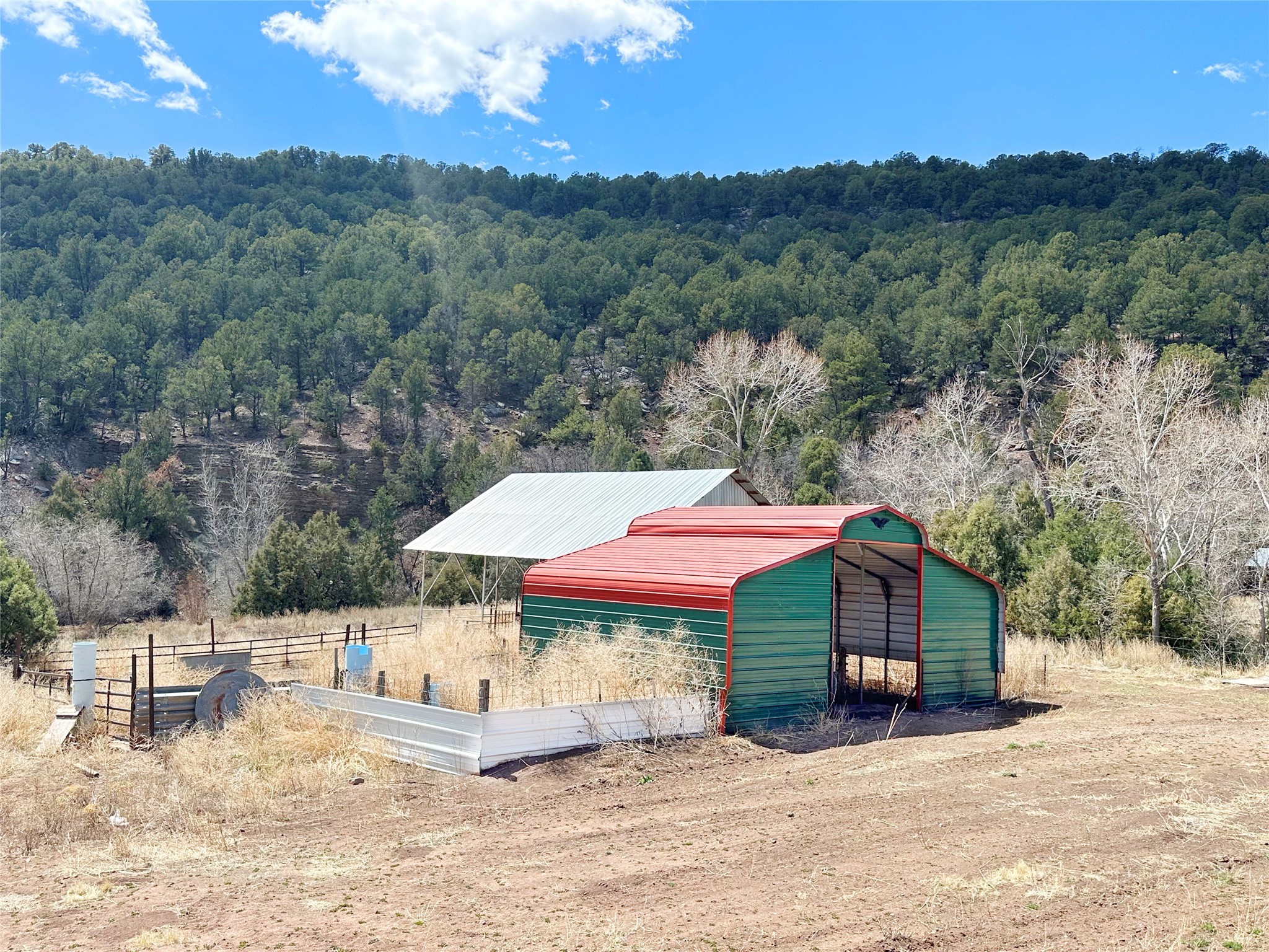 This 27+ acre northern New Mexico homestead features a 3-bed, 2-bath manufactured home, ready for your updates. Recent infrastructure upgrades include a new well pump and updated septic system. Natural water flow is guided by erosion control efforts and engineered drainage that feeds into a small seasonal pond. The property has been lovingly used as a small livestock farm with pens for pigs, goats, and chickens, plus corrals that can accommodate horses. The fenced pasture allows for some rotational grazing (electric fencing may need regular maintenance). A mature grapevine and a young orchard of apple and pear trees near the home offer food production potential, with space for expanded gardening. A large workshop/garage provides excellent storage for vehicles, tools, and ATVs, and includes an electric RV hookup. The acreage rises into a well-maintained pion forest, which has been selectively thinned to provide both grazing and usable timber. The topography is steep in places but accessible from the northern boundary, where a natural shelf offers a potential wooded build site. The property shares a boundary with National Forest and is located near Bull Creek, offering both privacy and direct access to public land. Just 50 minutes from Santa Fe via well-maintained roads, this versatile property is ready for homesteading, recreation, or peaceful rural living with existing agricultural infrastructure and stunning natural surroundings.