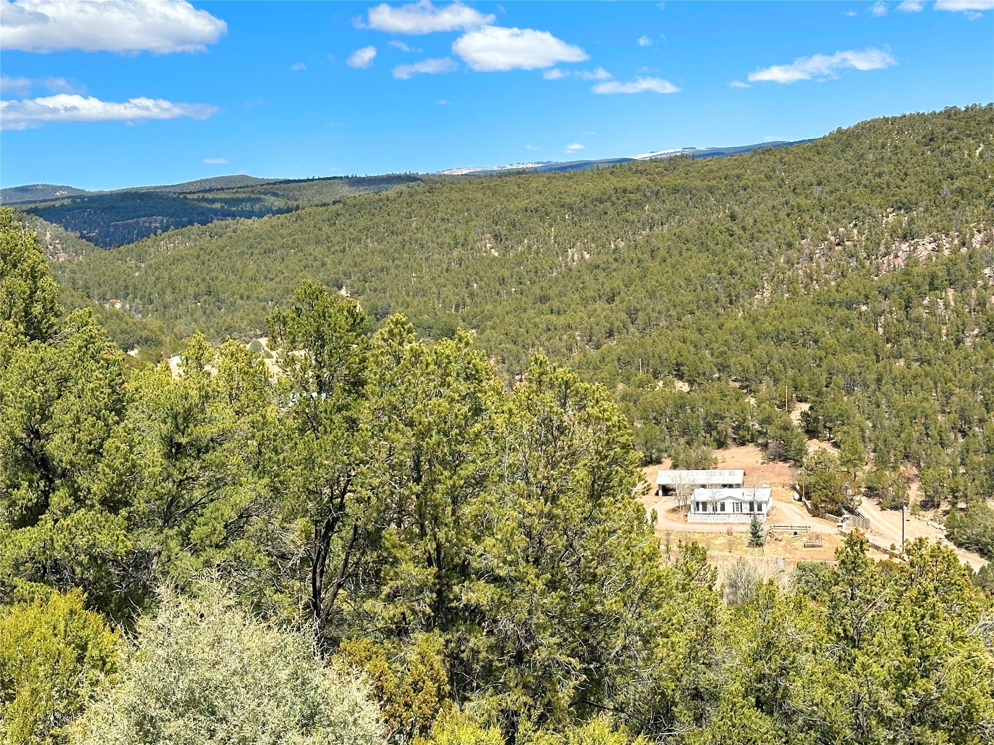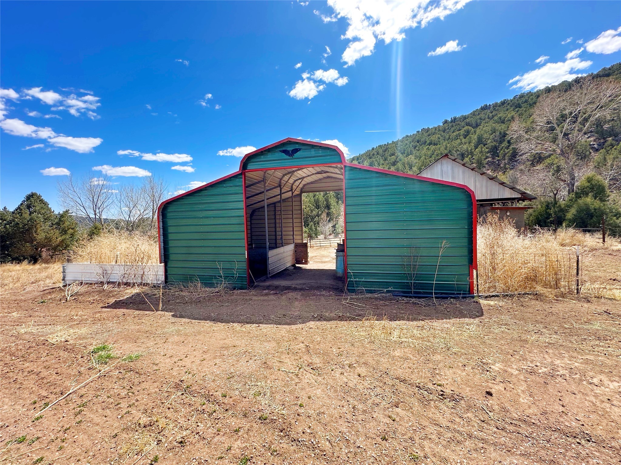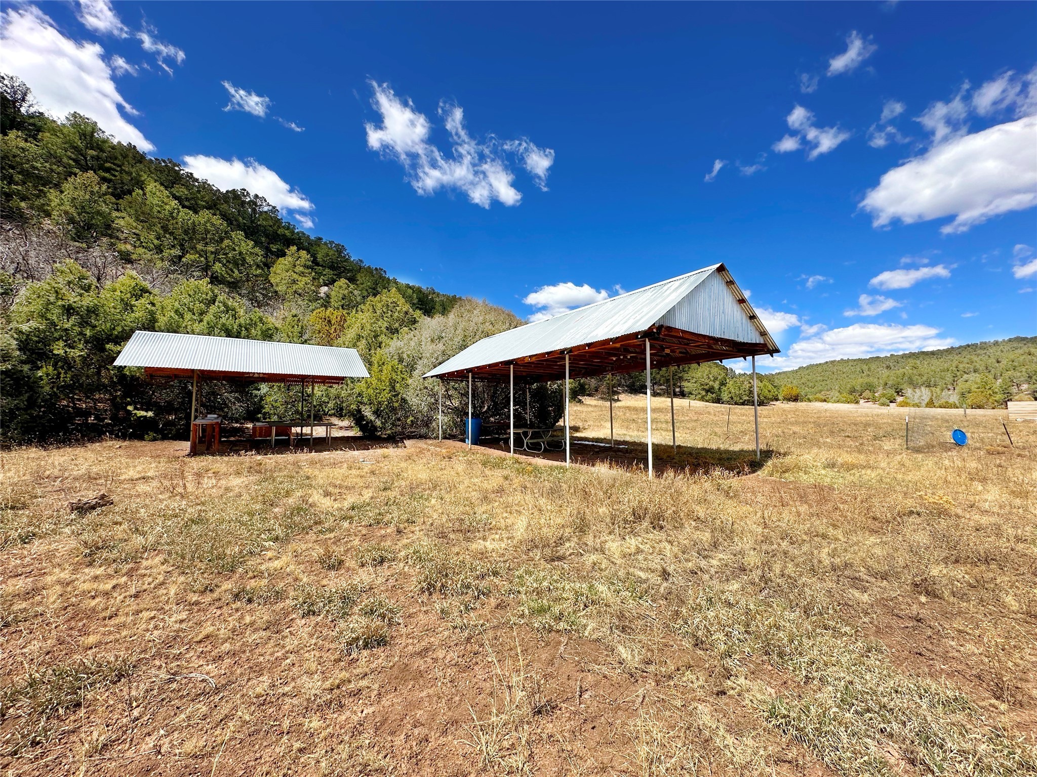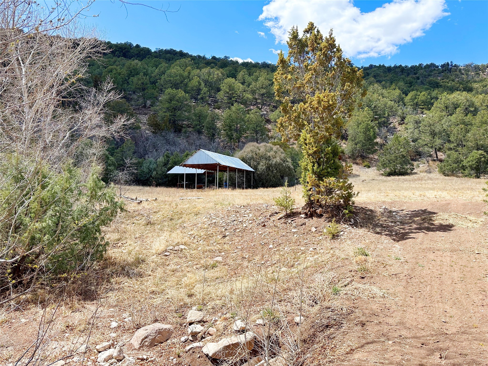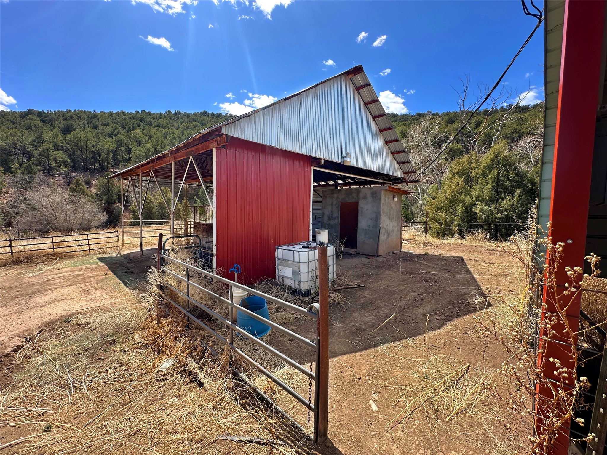 This 27+ acre northern New Mexico homestead features a 3-bed, 2-bath manufactured home, ready for your updates. Recent infrastructure upgrades include a new well pump and updated septic system. Natural water flow is guided by erosion control efforts and engineered drainage that feeds into a small seasonal pond. The property has been lovingly used as a small livestock farm with pens for pigs, goats, and chickens, plus corrals that can accommodate horses. The fenced pasture allows for some rotational grazing (electric fencing may need regular maintenance). A mature grapevine and a young orchard of apple and pear trees near the home offer food production potential, with space for expanded gardening. A large workshop/garage provides excellent storage for vehicles, tools, and ATVs, and includes an electric RV hookup. The acreage rises into a well-maintained pion forest, which has been selectively thinned to provide both grazing and usable timber. The topography is steep in places but accessible from the northern boundary, where a natural shelf offers a potential wooded build site. The property shares a boundary with National Forest and is located near Bull Creek, offering both privacy and direct access to public land. Just 50 minutes from Santa Fe via well-maintained roads, this versatile property is ready for homesteading, recreation, or peaceful rural living with existing agricultural infrastructure and stunning natural surroundings.