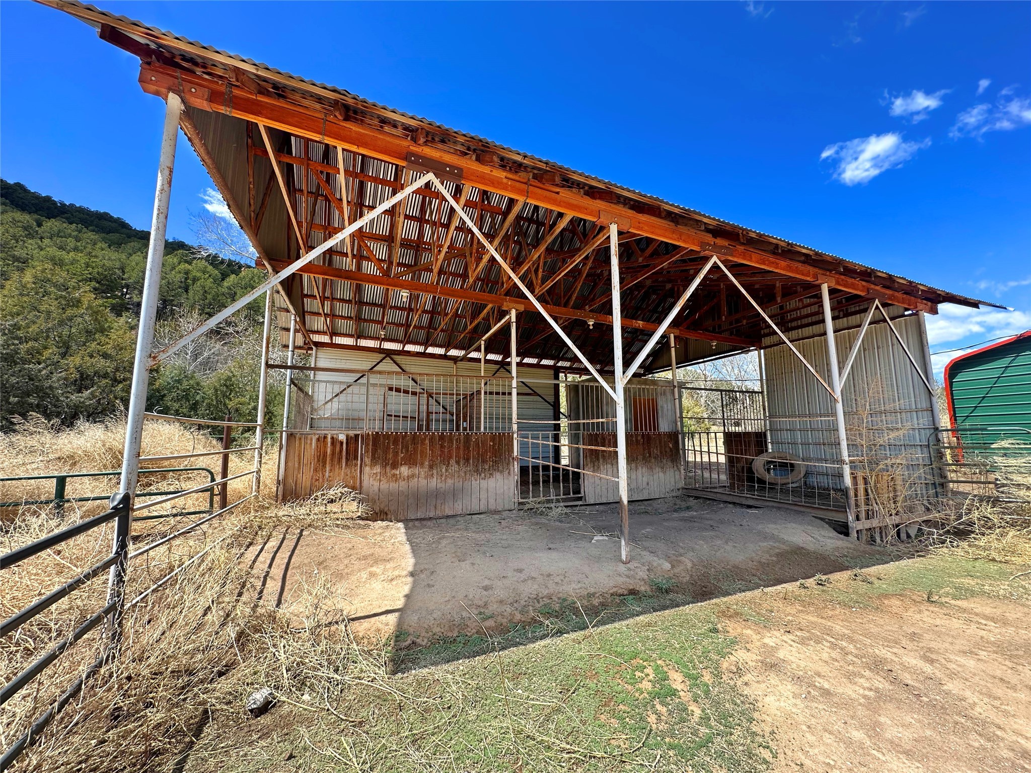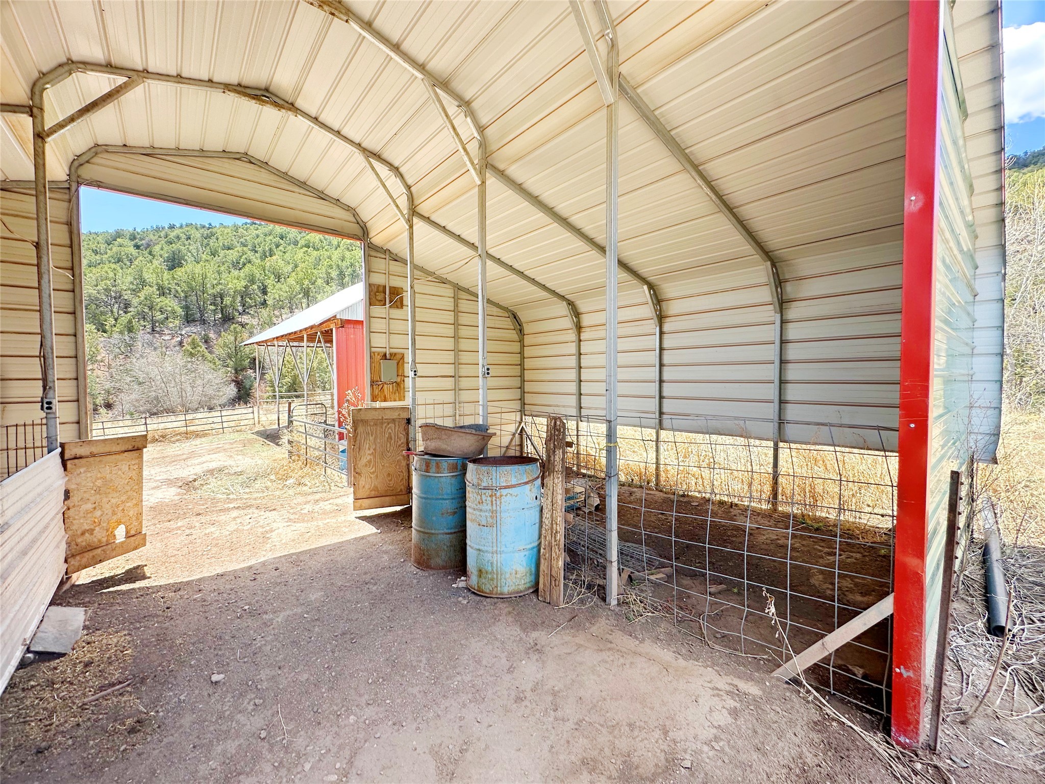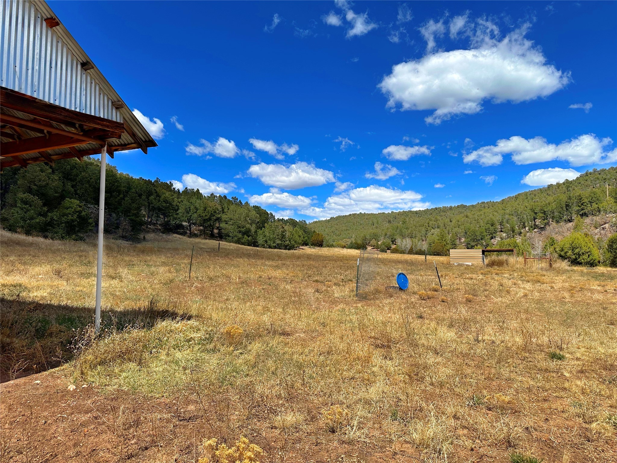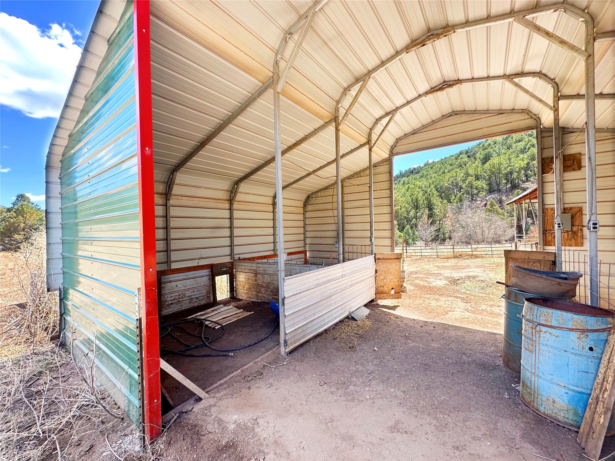 This 27+ acre northern New Mexico homestead features a 3-bed, 2-bath manufactured home, ready for your updates. Recent infrastructure upgrades include a new well pump and updated septic system. Natural water flow is guided by erosion control efforts and engineered drainage that feeds into a small seasonal pond. The property has been lovingly used as a small livestock farm with pens for pigs, goats, and chickens, plus corrals that can accommodate horses. The fenced pasture allows for some rotational grazing (electric fencing may need regular maintenance). A mature grapevine and a young orchard of apple and pear trees near the home offer food production potential, with space for expanded gardening. A large workshop/garage provides excellent storage for vehicles, tools, and ATVs, and includes an electric RV hookup. The acreage rises into a well-maintained pion forest, which has been selectively thinned to provide both grazing and usable timber. The topography is steep in places but accessible from the northern boundary, where a natural shelf offers a potential wooded build site. The property shares a boundary with National Forest and is located near Bull Creek, offering both privacy and direct access to public land. Just 50 minutes from Santa Fe via well-maintained roads, this versatile property is ready for homesteading, recreation, or peaceful rural living with existing agricultural infrastructure and stunning natural surroundings.