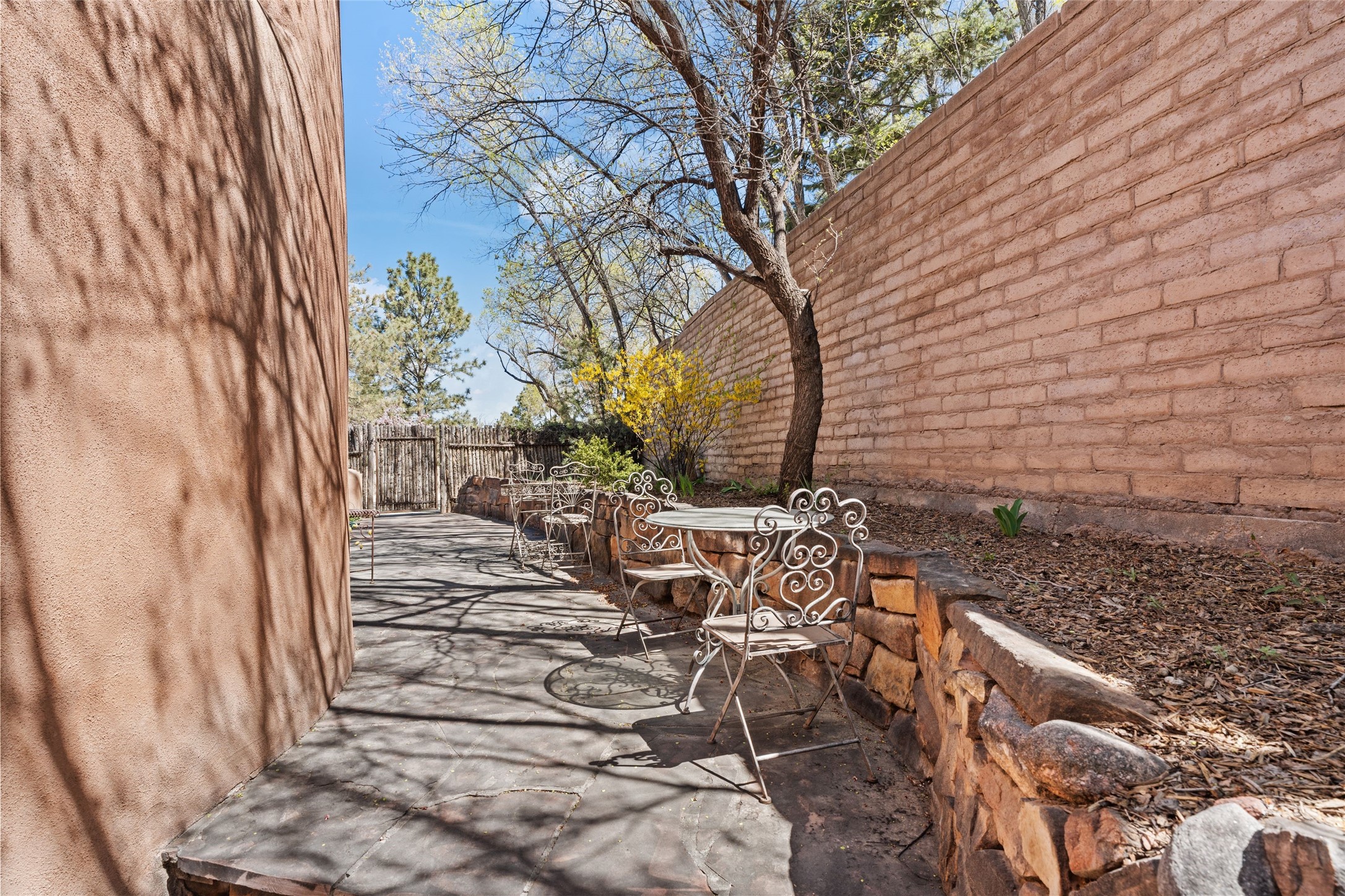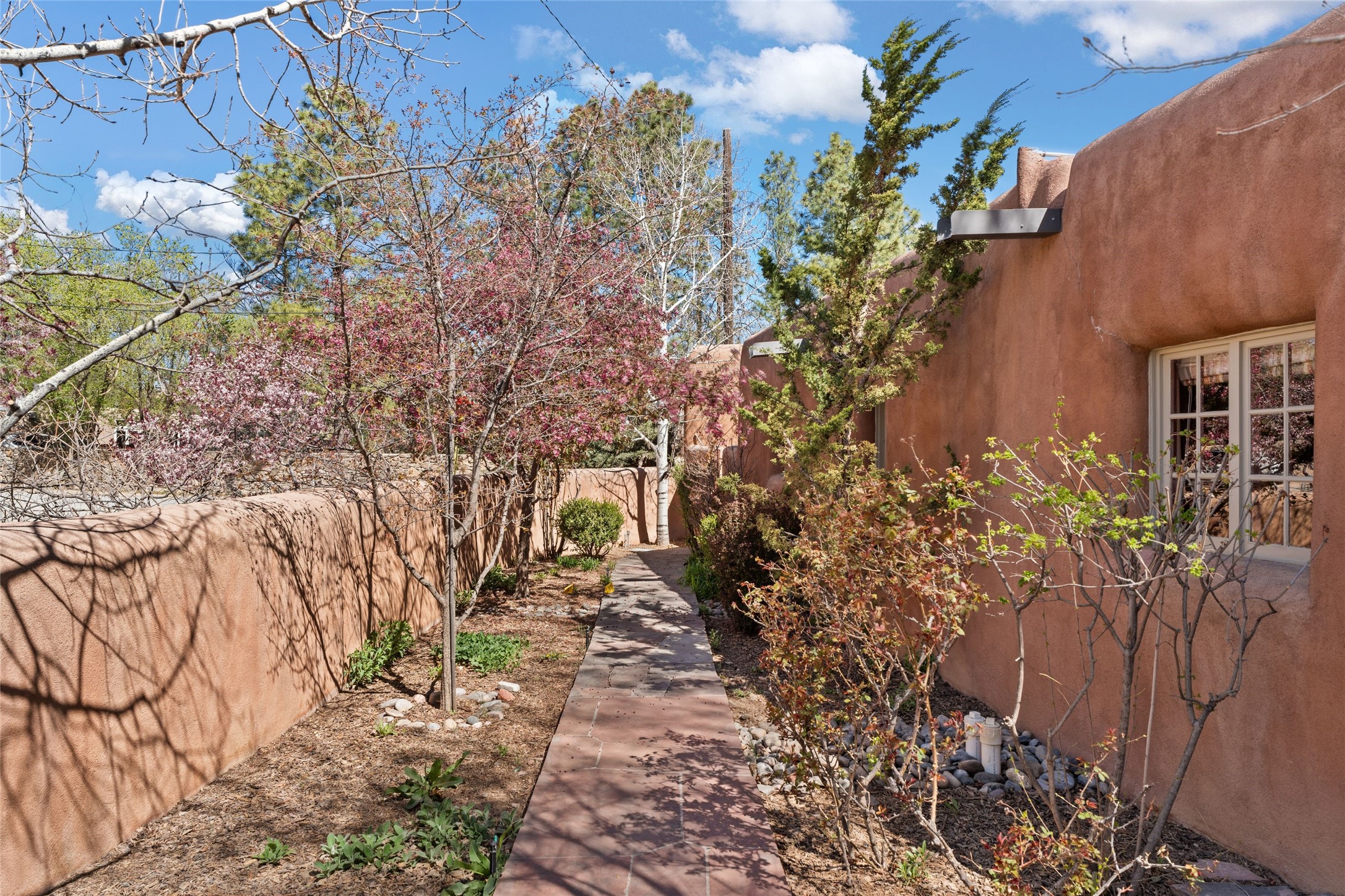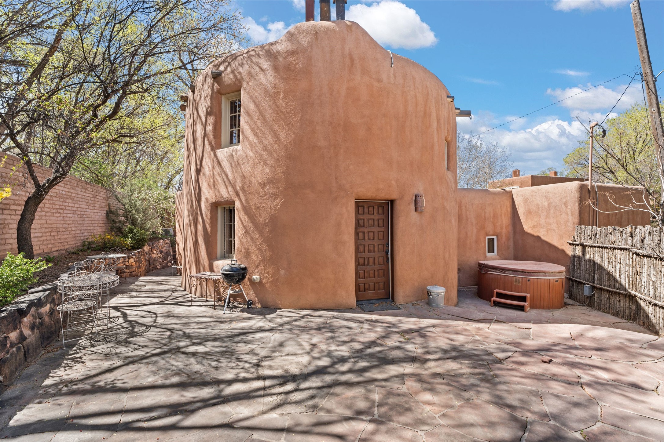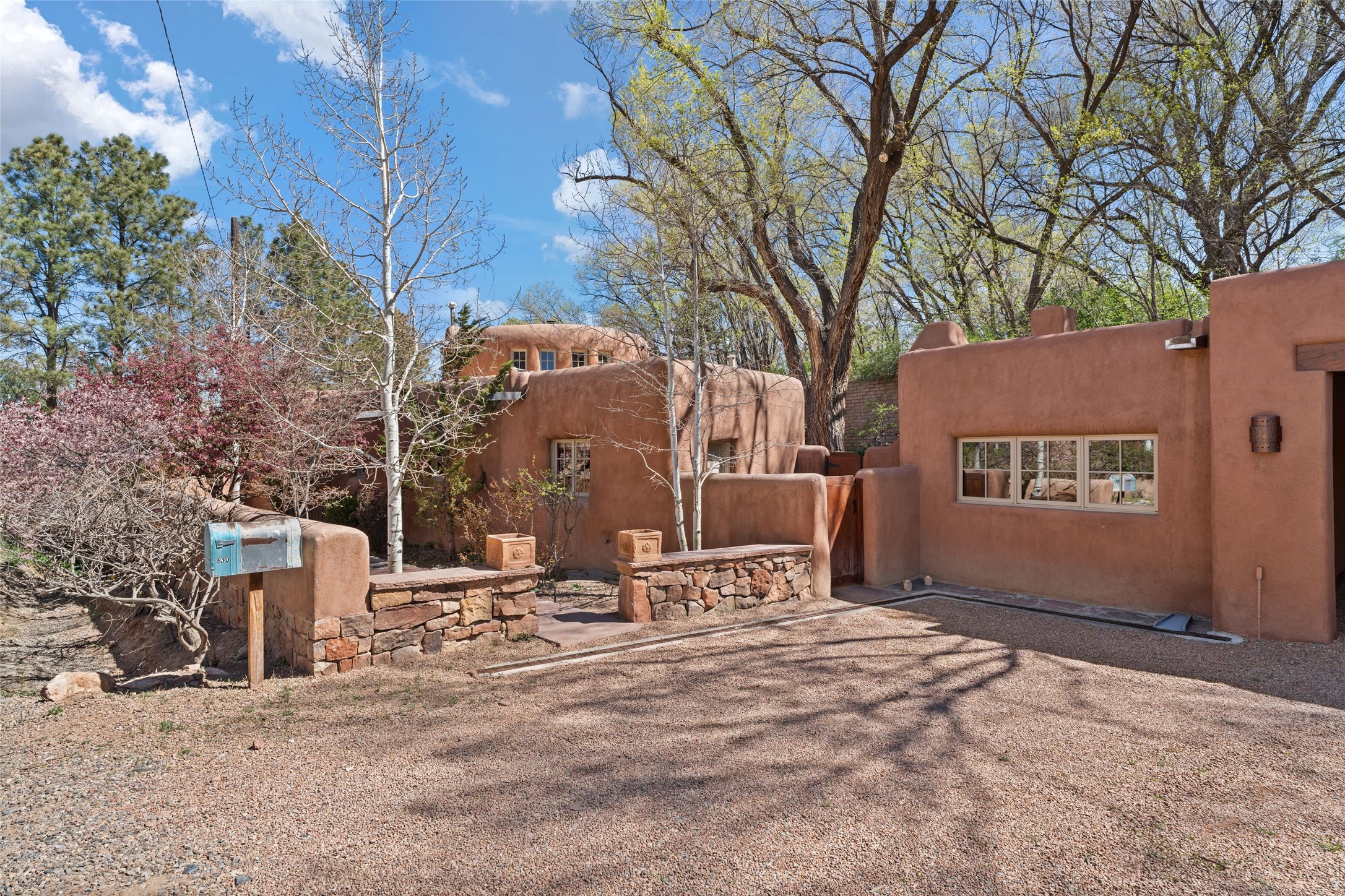This historic home, El Torreon, was built by the artist Frank Applegate in 1927 to be his personal studio. It is an easy walk to Canyon Road, the Plaza and not far from Museum Hill. Extensively remodeled, this 3-bedroom historic treasure comes turnkey with all the furnishings included, except for the art. The main bedroom is downstairs with hand adzed beams, plaster walls, carved doors, walk in closet and lovely ensuite bath with jacuzzi tub, dual sinks and walk in shower. There is good separation with the other bedrooms - one being on the other side of the house, and the 3rd bedroom upstairs in the round torre, which enjoys great light, vigas, fireplace and served as Applegate's studio back in the day. The fabulous kitchen with new cabinets, sandstone counters, newer fridge and dishwasher and a gas Viking range, is the heart of the home and open to the dining and living room, which also enjoys a fireplace and pretty plaster walls. The new studio/office was created from the old garage and has a separate entry, corner kiva fireplace, coved ceilings and a power room. A covered parking portal was added for covered off street parking! With lovely flagstone patios surrounding El Torreon, there is a cozy seating area adjacent to the separate studio by the outside kiva fireplace, a quiet patio for dining at the side of the house and a hot tub for star gazing on clear nights from your fully enclosed outdoor patio. There is radiant heat, 3 mini splits for cooling and added heat as well as a 3-year-old tankless for the hot water and radiant heat. Come and live your Santa Fe sueno in an authentic piece of history in the heart of the Eastside!