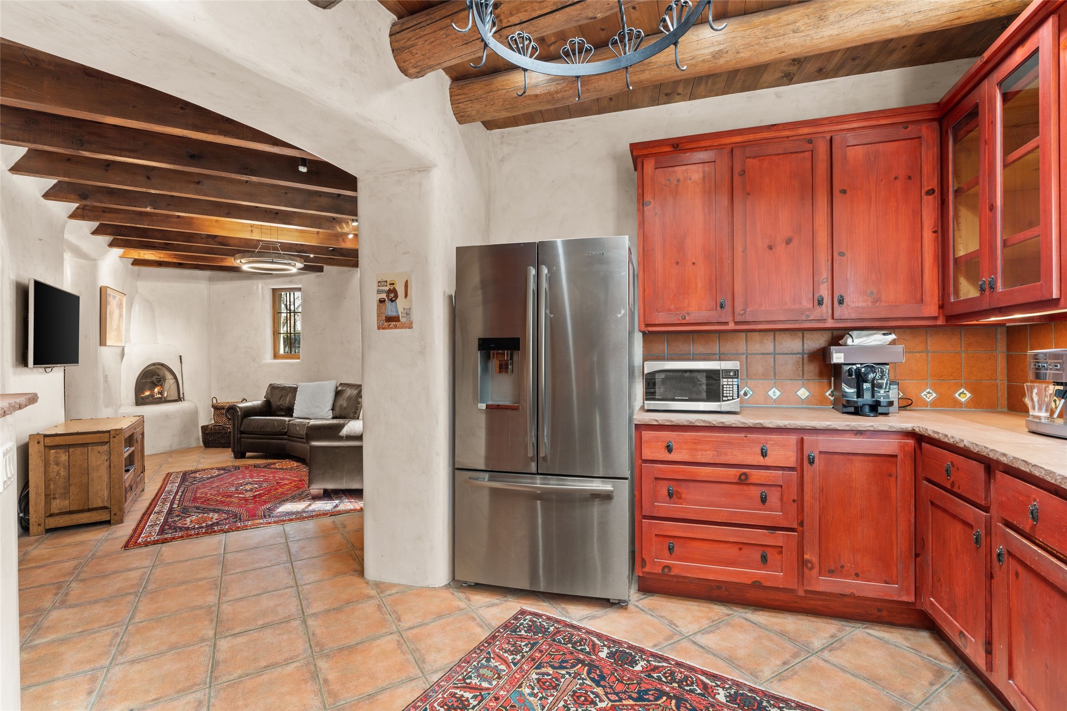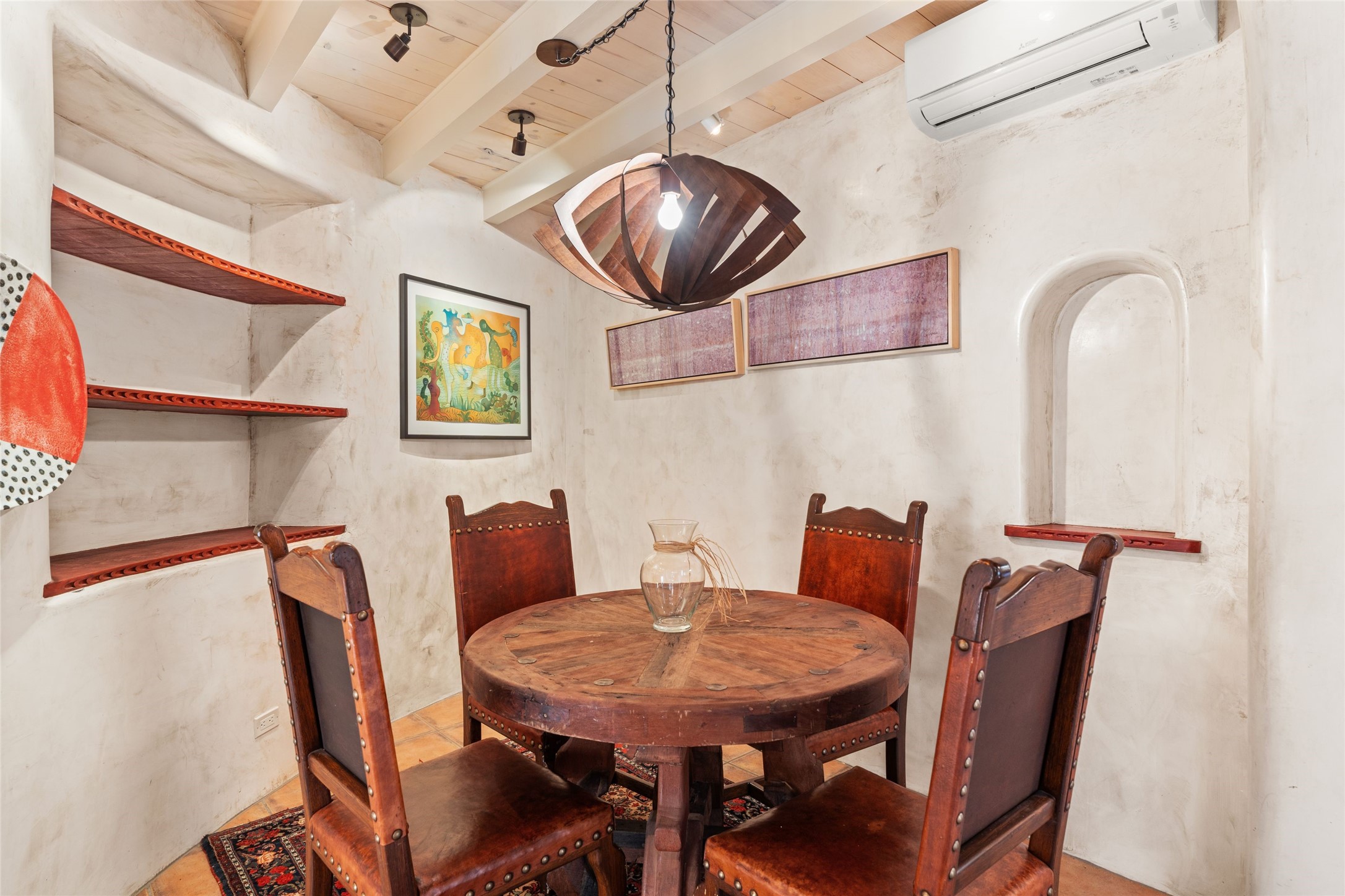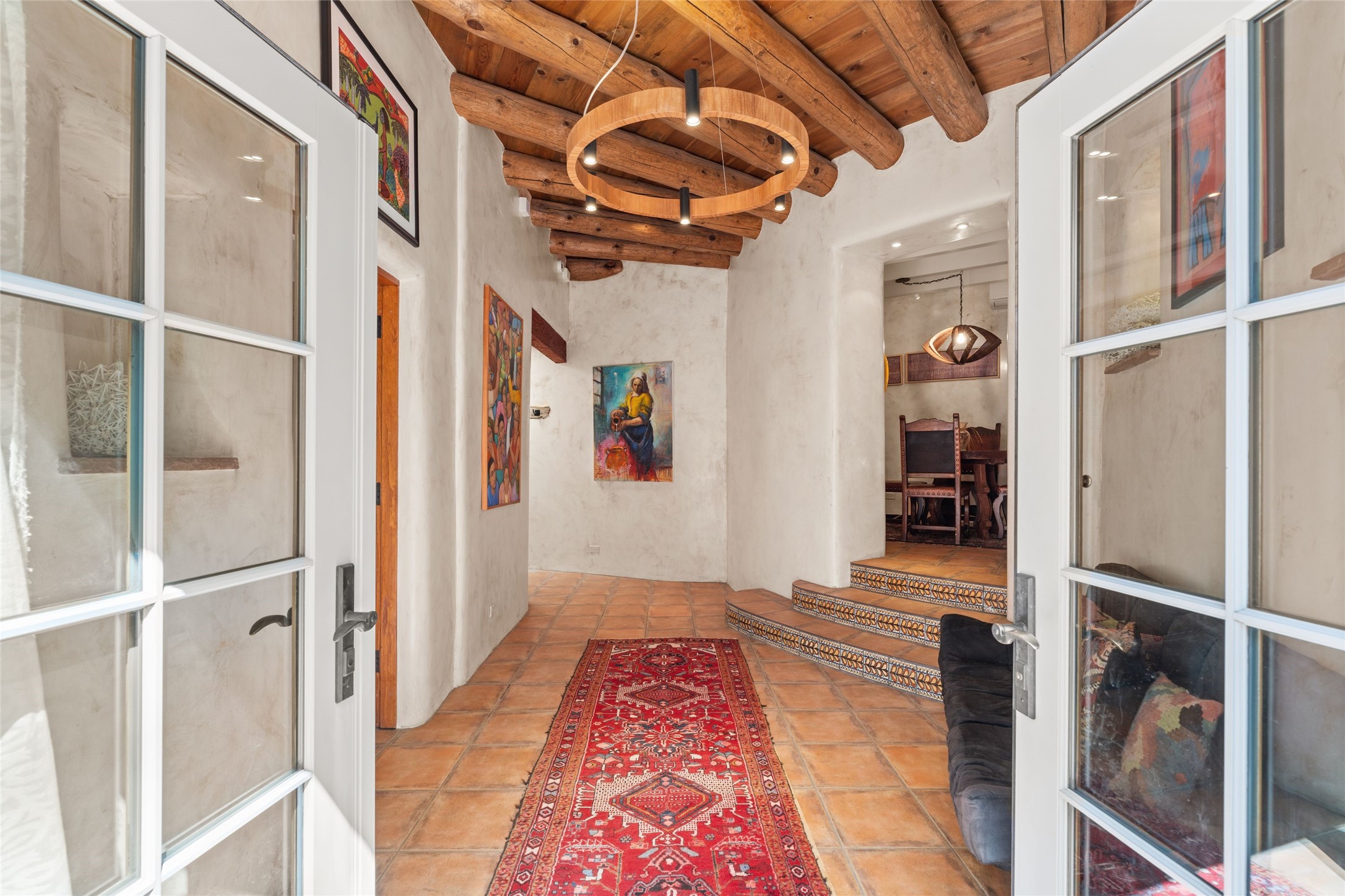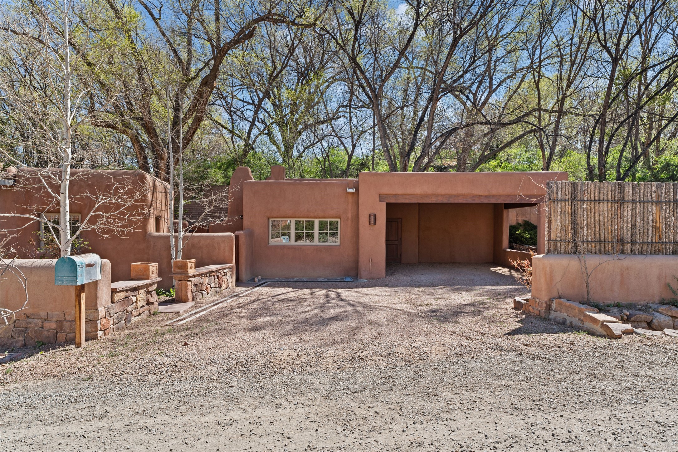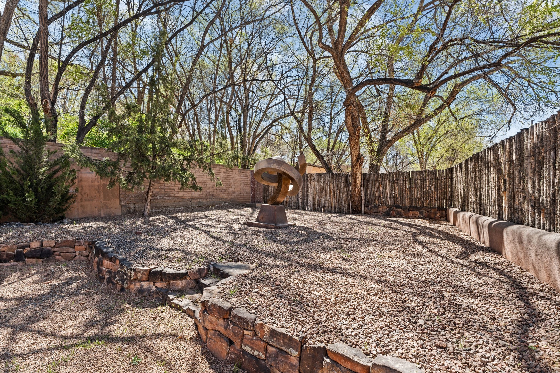 This historic home, El Torreon, was built by the artist Frank Applegate in 1927 to be his personal studio. It is an easy walk to Canyon Road, the Plaza and not far from Museum Hill. Extensively remodeled, this 3-bedroom historic treasure comes turnkey with all the furnishings included, except for the art. The main bedroom is downstairs with hand adzed beams, plaster walls, carved doors, walk in closet and lovely ensuite bath with jacuzzi tub, dual sinks and walk in shower. There is good separation with the other bedrooms - one being on the other side of the house, and the 3rd bedroom upstairs in the round torre, which enjoys great light, vigas, fireplace and served as Applegate's studio back in the day. The fabulous kitchen with new cabinets, sandstone counters, newer fridge and dishwasher and a gas Viking range, is the heart of the home and open to the dining and living room, which also enjoys a fireplace and pretty plaster walls. The new studio/office was created from the old garage and has a separate entry, corner kiva fireplace, coved ceilings and a power room. A covered parking portal was added for covered off street parking! With lovely flagstone patios surrounding El Torreon, there is a cozy seating area adjacent to the separate studio by the outside kiva fireplace, a quiet patio for dining at the side of the house and a hot tub for star gazing on clear nights from your fully enclosed outdoor patio. There is radiant heat, 3 mini splits for cooling and added heat as well as a 3-year-old tankless for the hot water and radiant heat. Come and live your Santa Fe sueno in an authentic piece of history in the heart of the Eastside!