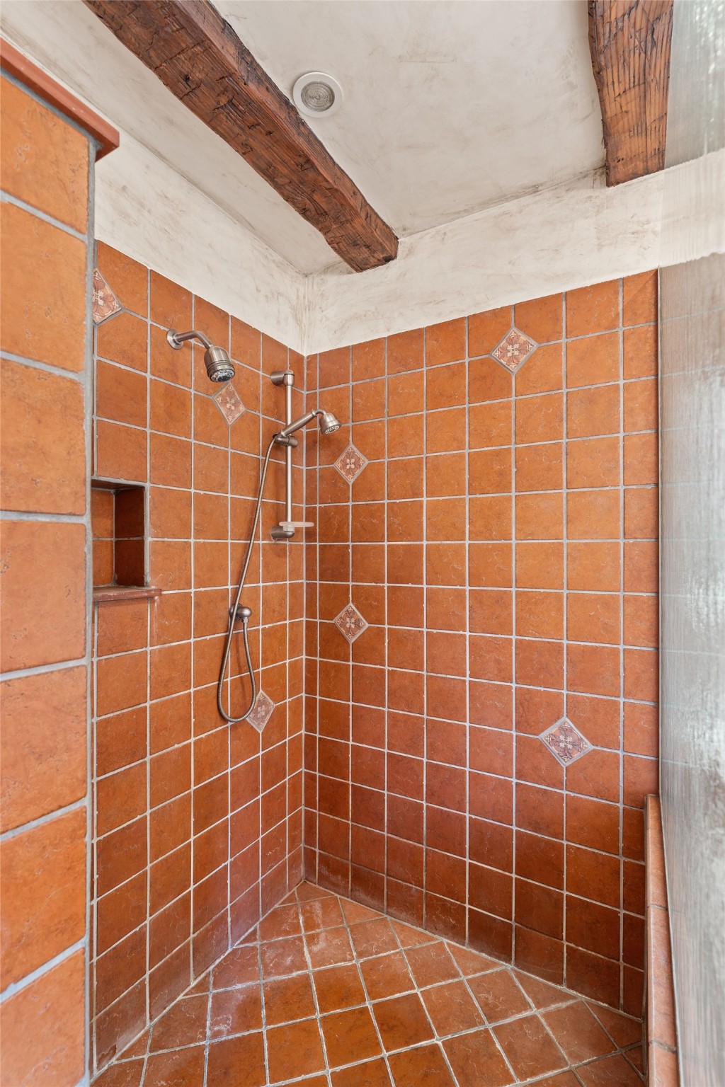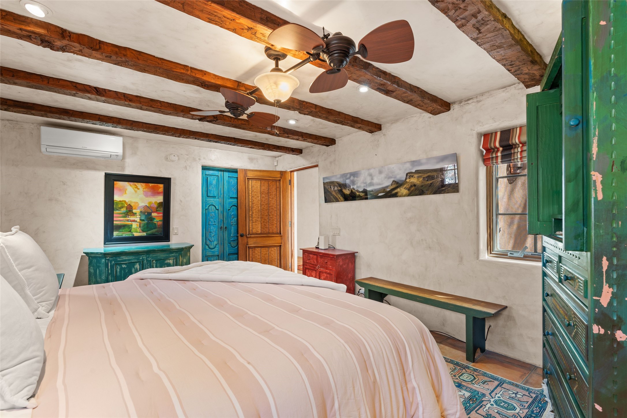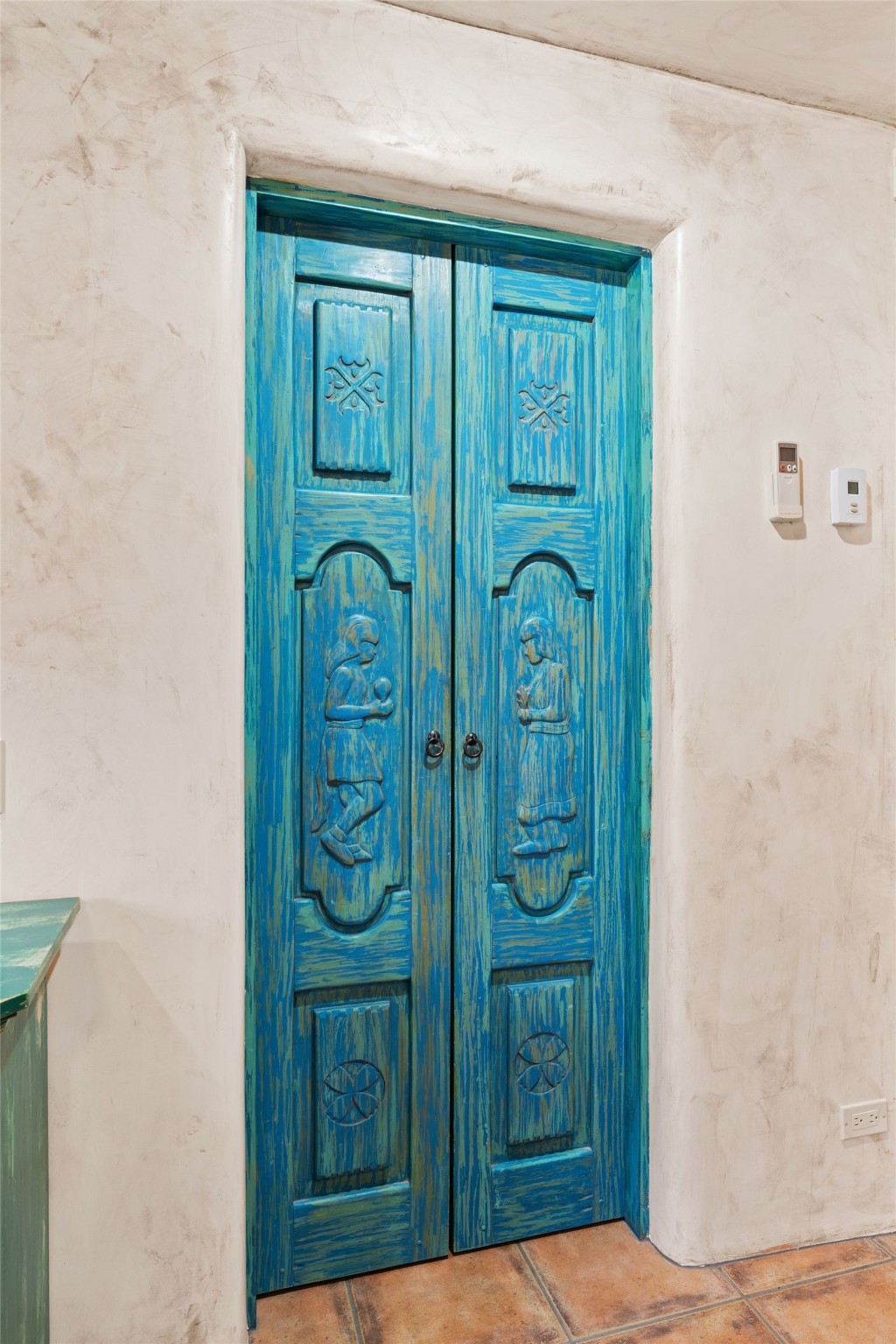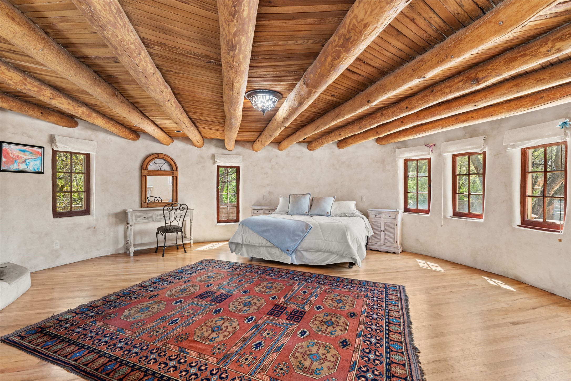 This historic home, El Torreon, was built by the artist Frank Applegate in 1927 to be his personal studio. It is an easy walk to Canyon Road, the Plaza and not far from Museum Hill. Extensively remodeled, this 3-bedroom historic treasure comes turnkey with all the furnishings included, except for the art. The main bedroom is downstairs with hand adzed beams, plaster walls, carved doors, walk in closet and lovely ensuite bath with jacuzzi tub, dual sinks and walk in shower. There is good separation with the other bedrooms - one being on the other side of the house, and the 3rd bedroom upstairs in the round torre, which enjoys great light, vigas, fireplace and served as Applegate's studio back in the day. The fabulous kitchen with new cabinets, sandstone counters, newer fridge and dishwasher and a gas Viking range, is the heart of the home and open to the dining and living room, which also enjoys a fireplace and pretty plaster walls. The new studio/office was created from the old garage and has a separate entry, corner kiva fireplace, coved ceilings and a power room. A covered parking portal was added for covered off street parking! With lovely flagstone patios surrounding El Torreon, there is a cozy seating area adjacent to the separate studio by the outside kiva fireplace, a quiet patio for dining at the side of the house and a hot tub for star gazing on clear nights from your fully enclosed outdoor patio. There is radiant heat, 3 mini splits for cooling and added heat as well as a 3-year-old tankless for the hot water and radiant heat. Come and live your Santa Fe sueno in an authentic piece of history in the heart of the Eastside!