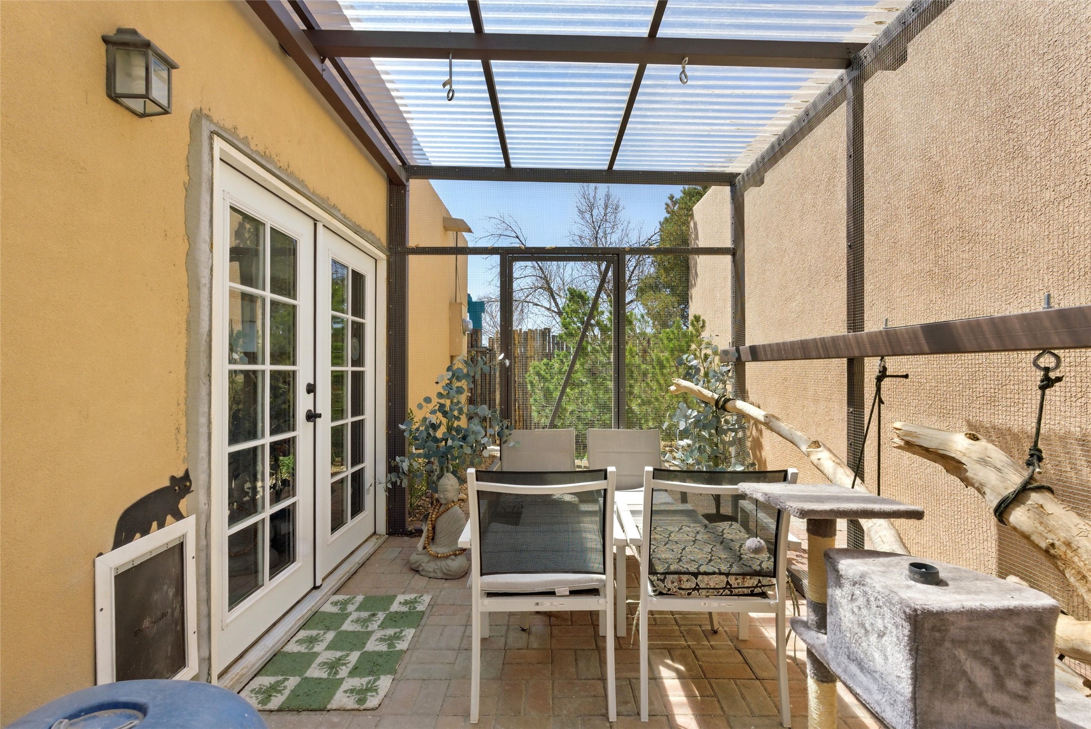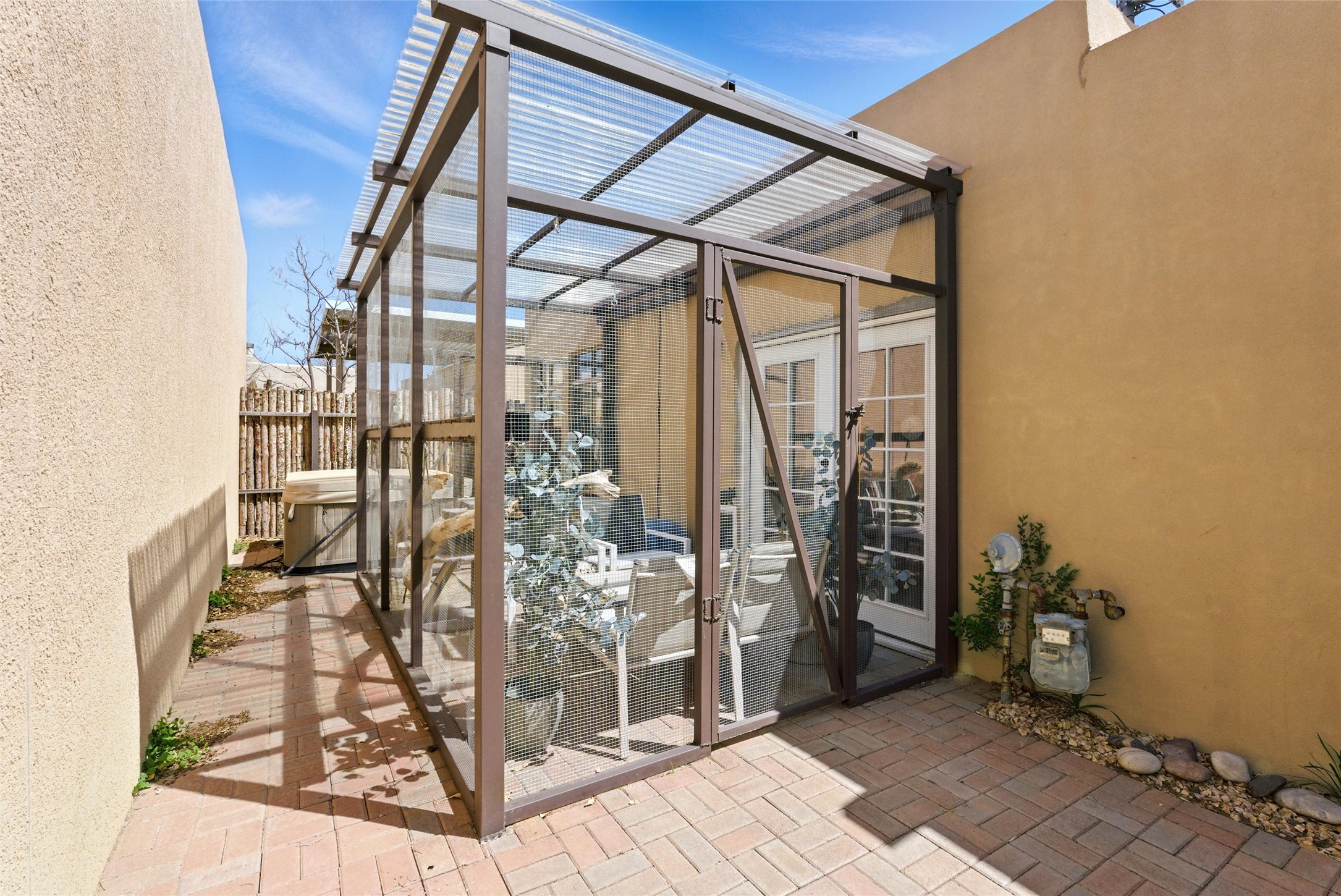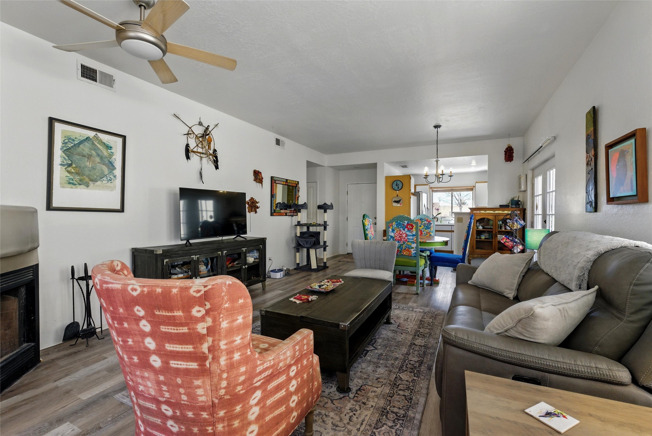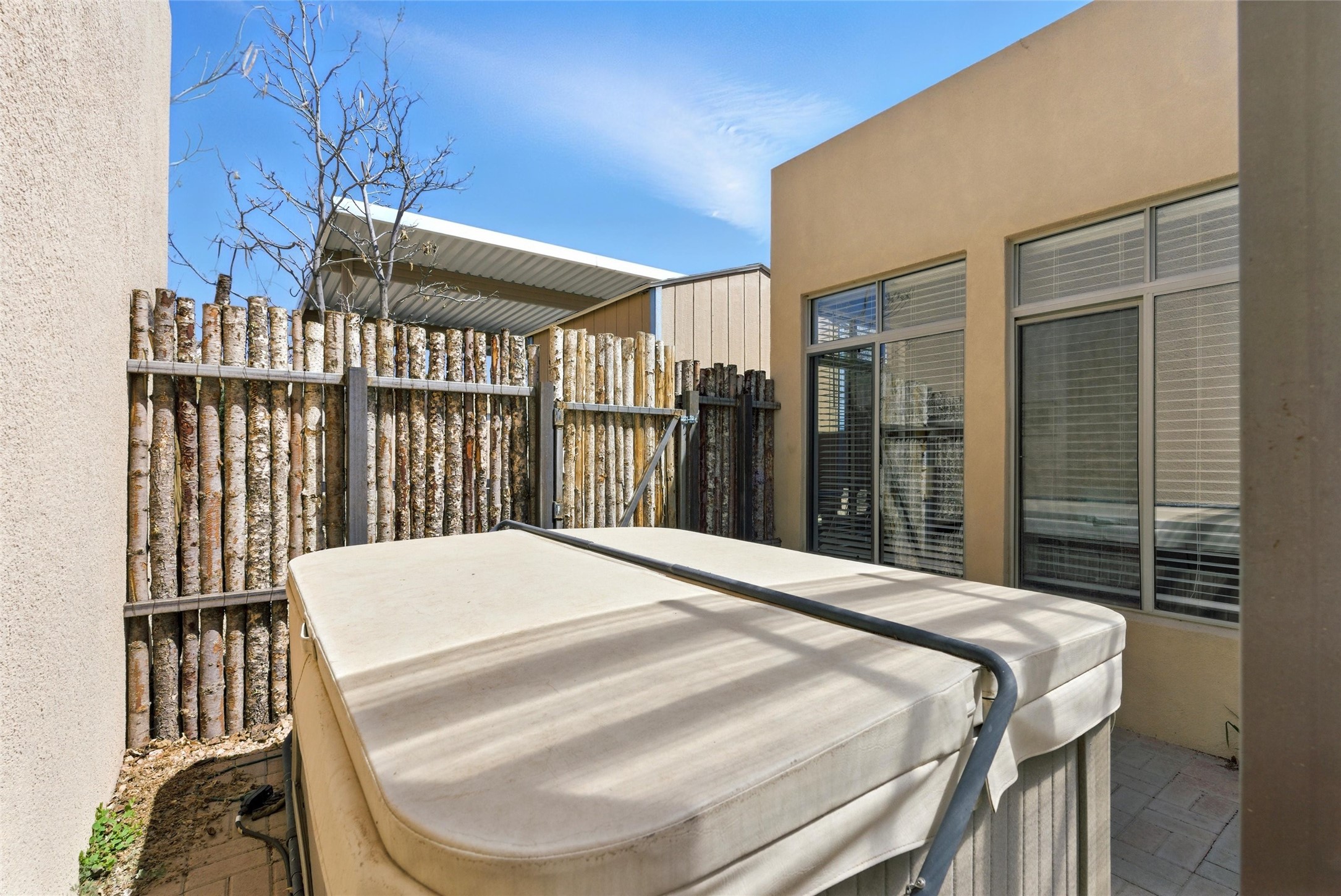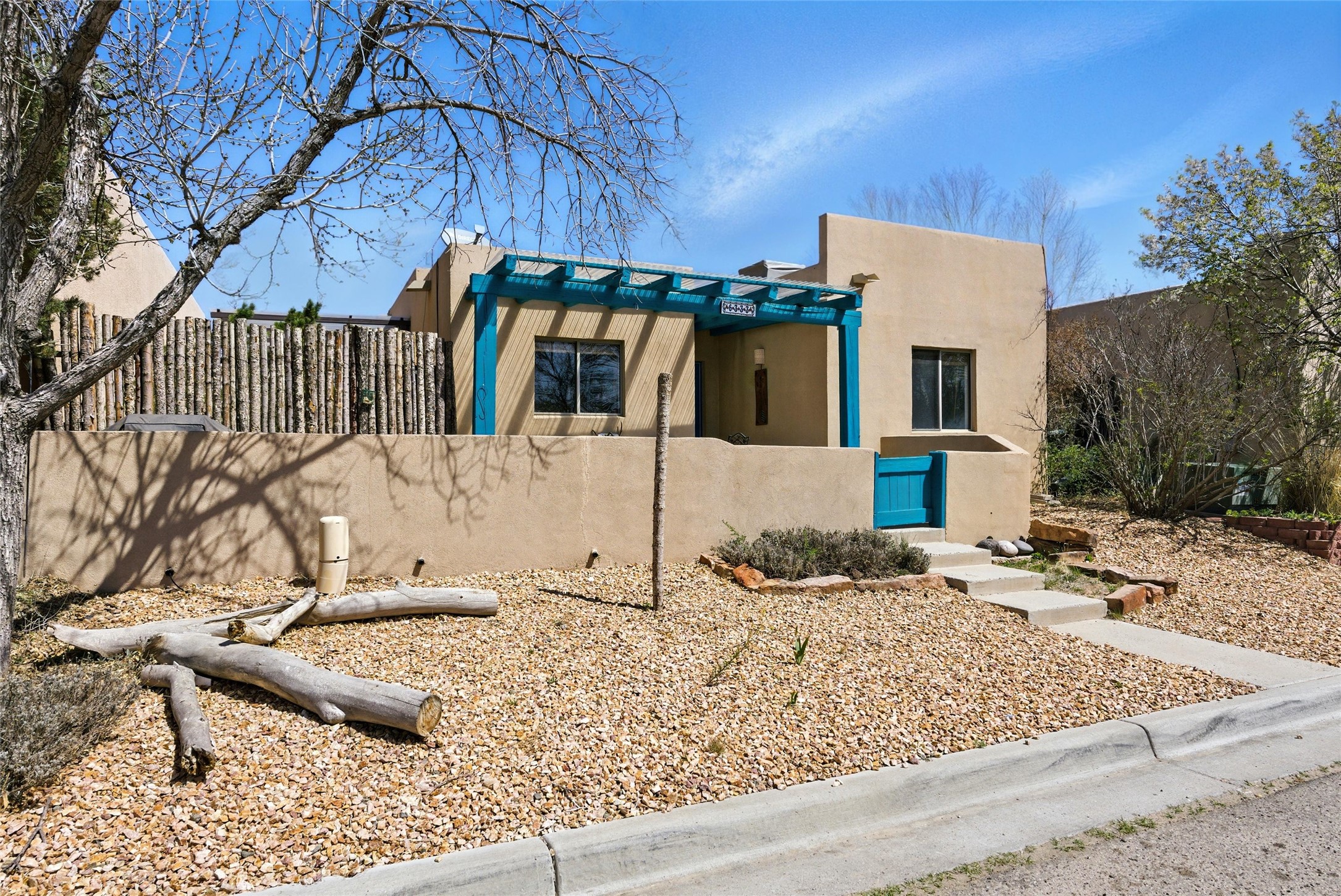 Charming 2-bed, 2-bath Pueblo-style home in the peaceful Los Milagros community. Features an open floor plan, Kiva fireplace, mountain views, landscaped yard, courtyard, and carport with storage. Located on a quiet cul-de-sac near shopping, schools, and the airport. Built in 1996, the home offers forced air heating, evaporative cooling, and a flat roof with classic Santa Fe stucco charm--perfect for low-maintenance living in a serene setting. This house is ideal for a family or investors alike.
