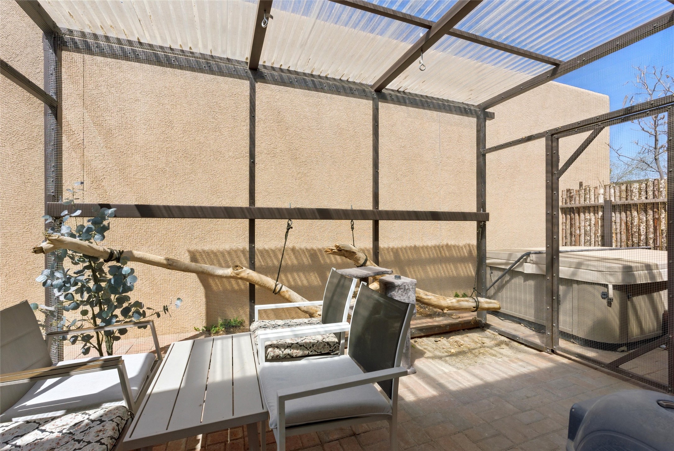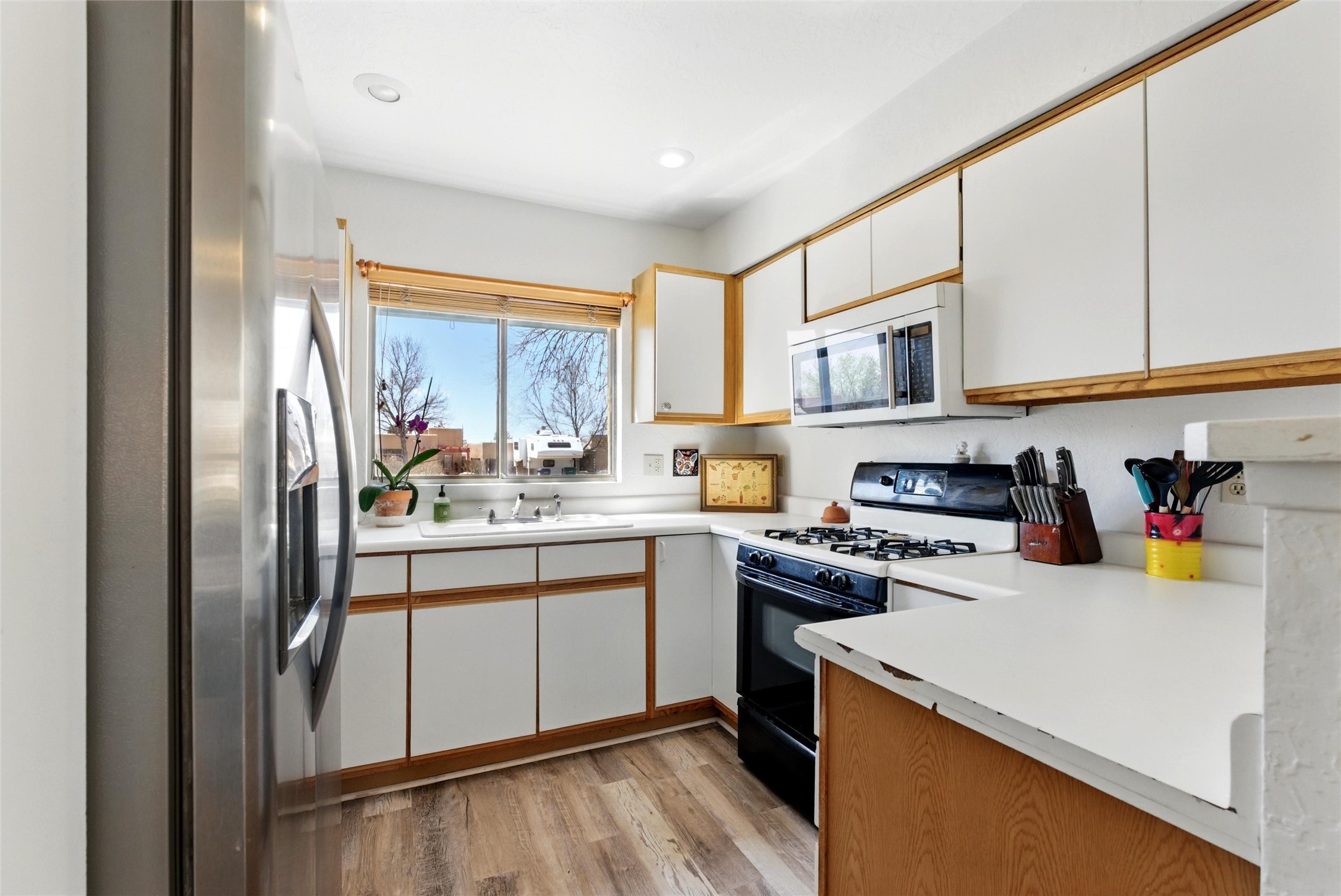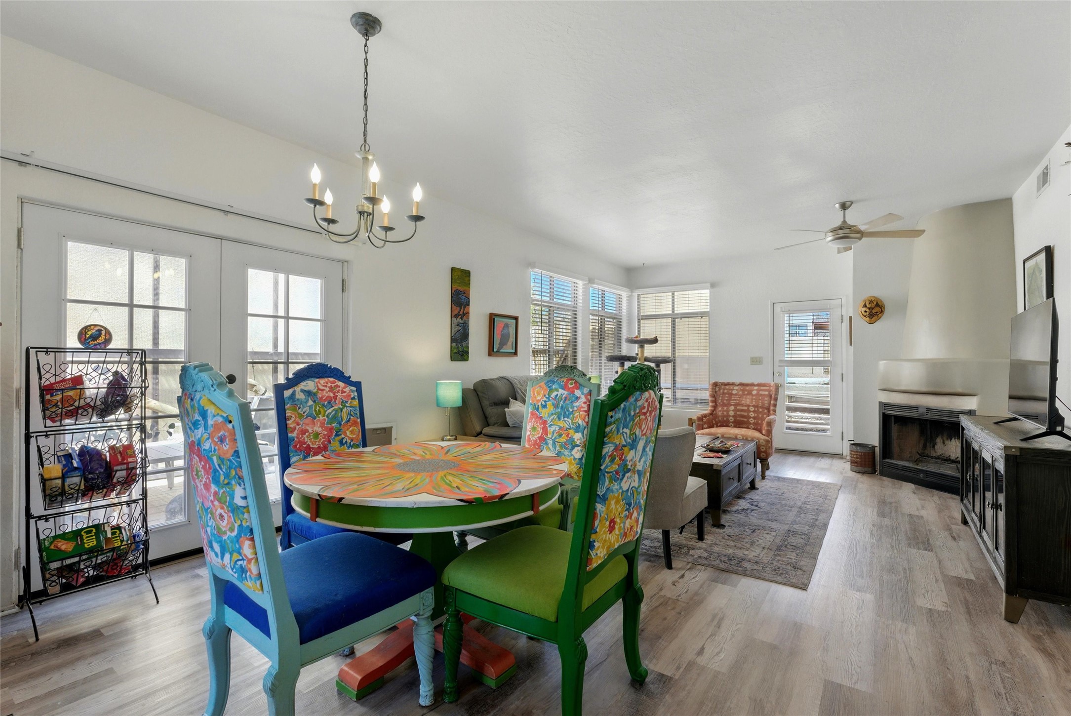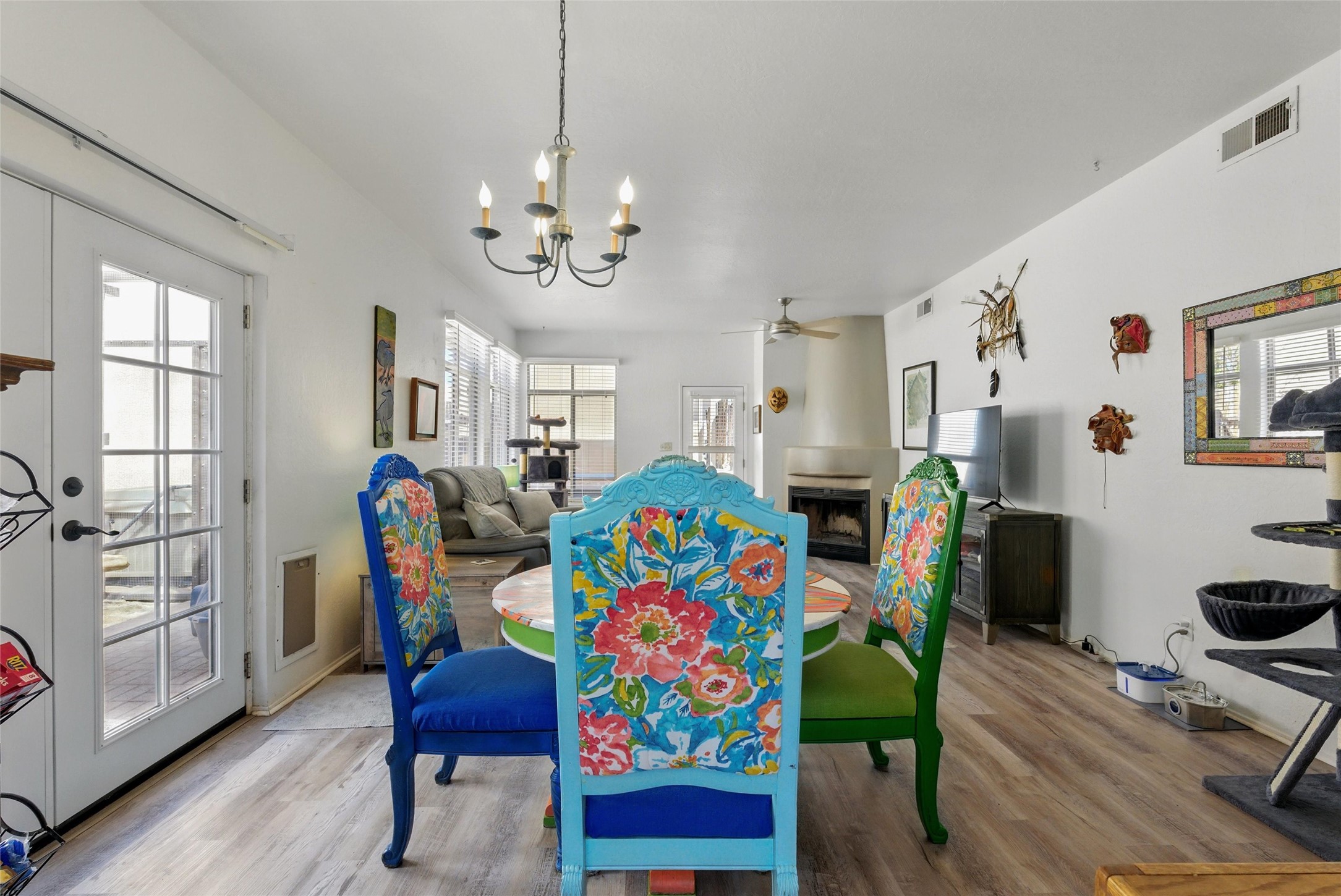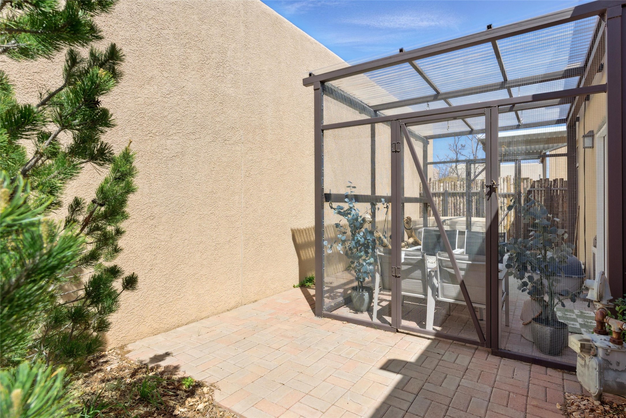 Charming 2-bed, 2-bath Pueblo-style home in the peaceful Los Milagros community. Features an open floor plan, Kiva fireplace, mountain views, landscaped yard, courtyard, and carport with storage. Located on a quiet cul-de-sac near shopping, schools, and the airport. Built in 1996, the home offers forced air heating, evaporative cooling, and a flat roof with classic Santa Fe stucco charm--perfect for low-maintenance living in a serene setting. This house is ideal for a family or investors alike.