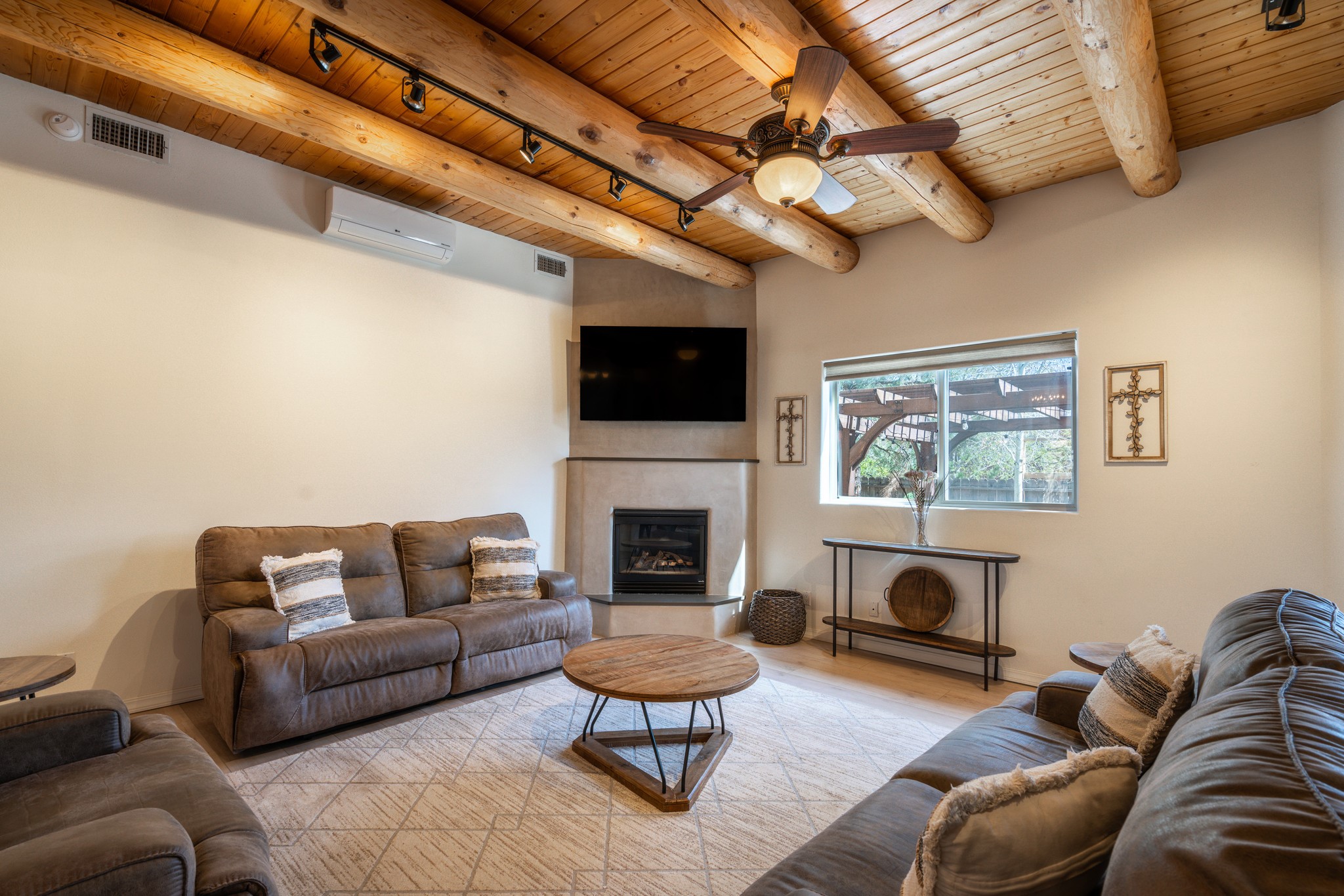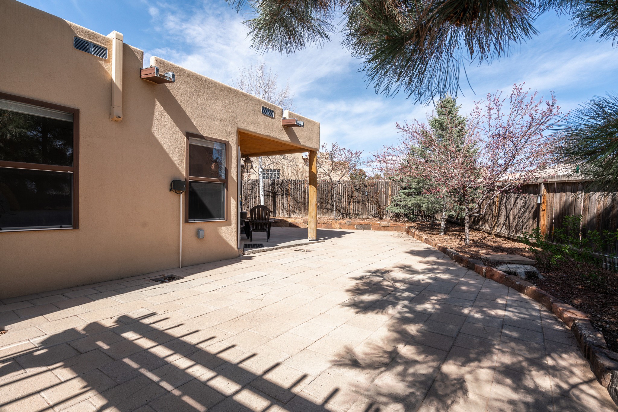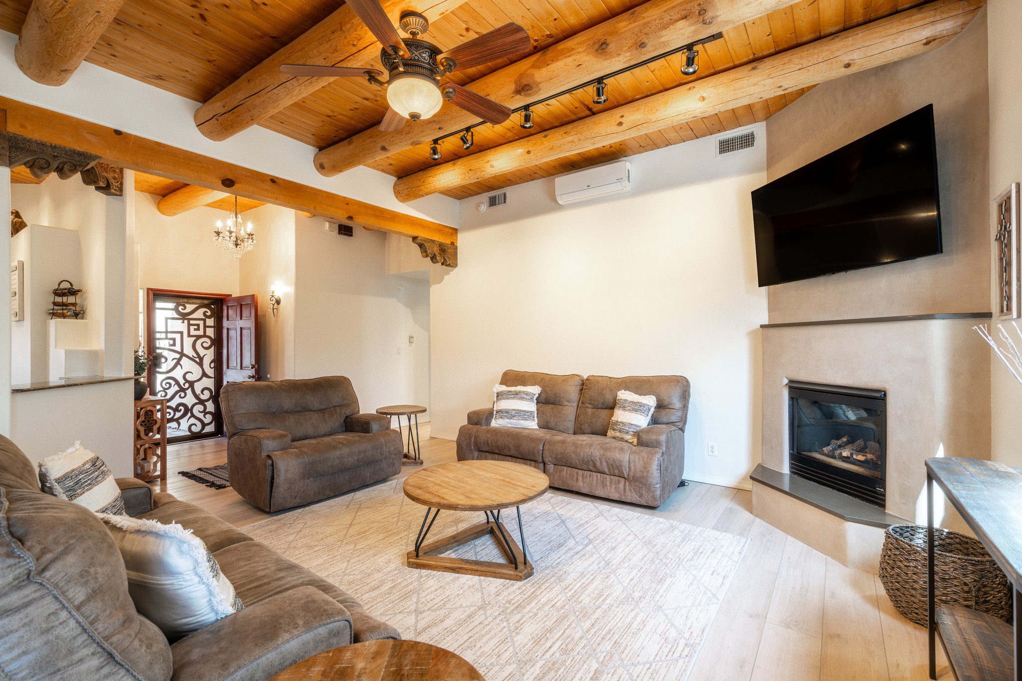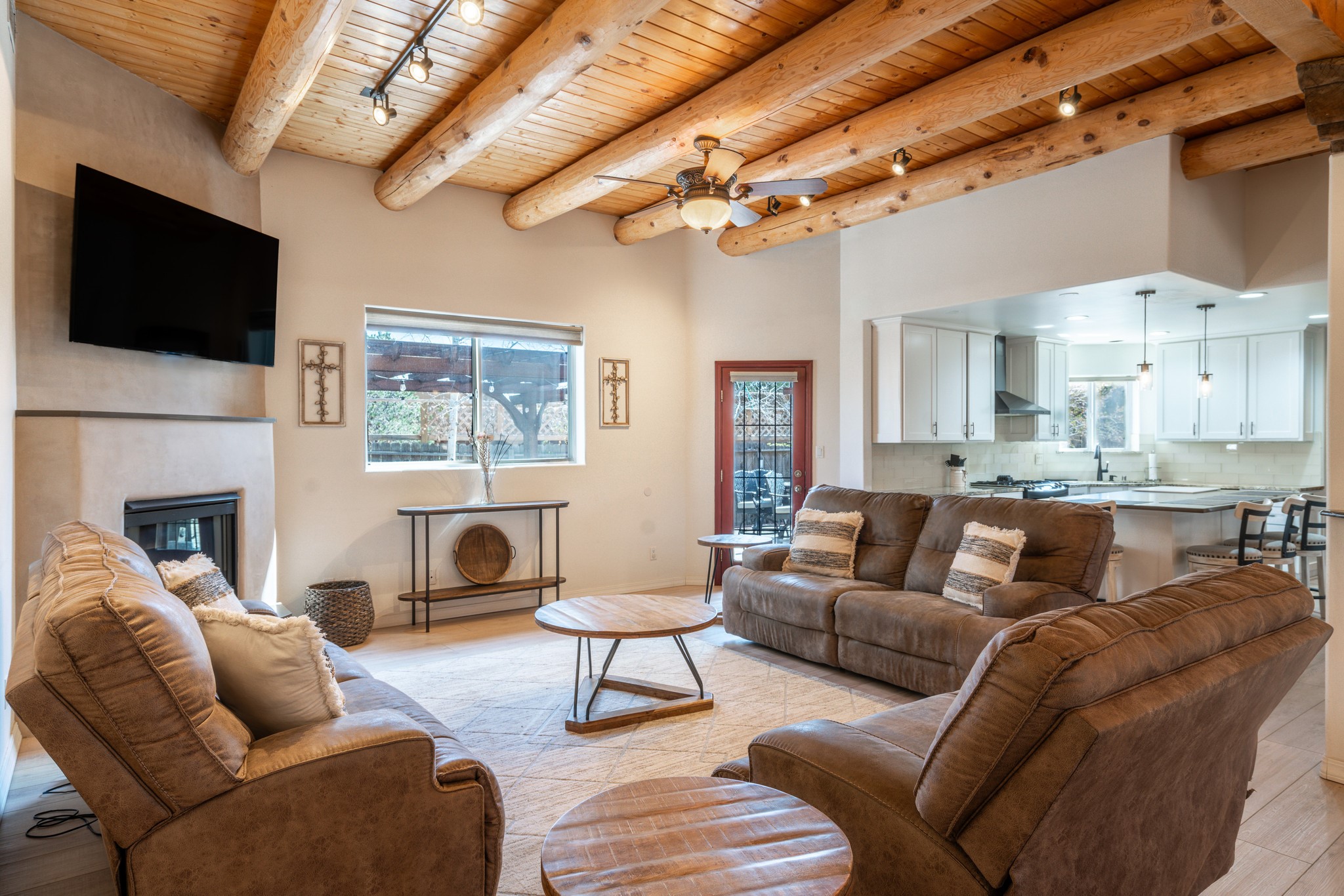 Step into comfort and style with this northern New Mexico gem, tucked away in a quiet cul-de-sac. Enjoy a brand-new kitchen, fresh paint throughout, new flooring, and radiant floor heating for cozy living year-round. Charming vigas accent the ceilings, adding a warm, rustic touch. Every room features new mini splits and dimmable recessed lighting. The main roof was replaced in 2020, and the exterior shines with updated stucco. Bonus: multiple peach and apple trees in the yard add a sweet touch of nature!