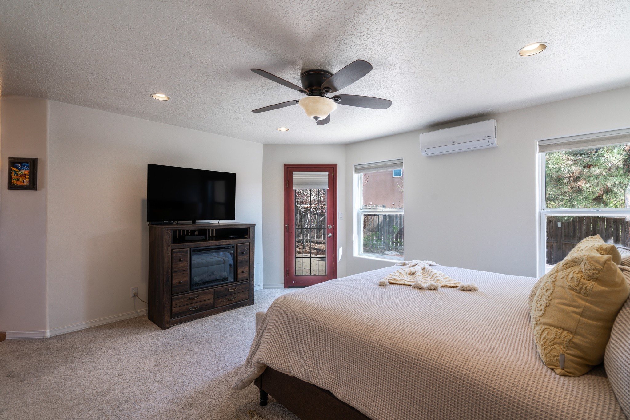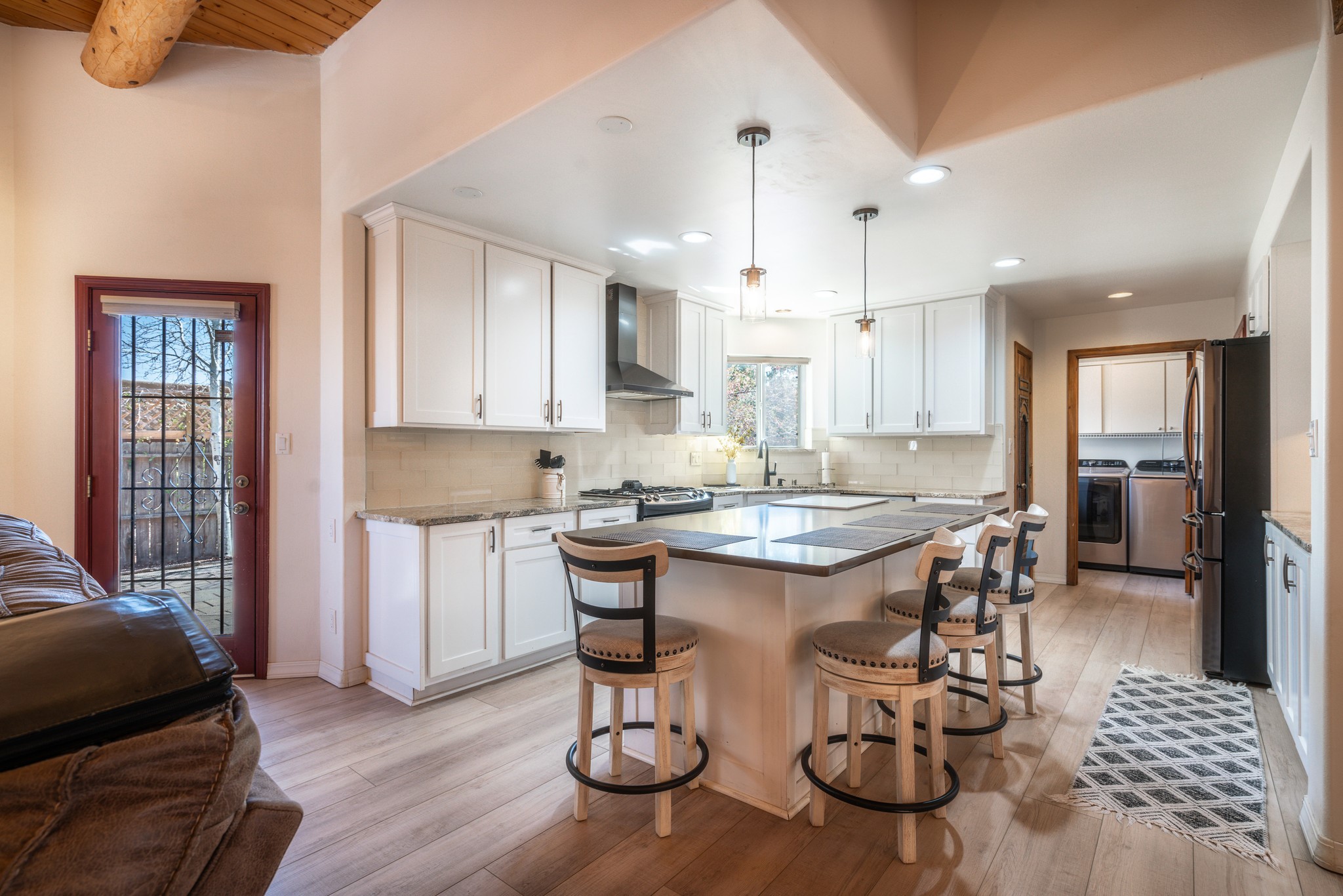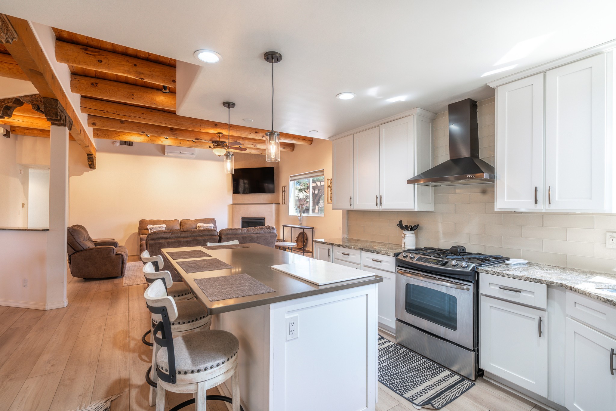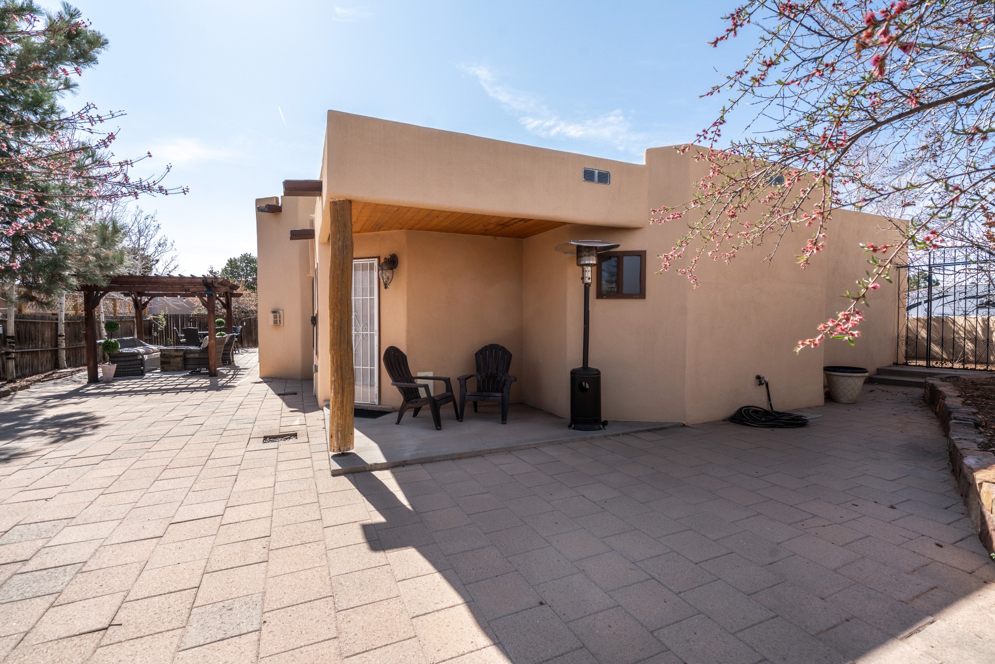Step into comfort and style with this northern New Mexico gem, tucked away in a quiet cul-de-sac. Enjoy a brand-new kitchen, fresh paint throughout, new flooring, and radiant floor heating for cozy living year-round. Charming vigas accent the ceilings, adding a warm, rustic touch. Every room features new mini splits and dimmable recessed lighting. The main roof was replaced in 2020, and the exterior shines with updated stucco. Bonus: multiple peach and apple trees in the yard add a sweet touch of nature!