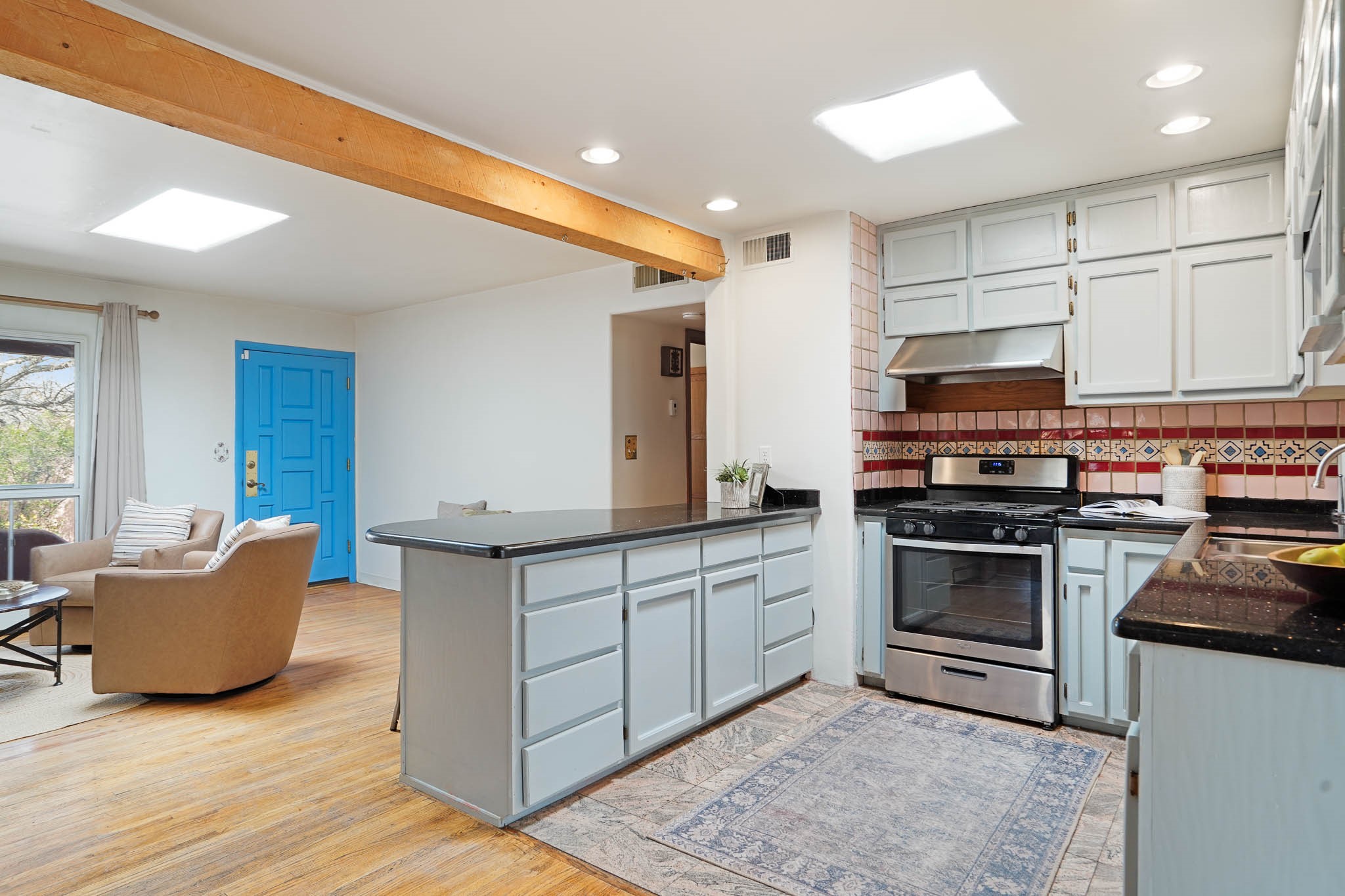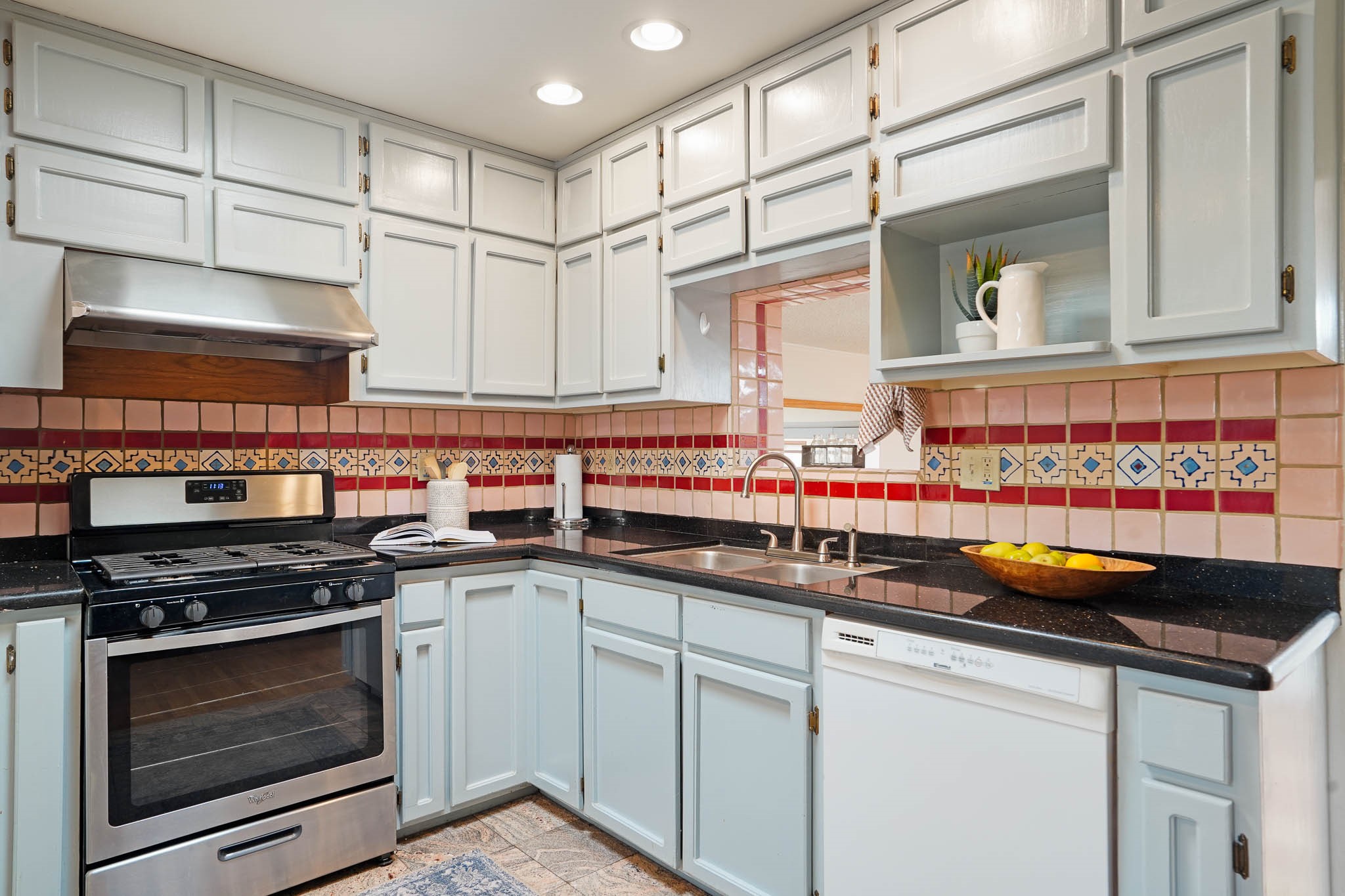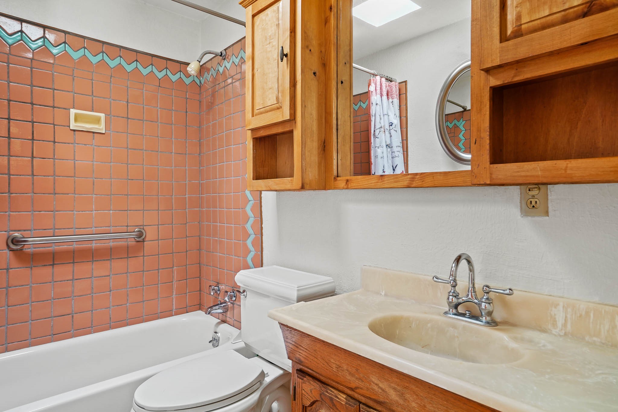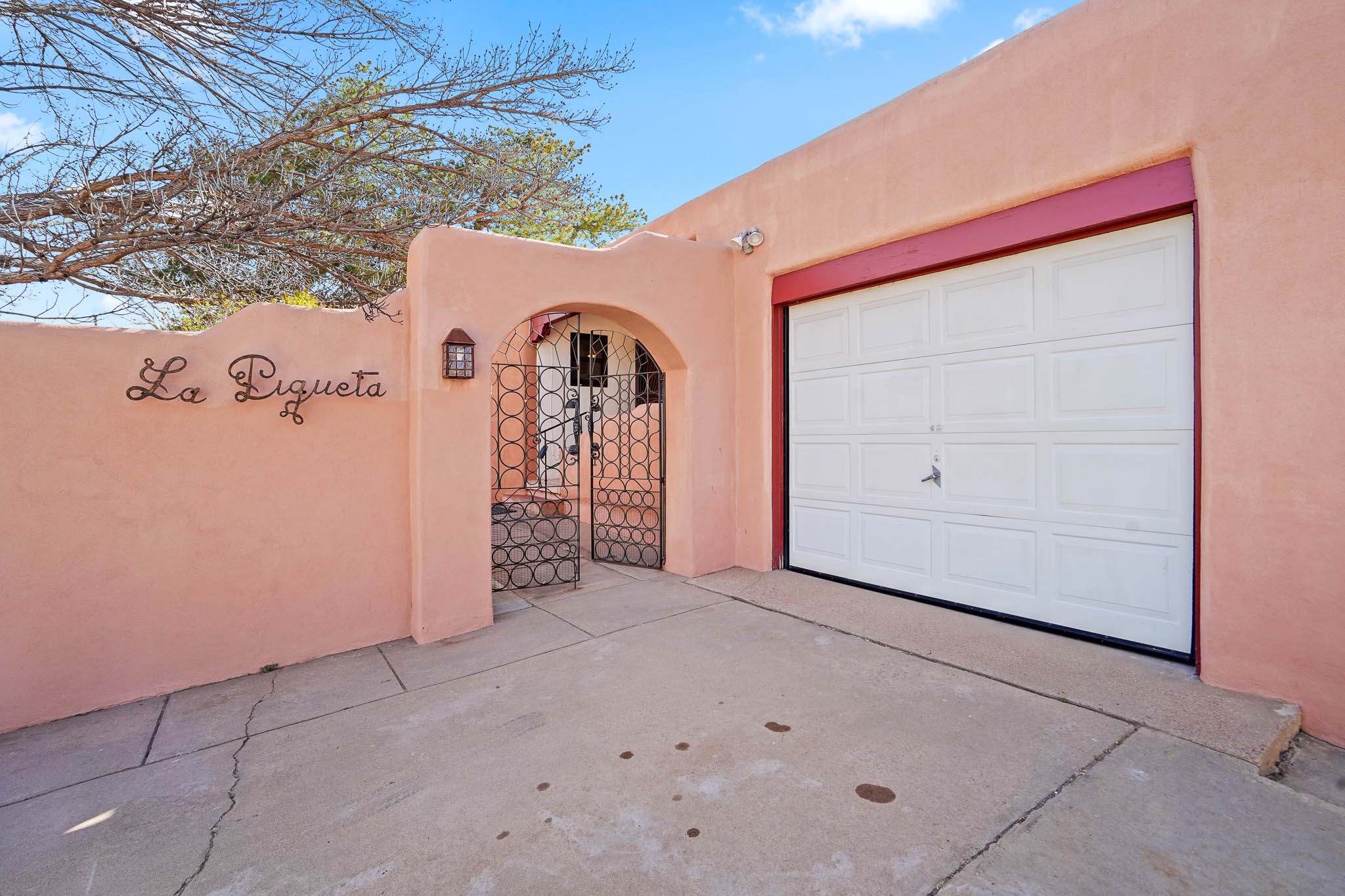 This residence is an exceptionally good value for the ever popular Casa Solana area. New roof 2025!! Additions over the years include a great room with fireplace insert, dining room, master bedroom and bath, additional bathroom and utility room. The back portal was enclosed and features coved ceilings, windows, heating and access to the back yard. This diverse space makes a wonderful summer room, kids space or additional space for guests. The original wood flooring is featured in the original part of the home and the front living area has the corner kiva fireplace these homes are known for. The front and back yards are walled for privacy and both have water features. Sunrises and good views of the Sangre de Cristo Mountains can be enjoyed from the back yard. Aside from the one car garage, the property features 3 distinct areas for storage, two being larger and perfect for sports and yard equipment and seasonal storage.
