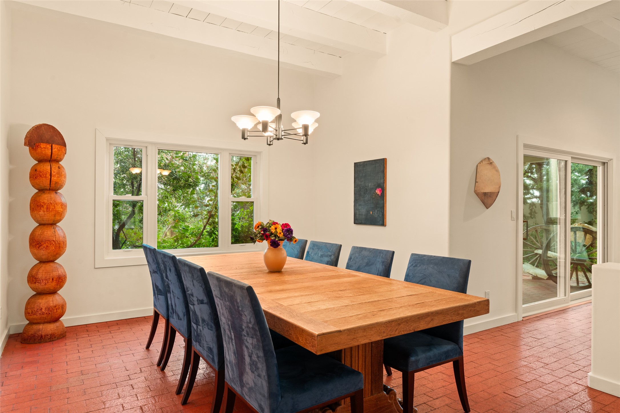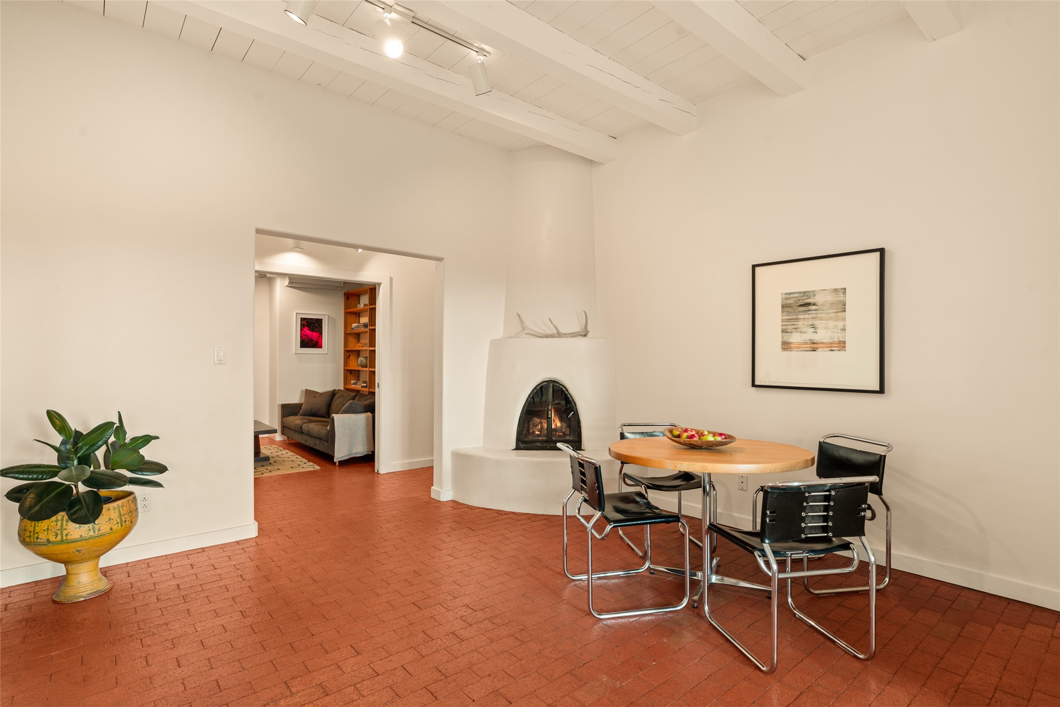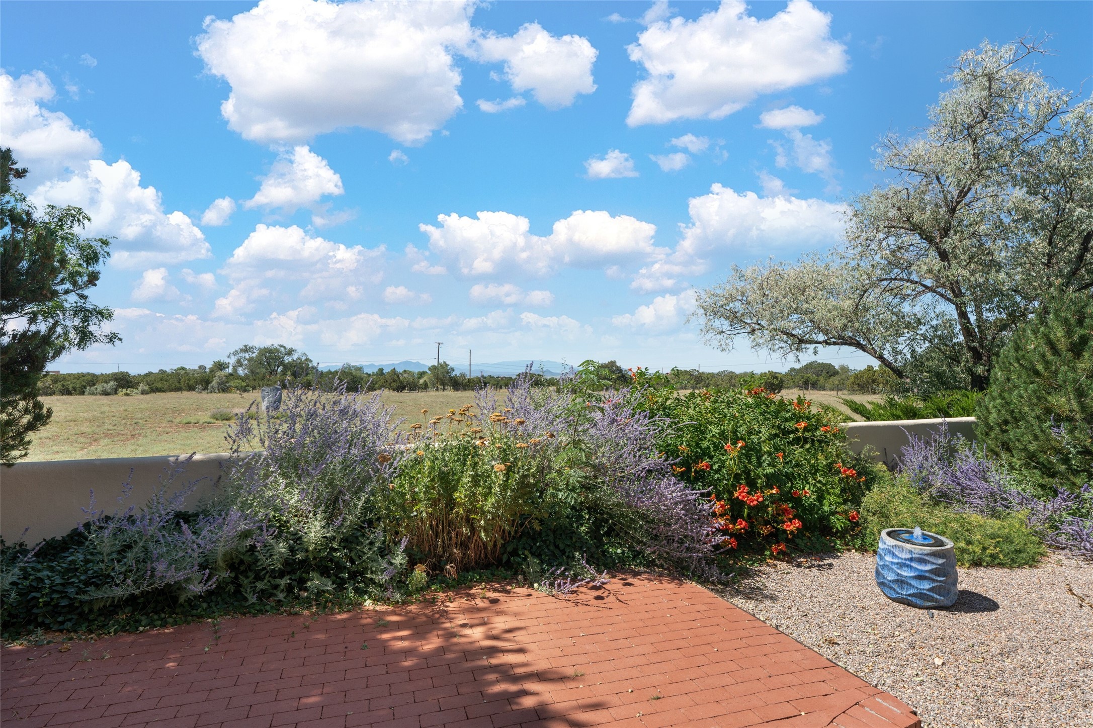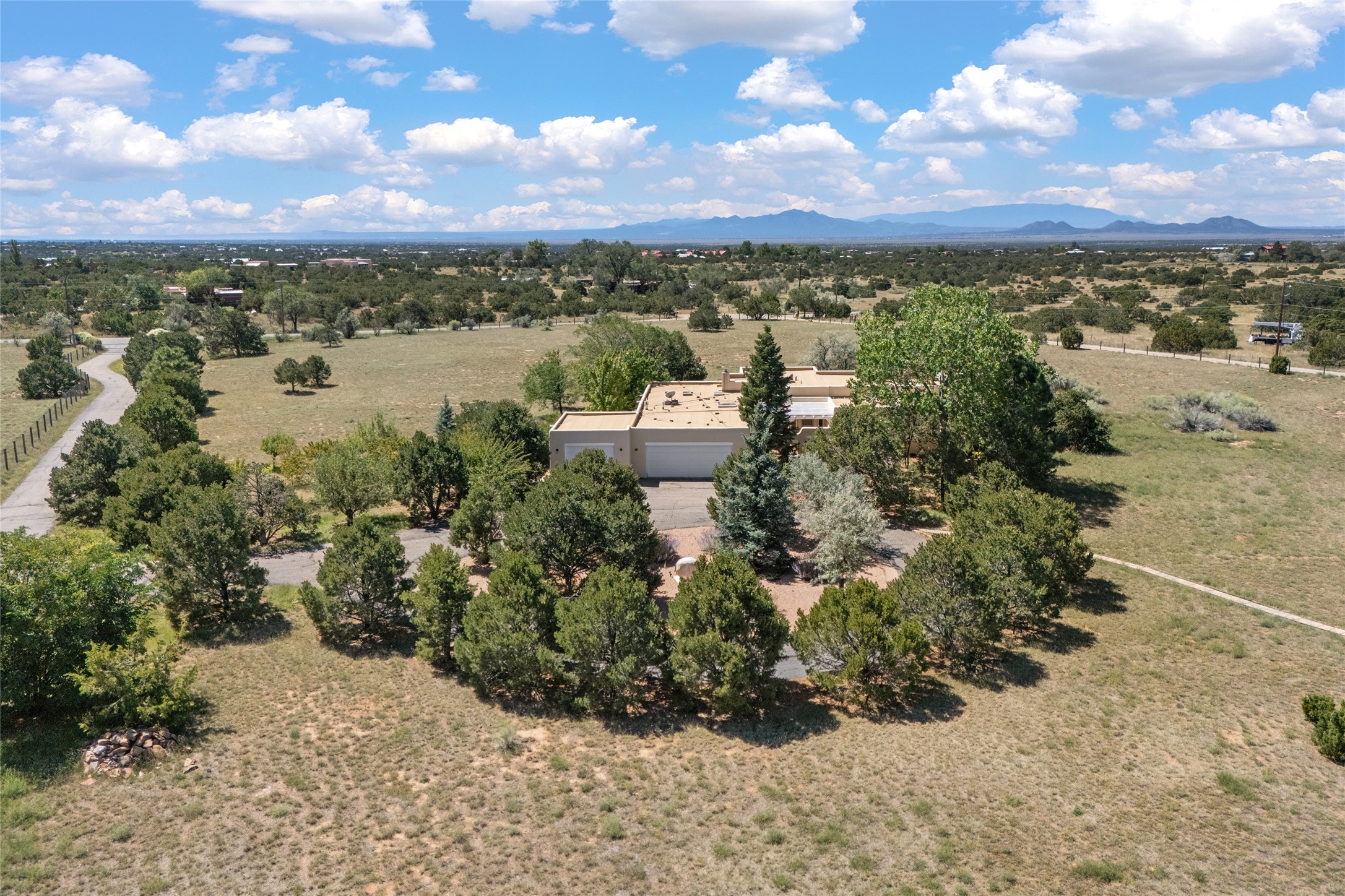 This timeless and sophisticated property is situated in a quiet and horse-friendly Santa Fe location just a short distance from the Arroyo Hondo Open Space trails and the famed Harry's Roadhouse restaurant. This 2,956 sq.ft. single-story constructed home has recently been completely updated and exudes a classic Santa Fe style surrounded by 6.041 acres of fenced, gated and usable land with wraparound views of the Sangre, Ortiz and Jemez mountains. Private sitting and entertaining spaces surround the home with lush, seasonal and mature landscaping, including fruit trees in the orchard. The home consists of a primary ensuite, two secondary bedrooms, 2.5 baths, and a separate office or flex room, all with classic bricked floors and whitewashed vigas throughout. The formal living/dining area's focal point is a gas burning fireplace. The updated kitchen features a large island, quartz countertops, walk-in pantry storage, and a sweet kiva fireplace with access to the covered patio. Functional amenities include radiant floor heat, on-demand hot water and mini-split AC/heating in the owners suite and office. A studio/workshop/3rd bay garage is adjacent to the deep 2-car attached garage. A nearby concrete pad has electricity stubbed-in, ideal for a future barn or casita. Completely updated (including roof, stucco, windows, mechanicals, and a new gas stove in the island) and perfectly maintained, this is a property not to be missed in an idyllic Santa Fe location.