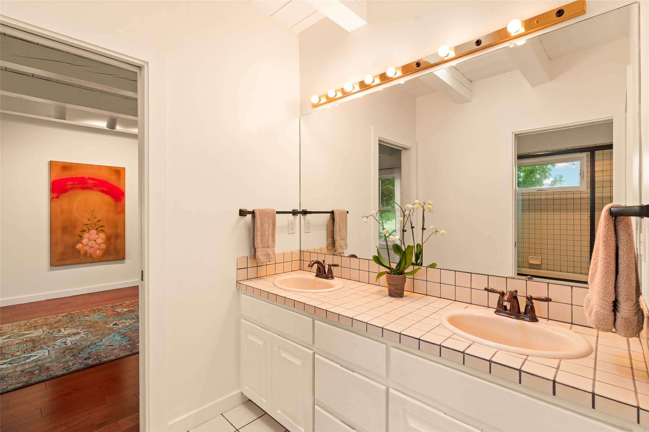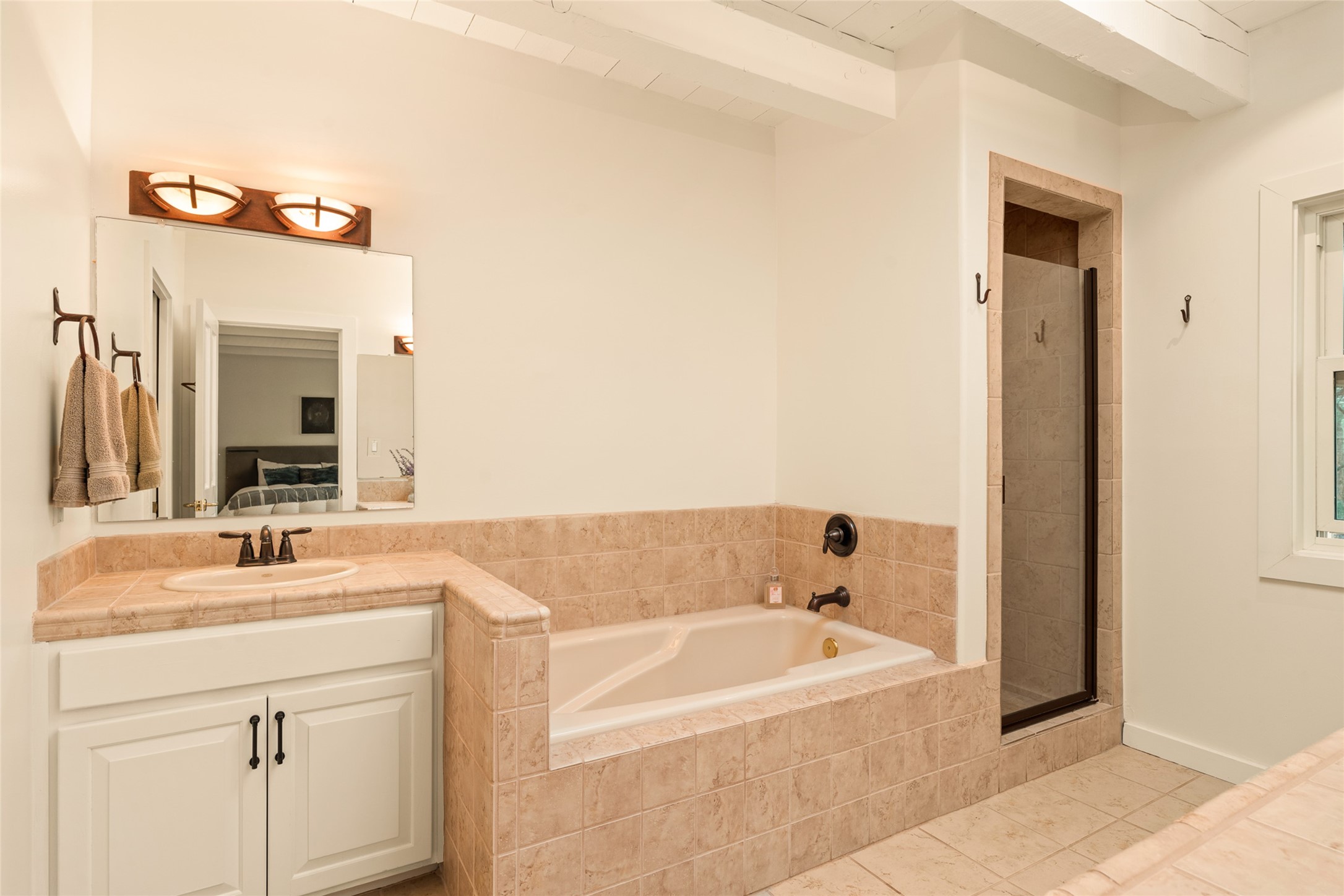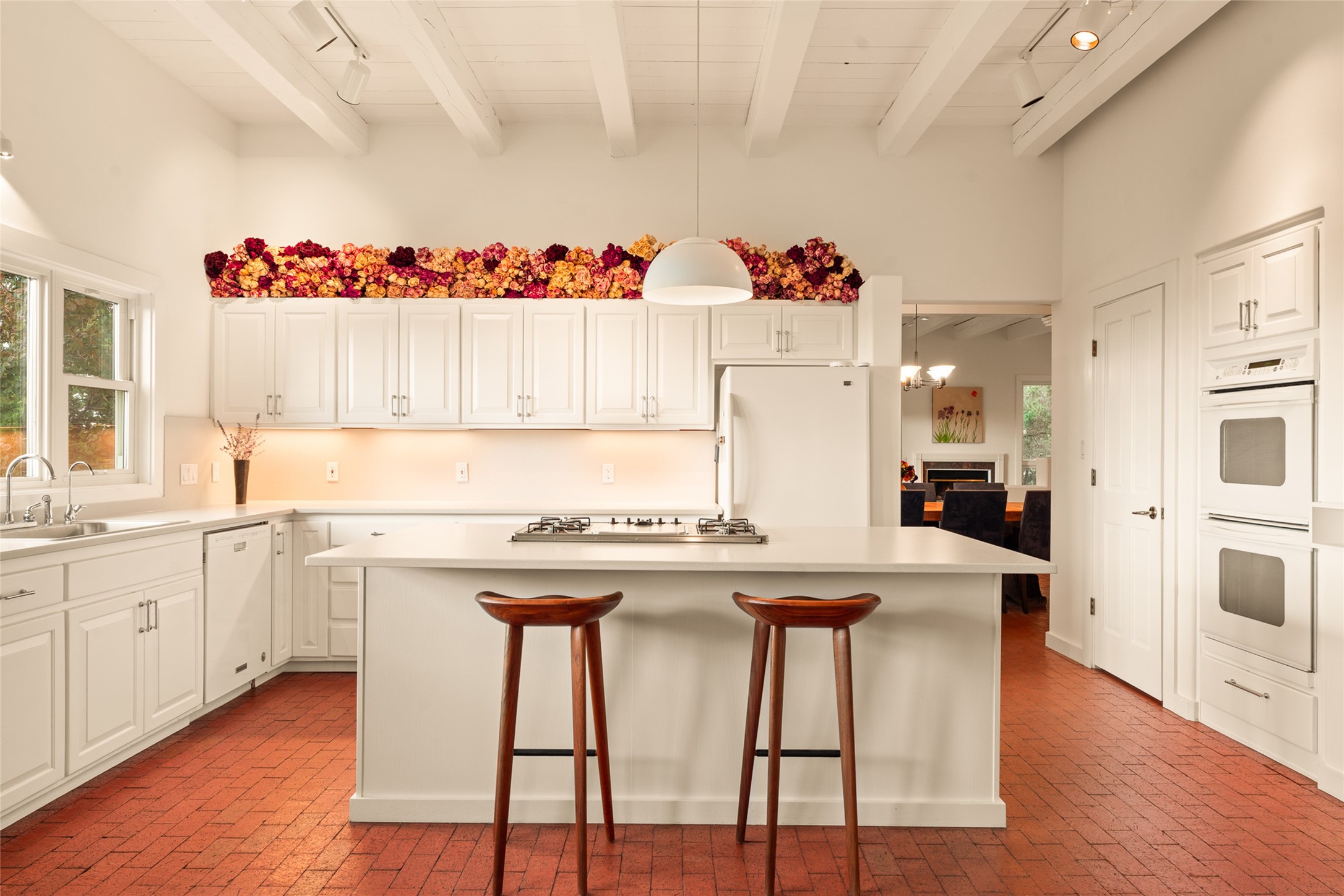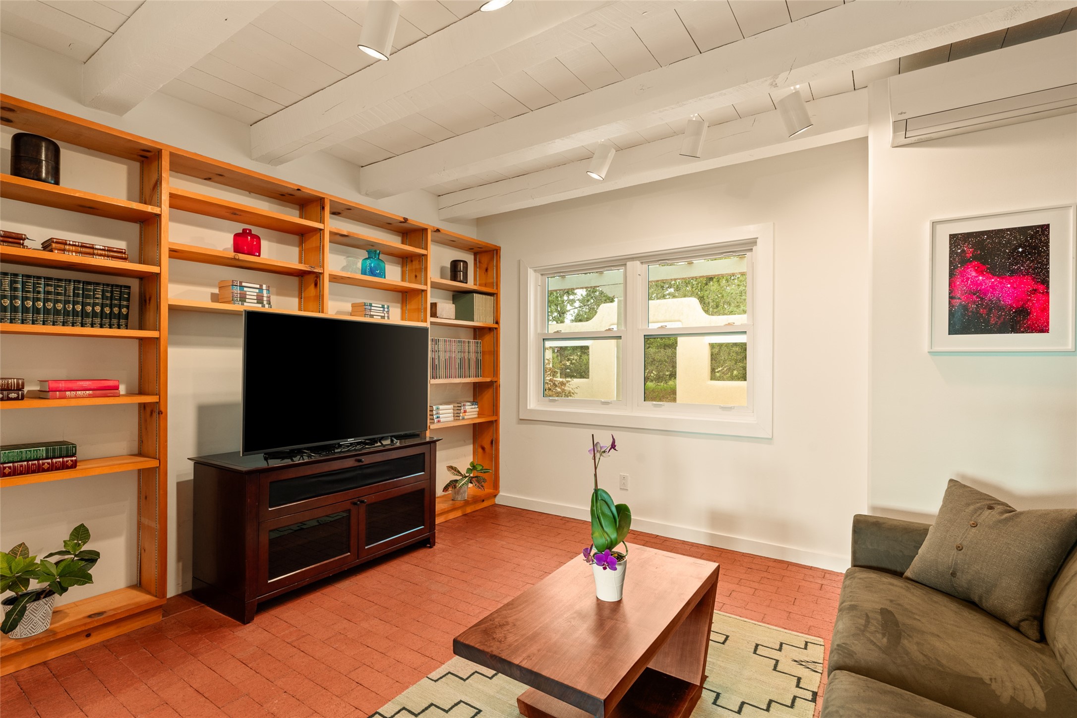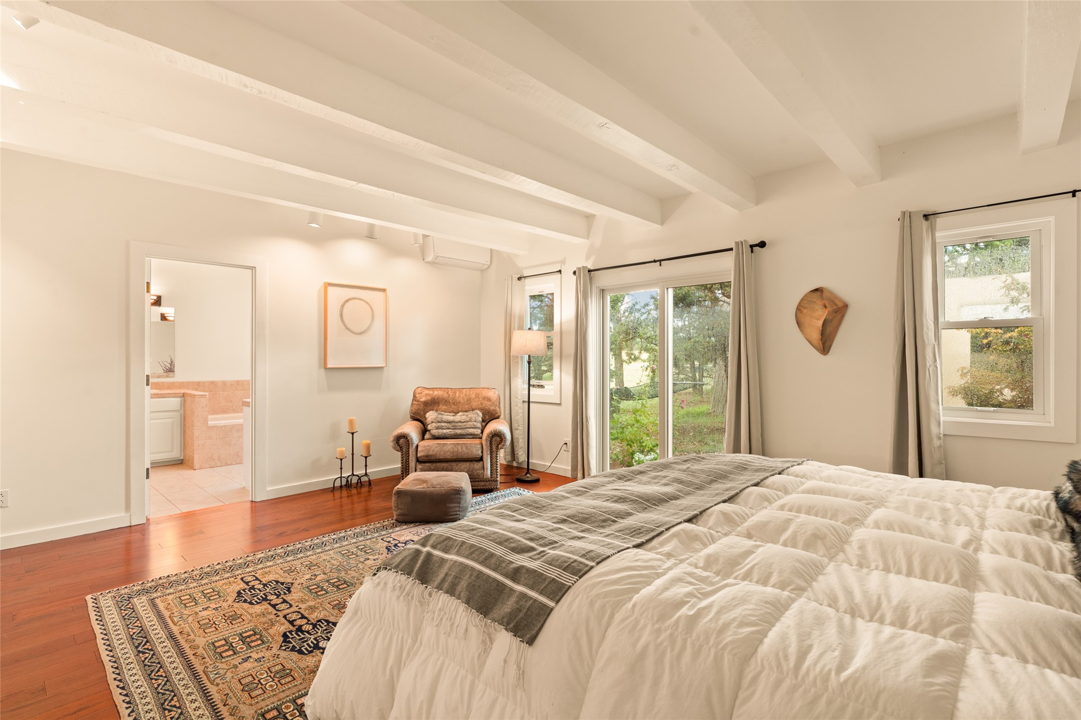 This timeless and sophisticated property is situated in a quiet and horse-friendly Santa Fe location just a short distance from the Arroyo Hondo Open Space trails and the famed Harry's Roadhouse restaurant. This 2,956 sq.ft. single-story constructed home has recently been completely updated and exudes a classic Santa Fe style surrounded by 6.041 acres of fenced, gated and usable land with wraparound views of the Sangre, Ortiz and Jemez mountains. Private sitting and entertaining spaces surround the home with lush, seasonal and mature landscaping, including fruit trees in the orchard. The home consists of a primary ensuite, two secondary bedrooms, 2.5 baths, and a separate office or flex room, all with classic bricked floors and whitewashed vigas throughout. The formal living/dining area's focal point is a gas burning fireplace. The updated kitchen features a large island, quartz countertops, walk-in pantry storage, and a sweet kiva fireplace with access to the covered patio. Functional amenities include radiant floor heat, on-demand hot water and mini-split AC/heating in the owners suite and office. A studio/workshop/3rd bay garage is adjacent to the deep 2-car attached garage. A nearby concrete pad has electricity stubbed-in, ideal for a future barn or casita. Completely updated (including roof, stucco, windows, mechanicals, and a new gas stove in the island) and perfectly maintained, this is a property not to be missed in an idyllic Santa Fe location.