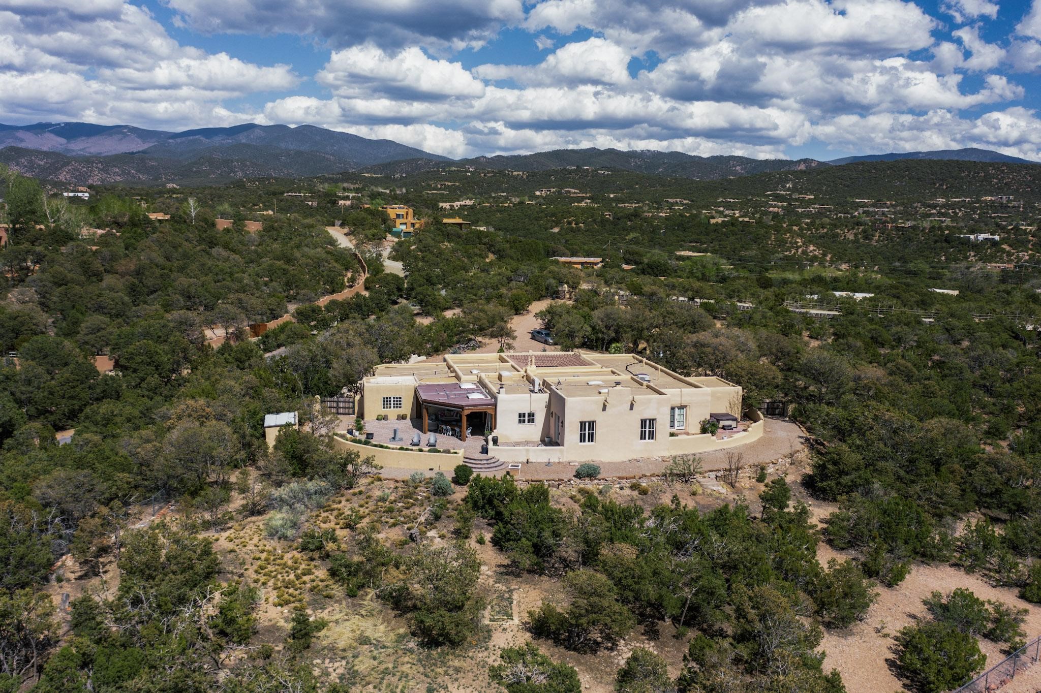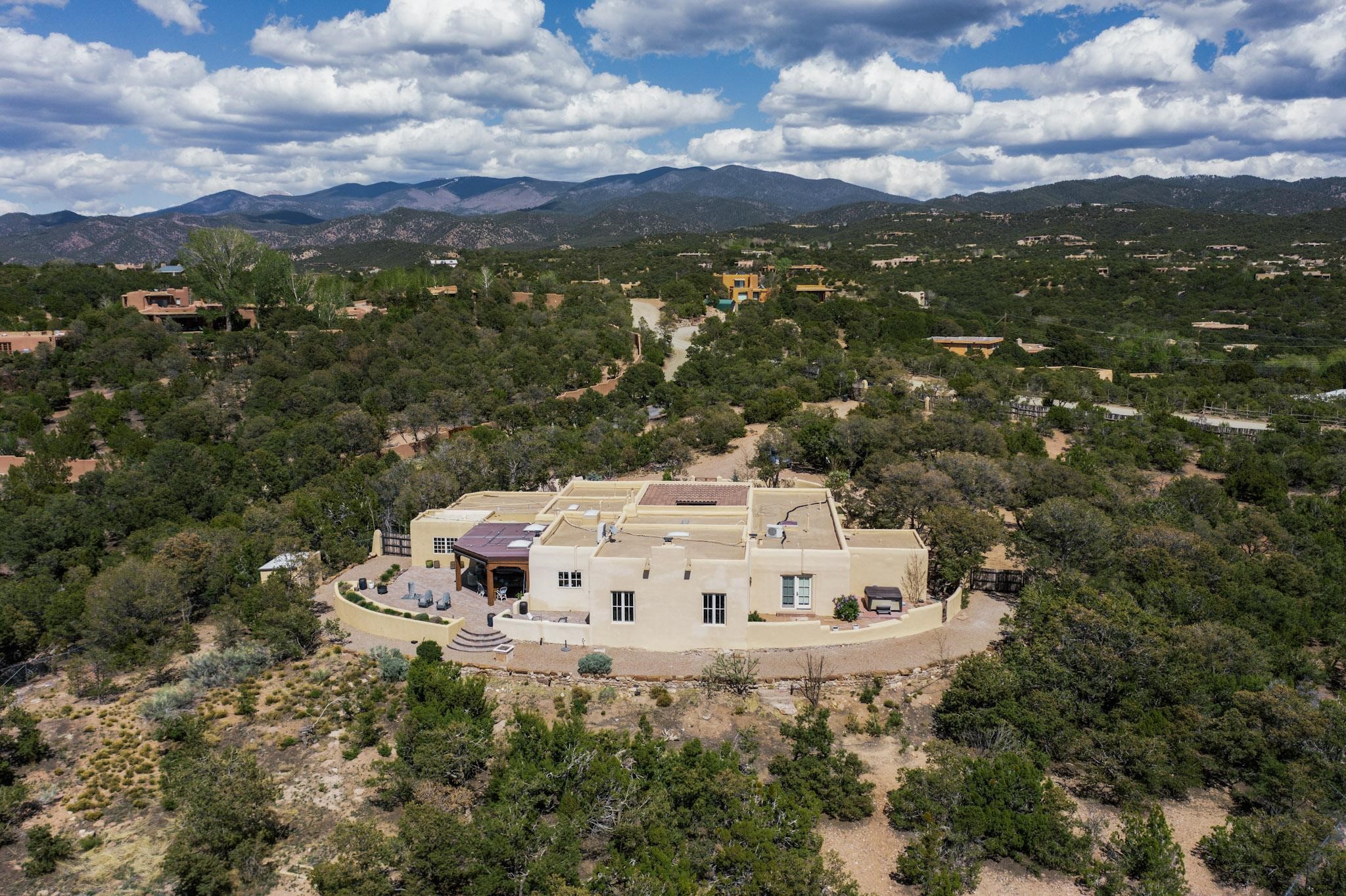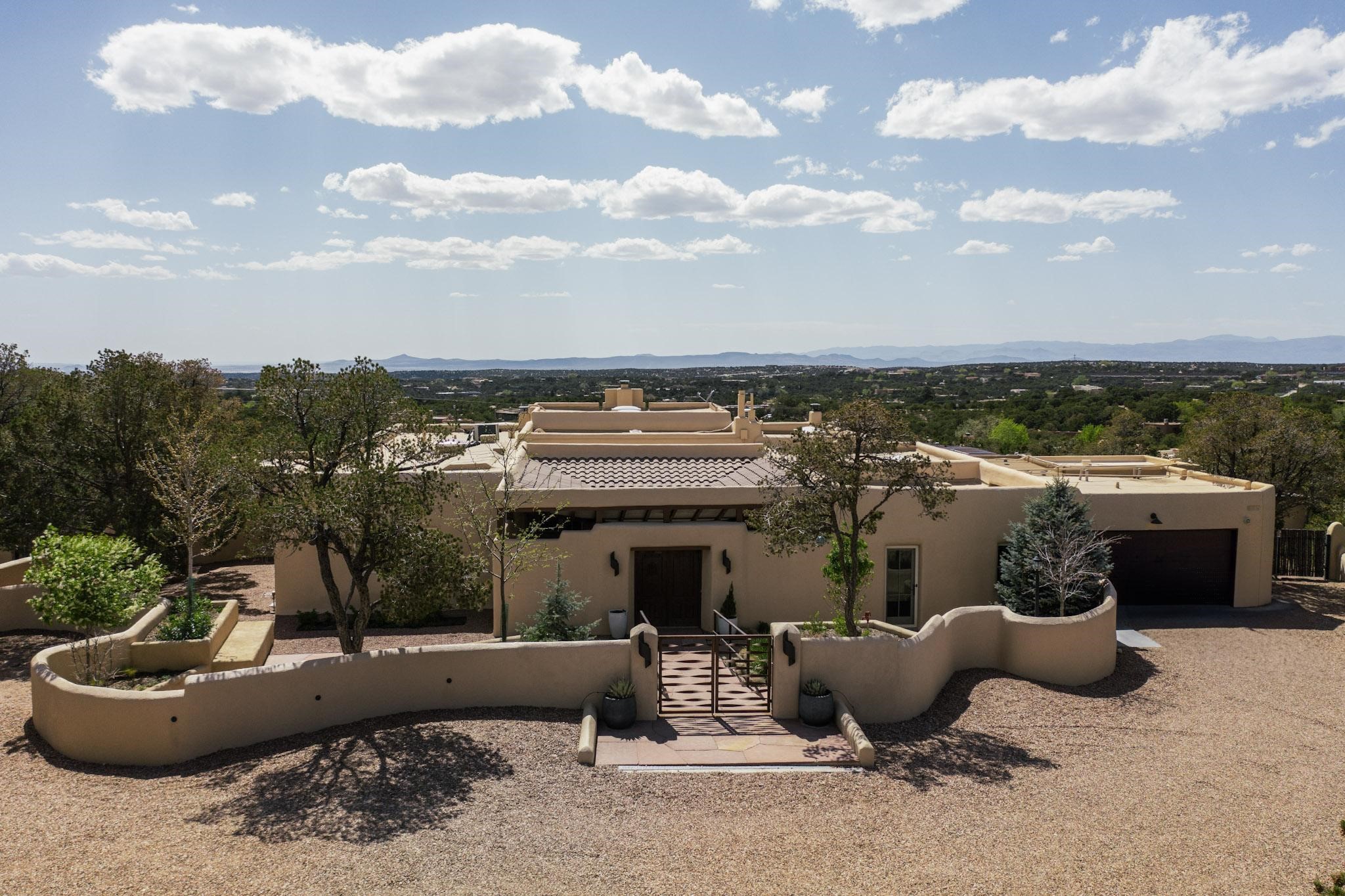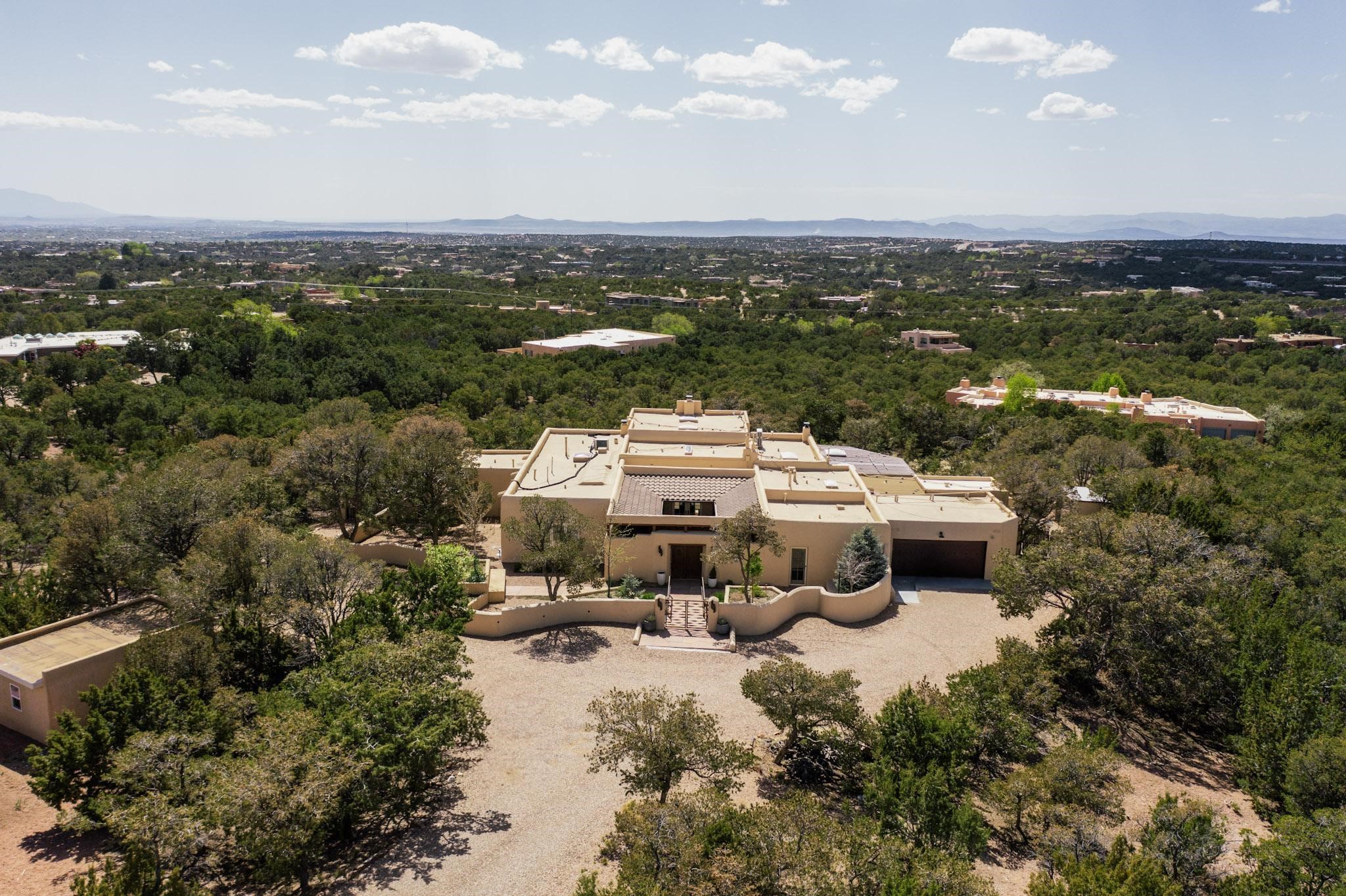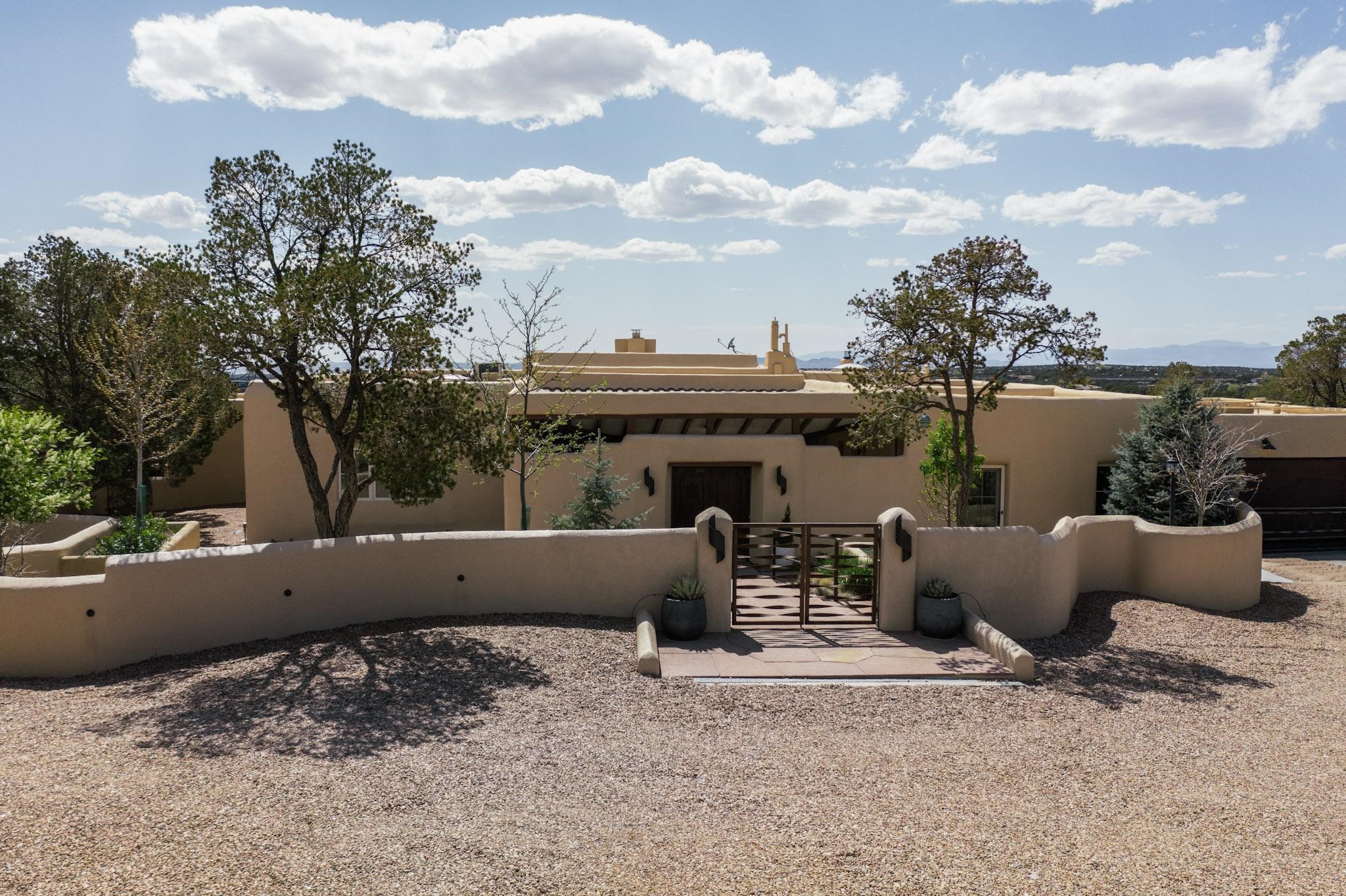 Beautiful, extensively remodeled, classic Santa Fe style home with jaw dropping panoramic mountain views on 3.4 wooded acres. Located on prestigious Circle Drive a mere 5 minute drive to downtown Santa Fe, this sensational home, built in 1936, impresses at every turn starting with the custom hand crafted iron gate, down the drive to a partially covered front entry courtyard leading to the front door and into a hallway of glistening diamond plaster walls that are throughout the house as, mostly, are the oak floors. Ahead is the spacious library/den with kiva fireplace. Through thick walled arches off the library is the formal living room beyond with its central fireplace and flanking windows and the 2 sets of French doors to bring in the light and the views; and boasting high ceilings with majestic corbels and vigas. The gourmet kitchen is entirely new with its own wet/coffee bar and nearby is an enormous pantry. Off the kitchen is a grand, heated portal and terrace to drink in the views and glory in the sunsets. The 3 bedroom suites are generously sized with remodeled bathrooms and each with glass doors to the outside. The closet in the primary bedroom is a wonder to behold and has its own washer and dryer. The 4th bedroom, currently set up as an office, is newly built and has some of the best views. A downstairs flex room (was a bedroom) is set up for exercise with adjacent laundry room. The heated detached studio nestles in the trees off the driveway and has multiple uses or, with adaption, could be another garage. A luxury home worthy of the name!