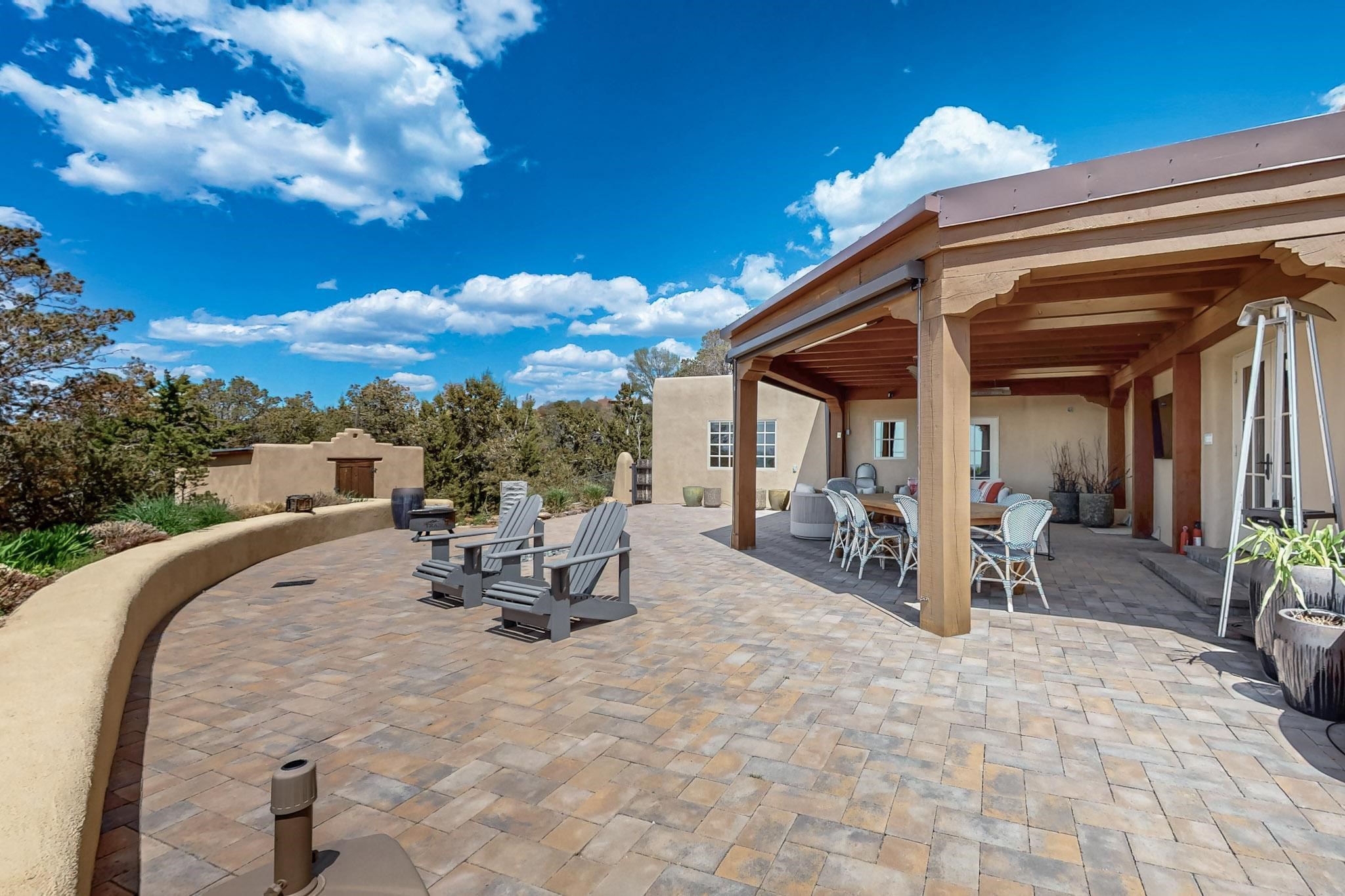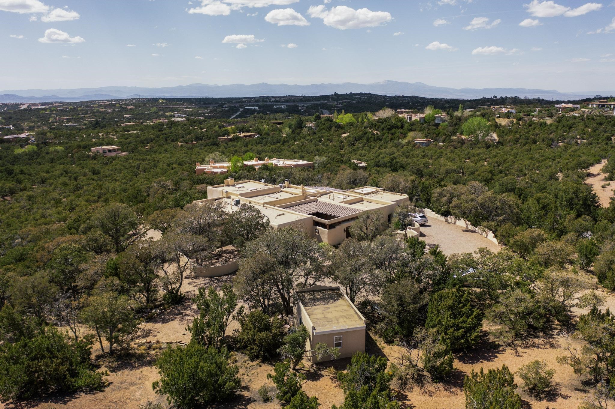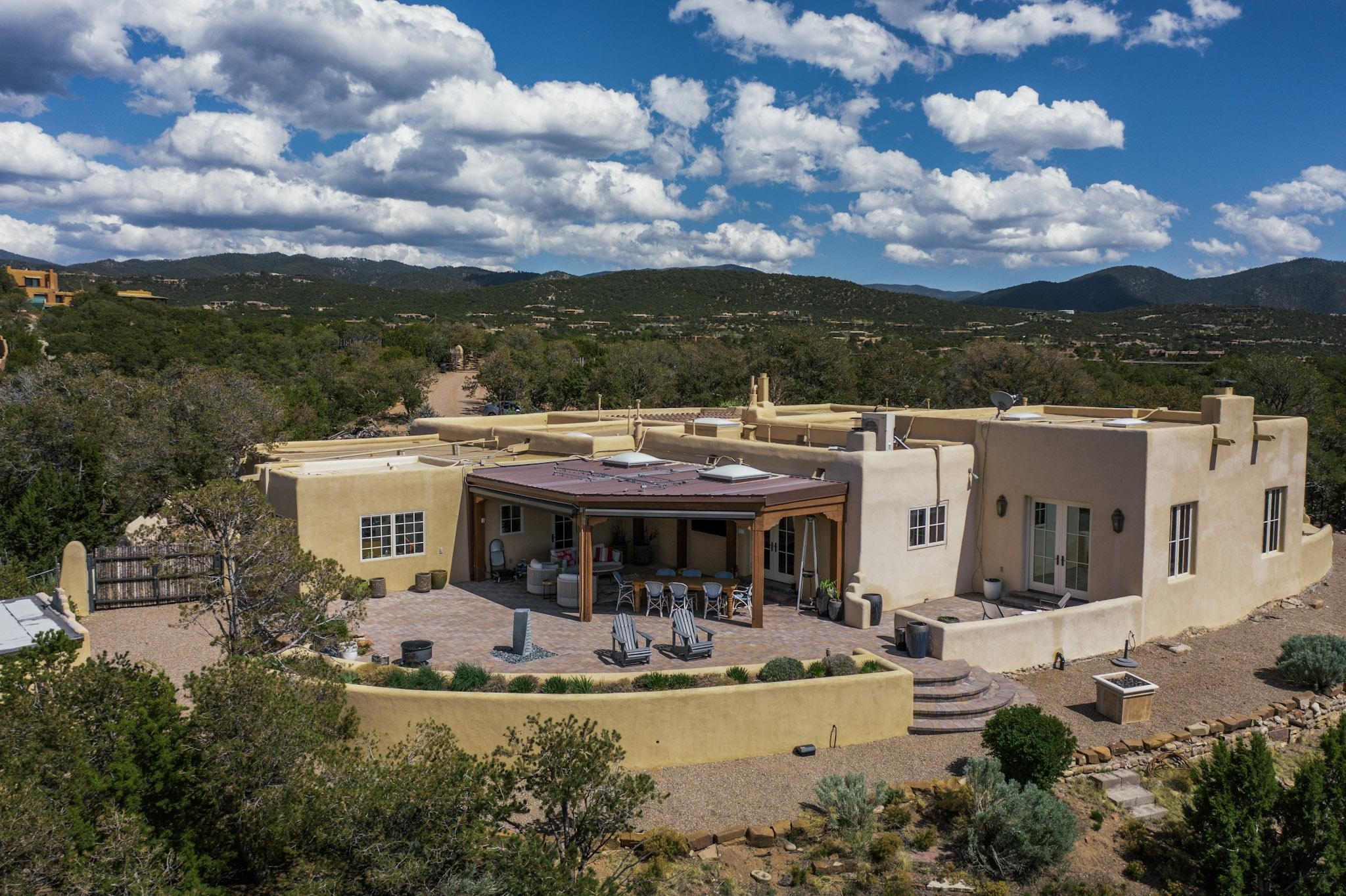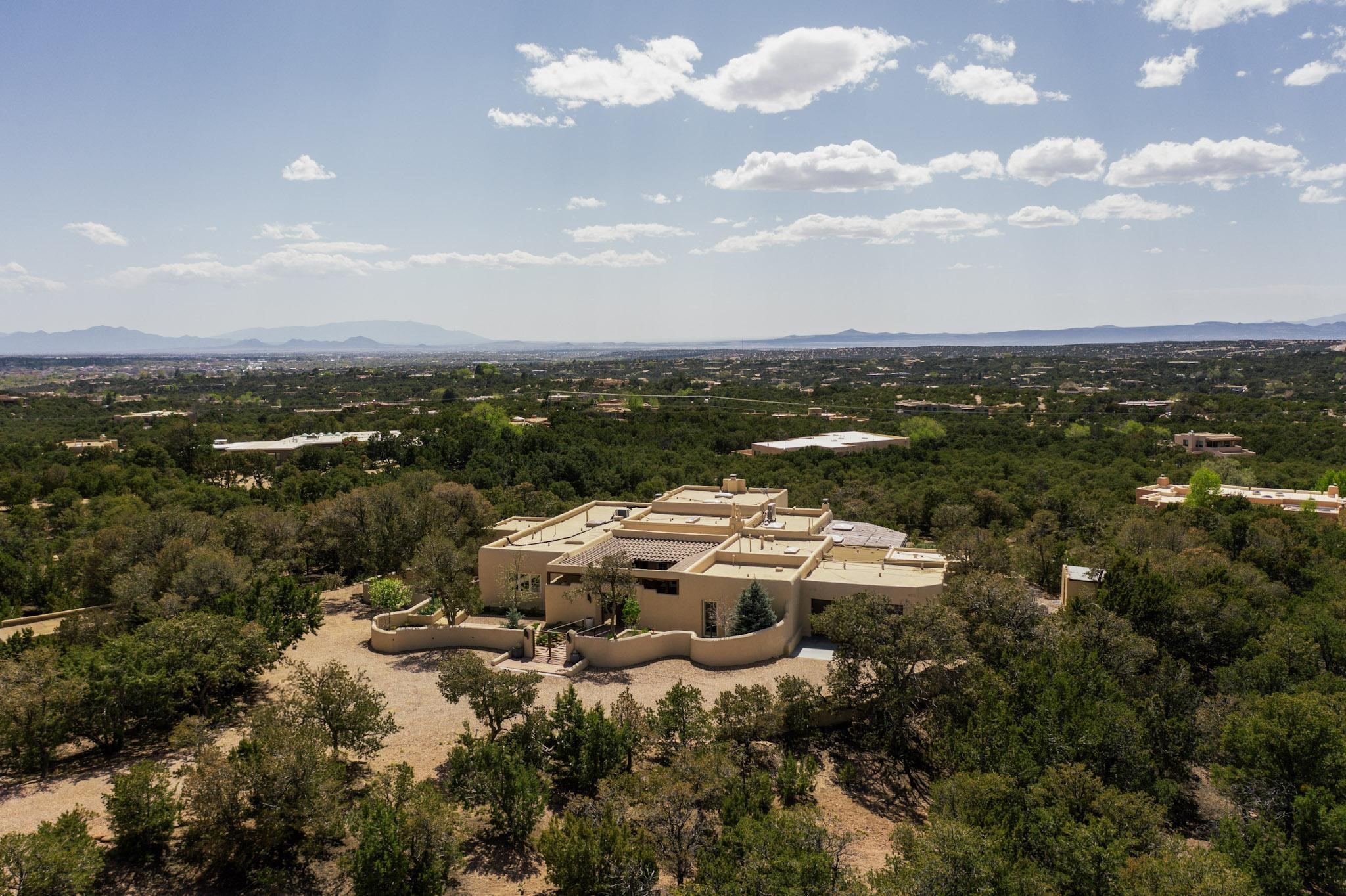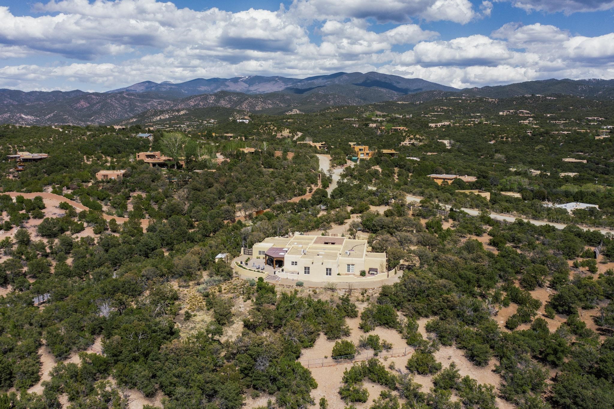 Beautiful, extensively remodeled, classic Santa Fe style home with jaw dropping panoramic mountain views on 3.4 wooded acres. Located on prestigious Circle Drive a mere 5 minute drive to downtown Santa Fe, this sensational home, built in 1936, impresses at every turn starting with the custom hand crafted iron gate, down the drive to a partially covered front entry courtyard leading to the front door and into a hallway of glistening diamond plaster walls that are throughout the house as, mostly, are the oak floors. Ahead is the spacious library/den with kiva fireplace. Through thick walled arches off the library is the formal living room beyond with its central fireplace and flanking windows and the 2 sets of French doors to bring in the light and the views; and boasting high ceilings with majestic corbels and vigas. The gourmet kitchen is entirely new with its own wet/coffee bar and nearby is an enormous pantry. Off the kitchen is a grand, heated portal and terrace to drink in the views and glory in the sunsets. The 3 bedroom suites are generously sized with remodeled bathrooms and each with glass doors to the outside. The closet in the primary bedroom is a wonder to behold and has its own washer and dryer. The 4th bedroom, currently set up as an office, is newly built and has some of the best views. A downstairs flex room (was a bedroom) is set up for exercise with adjacent laundry room. The heated detached studio nestles in the trees off the driveway and has multiple uses or, with adaption, could be another garage. A luxury home worthy of the name!