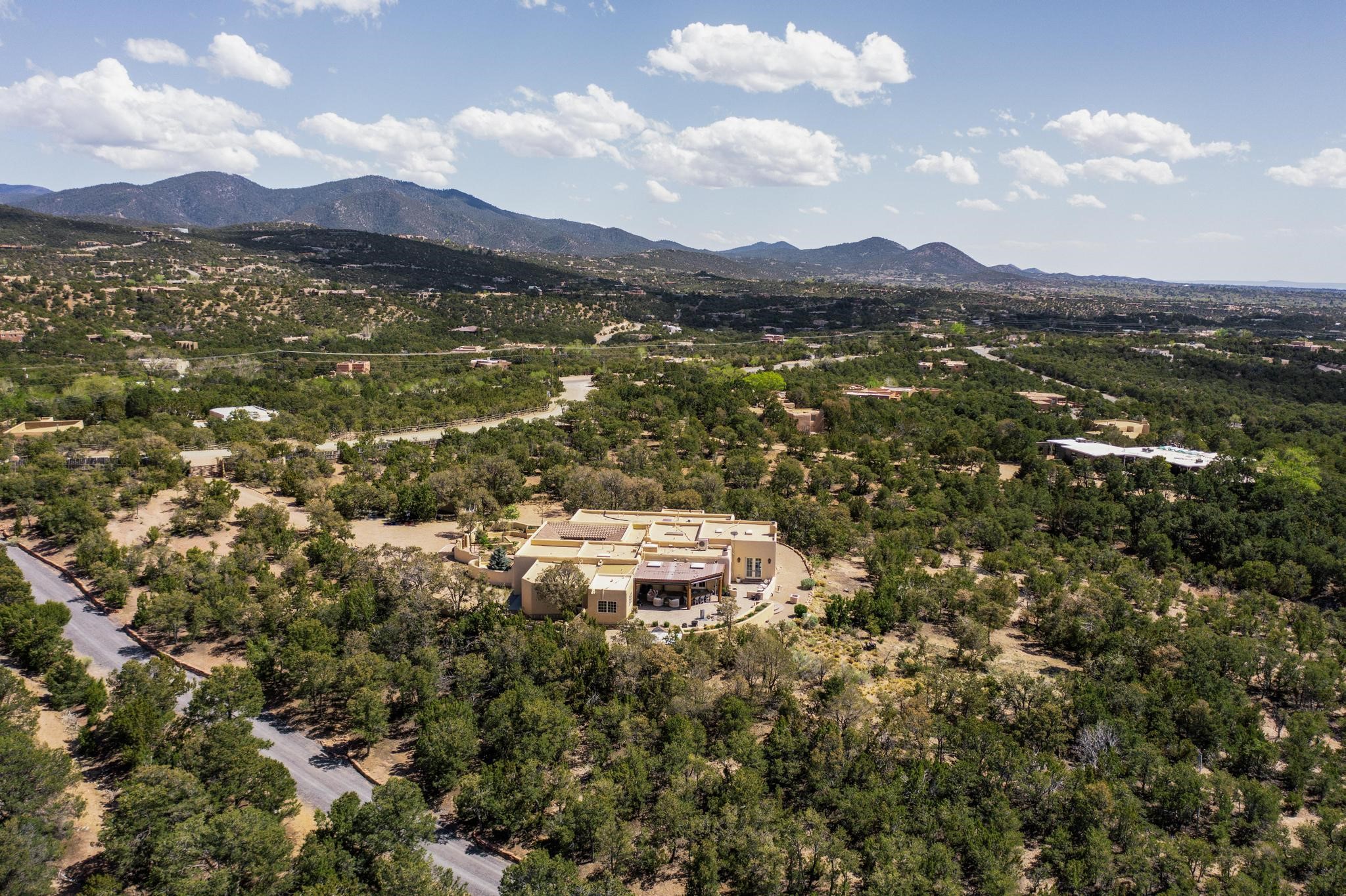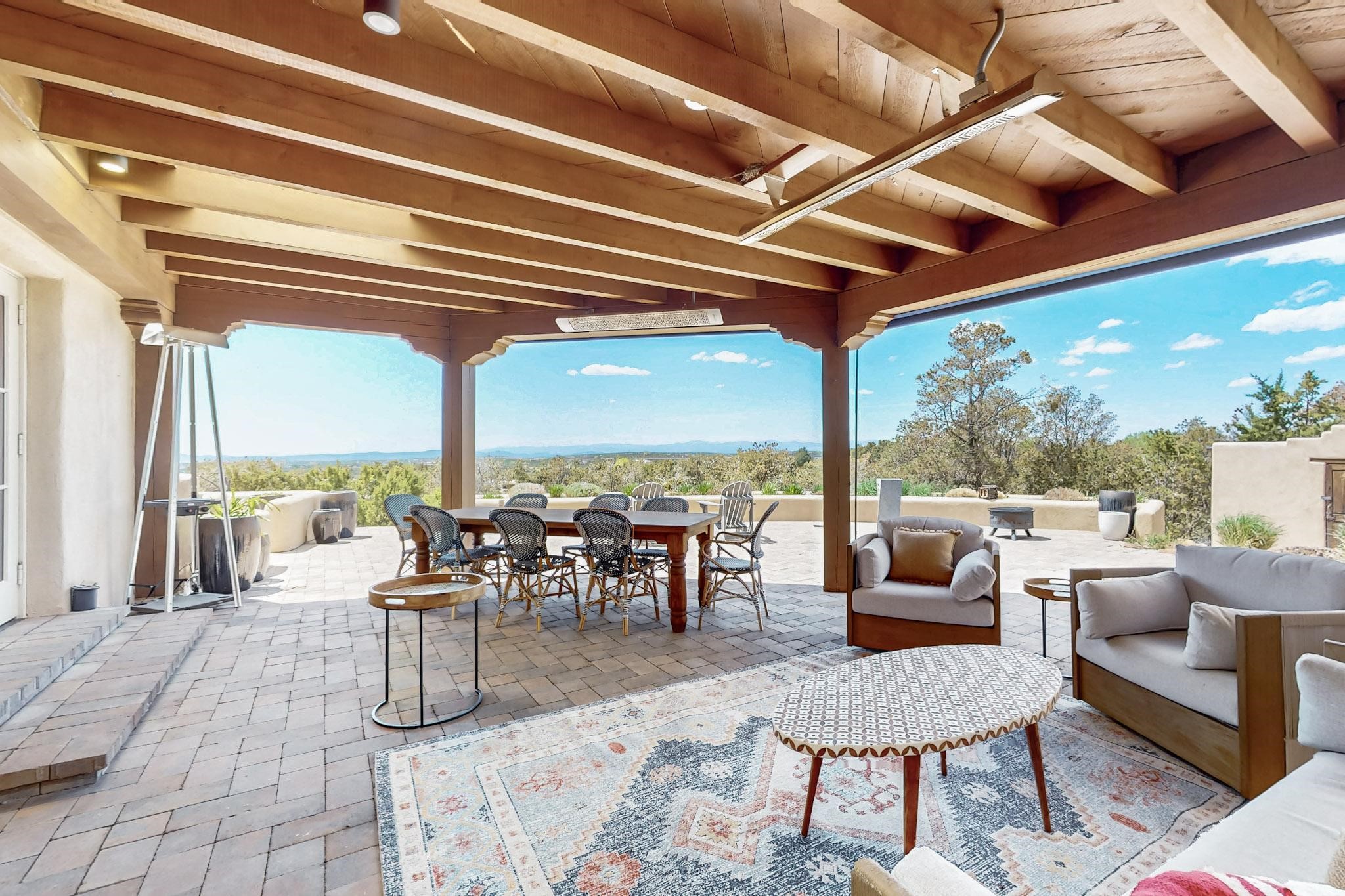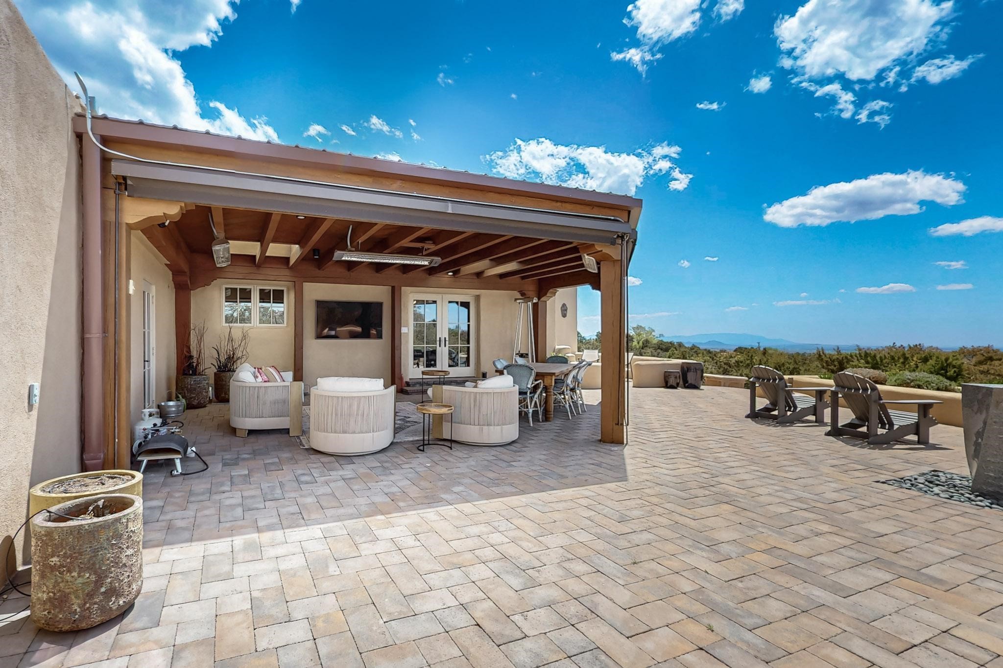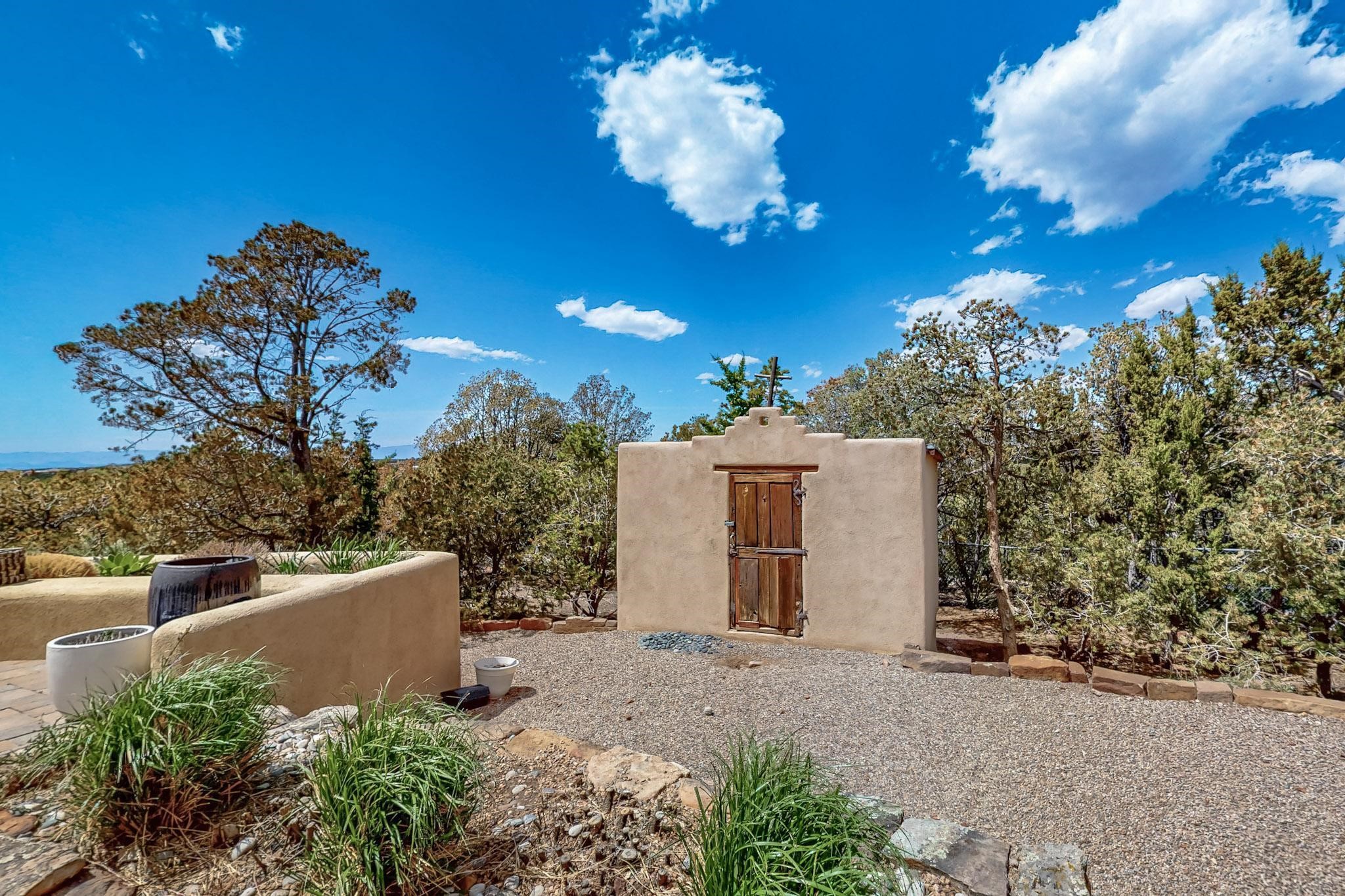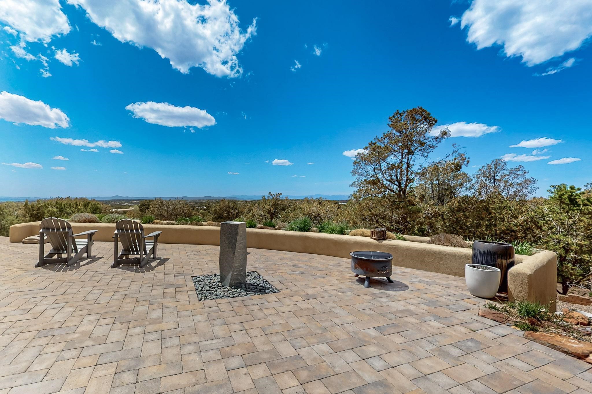 Beautiful, extensively remodeled, classic Santa Fe style home with jaw dropping panoramic mountain views on 3.4 wooded acres. Located on prestigious Circle Drive a mere 5 minute drive to downtown Santa Fe, this sensational home, built in 1936, impresses at every turn starting with the custom hand crafted iron gate, down the drive to a partially covered front entry courtyard leading to the front door and into a hallway of glistening diamond plaster walls that are throughout the house as, mostly, are the oak floors. Ahead is the spacious library/den with kiva fireplace. Through thick walled arches off the library is the formal living room beyond with its central fireplace and flanking windows and the 2 sets of French doors to bring in the light and the views; and boasting high ceilings with majestic corbels and vigas. The gourmet kitchen is entirely new with its own wet/coffee bar and nearby is an enormous pantry. Off the kitchen is a grand, heated portal and terrace to drink in the views and glory in the sunsets. The 3 bedroom suites are generously sized with remodeled bathrooms and each with glass doors to the outside. The closet in the primary bedroom is a wonder to behold and has its own washer and dryer. The 4th bedroom, currently set up as an office, is newly built and has some of the best views. A downstairs flex room (was a bedroom) is set up for exercise with adjacent laundry room. The heated detached studio nestles in the trees off the driveway and has multiple uses or, with adaption, could be another garage. A luxury home worthy of the name!