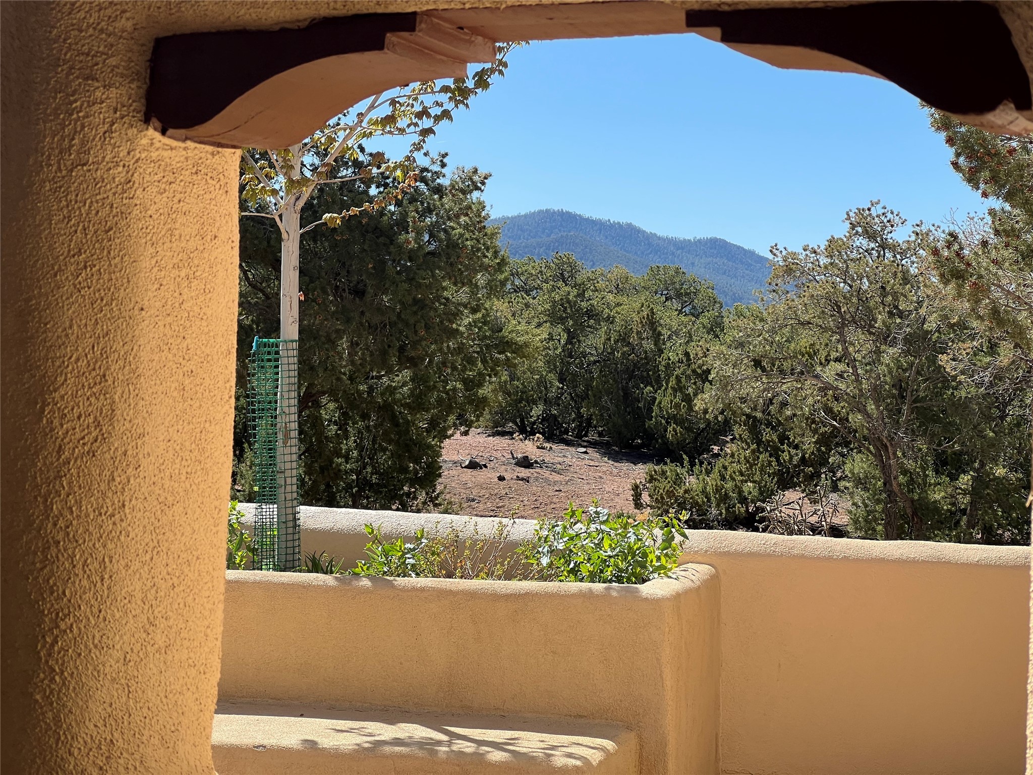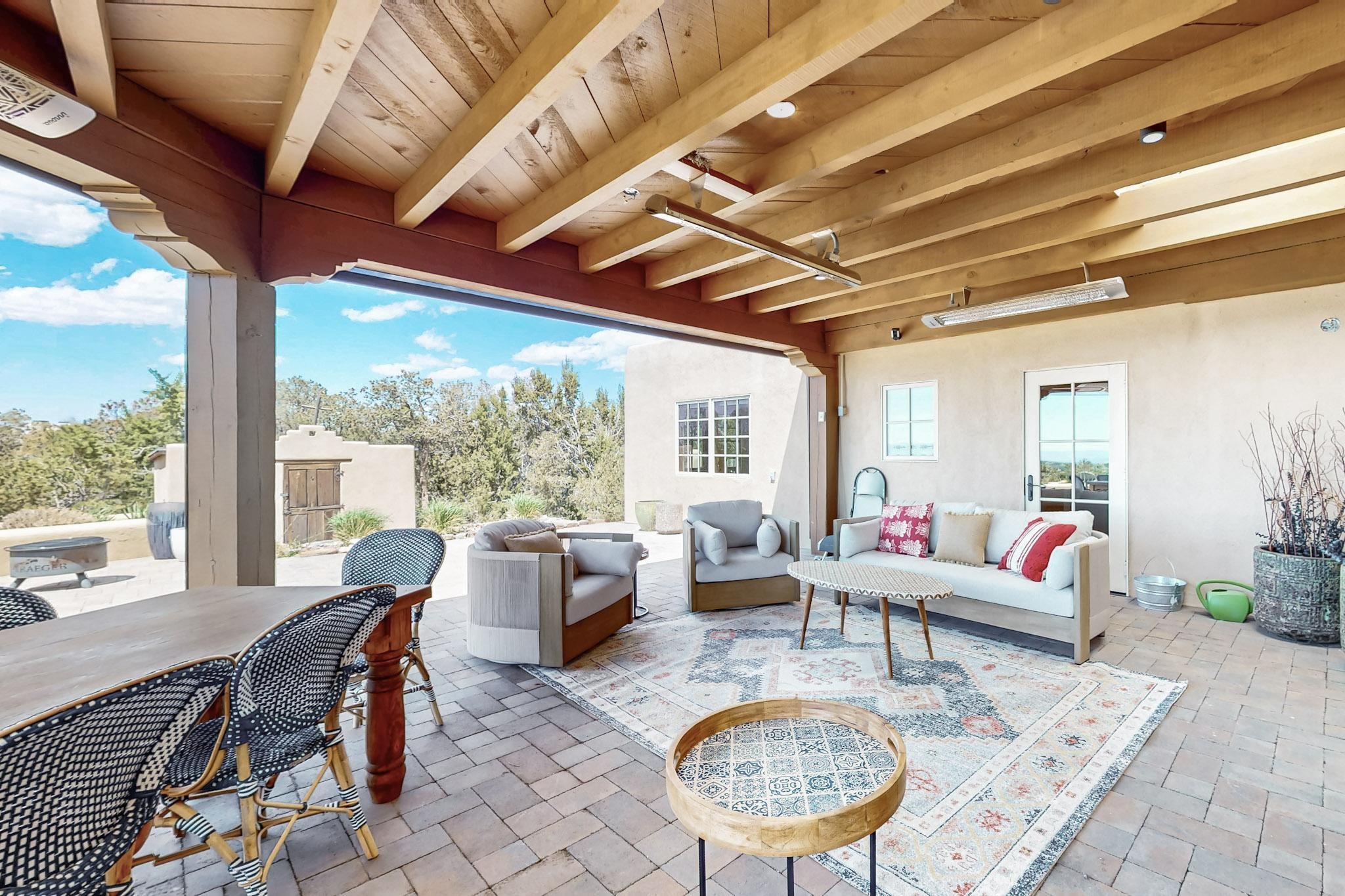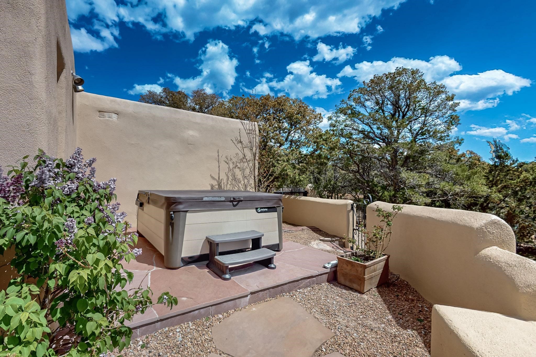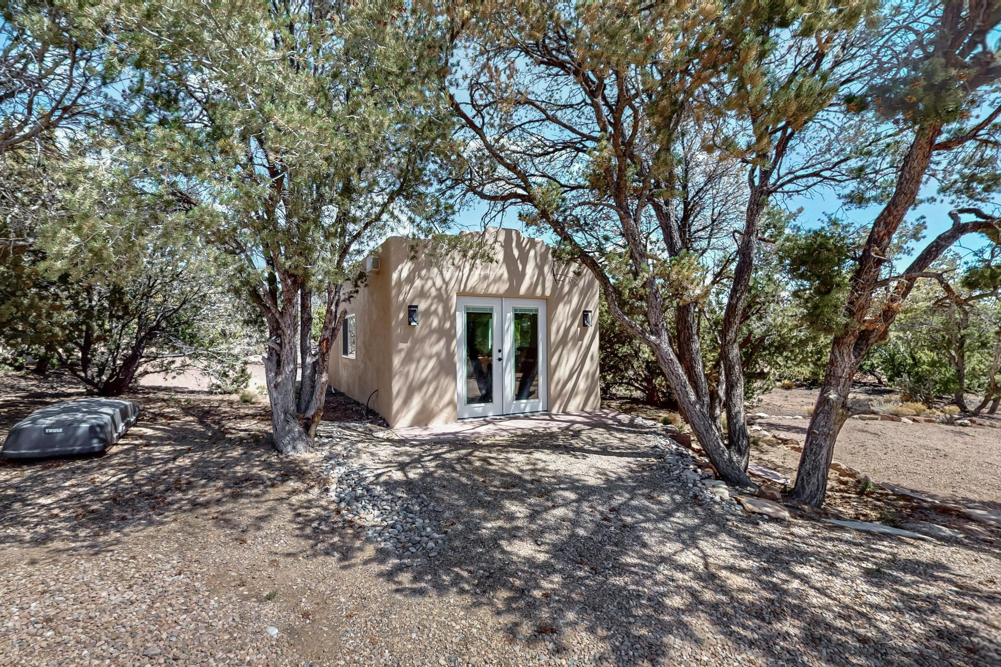 Beautiful, extensively remodeled, classic Santa Fe style home with jaw dropping panoramic mountain views on 3.4 wooded acres. Located on prestigious Circle Drive a mere 5 minute drive to downtown Santa Fe, this sensational home, built in 1936, impresses at every turn starting with the custom hand crafted iron gate, down the drive to a partially covered front entry courtyard leading to the front door and into a hallway of glistening diamond plaster walls that are throughout the house as, mostly, are the oak floors. Ahead is the spacious library/den with kiva fireplace. Through thick walled arches off the library is the formal living room beyond with its central fireplace and flanking windows and the 2 sets of French doors to bring in the light and the views; and boasting high ceilings with majestic corbels and vigas. The gourmet kitchen is entirely new with its own wet/coffee bar and nearby is an enormous pantry. Off the kitchen is a grand, heated portal and terrace to drink in the views and glory in the sunsets. The 3 bedroom suites are generously sized with remodeled bathrooms and each with glass doors to the outside. The closet in the primary bedroom is a wonder to behold and has its own washer and dryer. The 4th bedroom, currently set up as an office, is newly built and has some of the best views. A downstairs flex room (was a bedroom) is set up for exercise with adjacent laundry room. The heated detached studio nestles in the trees off the driveway and has multiple uses or, with adaption, could be another garage. A luxury home worthy of the name!