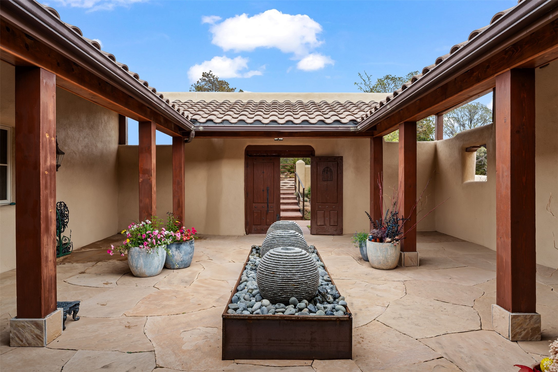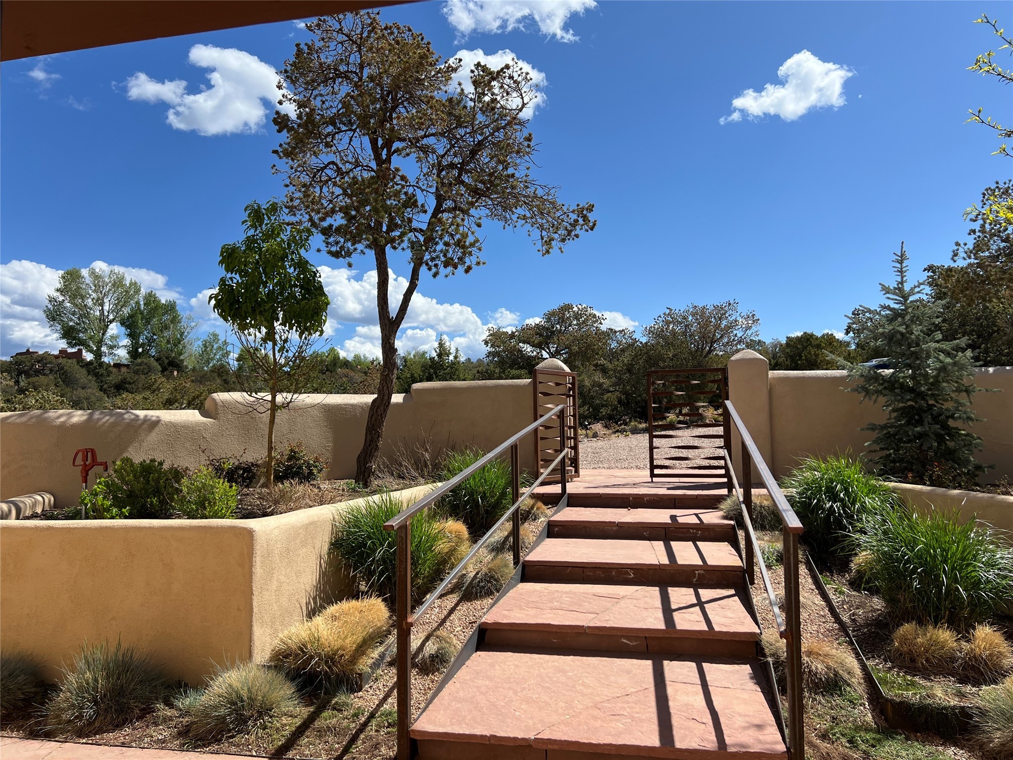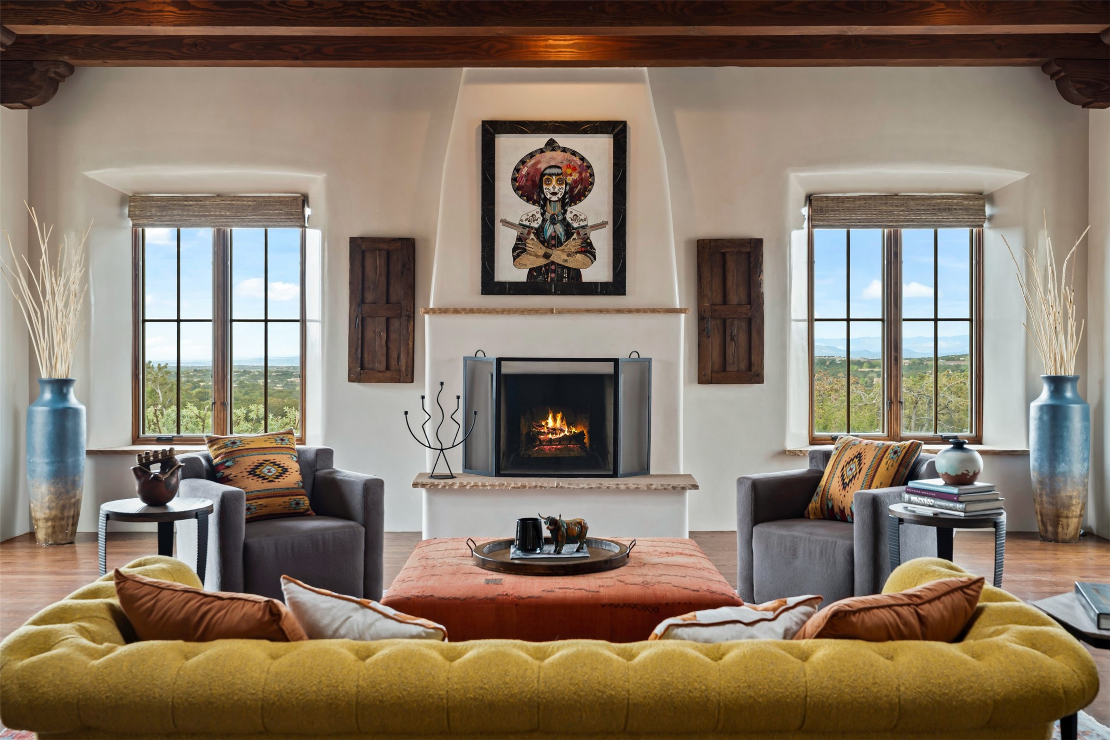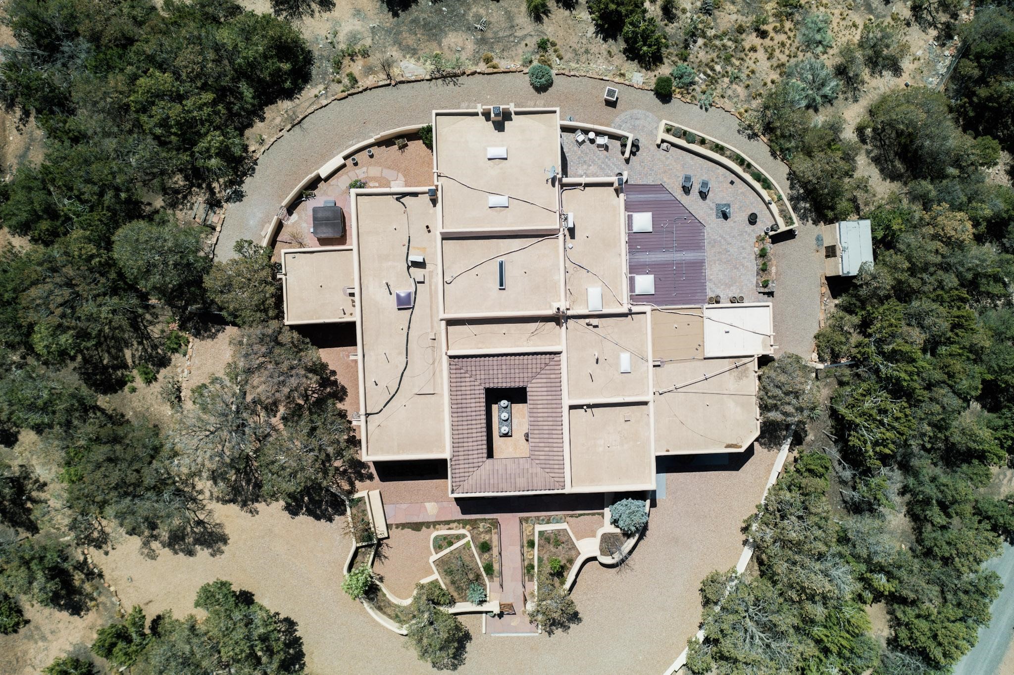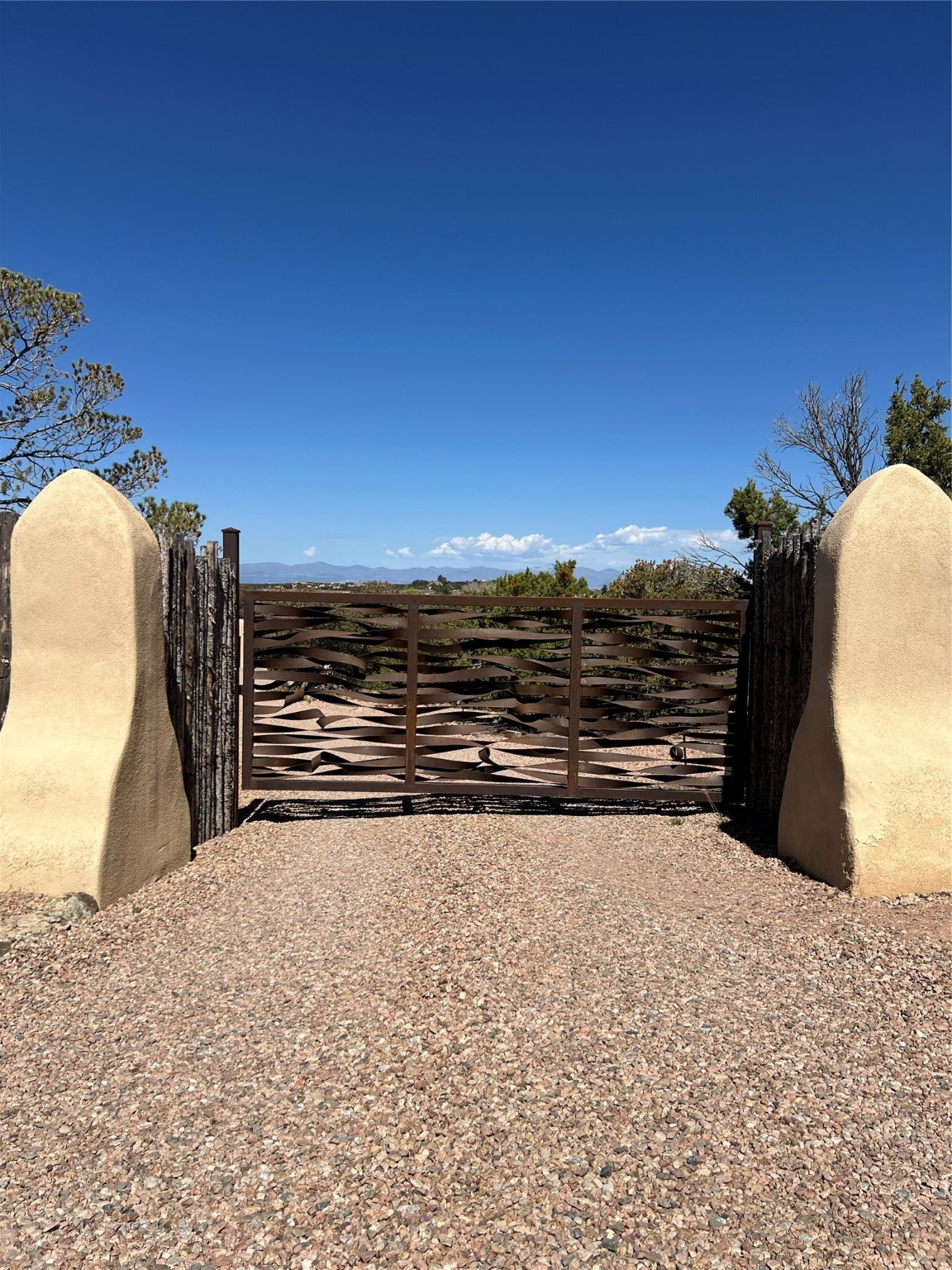 Beautiful, extensively remodeled, classic Santa Fe style home with jaw dropping panoramic mountain views on 3.4 wooded acres. Located on prestigious Circle Drive a mere 5 minute drive to downtown Santa Fe, this sensational home, built in 1936, impresses at every turn starting with the custom hand crafted iron gate, down the drive to a partially covered front entry courtyard leading to the front door and into a hallway of glistening diamond plaster walls that are throughout the house as, mostly, are the oak floors. Ahead is the spacious library/den with kiva fireplace. Through thick walled arches off the library is the formal living room beyond with its central fireplace and flanking windows and the 2 sets of French doors to bring in the light and the views; and boasting high ceilings with majestic corbels and vigas. The gourmet kitchen is entirely new with its own wet/coffee bar and nearby is an enormous pantry. Off the kitchen is a grand, heated portal and terrace to drink in the views and glory in the sunsets. The 3 bedroom suites are generously sized with remodeled bathrooms and each with glass doors to the outside. The closet in the primary bedroom is a wonder to behold and has its own washer and dryer. The 4th bedroom, currently set up as an office, is newly built and has some of the best views. A downstairs flex room (was a bedroom) is set up for exercise with adjacent laundry room. The heated detached studio nestles in the trees off the driveway and has multiple uses or, with adaption, could be another garage. A luxury home worthy of the name!