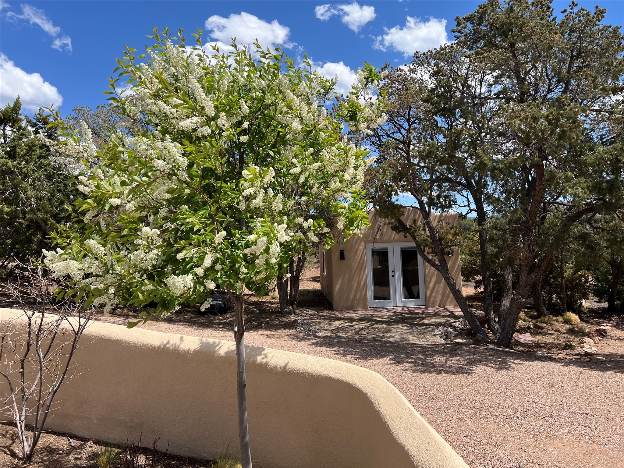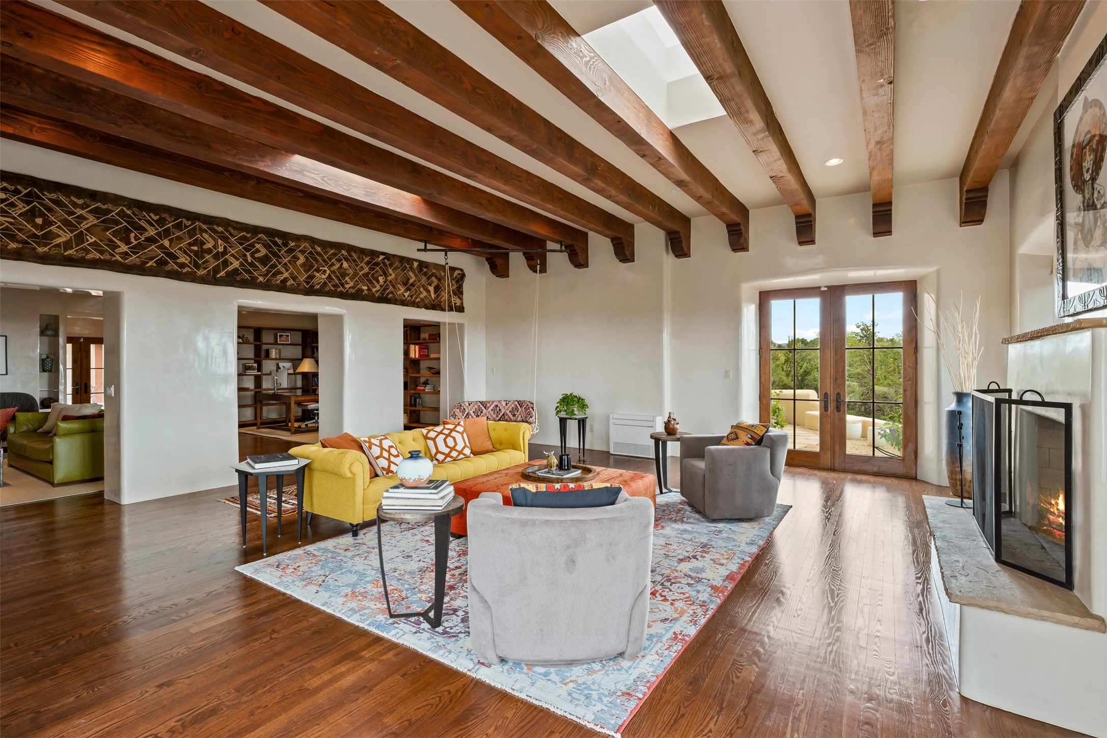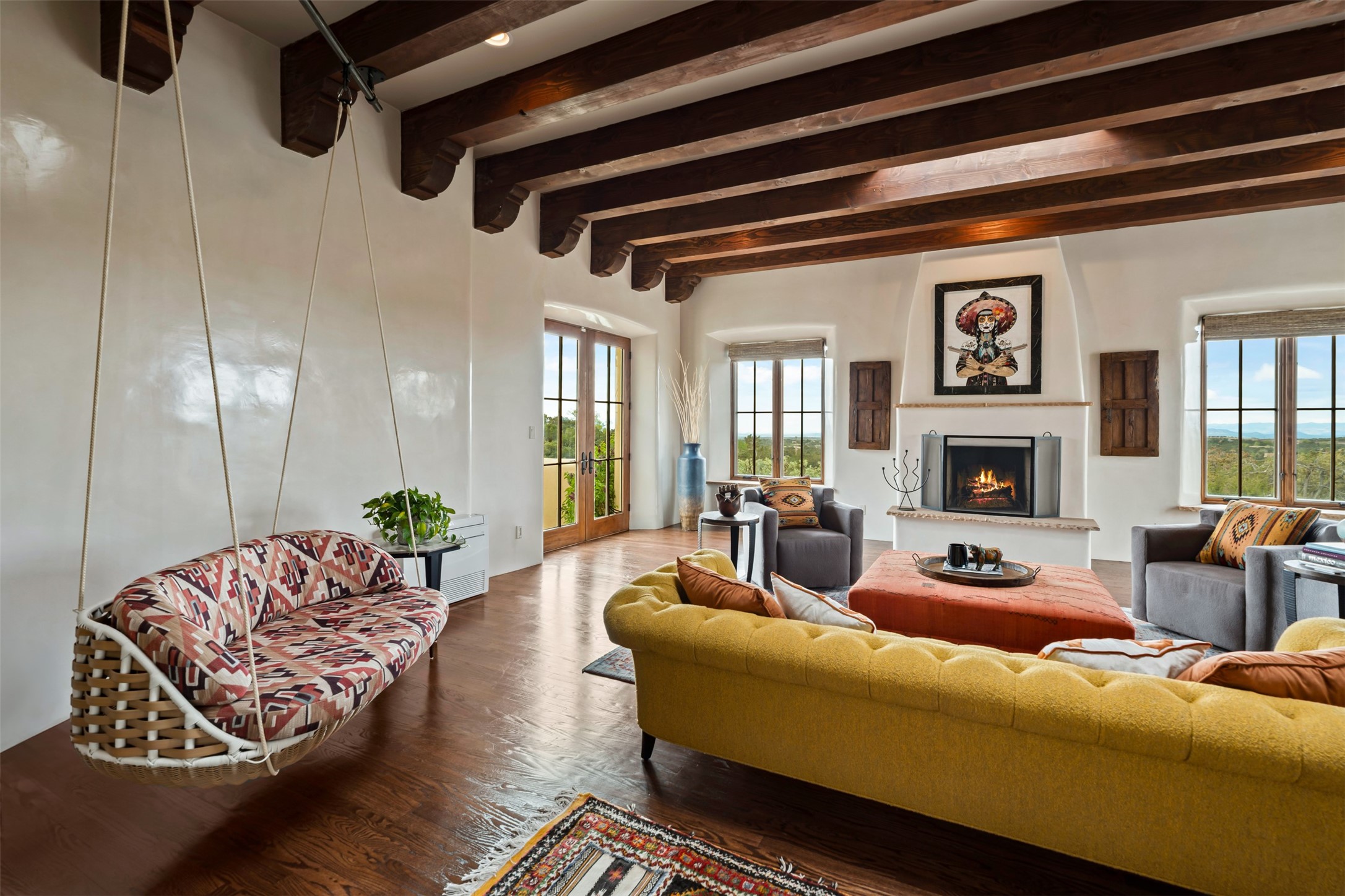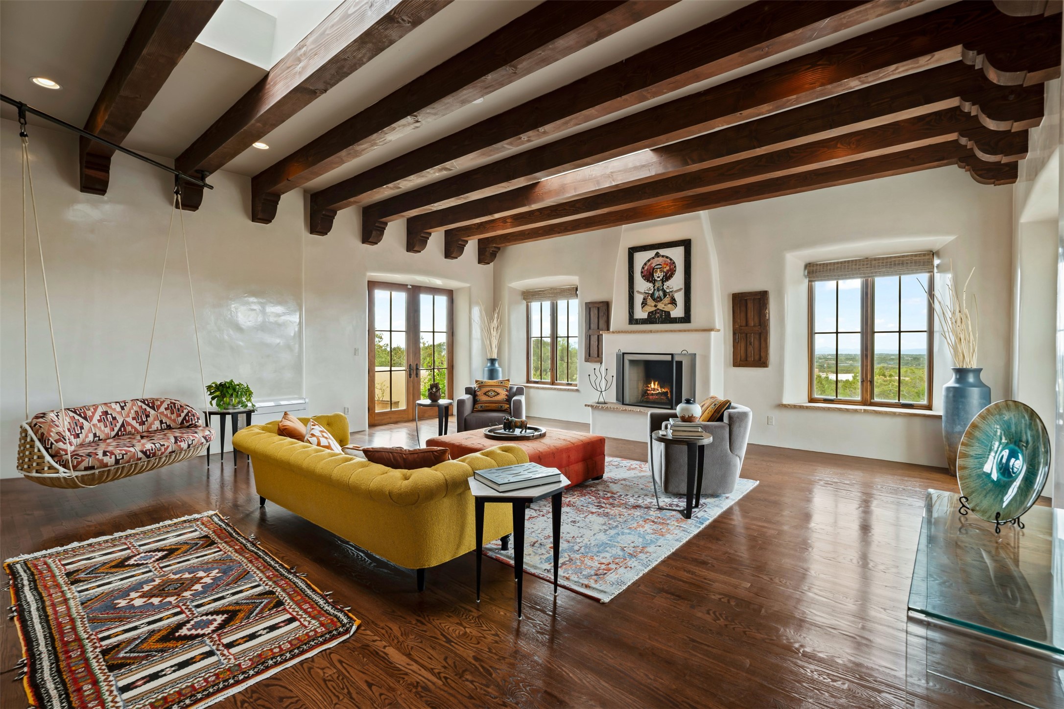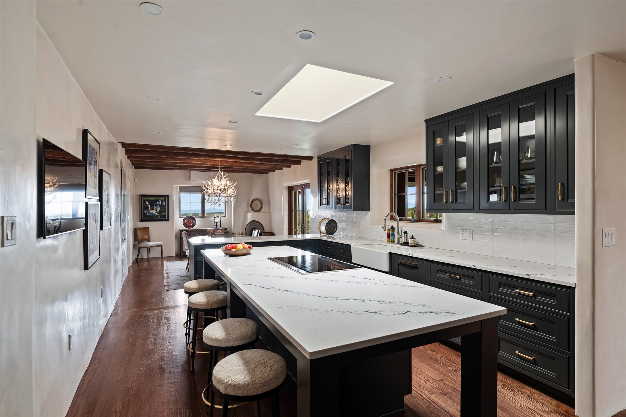 Beautiful, extensively remodeled, classic Santa Fe style home with jaw dropping panoramic mountain views on 3.4 wooded acres. Located on prestigious Circle Drive a mere 5 minute drive to downtown Santa Fe, this sensational home, built in 1936, impresses at every turn starting with the custom hand crafted iron gate, down the drive to a partially covered front entry courtyard leading to the front door and into a hallway of glistening diamond plaster walls that are throughout the house as, mostly, are the oak floors. Ahead is the spacious library/den with kiva fireplace. Through thick walled arches off the library is the formal living room beyond with its central fireplace and flanking windows and the 2 sets of French doors to bring in the light and the views; and boasting high ceilings with majestic corbels and vigas. The gourmet kitchen is entirely new with its own wet/coffee bar and nearby is an enormous pantry. Off the kitchen is a grand, heated portal and terrace to drink in the views and glory in the sunsets. The 3 bedroom suites are generously sized with remodeled bathrooms and each with glass doors to the outside. The closet in the primary bedroom is a wonder to behold and has its own washer and dryer. The 4th bedroom, currently set up as an office, is newly built and has some of the best views. A downstairs flex room (was a bedroom) is set up for exercise with adjacent laundry room. The heated detached studio nestles in the trees off the driveway and has multiple uses or, with adaption, could be another garage. A luxury home worthy of the name!