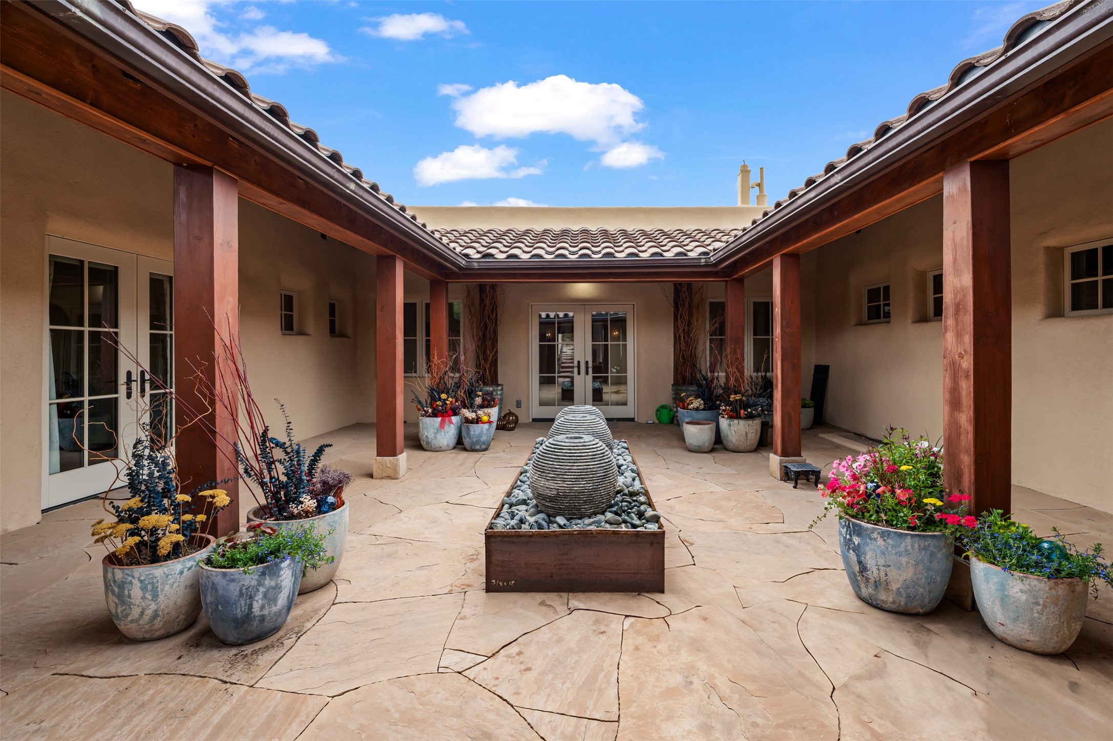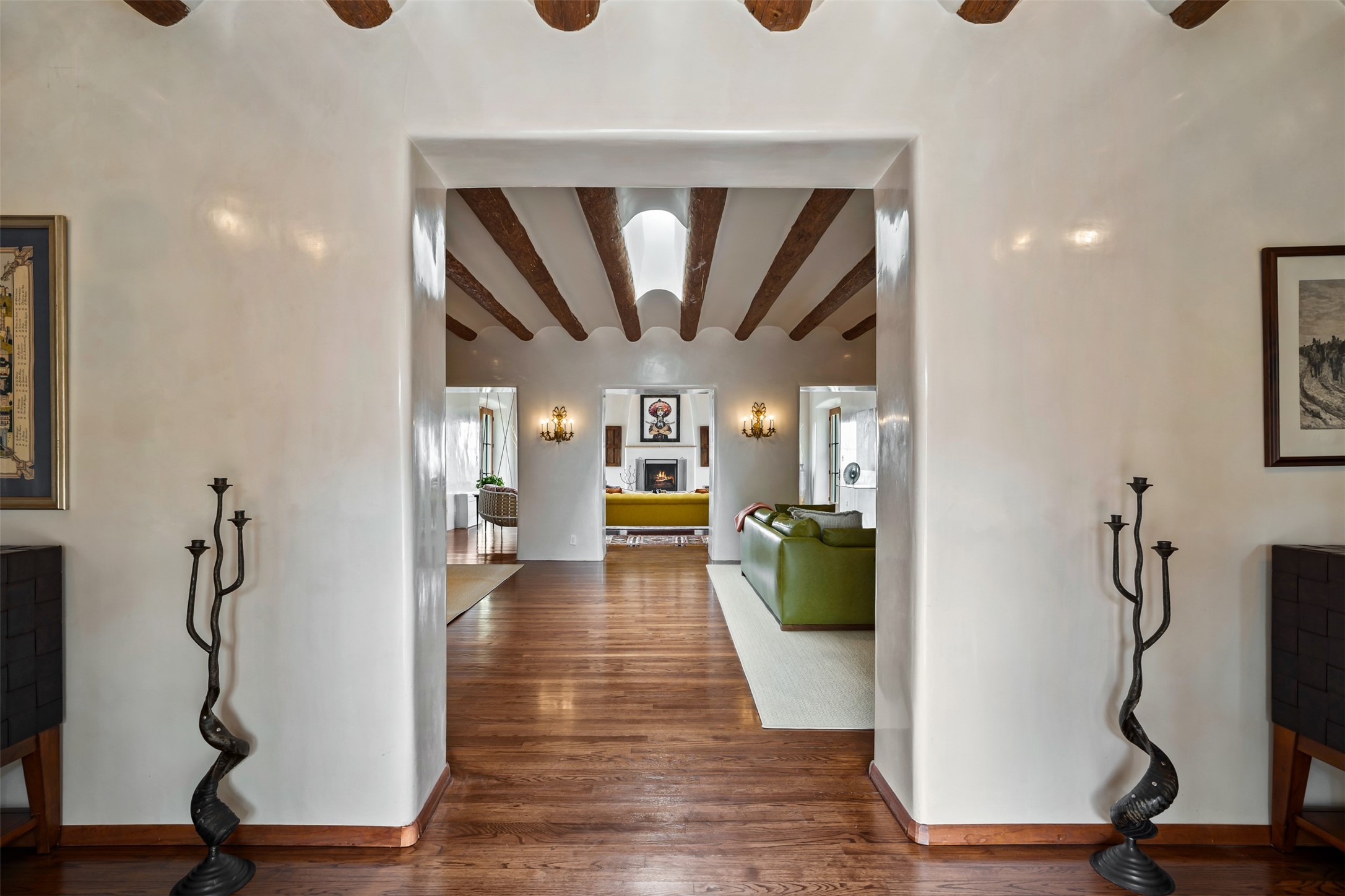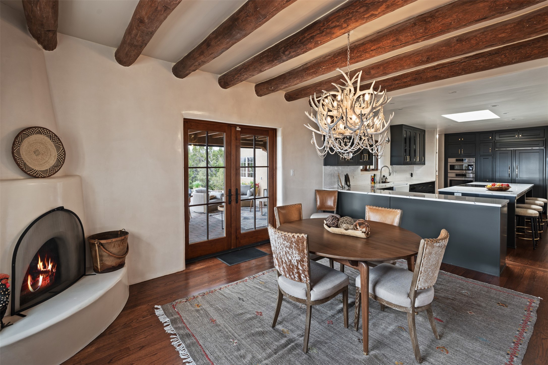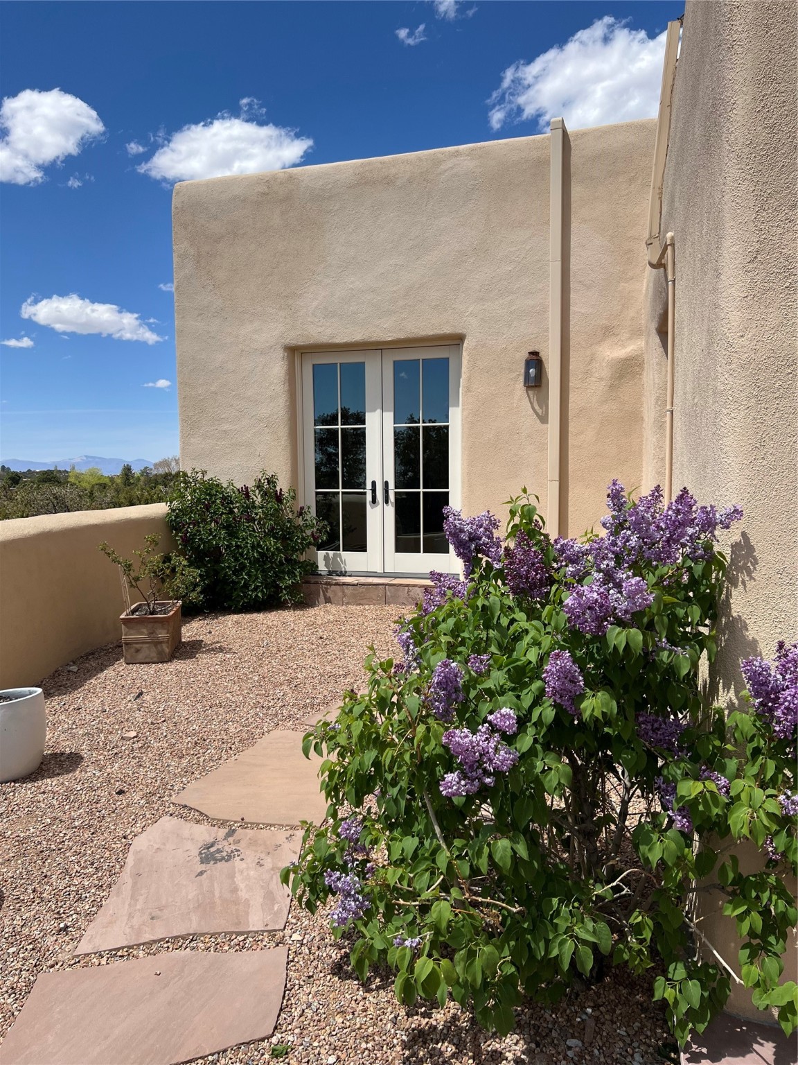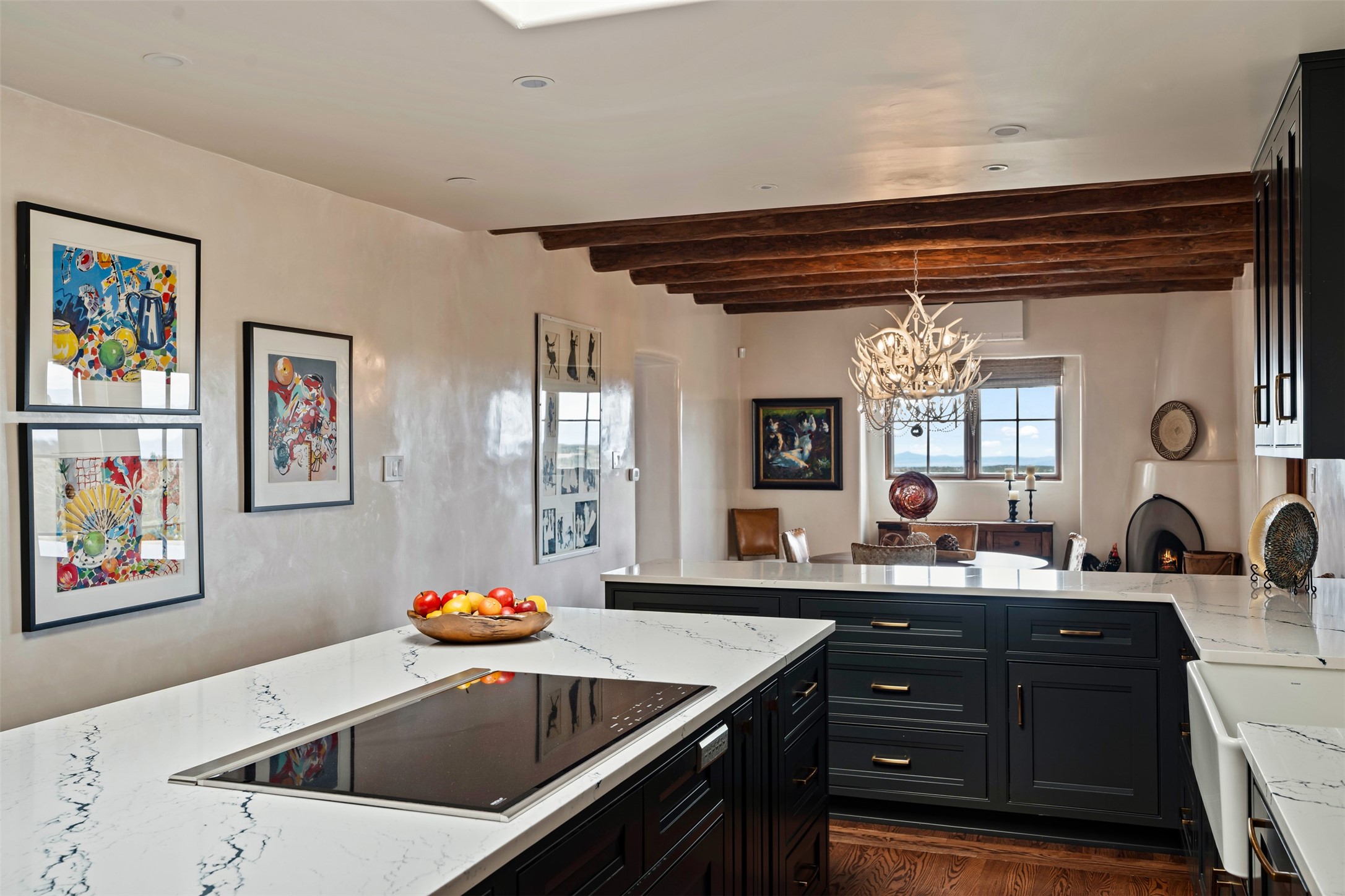 Beautiful, extensively remodeled, classic Santa Fe style home with jaw dropping panoramic mountain views on 3.4 wooded acres. Located on prestigious Circle Drive a mere 5 minute drive to downtown Santa Fe, this sensational home, built in 1936, impresses at every turn starting with the custom hand crafted iron gate, down the drive to a partially covered front entry courtyard leading to the front door and into a hallway of glistening diamond plaster walls that are throughout the house as, mostly, are the oak floors. Ahead is the spacious library/den with kiva fireplace. Through thick walled arches off the library is the formal living room beyond with its central fireplace and flanking windows and the 2 sets of French doors to bring in the light and the views; and boasting high ceilings with majestic corbels and vigas. The gourmet kitchen is entirely new with its own wet/coffee bar and nearby is an enormous pantry. Off the kitchen is a grand, heated portal and terrace to drink in the views and glory in the sunsets. The 3 bedroom suites are generously sized with remodeled bathrooms and each with glass doors to the outside. The closet in the primary bedroom is a wonder to behold and has its own washer and dryer. The 4th bedroom, currently set up as an office, is newly built and has some of the best views. A downstairs flex room (was a bedroom) is set up for exercise with adjacent laundry room. The heated detached studio nestles in the trees off the driveway and has multiple uses or, with adaption, could be another garage. A luxury home worthy of the name!