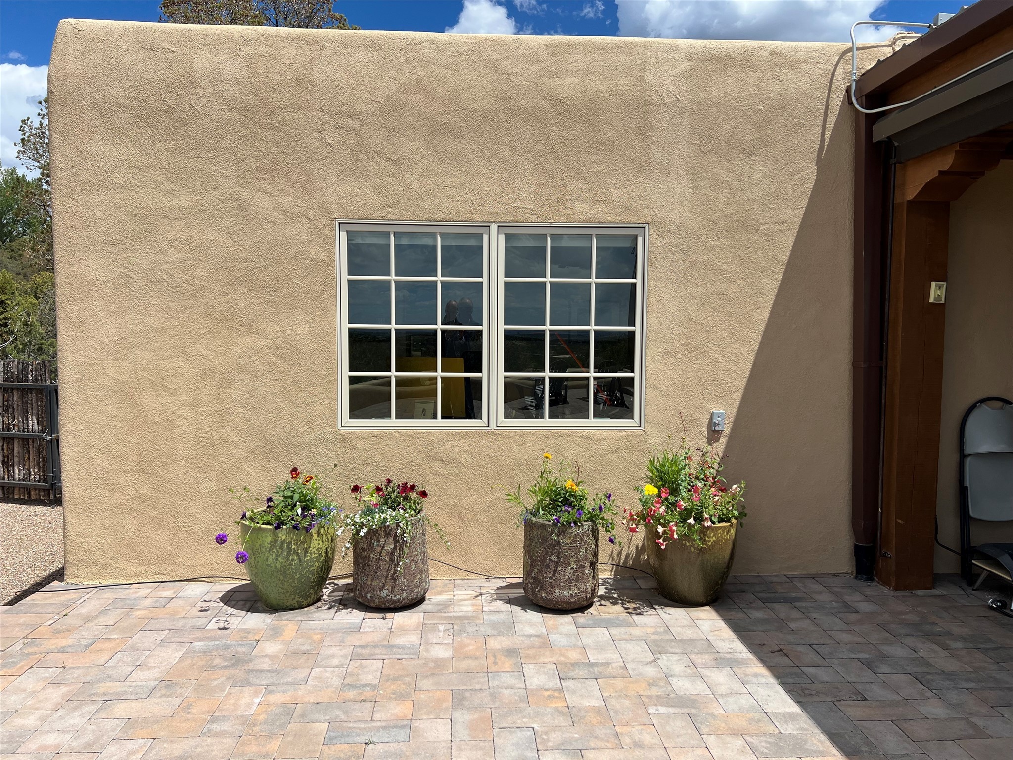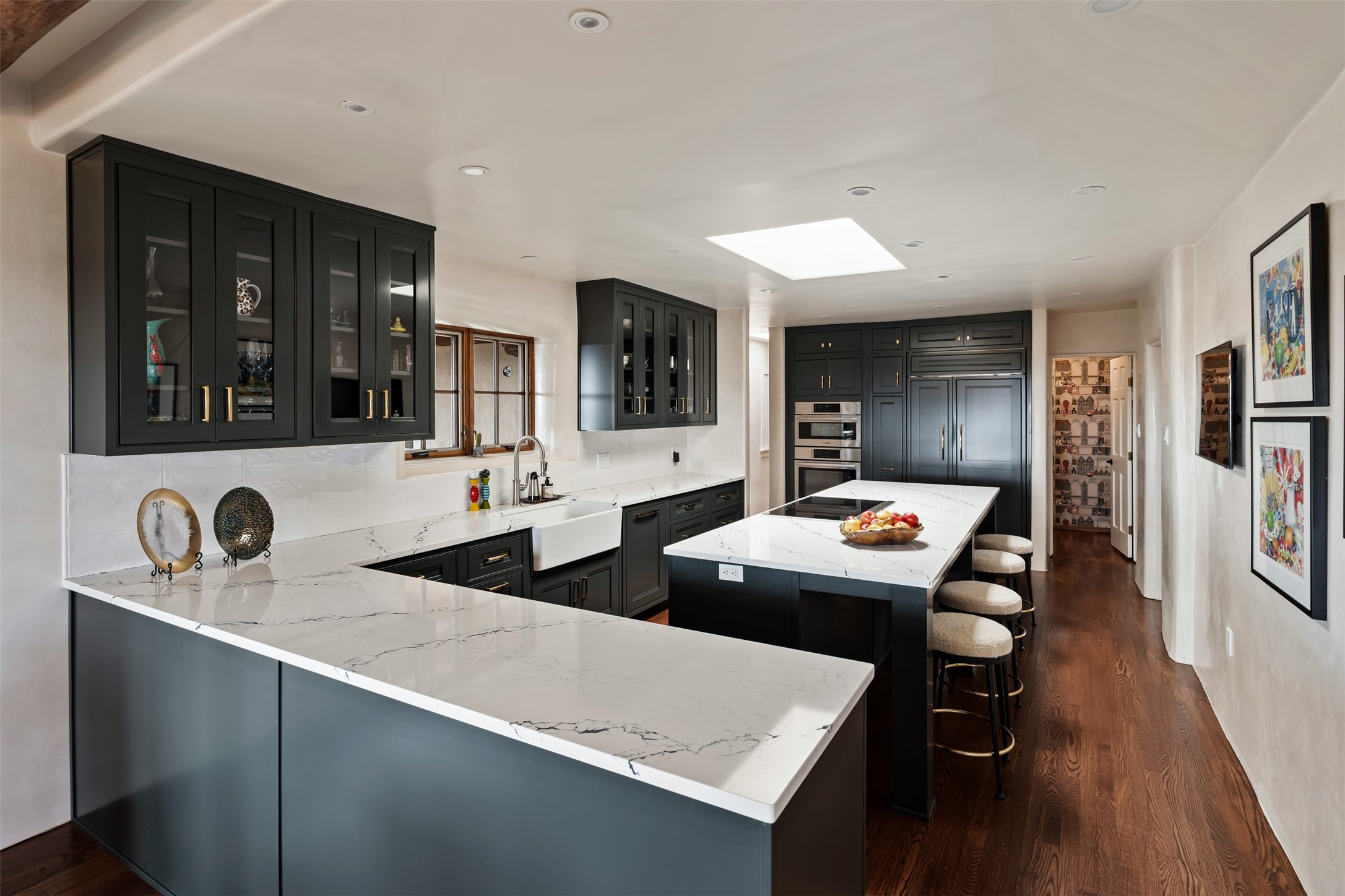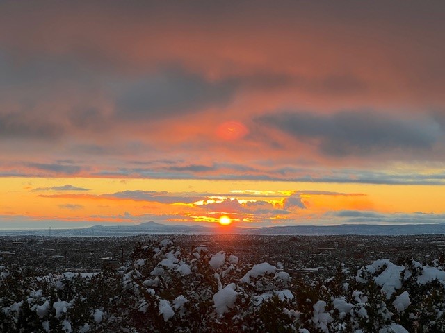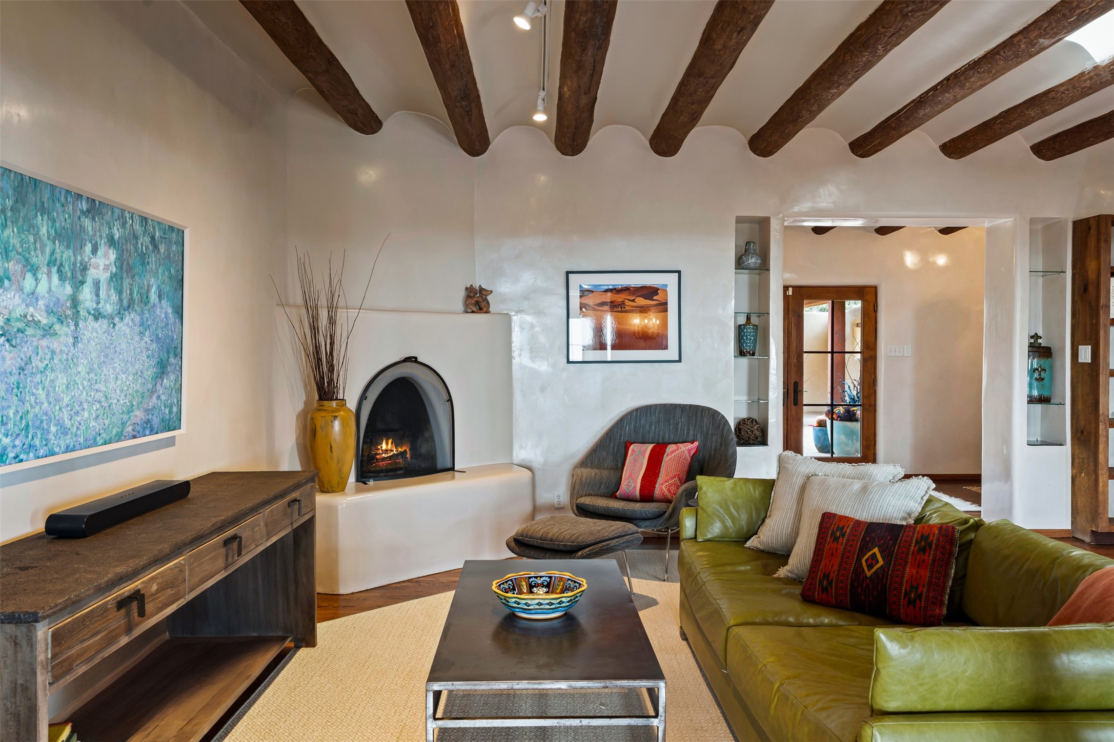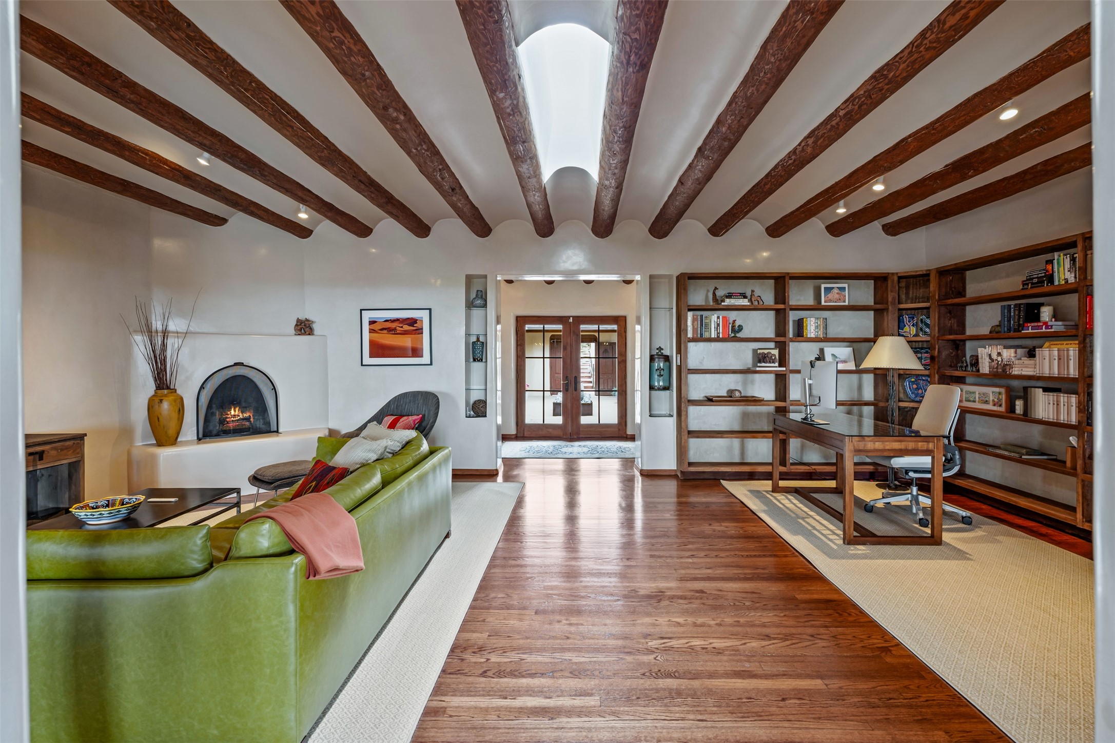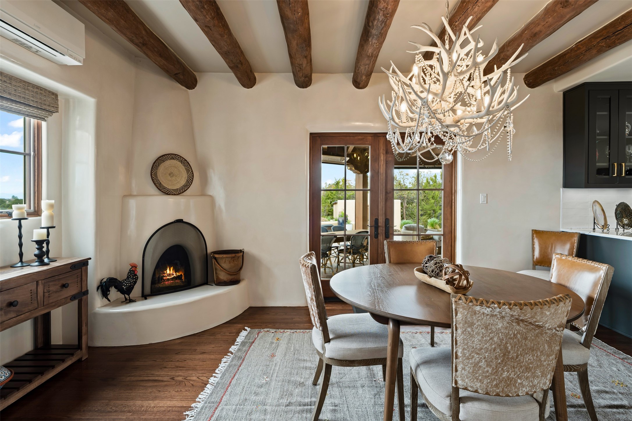 Beautiful, extensively remodeled, classic Santa Fe style home with jaw dropping panoramic mountain views on 3.4 wooded acres. Located on prestigious Circle Drive a mere 5 minute drive to downtown Santa Fe, this sensational home, built in 1936, impresses at every turn starting with the custom hand crafted iron gate, down the drive to a partially covered front entry courtyard leading to the front door and into a hallway of glistening diamond plaster walls that are throughout the house as, mostly, are the oak floors. Ahead is the spacious library/den with kiva fireplace. Through thick walled arches off the library is the formal living room beyond with its central fireplace and flanking windows and the 2 sets of French doors to bring in the light and the views; and boasting high ceilings with majestic corbels and vigas. The gourmet kitchen is entirely new with its own wet/coffee bar and nearby is an enormous pantry. Off the kitchen is a grand, heated portal and terrace to drink in the views and glory in the sunsets. The 3 bedroom suites are generously sized with remodeled bathrooms and each with glass doors to the outside. The closet in the primary bedroom is a wonder to behold and has its own washer and dryer. The 4th bedroom, currently set up as an office, is newly built and has some of the best views. A downstairs flex room (was a bedroom) is set up for exercise with adjacent laundry room. The heated detached studio nestles in the trees off the driveway and has multiple uses or, with adaption, could be another garage. A luxury home worthy of the name!