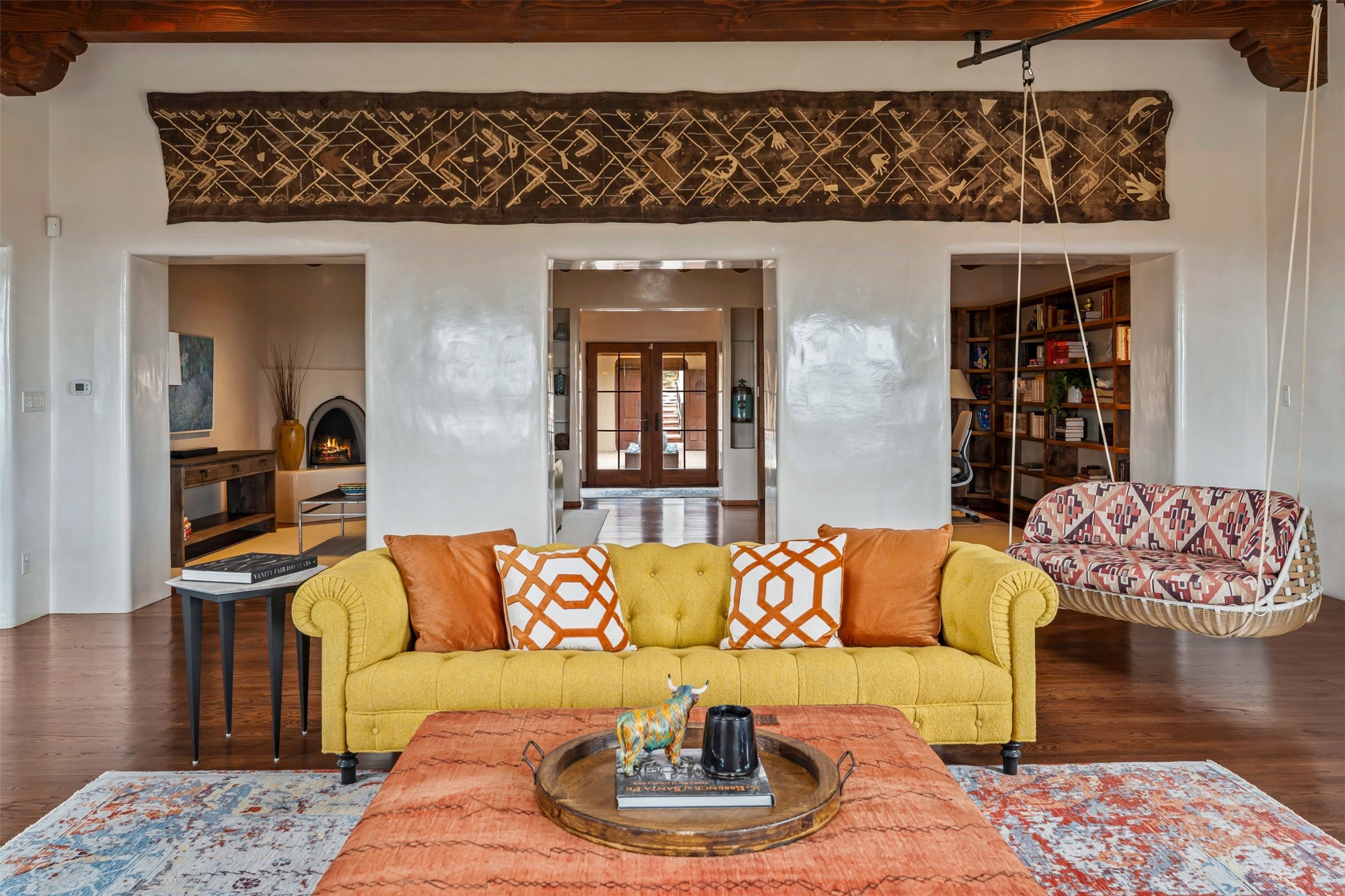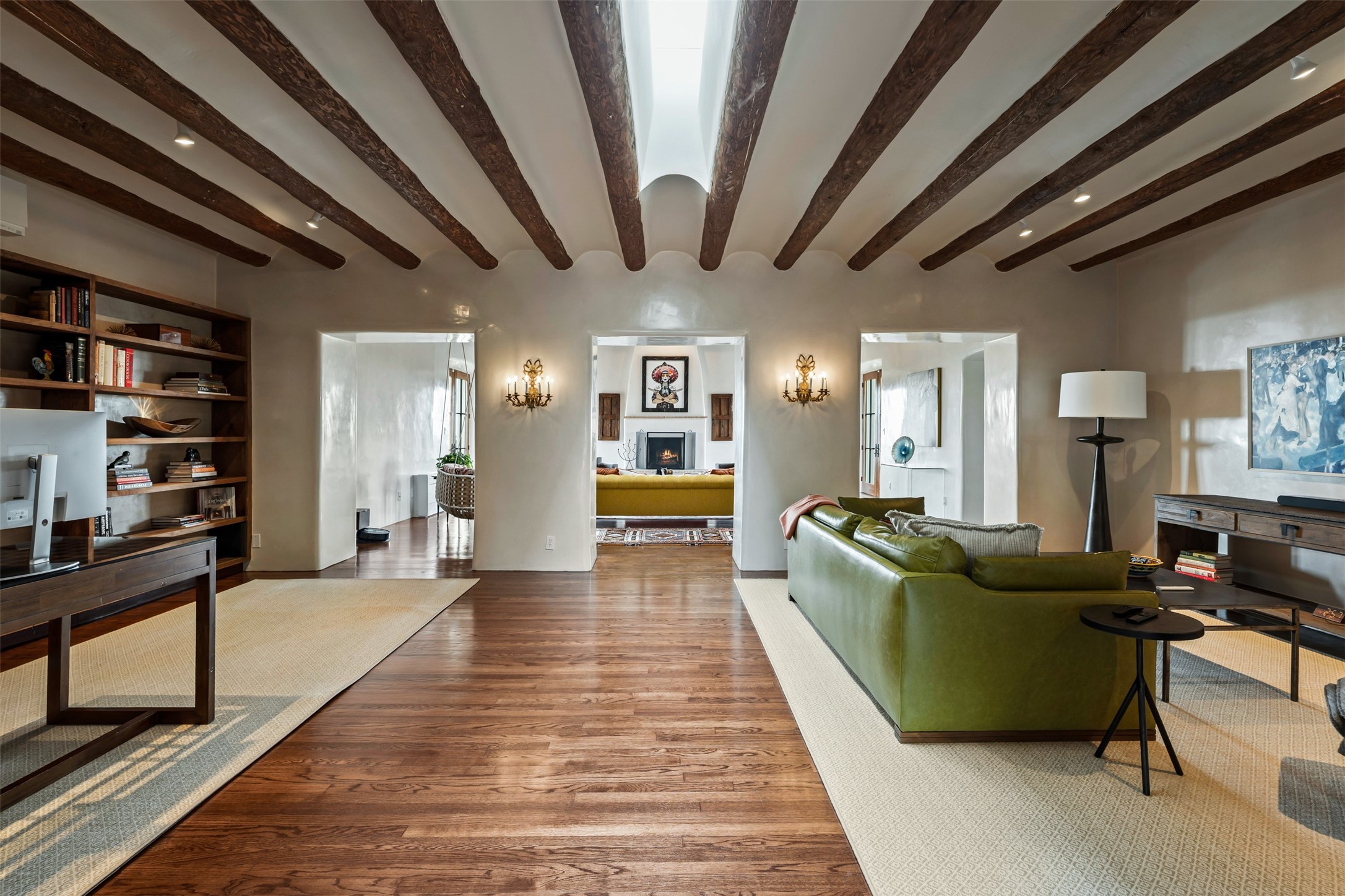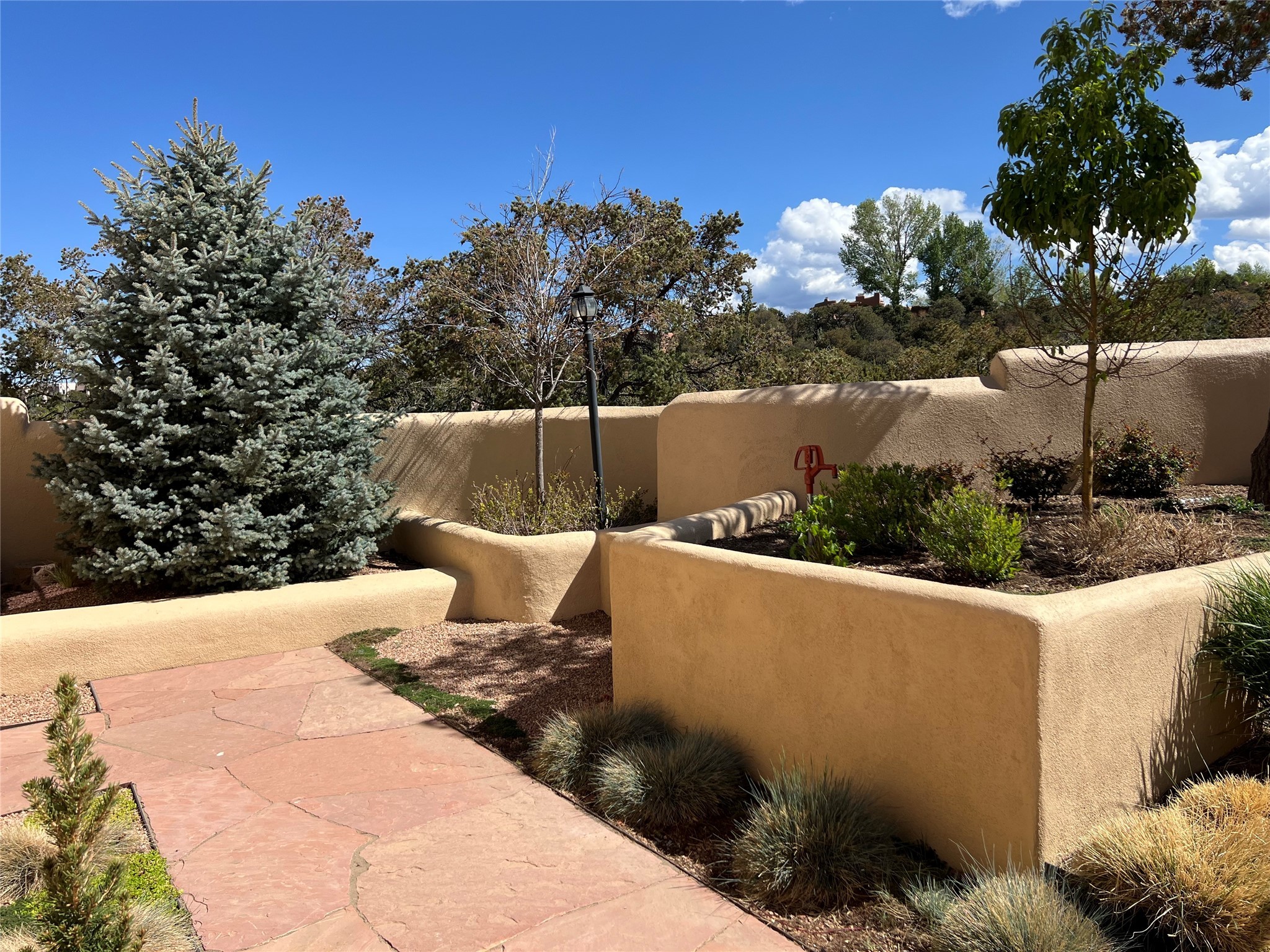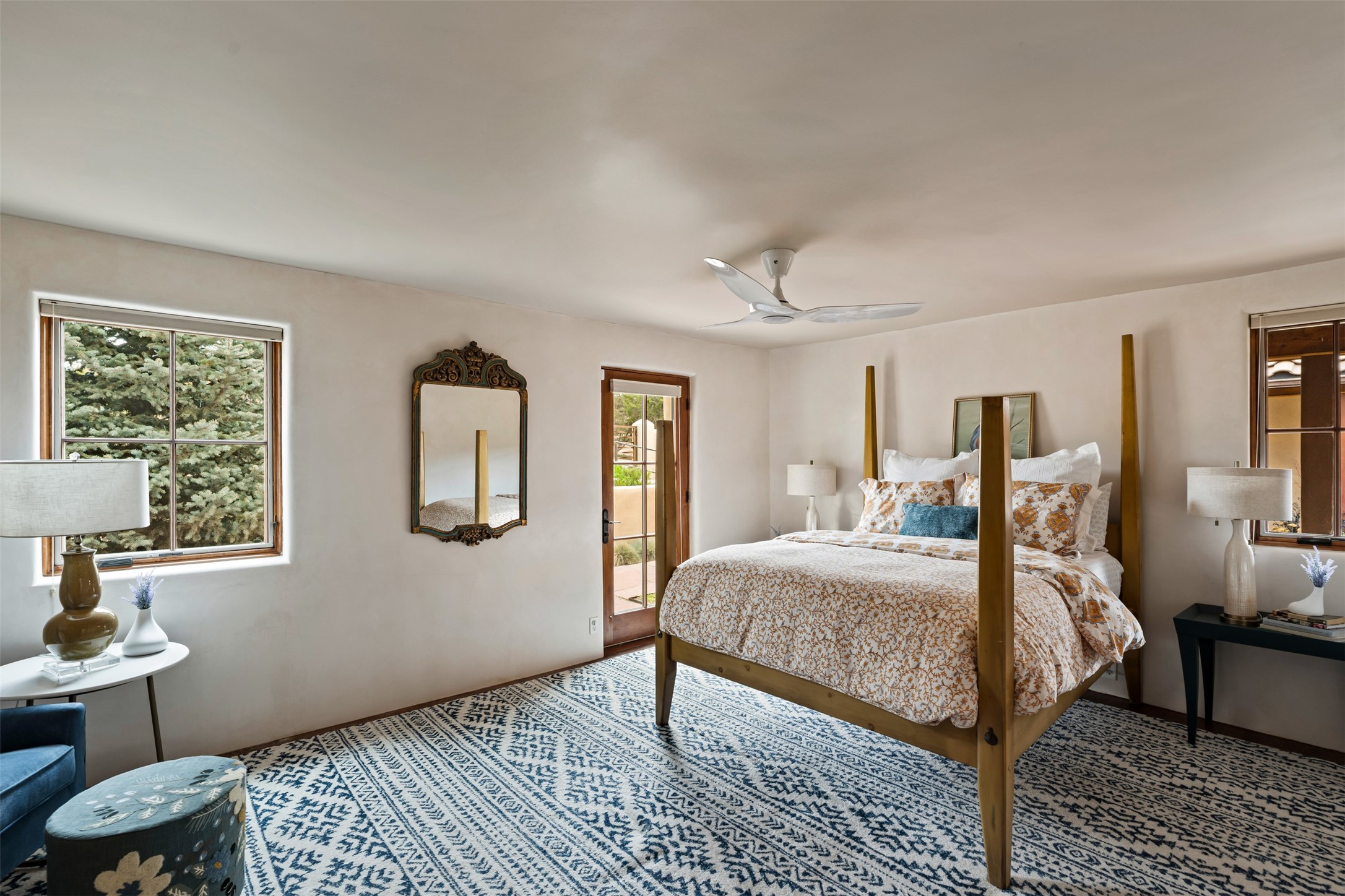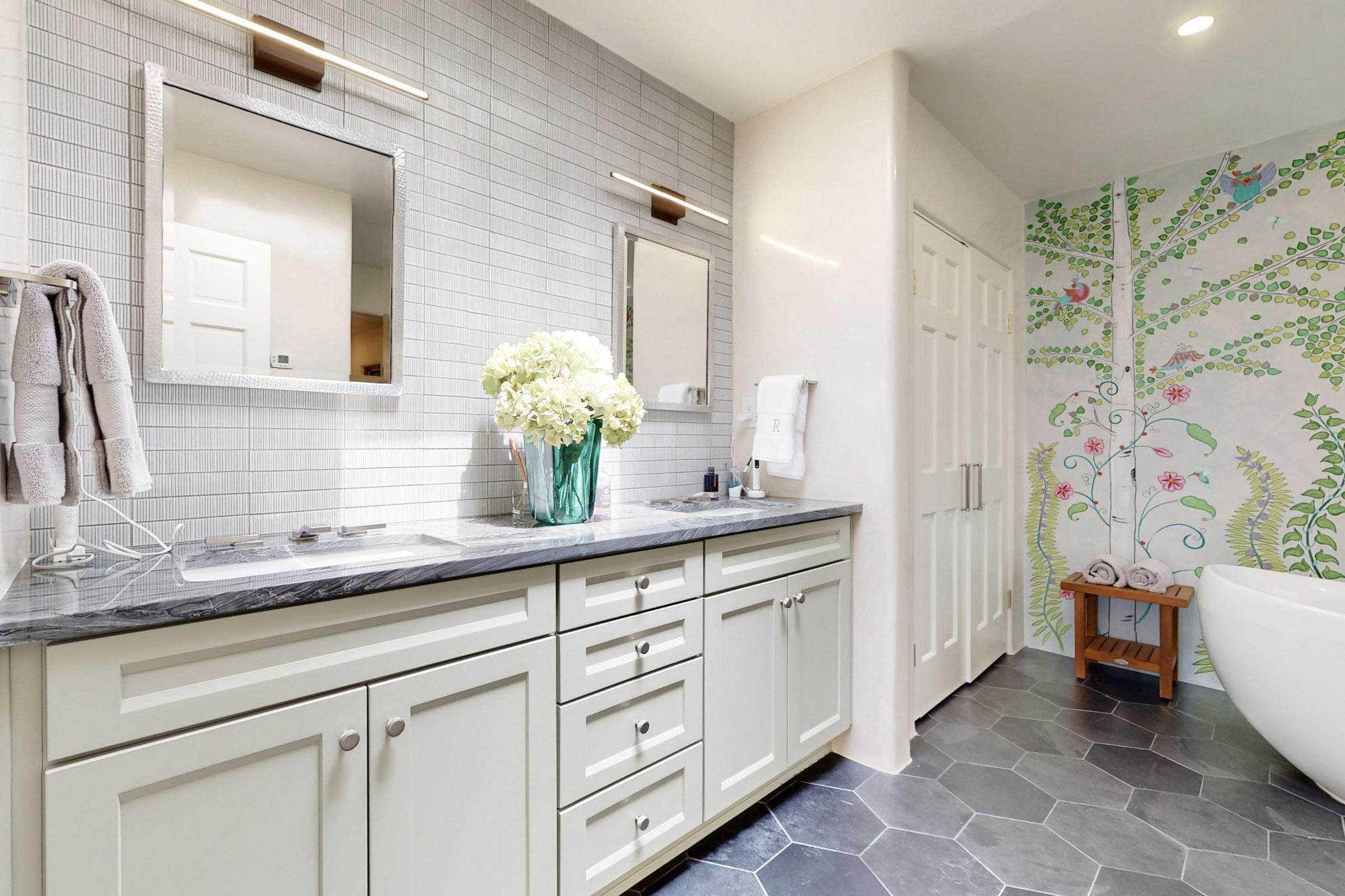 Beautiful, extensively remodeled, classic Santa Fe style home with jaw dropping panoramic mountain views on 3.4 wooded acres. Located on prestigious Circle Drive a mere 5 minute drive to downtown Santa Fe, this sensational home, built in 1936, impresses at every turn starting with the custom hand crafted iron gate, down the drive to a partially covered front entry courtyard leading to the front door and into a hallway of glistening diamond plaster walls that are throughout the house as, mostly, are the oak floors. Ahead is the spacious library/den with kiva fireplace. Through thick walled arches off the library is the formal living room beyond with its central fireplace and flanking windows and the 2 sets of French doors to bring in the light and the views; and boasting high ceilings with majestic corbels and vigas. The gourmet kitchen is entirely new with its own wet/coffee bar and nearby is an enormous pantry. Off the kitchen is a grand, heated portal and terrace to drink in the views and glory in the sunsets. The 3 bedroom suites are generously sized with remodeled bathrooms and each with glass doors to the outside. The closet in the primary bedroom is a wonder to behold and has its own washer and dryer. The 4th bedroom, currently set up as an office, is newly built and has some of the best views. A downstairs flex room (was a bedroom) is set up for exercise with adjacent laundry room. The heated detached studio nestles in the trees off the driveway and has multiple uses or, with adaption, could be another garage. A luxury home worthy of the name!