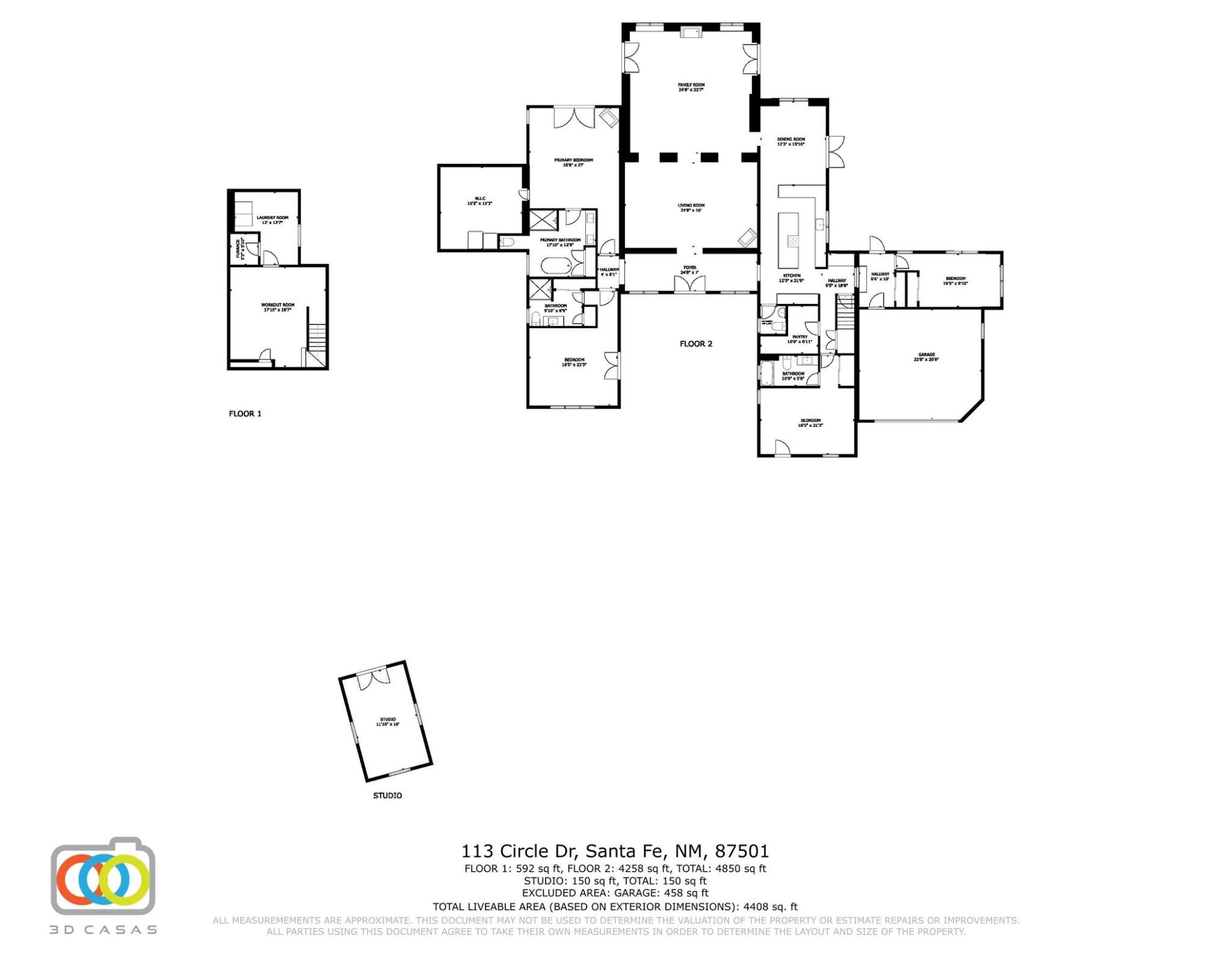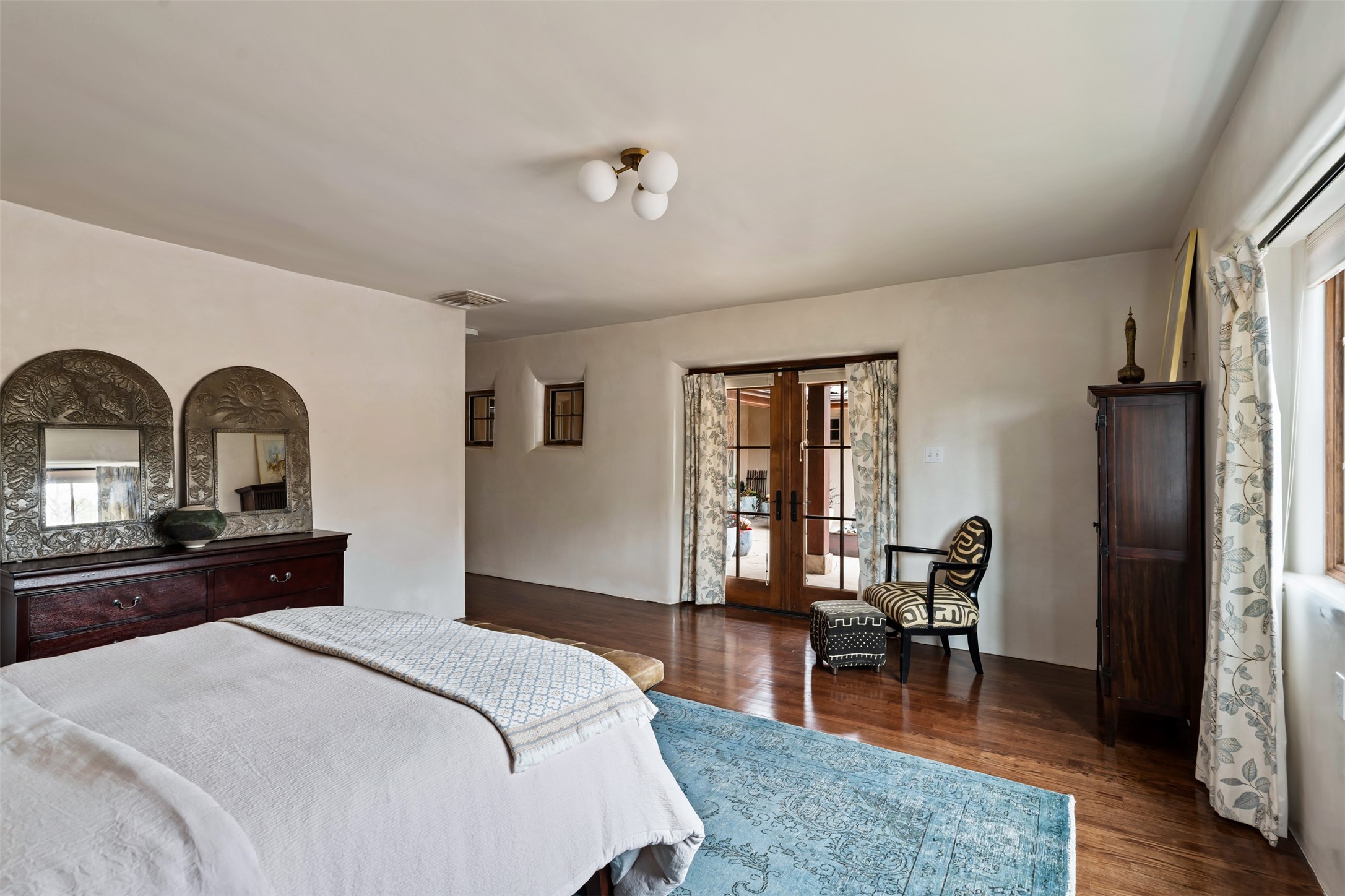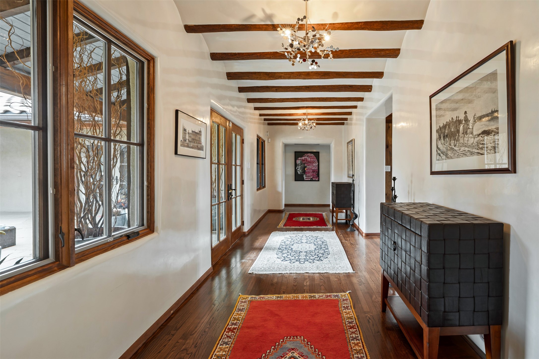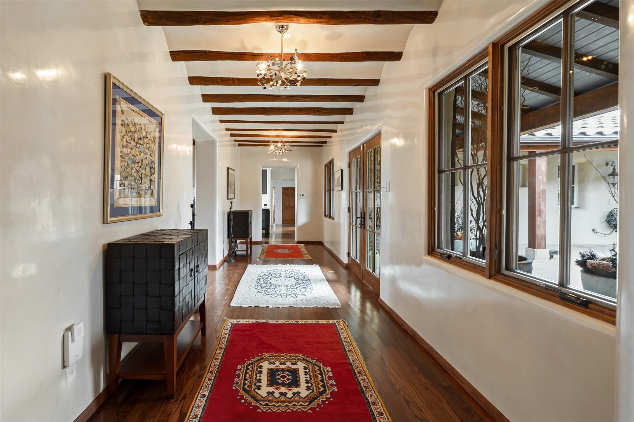 Beautiful, extensively remodeled, classic Santa Fe style home with jaw dropping panoramic mountain views on 3.4 wooded acres. Located on prestigious Circle Drive a mere 5 minute drive to downtown Santa Fe, this sensational home, built in 1936, impresses at every turn starting with the custom hand crafted iron gate, down the drive to a partially covered front entry courtyard leading to the front door and into a hallway of glistening diamond plaster walls that are throughout the house as, mostly, are the oak floors. Ahead is the spacious library/den with kiva fireplace. Through thick walled arches off the library is the formal living room beyond with its central fireplace and flanking windows and the 2 sets of French doors to bring in the light and the views; and boasting high ceilings with majestic corbels and vigas. The gourmet kitchen is entirely new with its own wet/coffee bar and nearby is an enormous pantry. Off the kitchen is a grand, heated portal and terrace to drink in the views and glory in the sunsets. The 3 bedroom suites are generously sized with remodeled bathrooms and each with glass doors to the outside. The closet in the primary bedroom is a wonder to behold and has its own washer and dryer. The 4th bedroom, currently set up as an office, is newly built and has some of the best views. A downstairs flex room (was a bedroom) is set up for exercise with adjacent laundry room. The heated detached studio nestles in the trees off the driveway and has multiple uses or, with adaption, could be another garage. A luxury home worthy of the name!