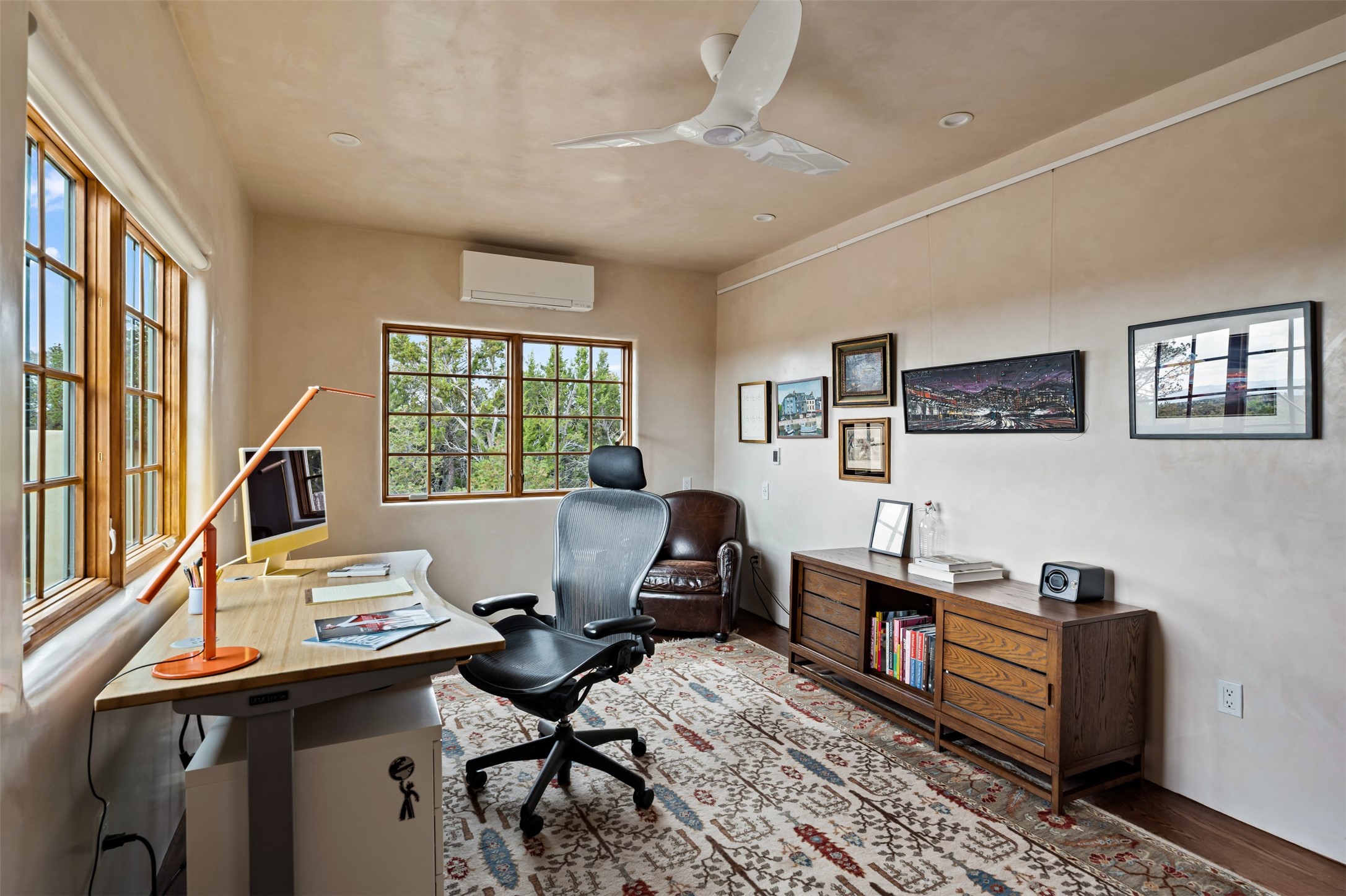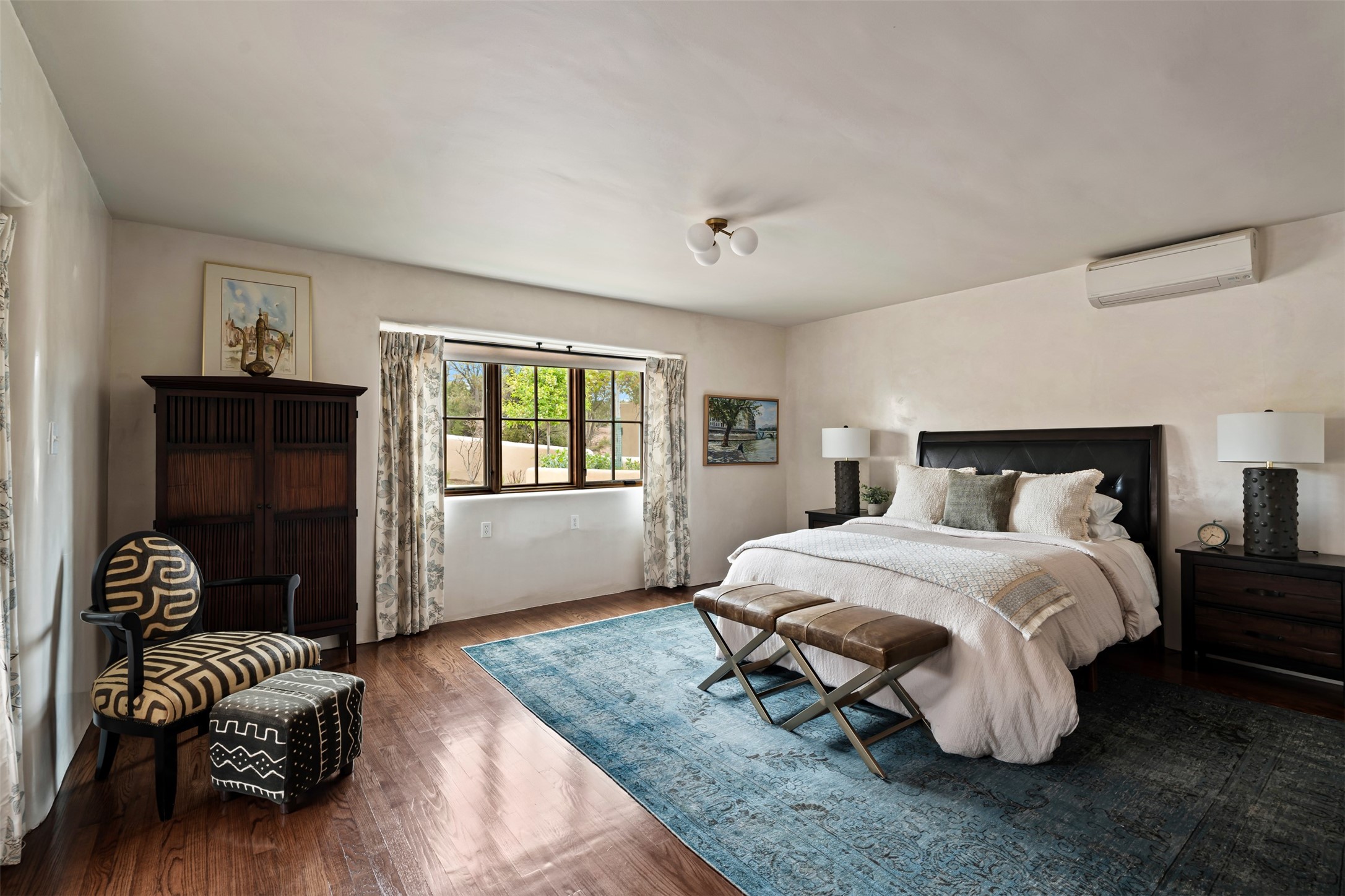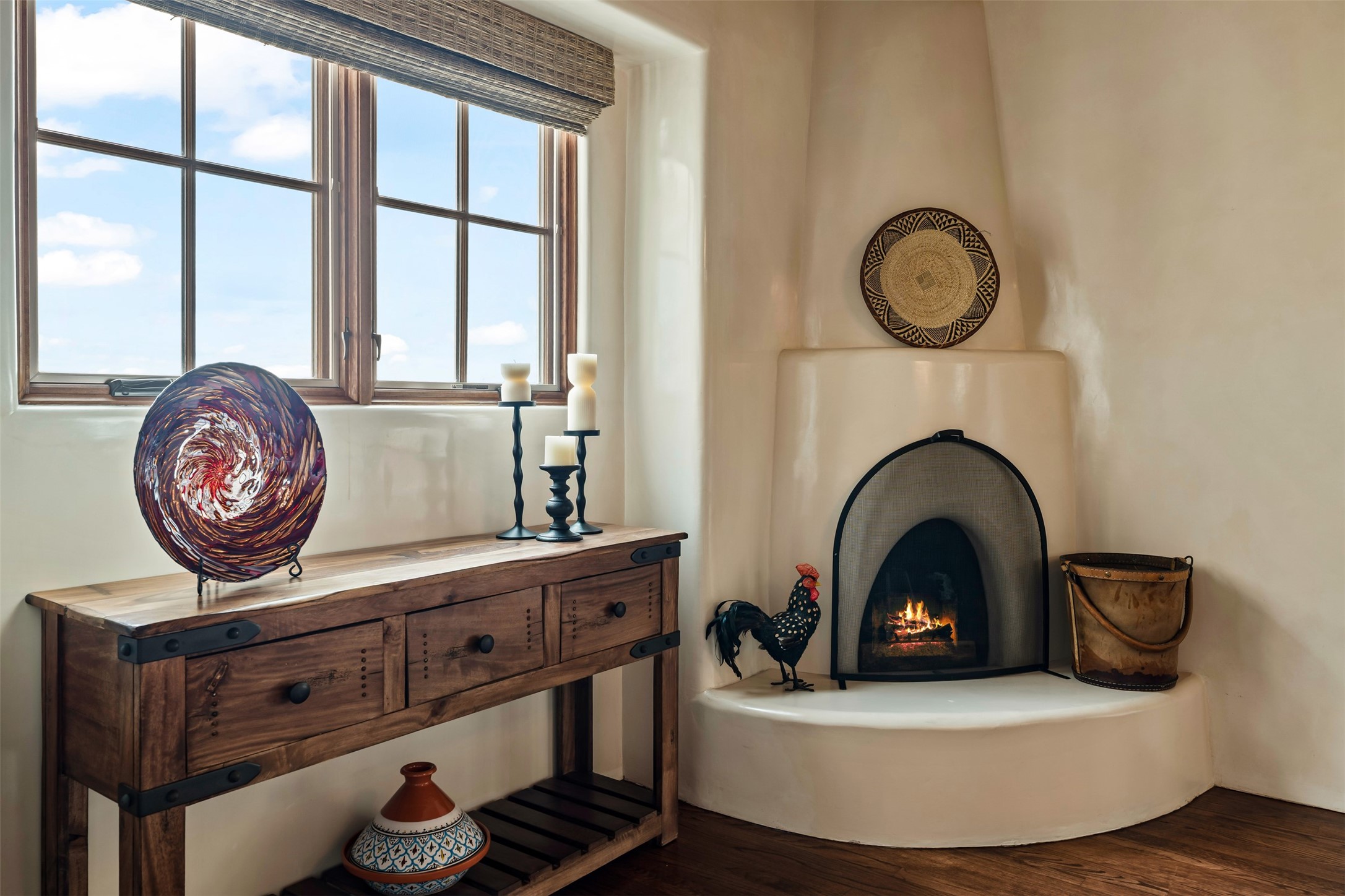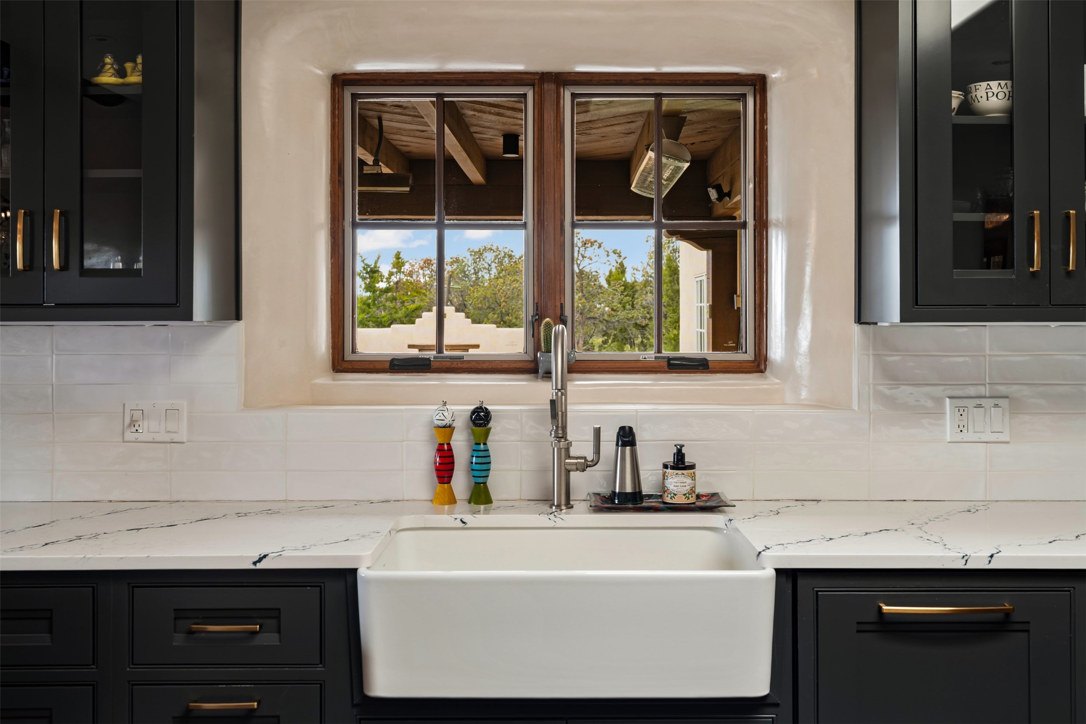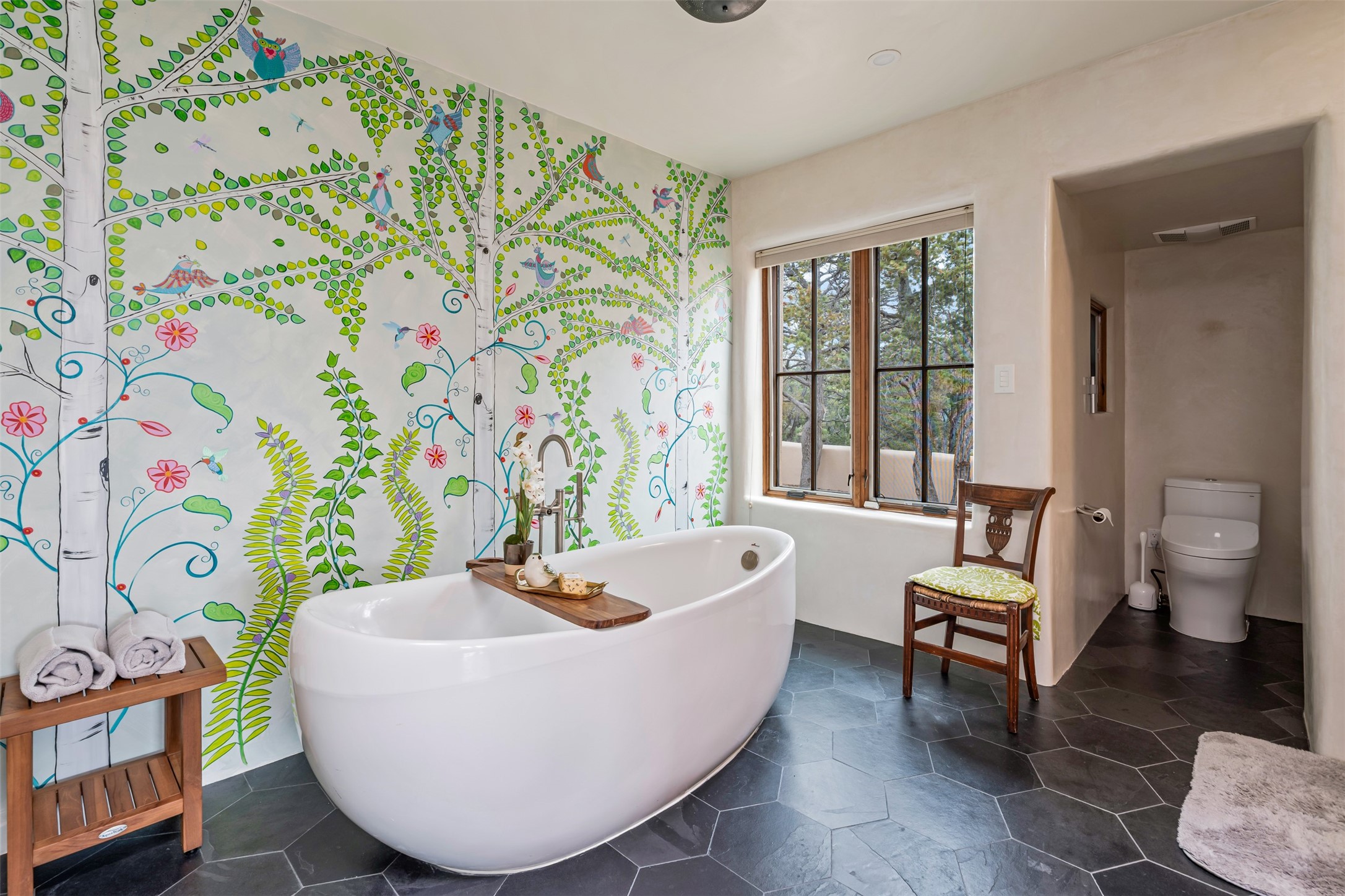Beautiful, extensively remodeled, classic Santa Fe style home with jaw dropping panoramic mountain views on 3.4 wooded acres. Located on prestigious Circle Drive a mere 5 minute drive to downtown Santa Fe, this sensational home, built in 1936, impresses at every turn starting with the custom hand crafted iron gate, down the drive to a partially covered front entry courtyard leading to the front door and into a hallway of glistening diamond plaster walls that are throughout the house as, mostly, are the oak floors. Ahead is the spacious library/den with kiva fireplace. Through thick walled arches off the library is the formal living room beyond with its central fireplace and flanking windows and the 2 sets of French doors to bring in the light and the views; and boasting high ceilings with majestic corbels and vigas. The gourmet kitchen is entirely new with its own wet/coffee bar and nearby is an enormous pantry. Off the kitchen is a grand, heated portal and terrace to drink in the views and glory in the sunsets. The 3 bedroom suites are generously sized with remodeled bathrooms and each with glass doors to the outside. The closet in the primary bedroom is a wonder to behold and has its own washer and dryer. The 4th bedroom, currently set up as an office, is newly built and has some of the best views. A downstairs flex room (was a bedroom) is set up for exercise with adjacent laundry room. The heated detached studio nestles in the trees off the driveway and has multiple uses or, with adaption, could be another garage. A luxury home worthy of the name!