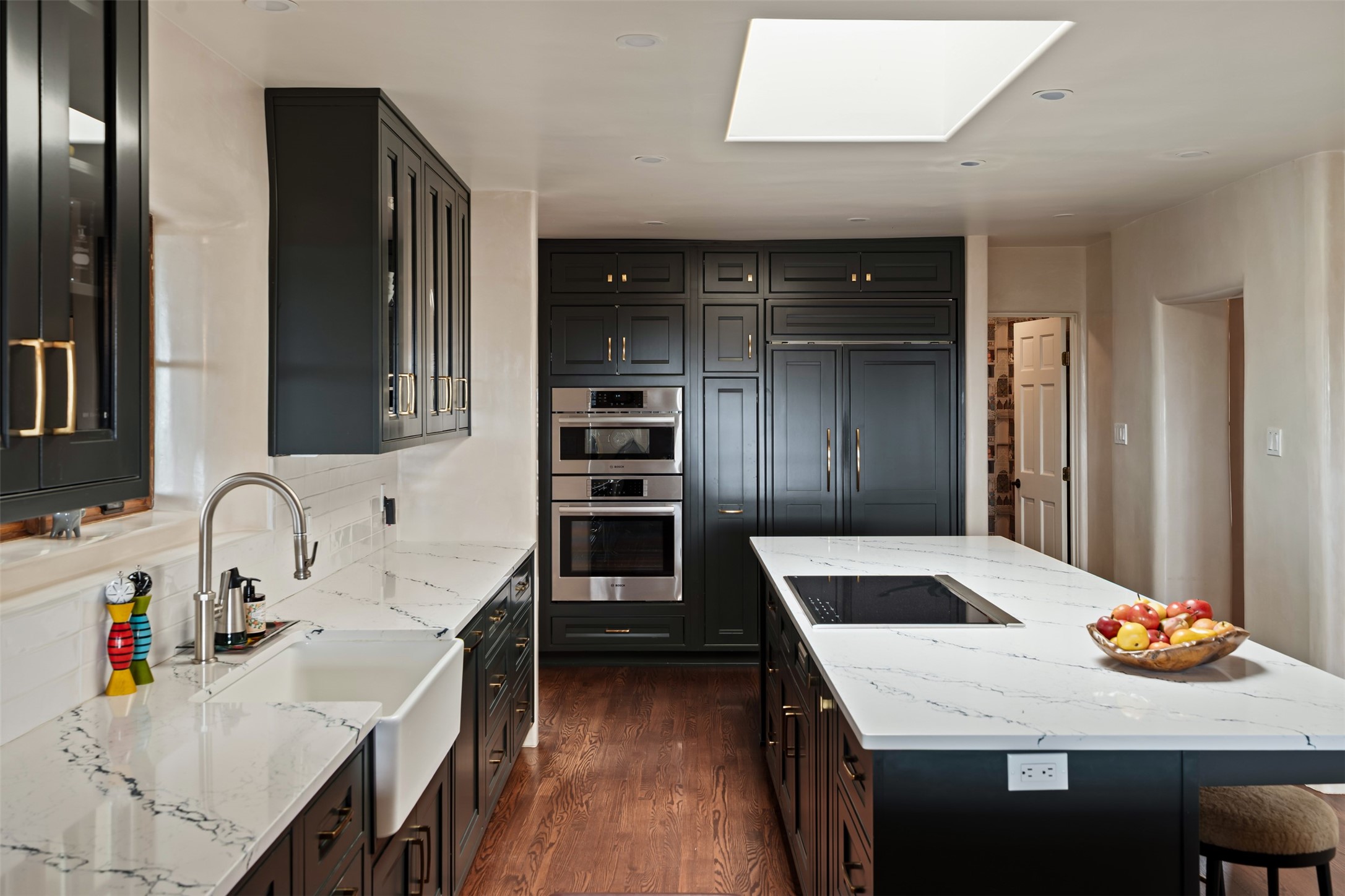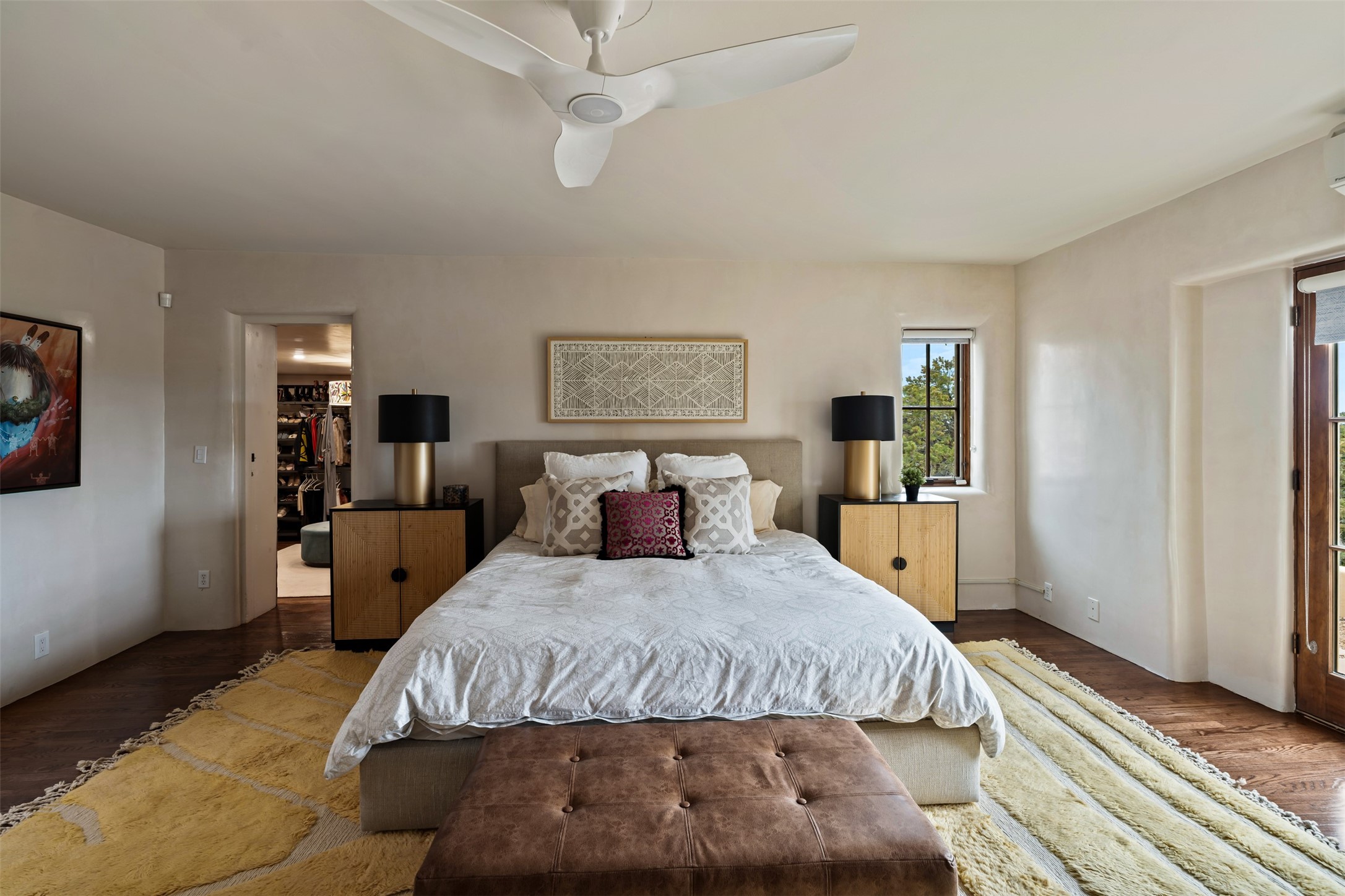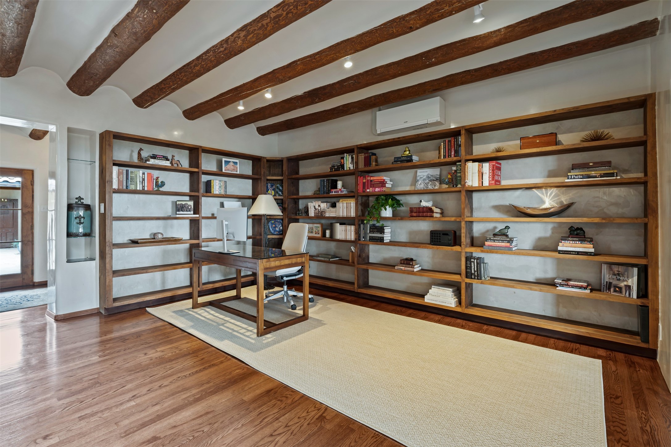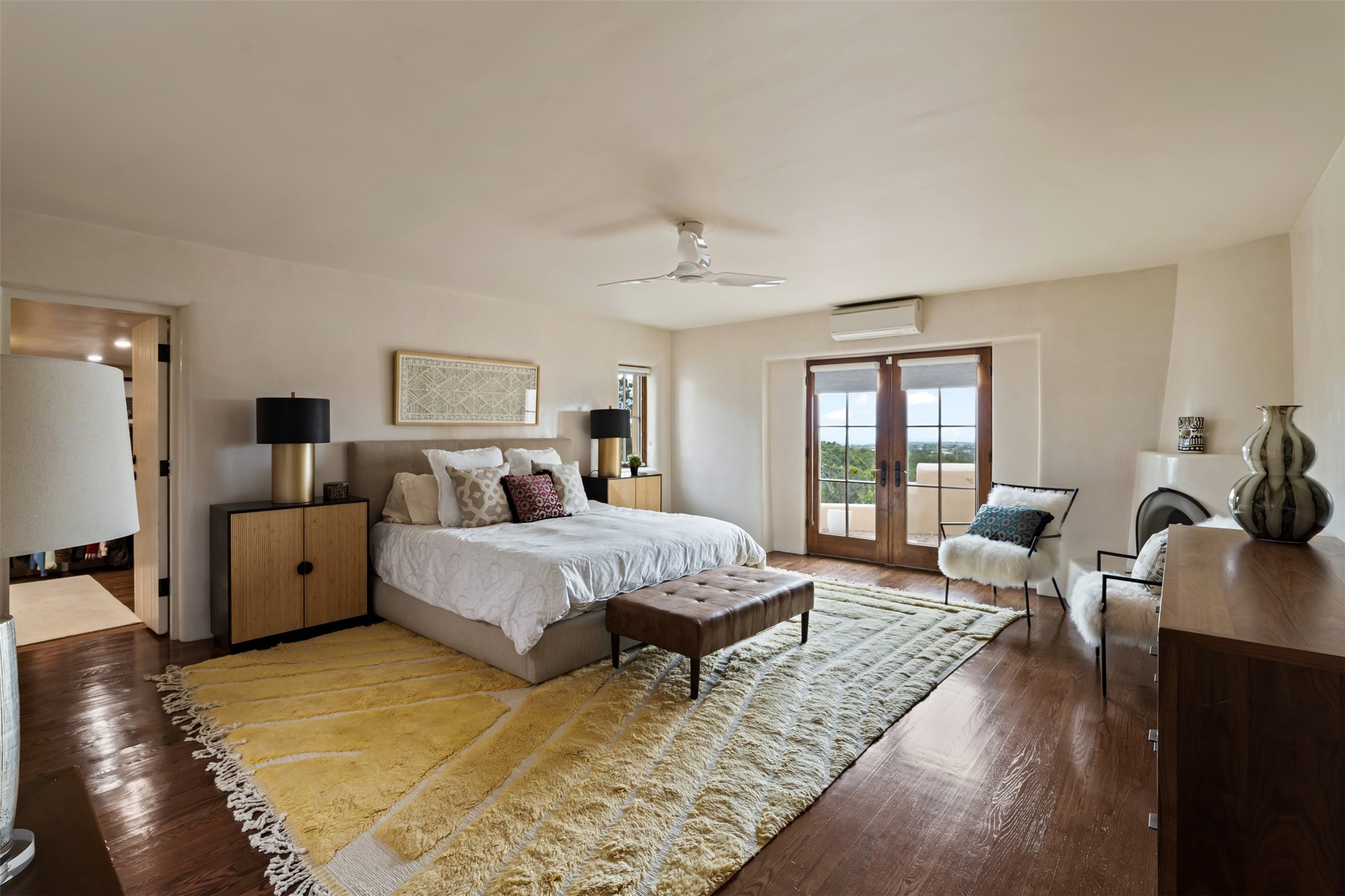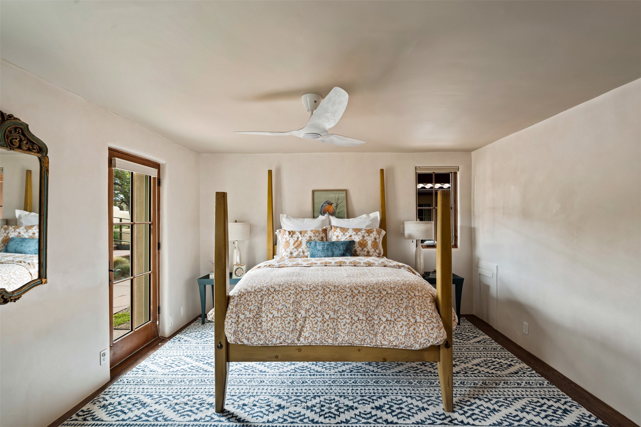 Beautiful, extensively remodeled, classic Santa Fe style home with jaw dropping panoramic mountain views on 3.4 wooded acres. Located on prestigious Circle Drive a mere 5 minute drive to downtown Santa Fe, this sensational home, built in 1936, impresses at every turn starting with the custom hand crafted iron gate, down the drive to a partially covered front entry courtyard leading to the front door and into a hallway of glistening diamond plaster walls that are throughout the house as, mostly, are the oak floors. Ahead is the spacious library/den with kiva fireplace. Through thick walled arches off the library is the formal living room beyond with its central fireplace and flanking windows and the 2 sets of French doors to bring in the light and the views; and boasting high ceilings with majestic corbels and vigas. The gourmet kitchen is entirely new with its own wet/coffee bar and nearby is an enormous pantry. Off the kitchen is a grand, heated portal and terrace to drink in the views and glory in the sunsets. The 3 bedroom suites are generously sized with remodeled bathrooms and each with glass doors to the outside. The closet in the primary bedroom is a wonder to behold and has its own washer and dryer. The 4th bedroom, currently set up as an office, is newly built and has some of the best views. A downstairs flex room (was a bedroom) is set up for exercise with adjacent laundry room. The heated detached studio nestles in the trees off the driveway and has multiple uses or, with adaption, could be another garage. A luxury home worthy of the name!
