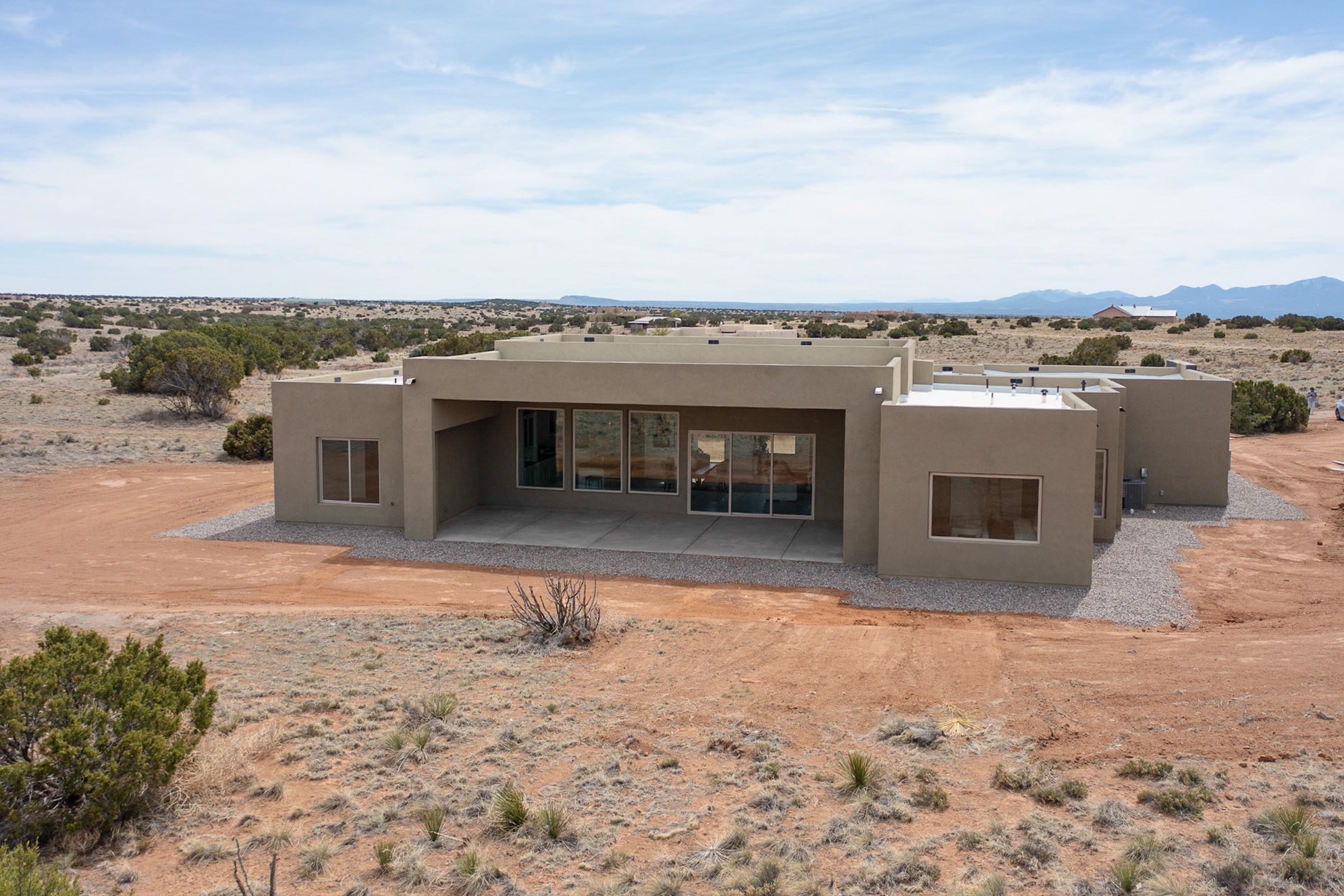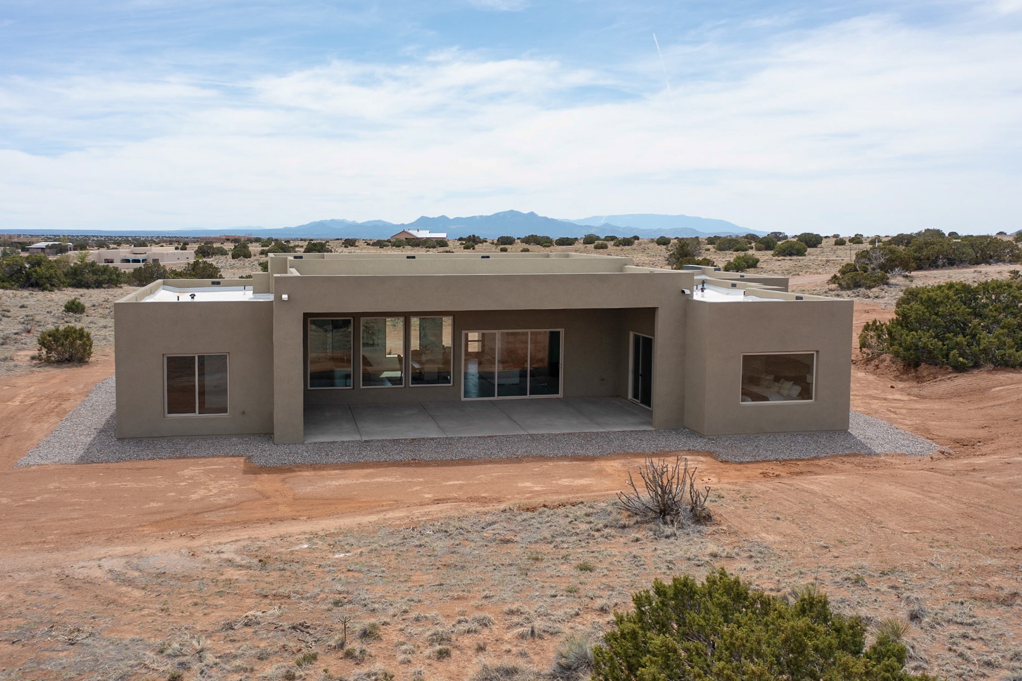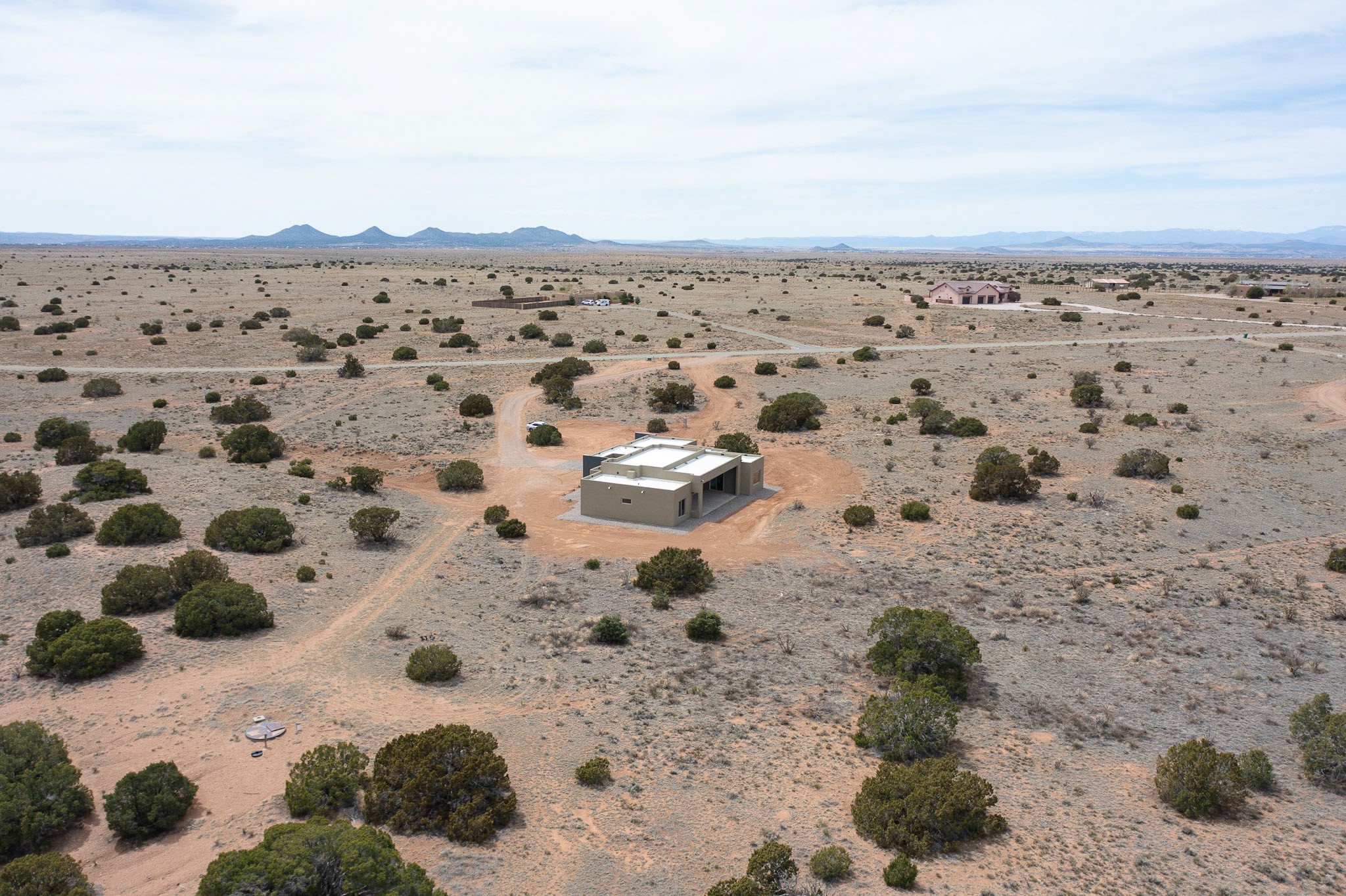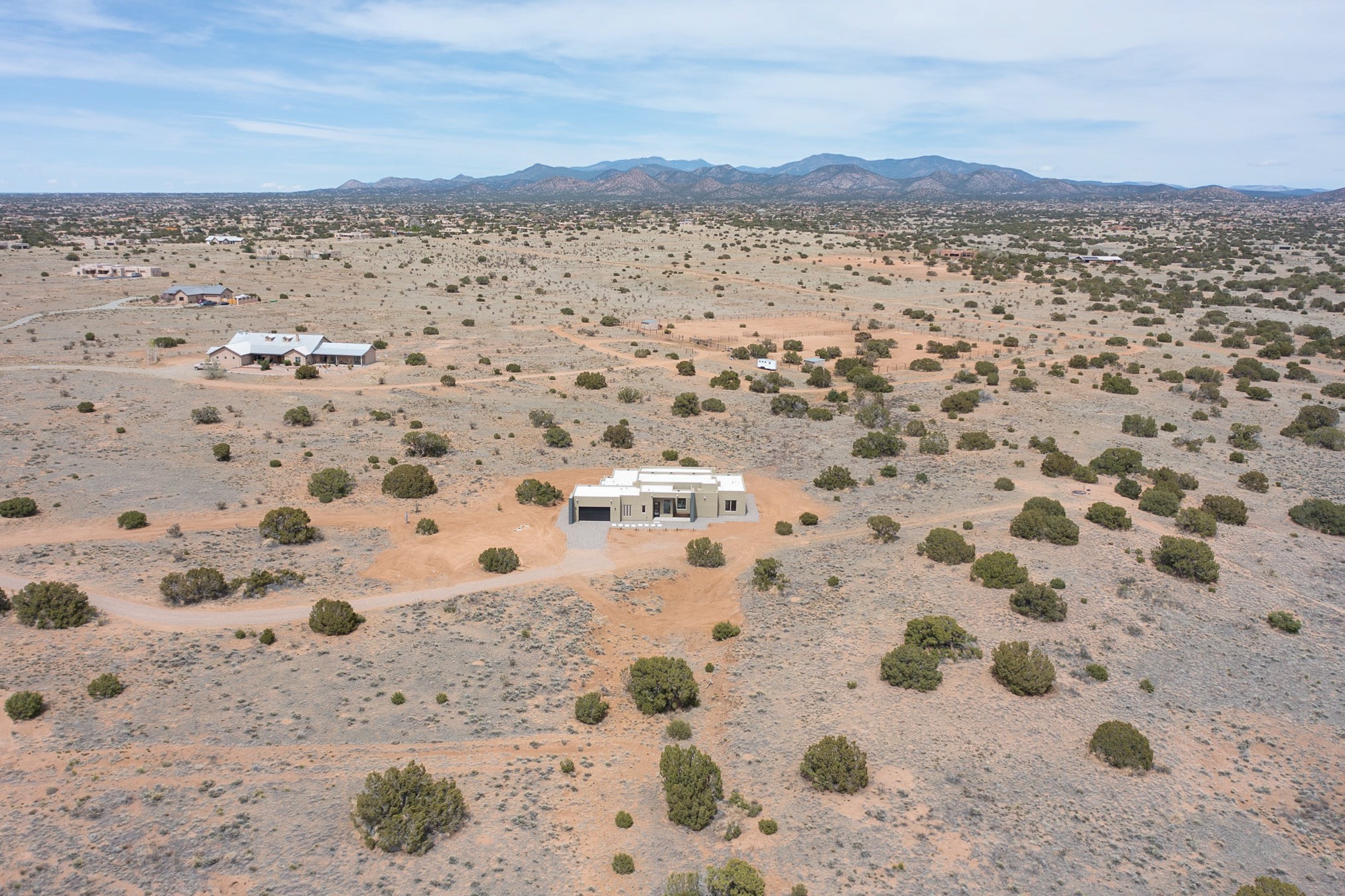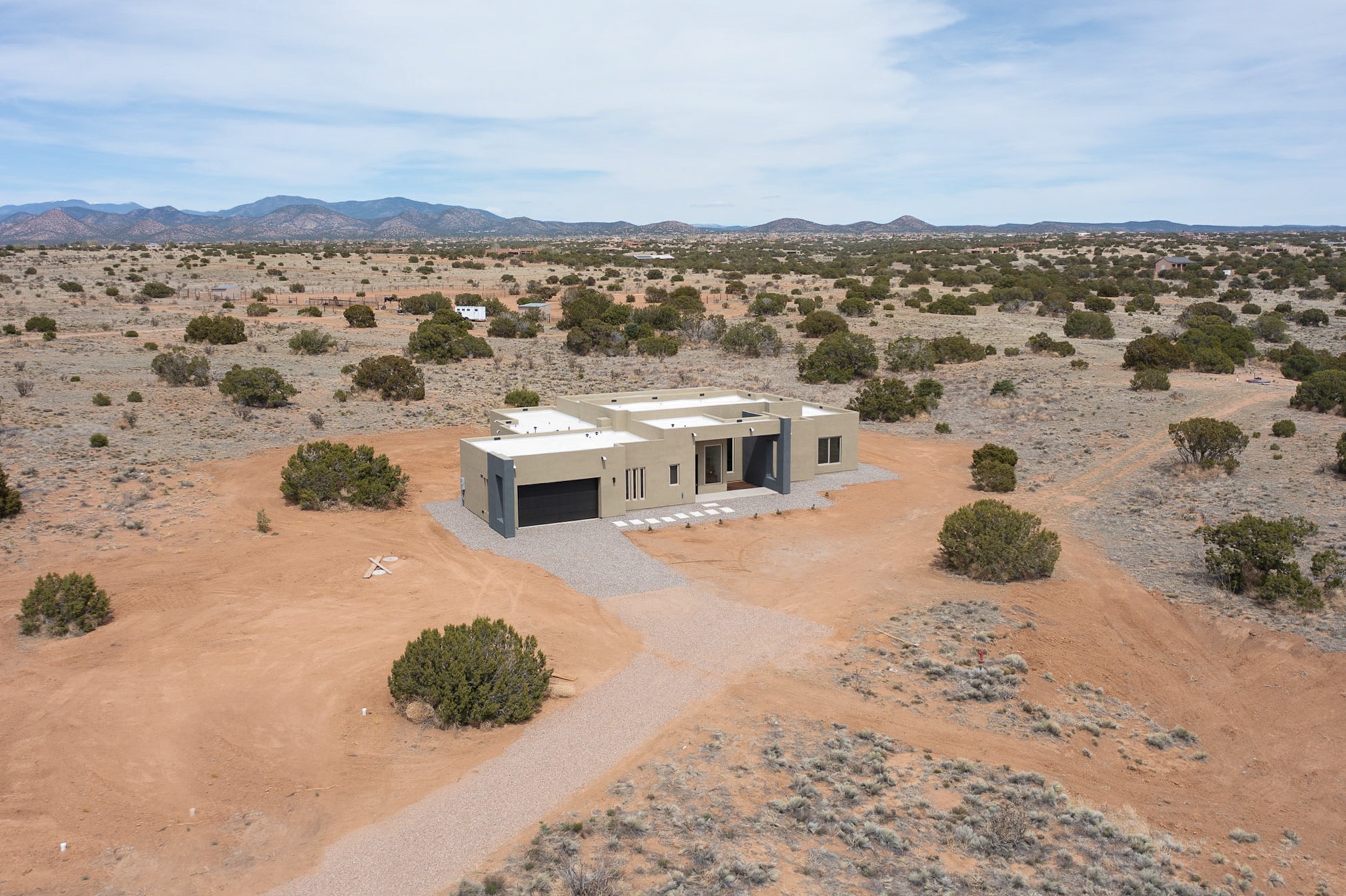Just completed and ready for occupancy! One of the best view lots in the area. Mountain views from every window in this new custom built contemporary pueblo style home with open floor plan situated on a huge 12.50 +/- ac. private lot in Ceilo Tranquilo. Perfect for indoor and outdoor entertaining with 1000 square foot (50 x 20) back portal and over 200 square foot front portal. Open kitchen/family/dining room has floor to ceiling windows and double sliding glass doors to take in the fabulous views and access to the portal. The contemporary kitchen has a huge island bar and large walk in pantry. Home has all tile floors, high ceilings throughout and central a/c and heat. Owner's suite has large picture window with fabulous mountain views and sliding door to the portal. Owner's bath has double sinks, soaking tub and large walk in shower room with double shower heads and rain showers and a large walk in closet. Home features contemporary style vigas in living areas. Many extras including a bonus room that could be a mud room, office, studio or crafts room, oversized two car garage with extra storage space. This home has it all; new home, fabulous views, great outdoor spaces, contemporary open floor plan, large private lot that allows horses and additional structures. Easy access to all the shopping and dining and near all the outdoor activities. $4000 appliance credit for range, dishwasher and microwave.